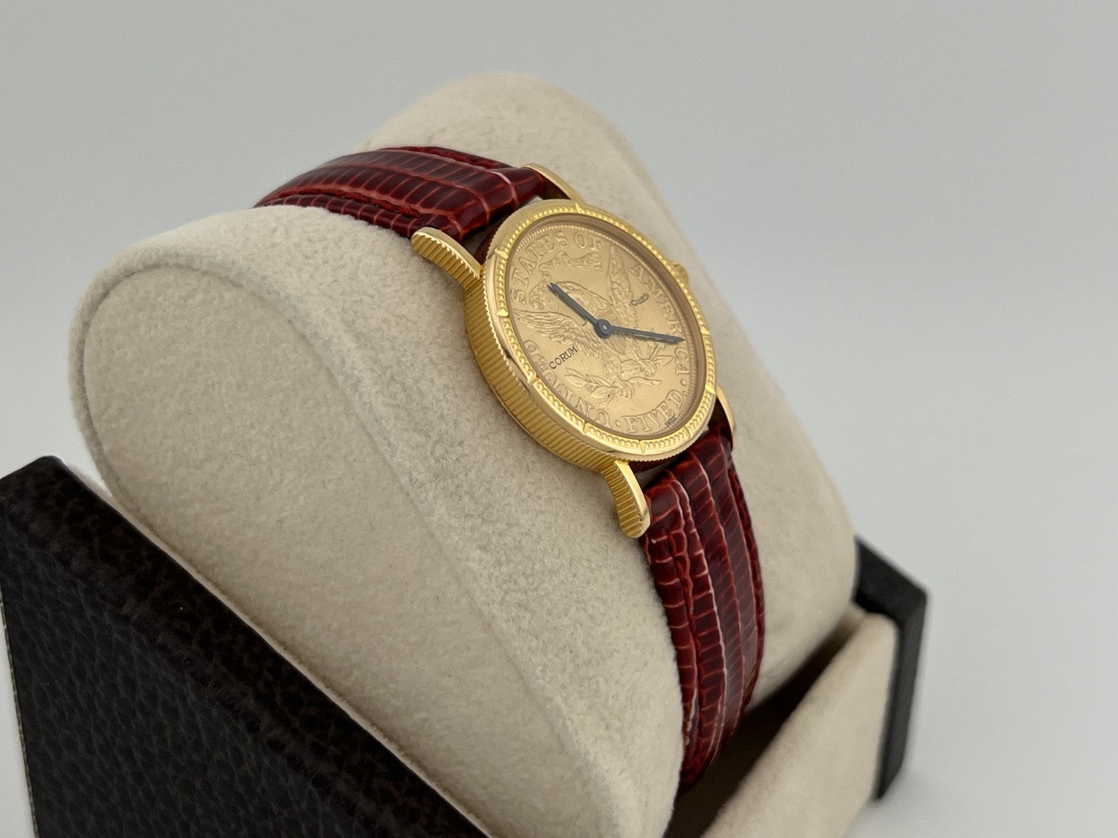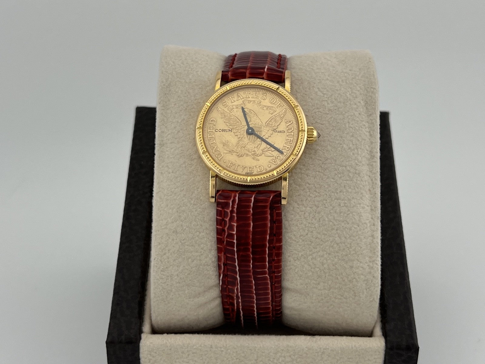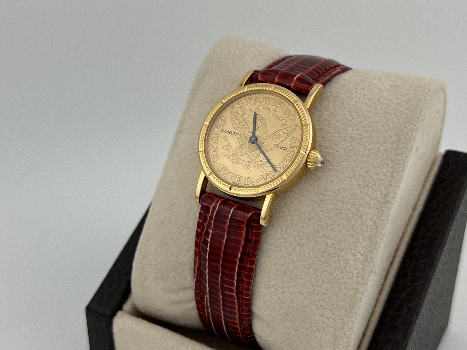Corum $5 Gold Eagle-Liberty 1904 Coin Watch 18k Yellow Gold Corum Sale! from 279500 /per This item is a recurring or deferred purchase. By continuing, I agree to the cancellation policy and authorize you to charge my payment method at the prices, frequency and dates listed on this page until my order is fulfilled or I cancel, if permitted. +1 (619) 232-1273 This item is currently on backorder but you can still purchase it now and we'll ship as soon as more become available. Model: Corum $5 Gold Eagle-Liberty 1904 Coin Watch Case Material: 18k Yellow Gold Band: Custom Leather Strap Bezel: 18k Yellow Gold Dial: 1904 $5 Gold Coin Crystal: Sapphire Case Size: 24mm Includes: - Elegant Watch Box- Certified Appraisal - 1 Year WarrantySKU 21303 / 11905TSH052223