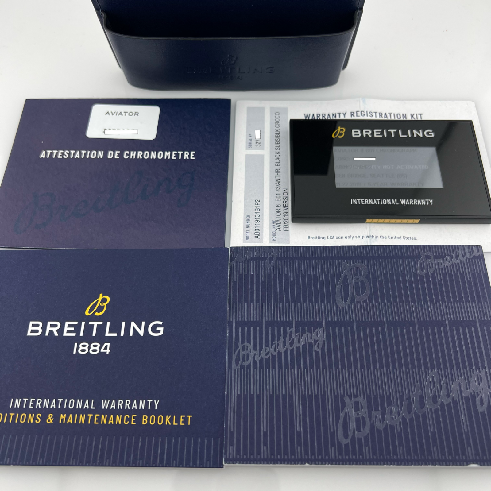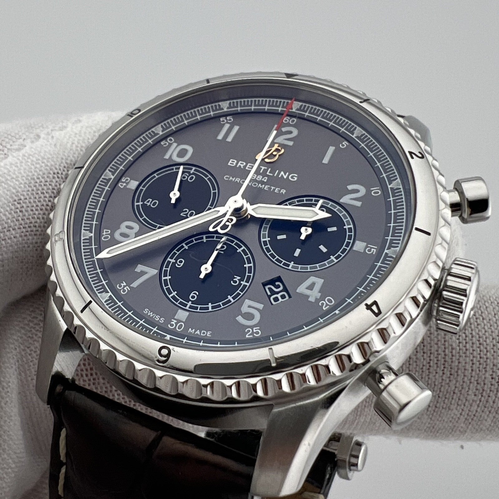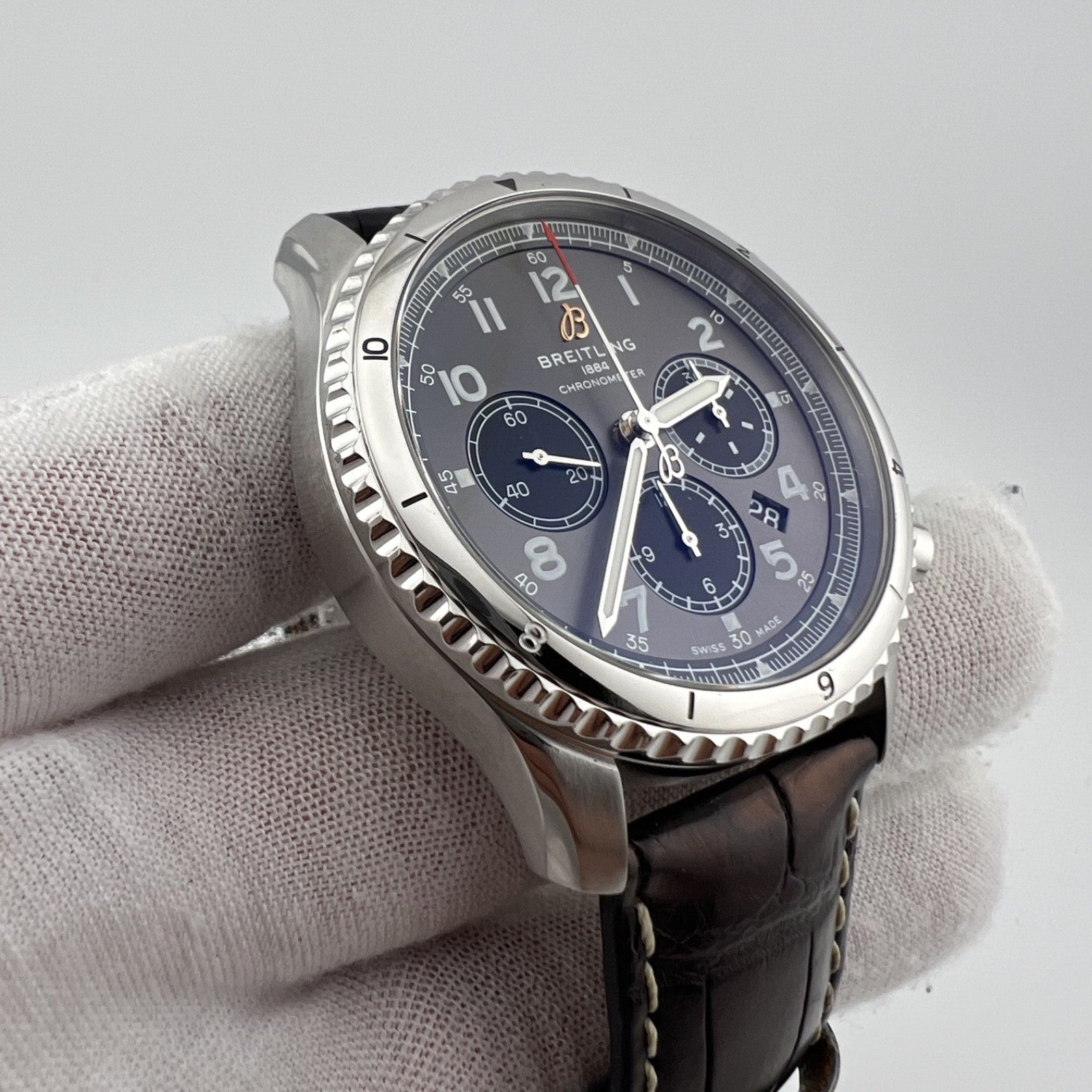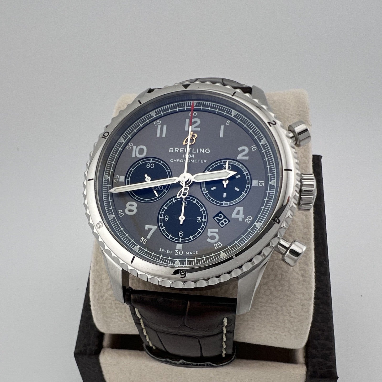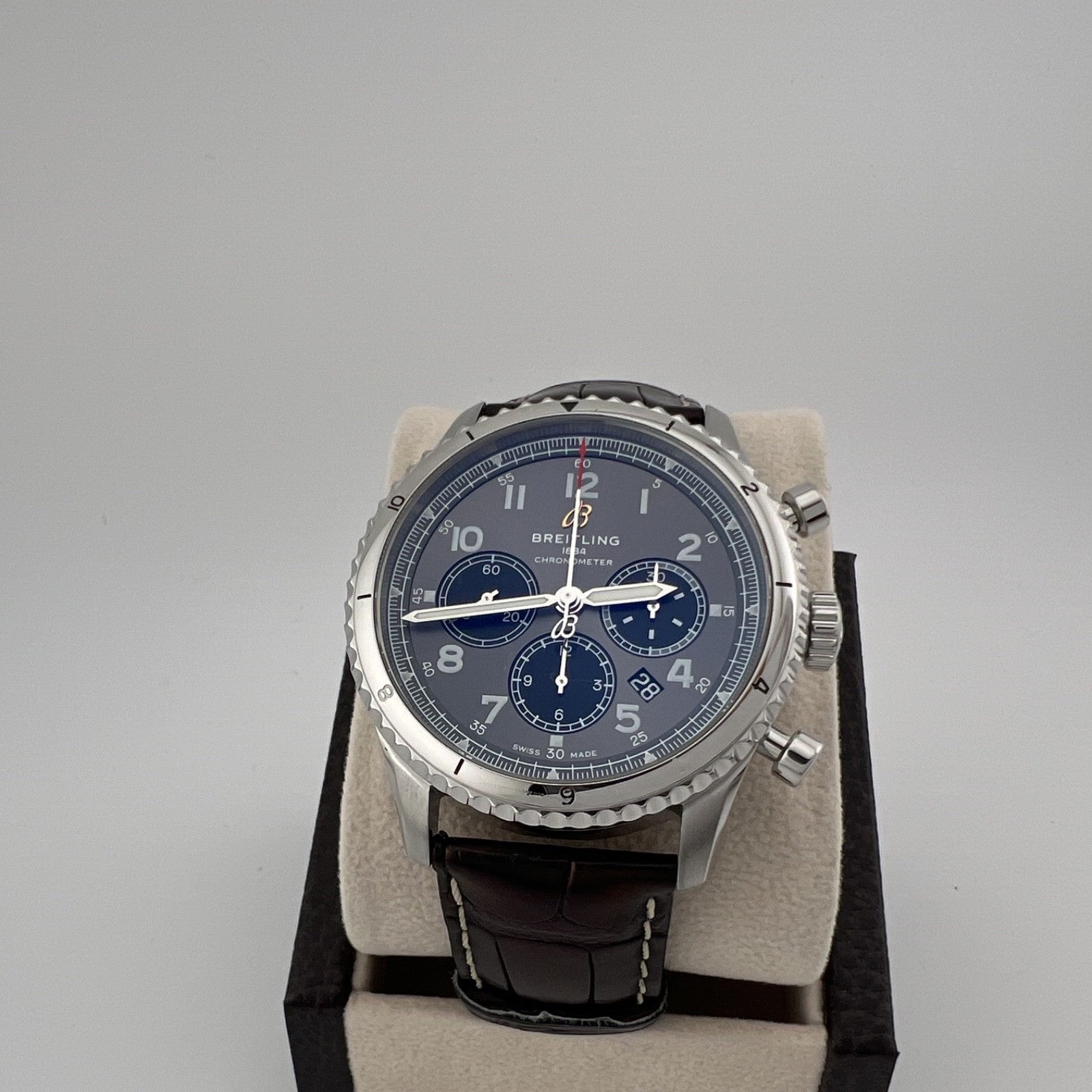 Breitling Aviator 8 B01 Chronograph AB01191 43mm Anthracite Dial Papers Breitling Sale! from 589500 /per This item is a recurring or deferred purchase. By continuing, I agree to the cancellation policy and authorize you to charge my payment method at the prices, frequency and dates listed on this page until my order is fulfilled or I cancel, if permitted. +1 (619) 232-1273 This item is currently on backorder but you can still purchase it now and we'll ship as soon as more become available. Style Number: AB01191Serial: 327****Year: 2019 Model: Breitling Aviator 8 B01 Chronograph Case Material: Stainless Steel Band: Leather Bezel: Stainless Steel Dial: Anthracite Dial (Gray) Crystal: Sapphire Case Size: 43mm Includes: -Elegant Watch Box & Breitling Papers -Certified Appraisal -1 Year WarrantySKU 22581 / 17836TCF052325