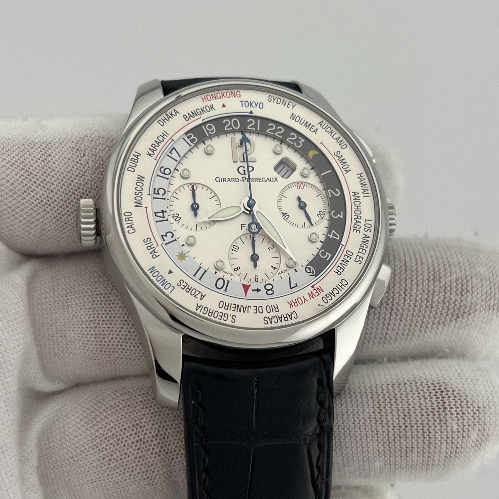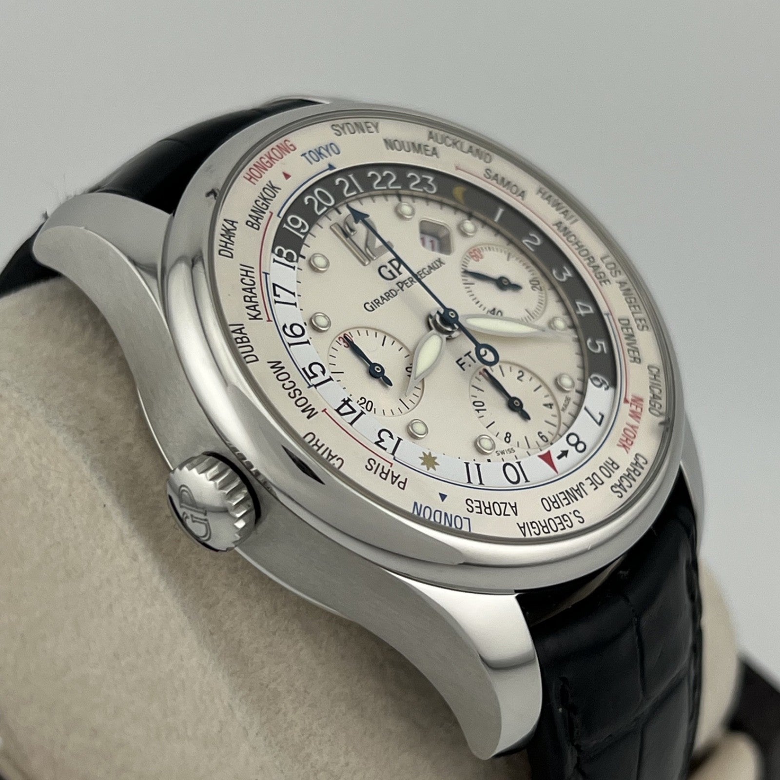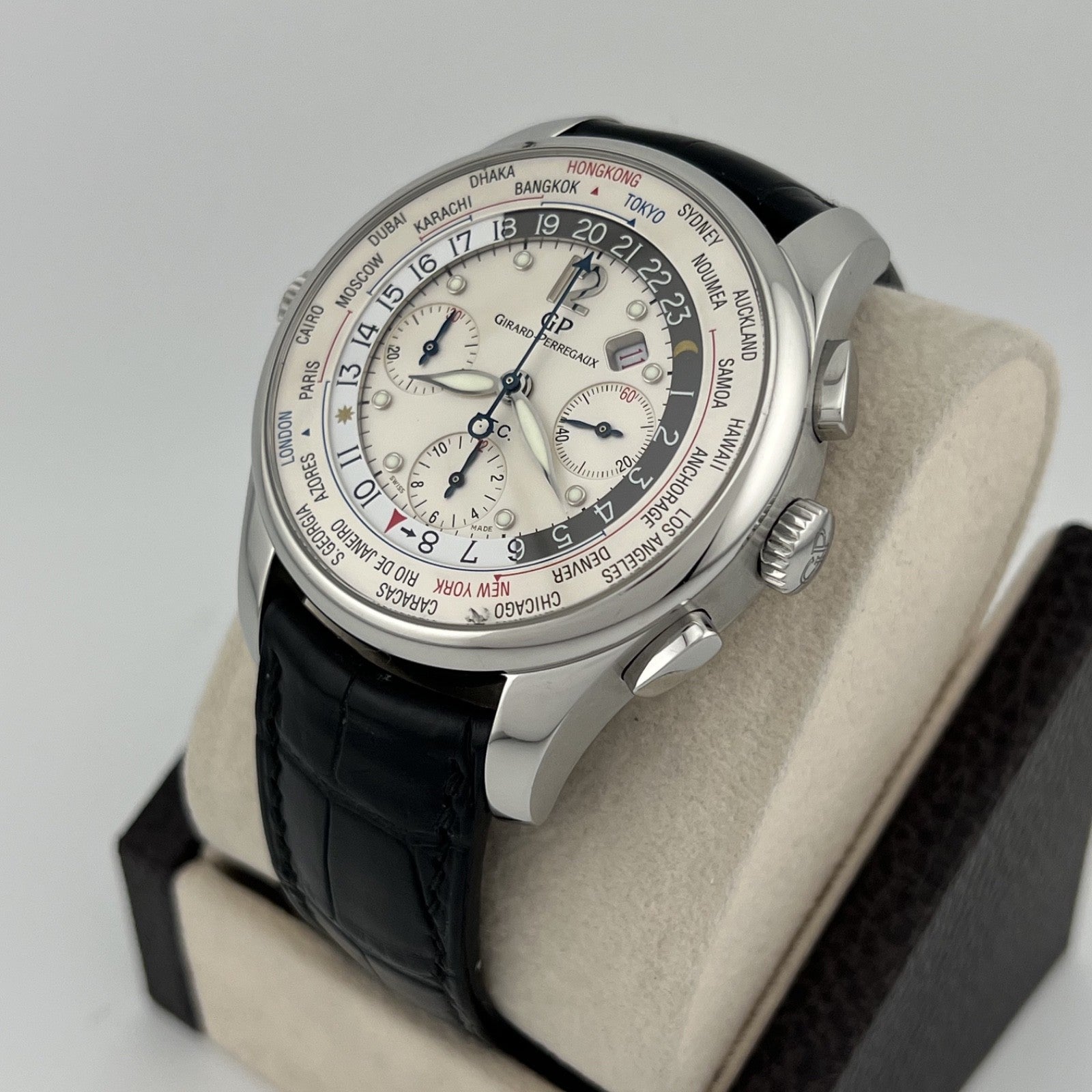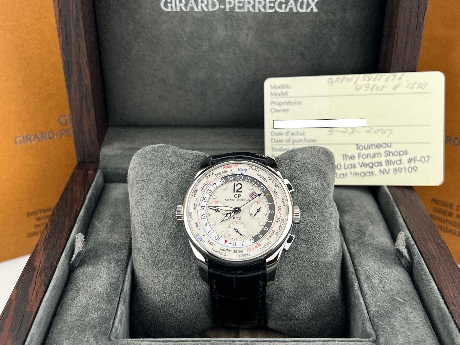 Girard Perregaux World Timer WW.TC Financial 49805 43mm White Dial Box Papers Girard-Perregaux Sale! from 699500 /per This item is a recurring or deferred purchase. By continuing, I agree to the cancellation policy and authorize you to charge my payment method at the prices, frequency and dates listed on this page until my order is fulfilled or I cancel, if permitted. +1 (619) 232-1273 This item is currently on backorder but you can still purchase it now and we'll ship as soon as more become available. Style Number: 49805Serial: 187****Year: 2007 Model: Girard Perregaux WW.TC Financial World Timer Case Material: Stainless Steel Band: Leather Bezel: Stainless Steel Dial: White Crystal: Sapphire Case Size: 43mm Includes: - Girard Perregaux Box & Papers - Certified Appraisal - 1 Year WarrantySKU 22975 / 18520T082625OC