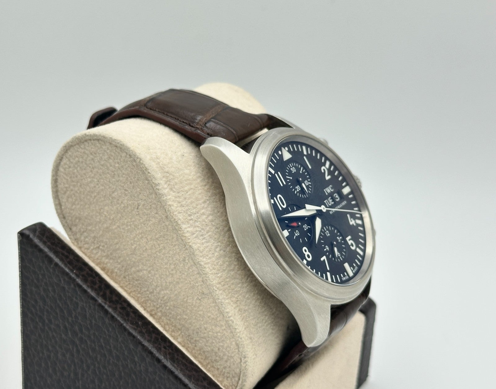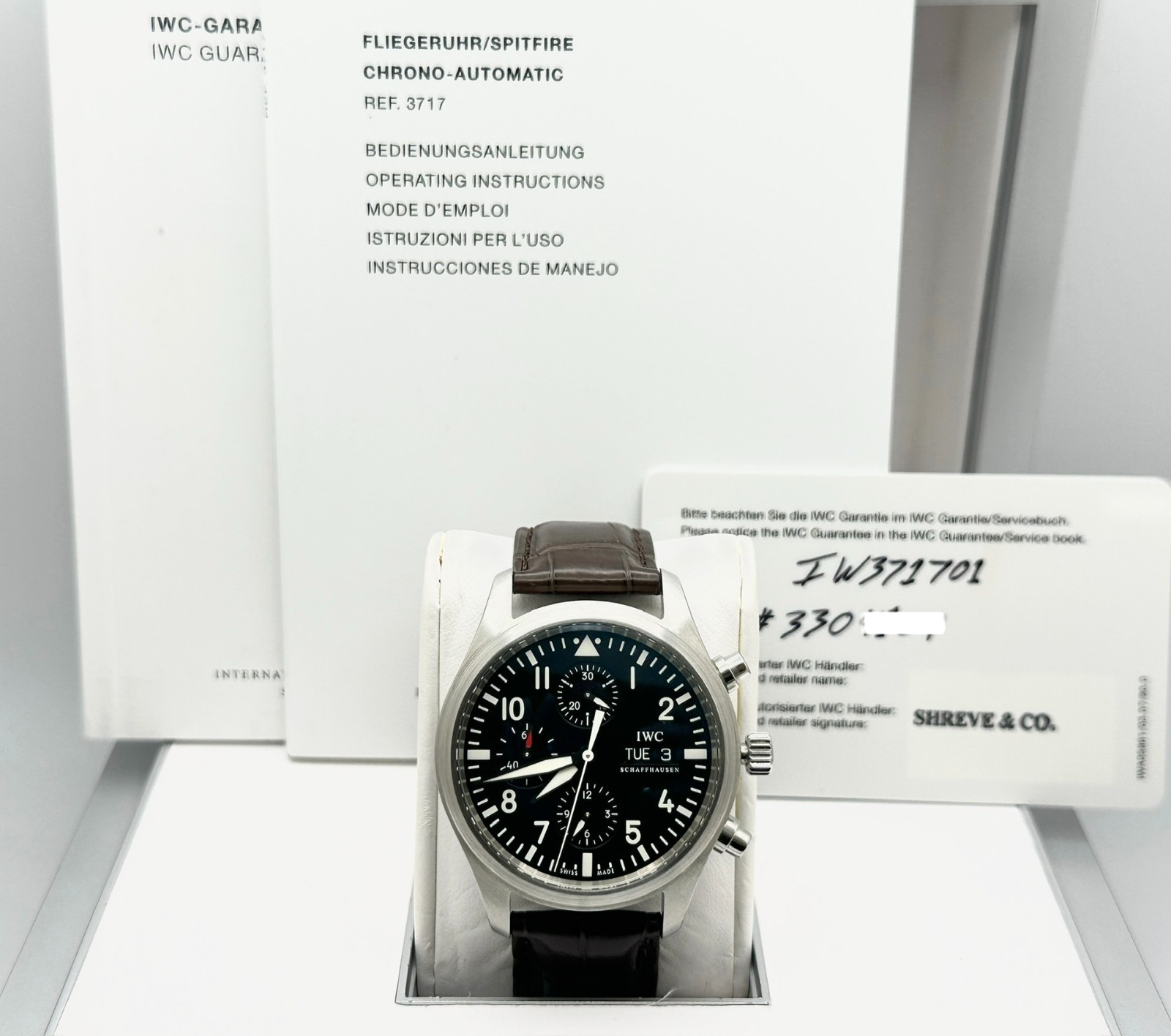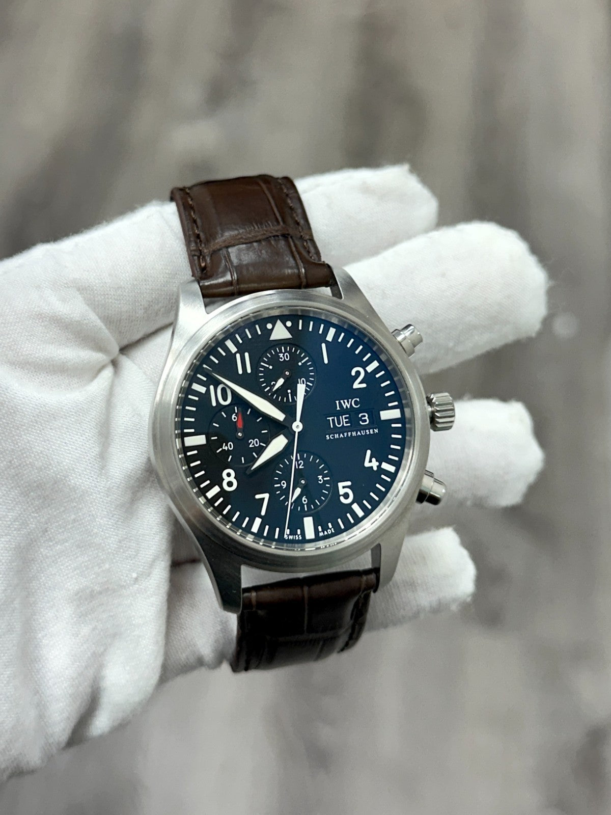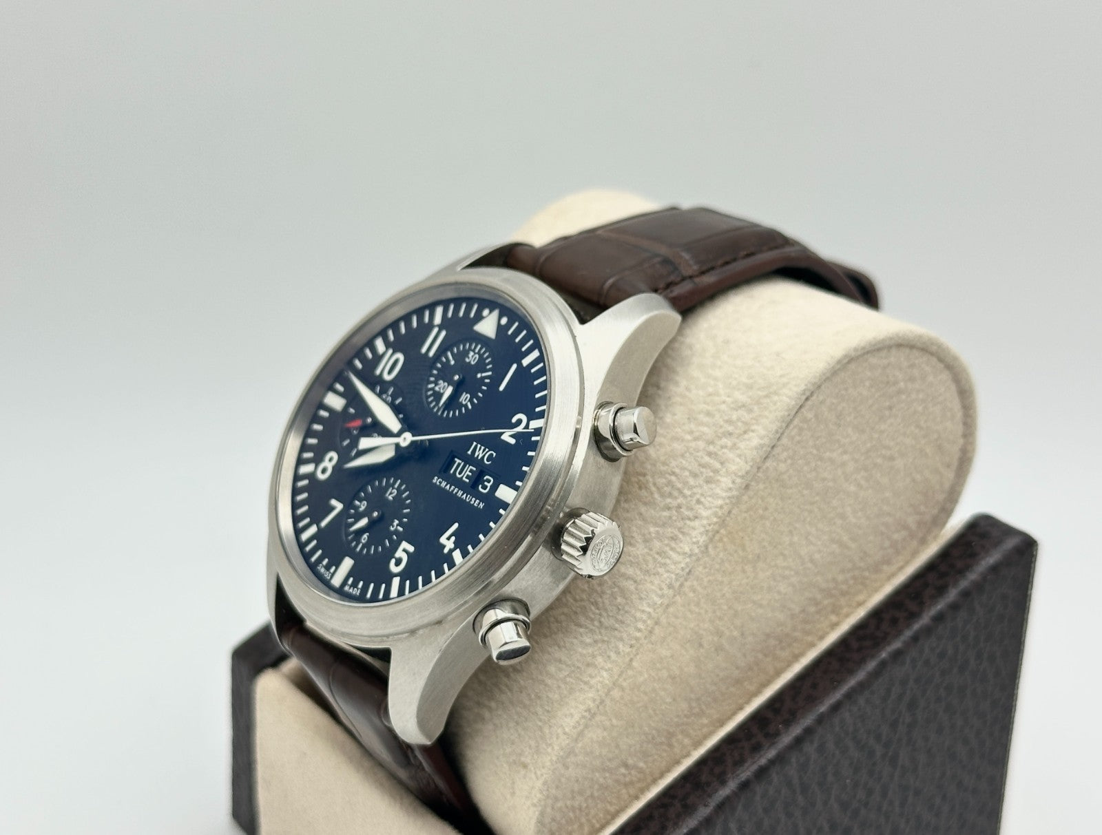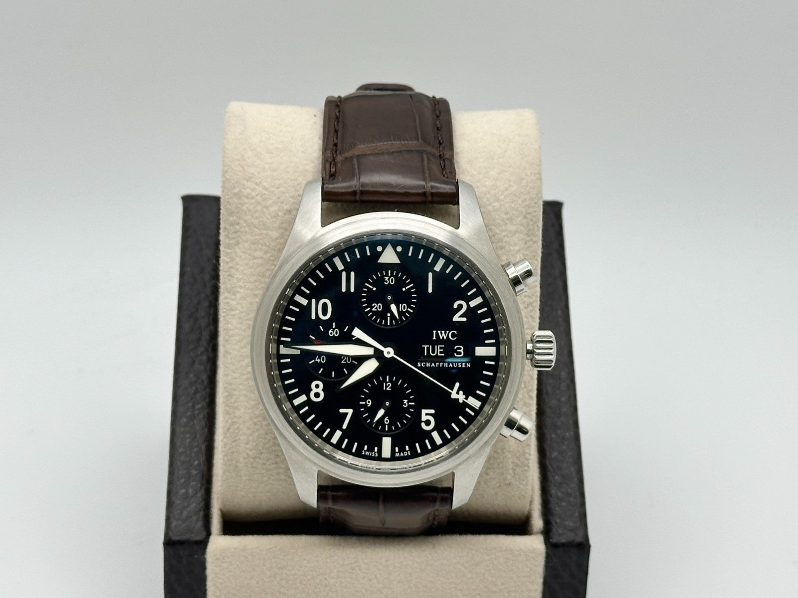 IWC Pilot Chronograph IW371701 42mm Black Dial Stainless Steel Box Paper IWC Sale! from 439500 /per This item is a recurring or deferred purchase. By continuing, I agree to the cancellation policy and authorize you to charge my payment method at the prices, frequency and dates listed on this page until my order is fulfilled or I cancel, if permitted. +1 (619) 232-1273 This item is currently on backorder but you can still purchase it now and we'll ship as soon as more become available. Style Number: IW371701 Model: IWC Schaffhausen Pilot Chronograph Case Material: Stainless Steel Band: Brown Leather Bezel: Stainless Steel Dial: Black Crystal: Sapphire Crystal Case Size: 42mm Includes: -IWC Box & Paper-Certified Appraisal -1 Year WarrantySKU 22225 / 16006TJD020225