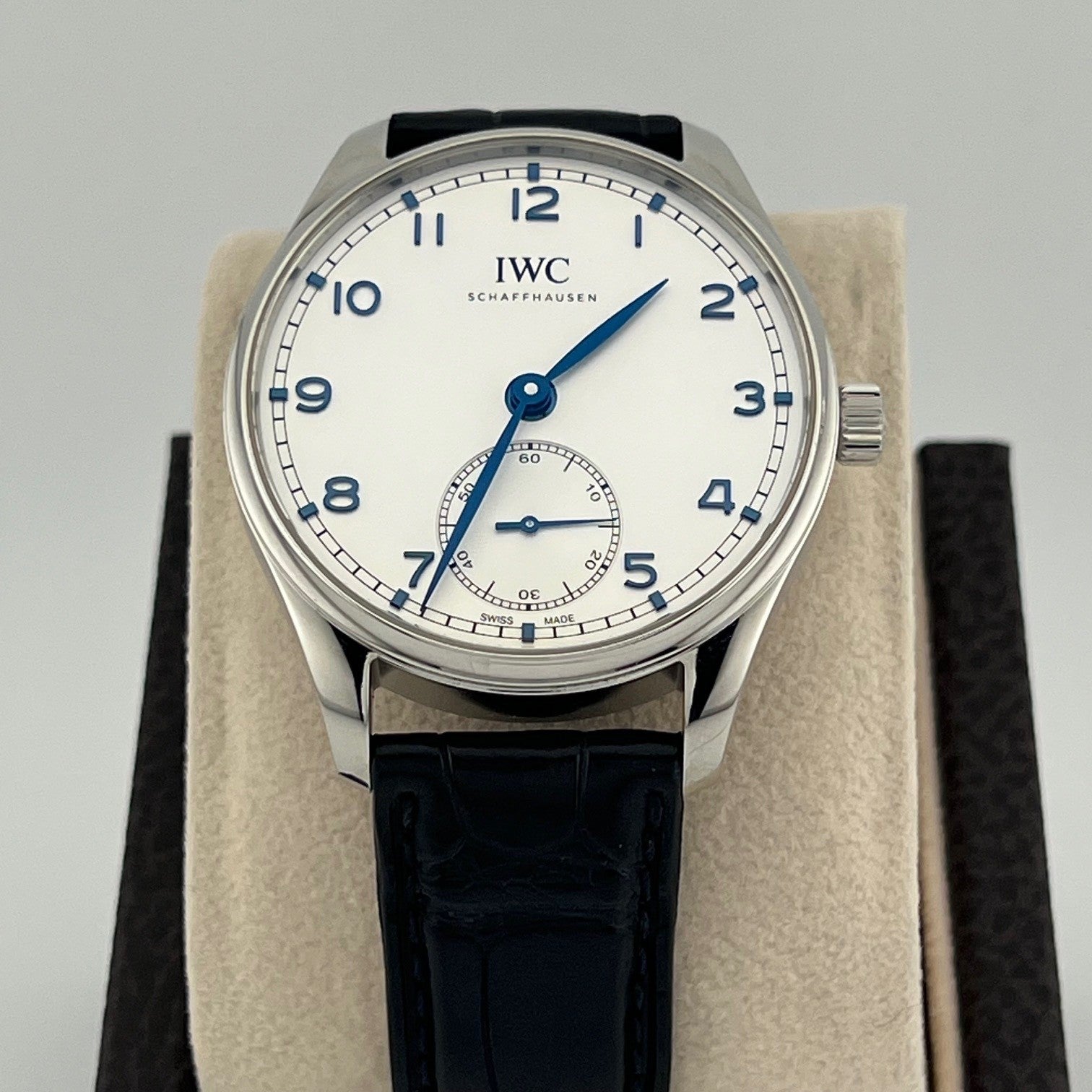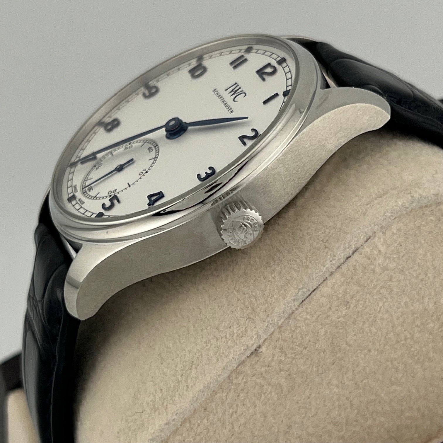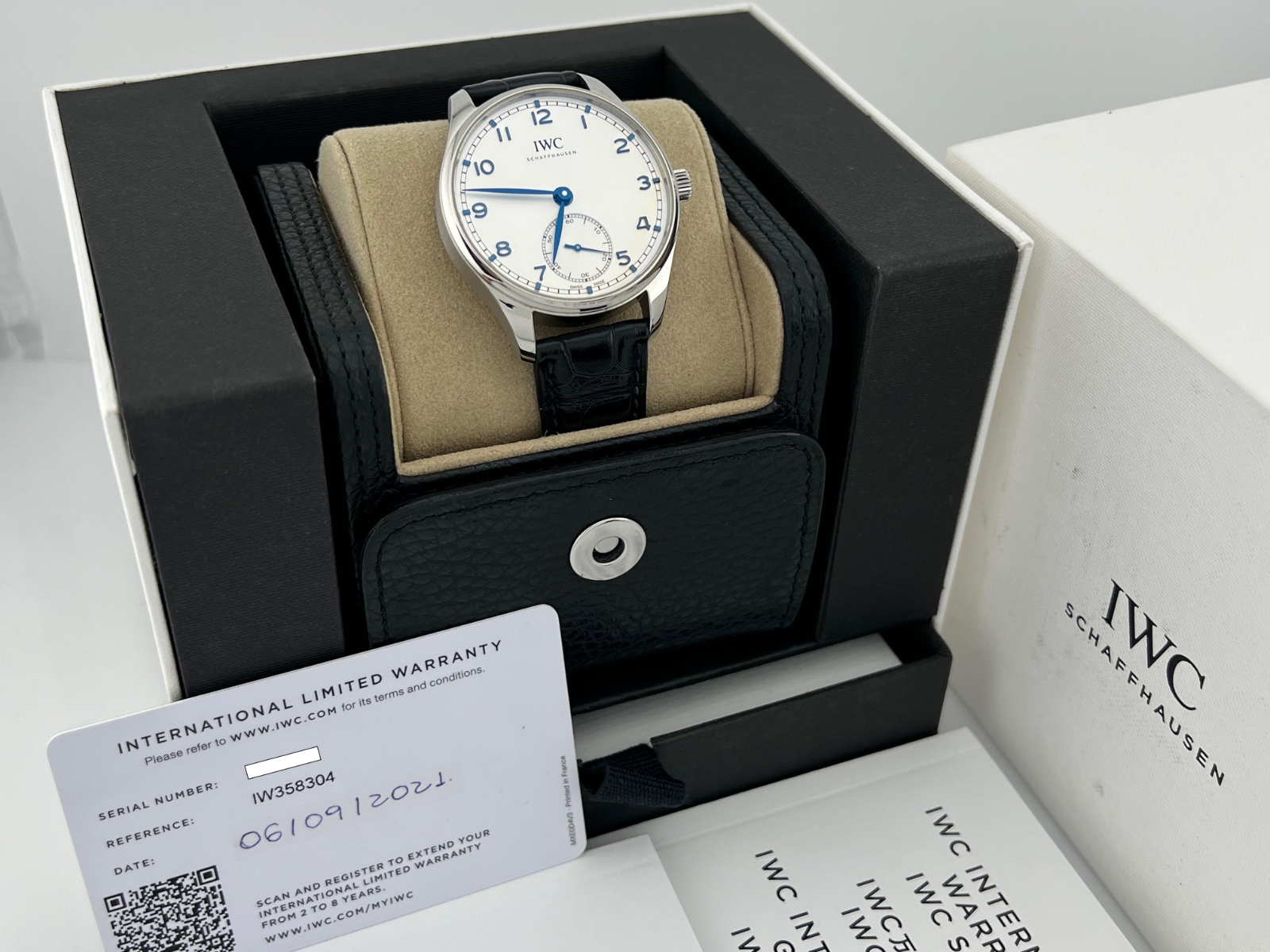 IWC Portugieser Automatic 40.4 IW358304 40.4mm White Dial Box Papers IWC Sale! from 599500 /per This item is a recurring or deferred purchase. By continuing, I agree to the cancellation policy and authorize you to charge my payment method at the prices, frequency and dates listed on this page until my order is fulfilled or I cancel, if permitted. +1 (619) 232-1273 This item is currently on backorder but you can still purchase it now and we'll ship as soon as more become available. Style Number: IW358304Serial: 587****Year: 2021 Model: IWC Portugieser Automatic 40.4 Case Material: Stainless Steel Band: Black Leather Bezel: Stainless Steel Dial: White Case Size: 40.4mm Includes: -IWC Box & Papers -Certified Appraisal -1 Year WarrantySKU 20748 / 17470TSH120923