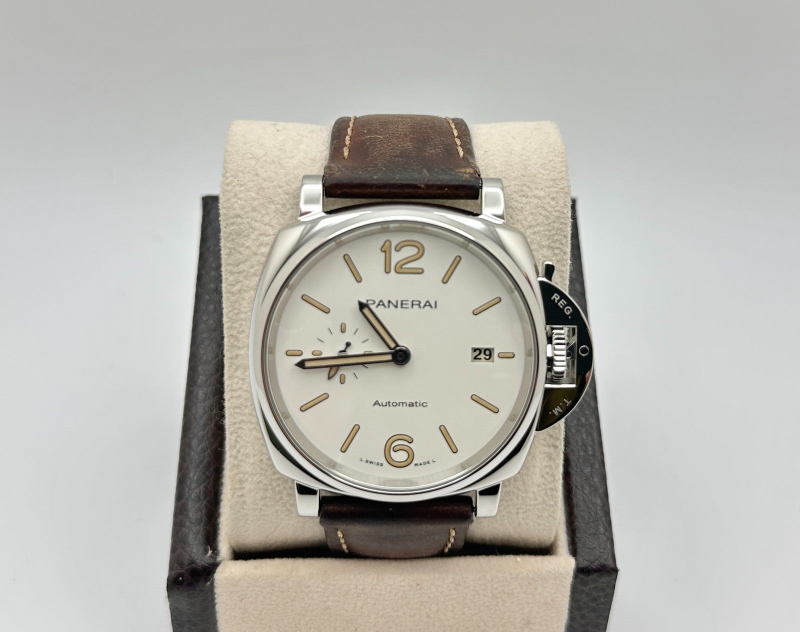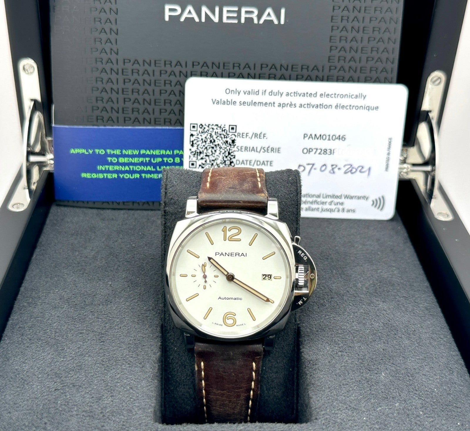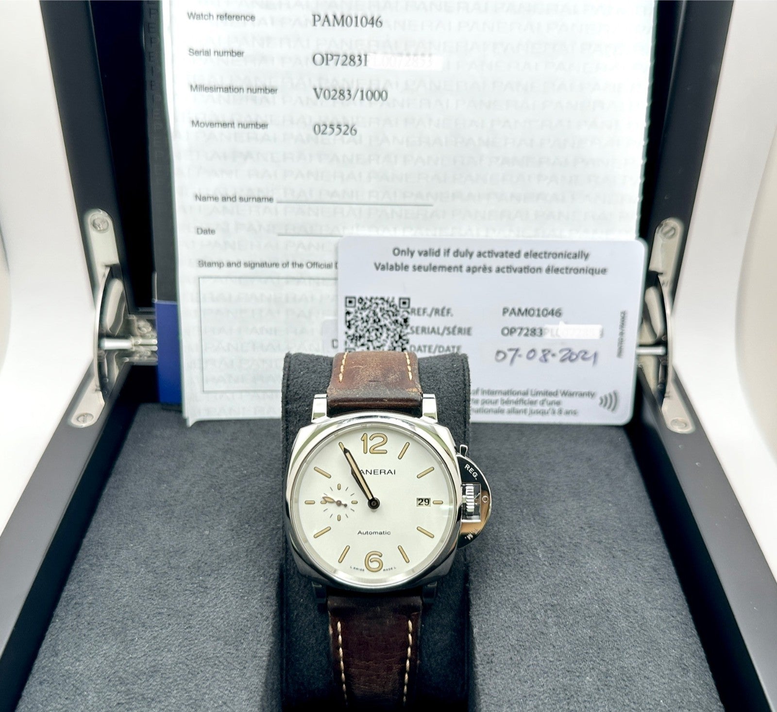 Panerai PAM01046 PAM 1046 42mm Luminor Due White Dial Steel Box Paper 2021 Panerai Sale! from 459500 /per This item is a recurring or deferred purchase. By continuing, I agree to the cancellation policy and authorize you to charge my payment method at the prices, frequency and dates listed on this page until my order is fulfilled or I cancel, if permitted. +1 (619) 232-1273 This item is currently on backorder but you can still purchase it now and we'll ship as soon as more become available. Style Number: PAM01046Year: 2021 Model: Panerai Luminor Due Case Material: Stainless Steel Band: Brown Leather Bezel: Stainless Steel Dial: White Face: Sapphire Crystal Case Size: 42mm Includes: -Panerai Box & Paper-Certified Appraisal -1 Year WarrantySKU 21310 / 17836TJD051624