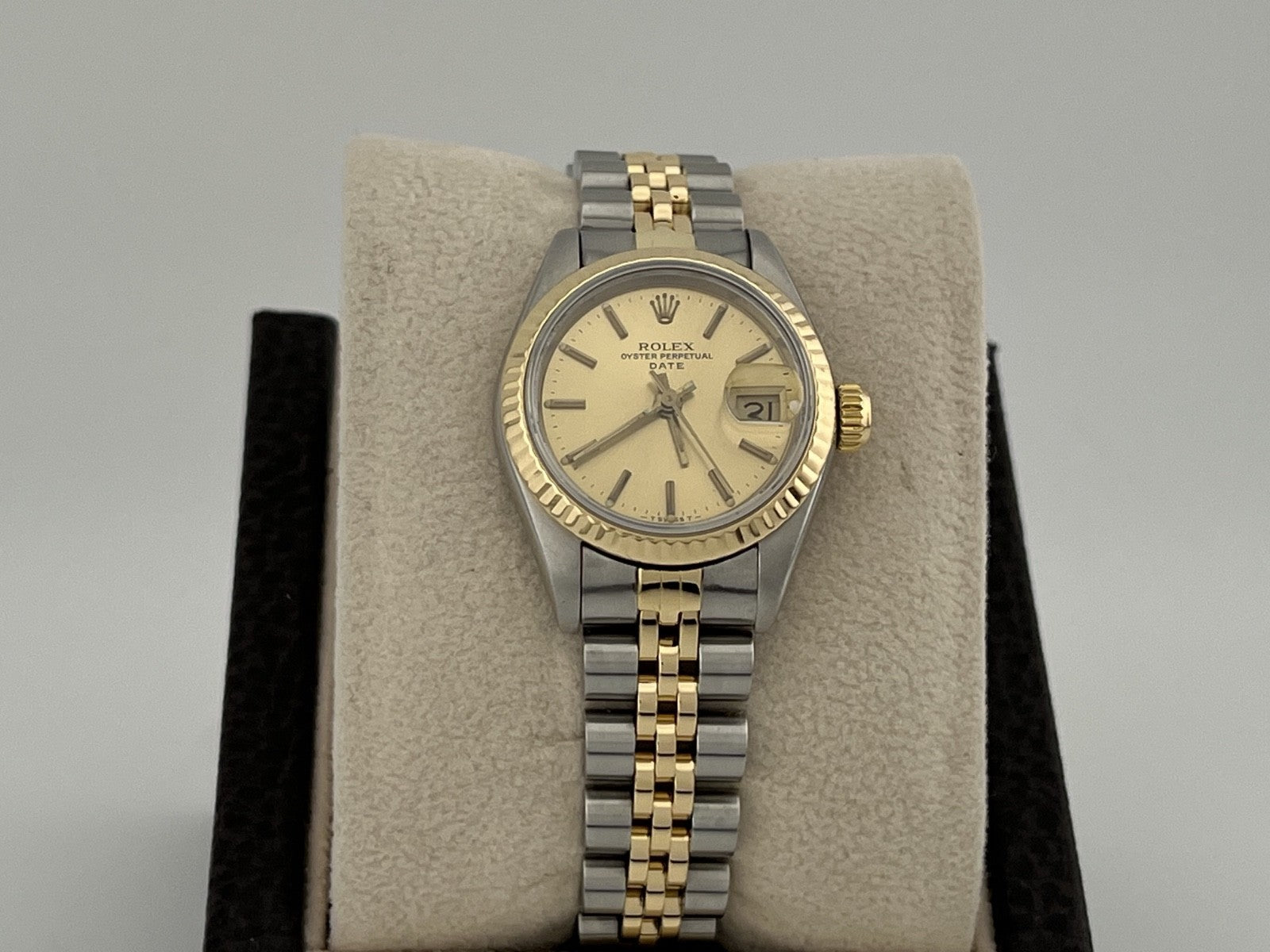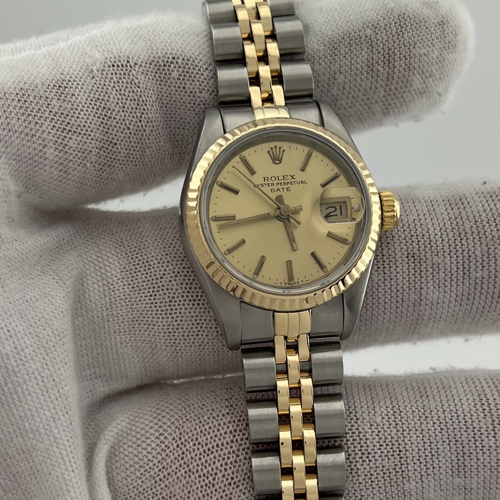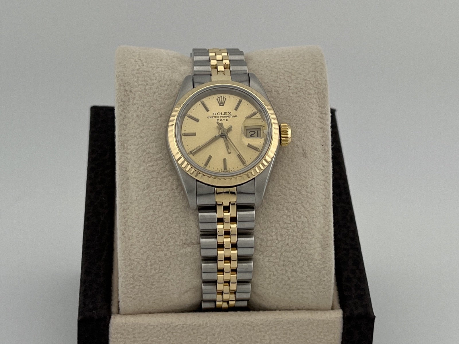 Rolex Datejust Ladies 69173 26mm Champagne Dial 18k Yellow Gold Stainless Steel Rolex Sale! from 549500 /per This item is a recurring or deferred purchase. By continuing, I agree to the cancellation policy and authorize you to charge my payment method at the prices, frequency and dates listed on this page until my order is fulfilled or I cancel, if permitted. +1 (619) 232-1273 This item is currently on backorder but you can still purchase it now and we'll ship as soon as more become available. Style Number: 69173Serial: 805**** Year: 1983 Model: Rolex Ladies Datejust Case Material: Stainless Steel Band: 18k Yellow Gold & Stainless Steel Jubilee Bezel: 18k Yellow Gold Fluted Dial: Champagne Crystal: Sapphire Case Size: 26mm Includes: - Elegant Watch Box- Certified Appraisal - One Year WarrantySKU 21228 / 14176TLK040824