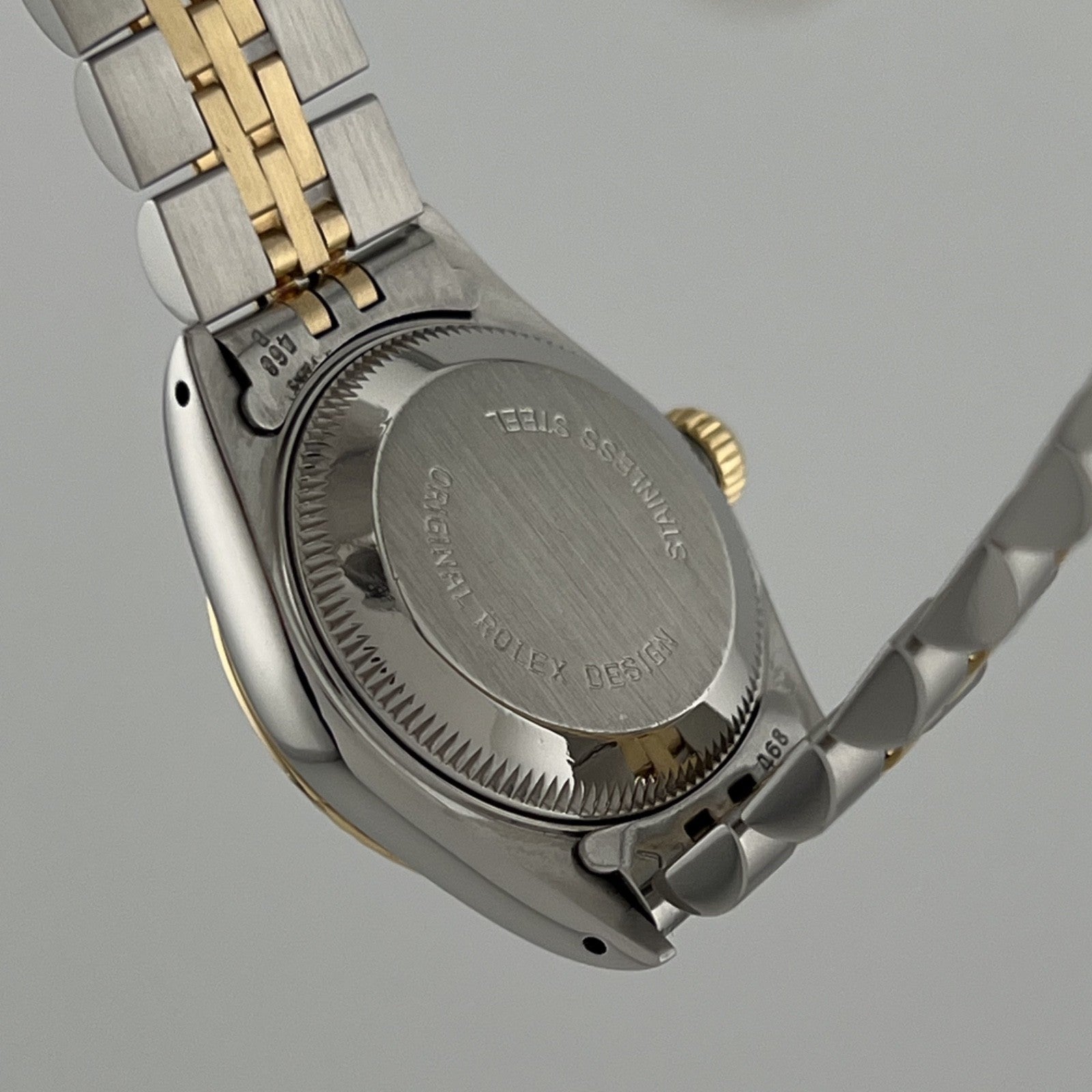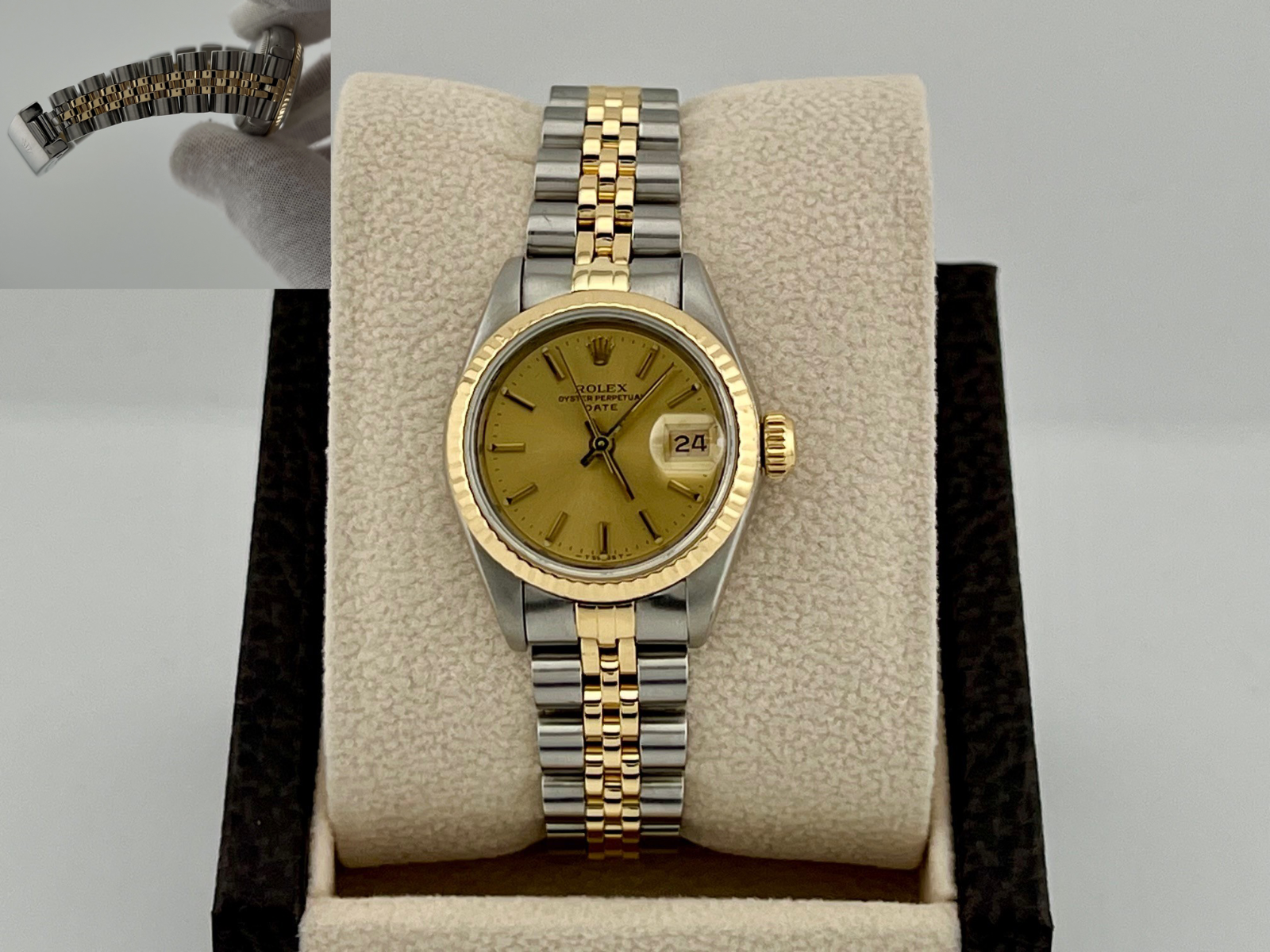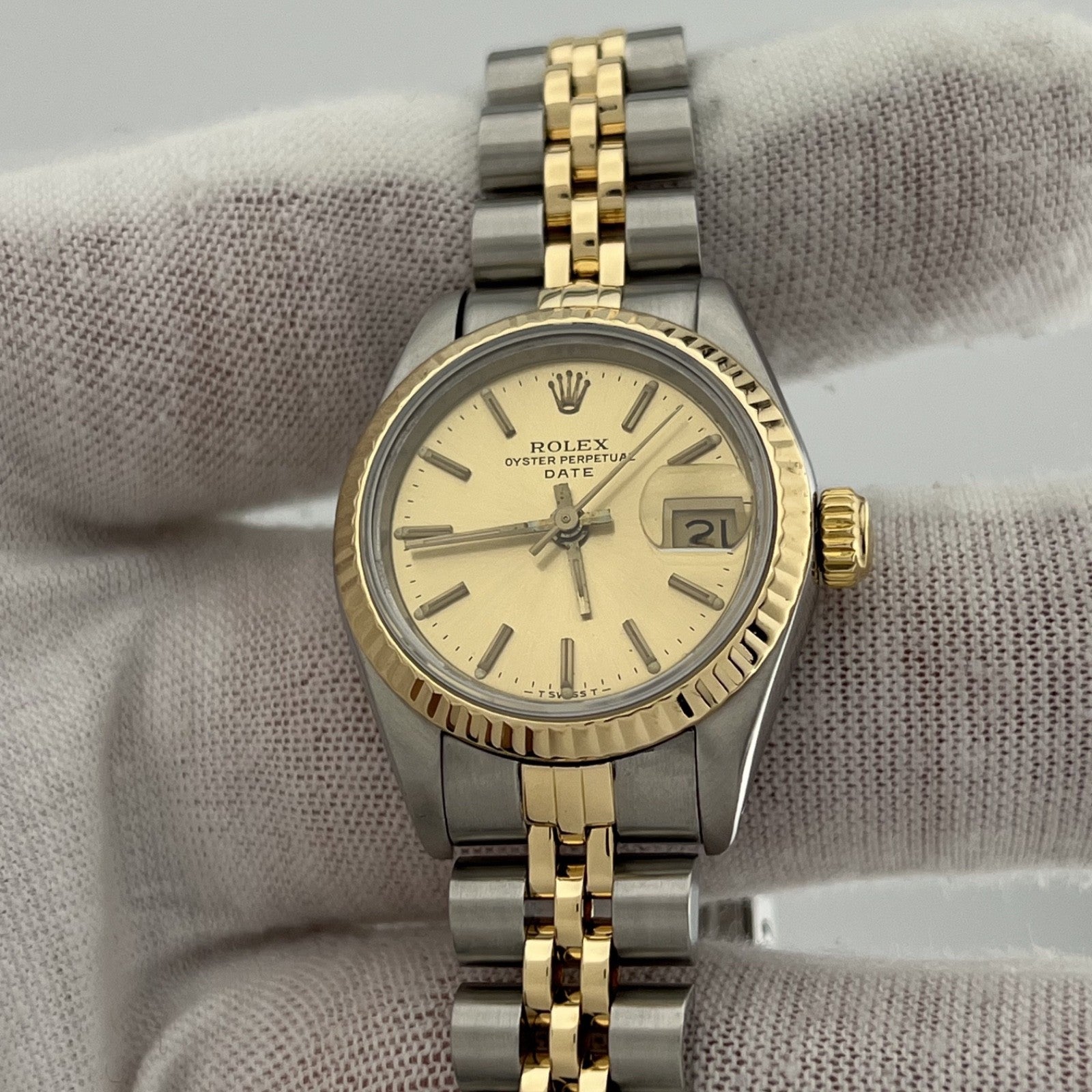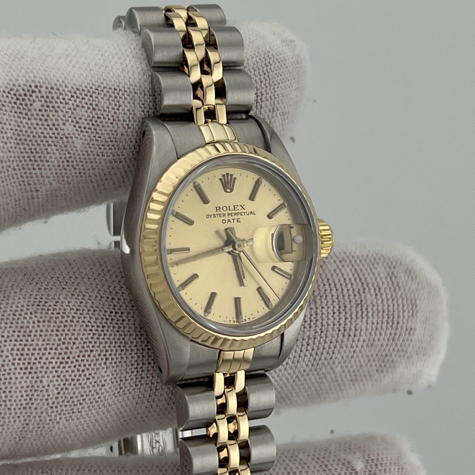 Rolex Datejust Ladies 69173 26mm Champagne Dial 18k Yellow Gold Stainless Steel Rolex Sale! from 549500 /per This item is a recurring or deferred purchase. By continuing, I agree to the cancellation policy and authorize you to charge my payment method at the prices, frequency and dates listed on this page until my order is fulfilled or I cancel, if permitted. +1 (619) 232-1273 This item is currently on backorder but you can still purchase it now and we'll ship as soon as more become available. Style Number: 69173Serial: 805**** Year: 1983 Model: Rolex Ladies Datejust Case Material: Stainless Steel Band: 18k Yellow Gold & Stainless Steel Jubilee Bezel: 18k Yellow Gold Fluted Dial: Champagne Crystal: Sapphire Case Size: 26mm Includes: - Elegant Watch Box- Certified Appraisal - One Year WarrantySKU 21228 / 14176TLK040824
