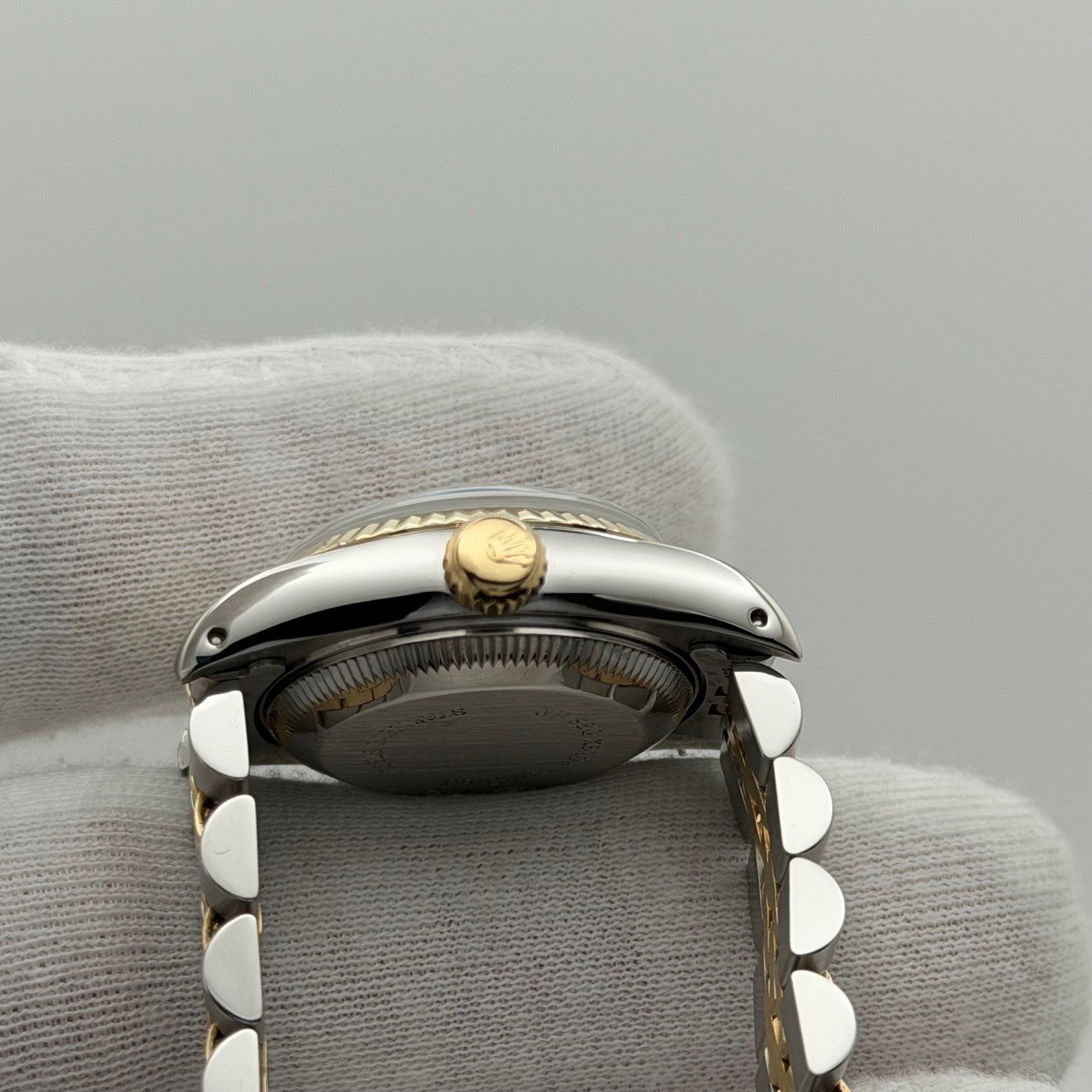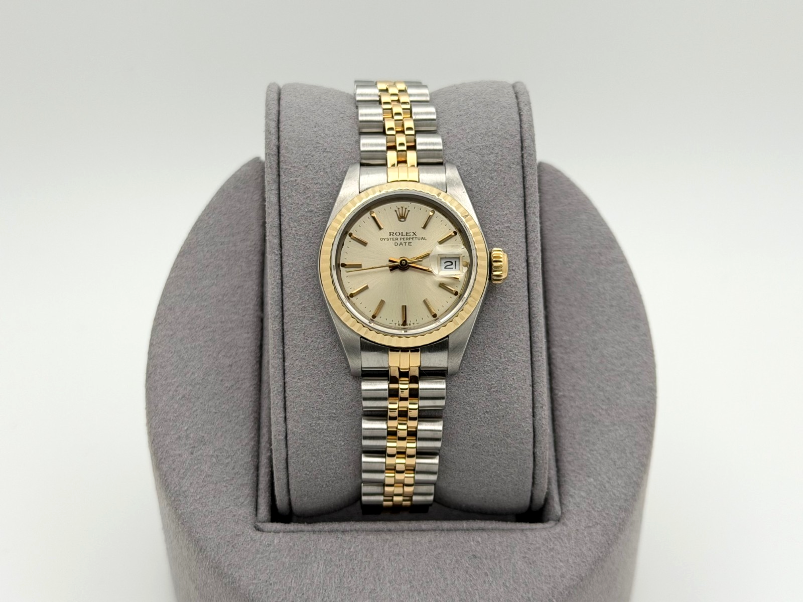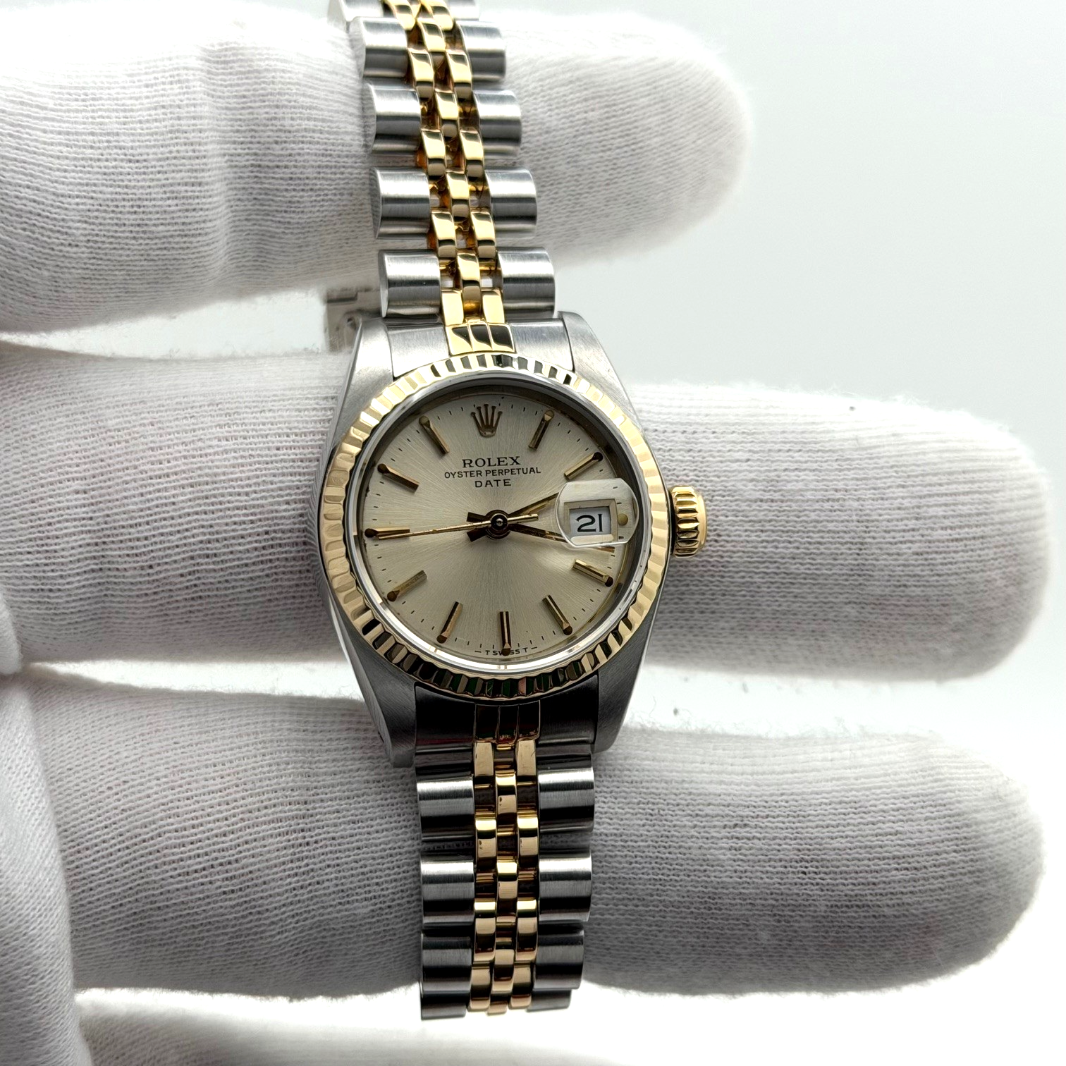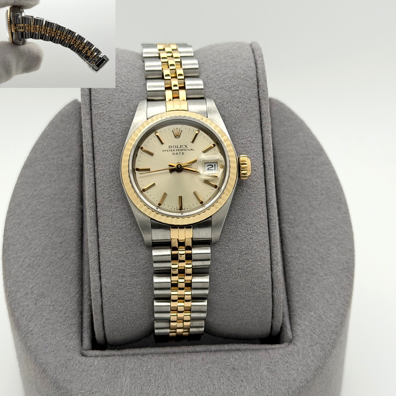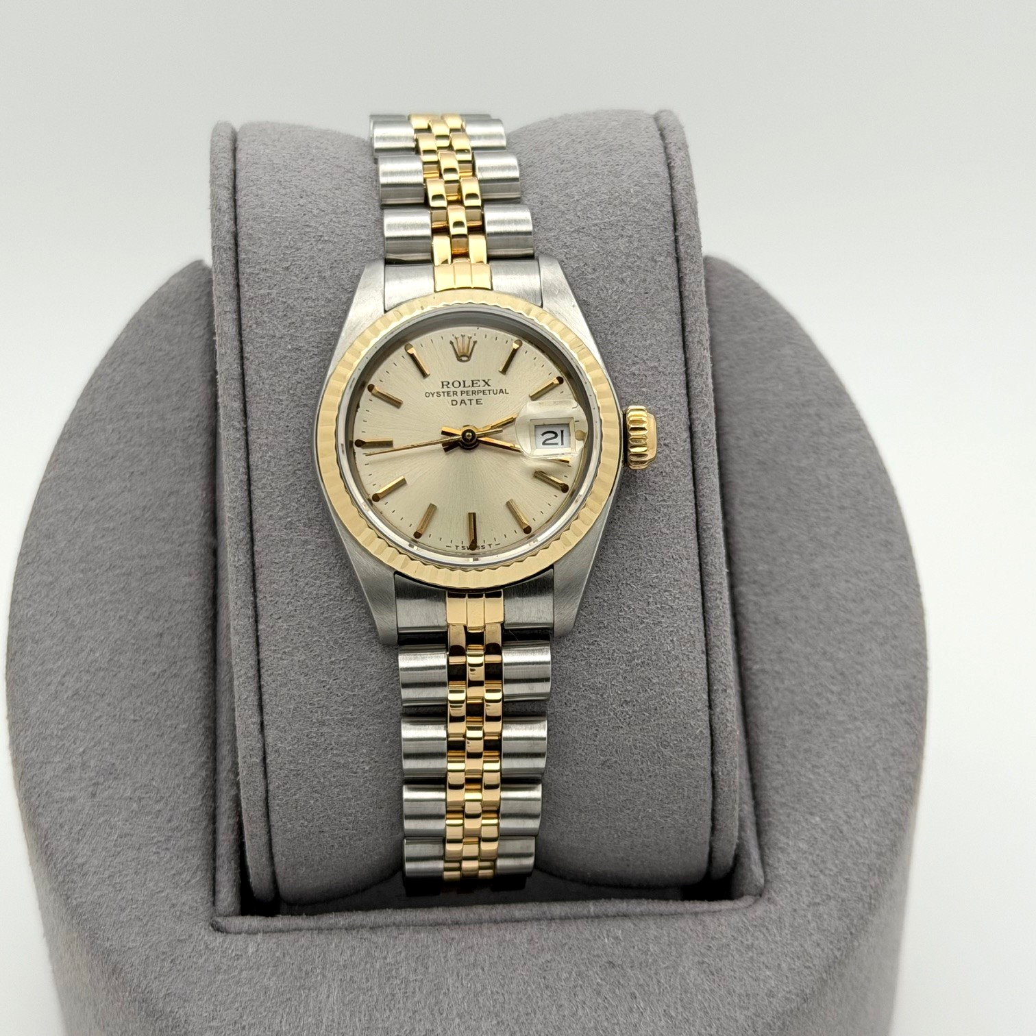 Rolex Ladies Date 69173 26mm Silver Dial 18k Yellow Gold Steel Jubilee Rolex Sale! from 499500 /per This item is a recurring or deferred purchase. By continuing, I agree to the cancellation policy and authorize you to charge my payment method at the prices, frequency and dates listed on this page until my order is fulfilled or I cancel, if permitted. +1 (619) 232-1273 This item is currently on backorder but you can still purchase it now and we'll ship as soon as more become available. Style Number: 69173Serial: 868****Year: 1985 Model: Rolex Ladies Date Case Material: Stainless Steel Band: 18k Yellow Gold & Stainless Steel Jubilee Bezel: 18k Yellow Gold Fluted Dial: Silver Crystal: Sapphire Case Size: 26mm Includes: - Elegant Watch Box- Certified Appraisal - 1 Year WarrantySKU 21578 / 14542TBB081524