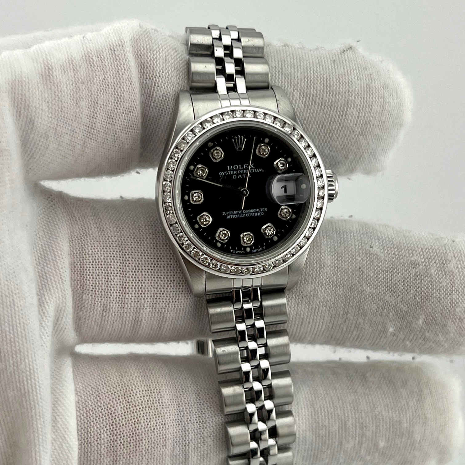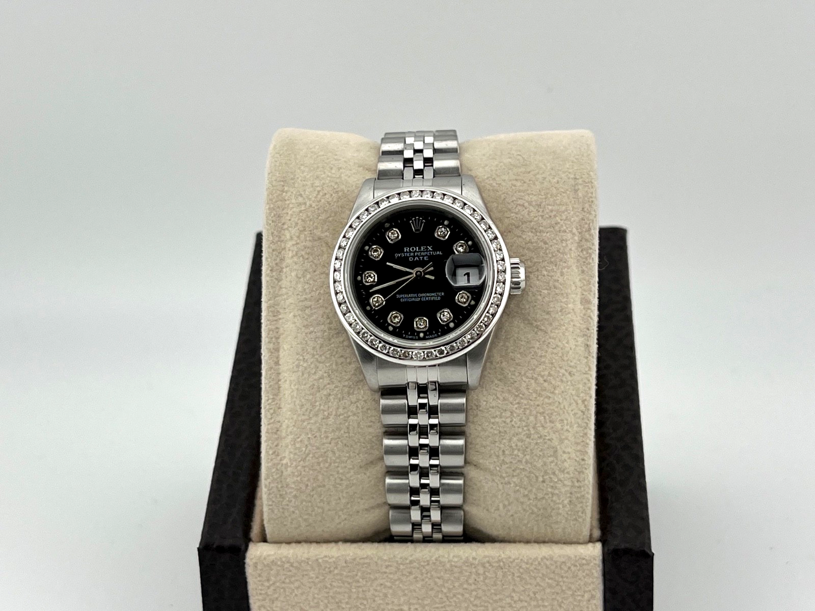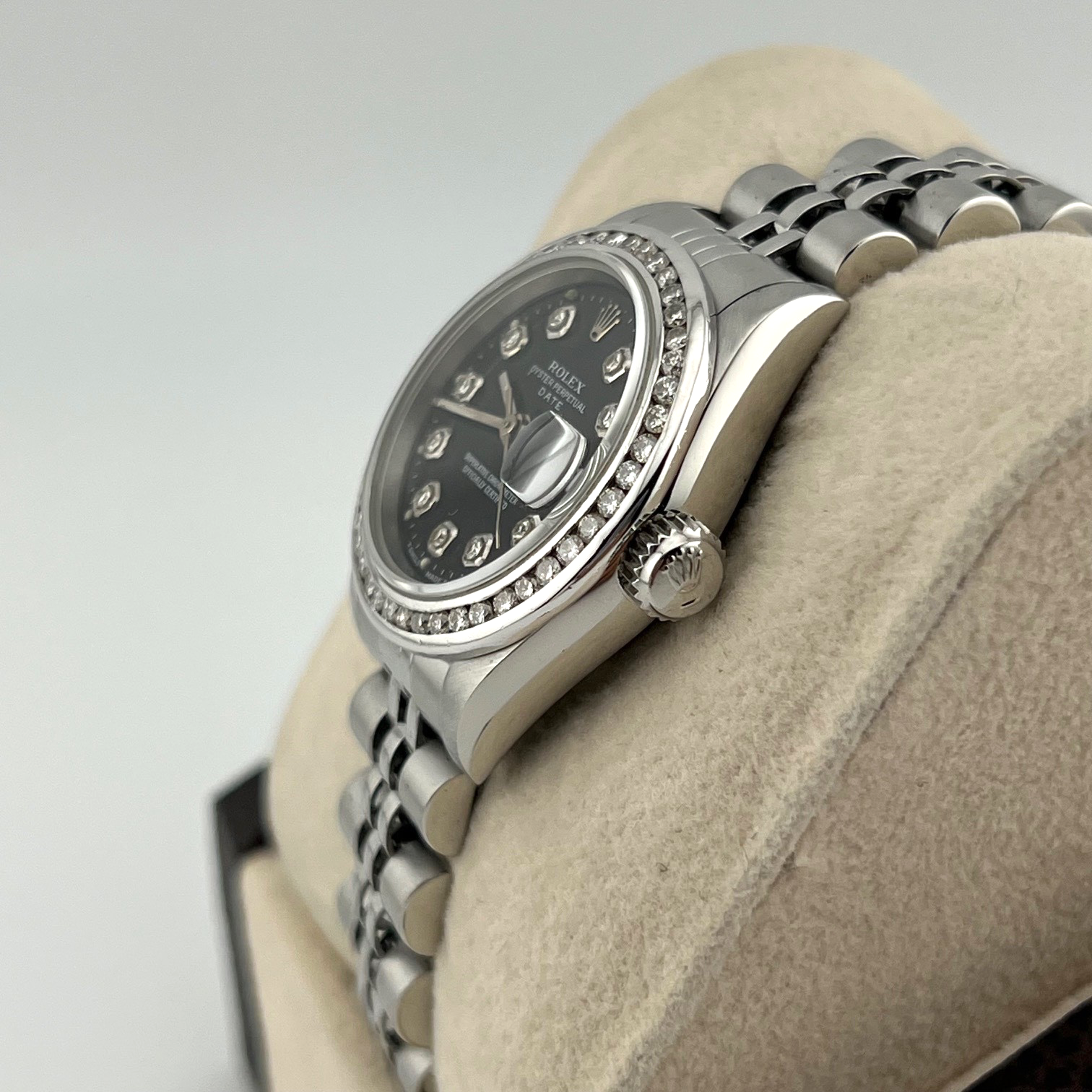 Rolex Ladies Date 69240 26mm Black Diamond Dial Diamond Bezel Stainless Steel