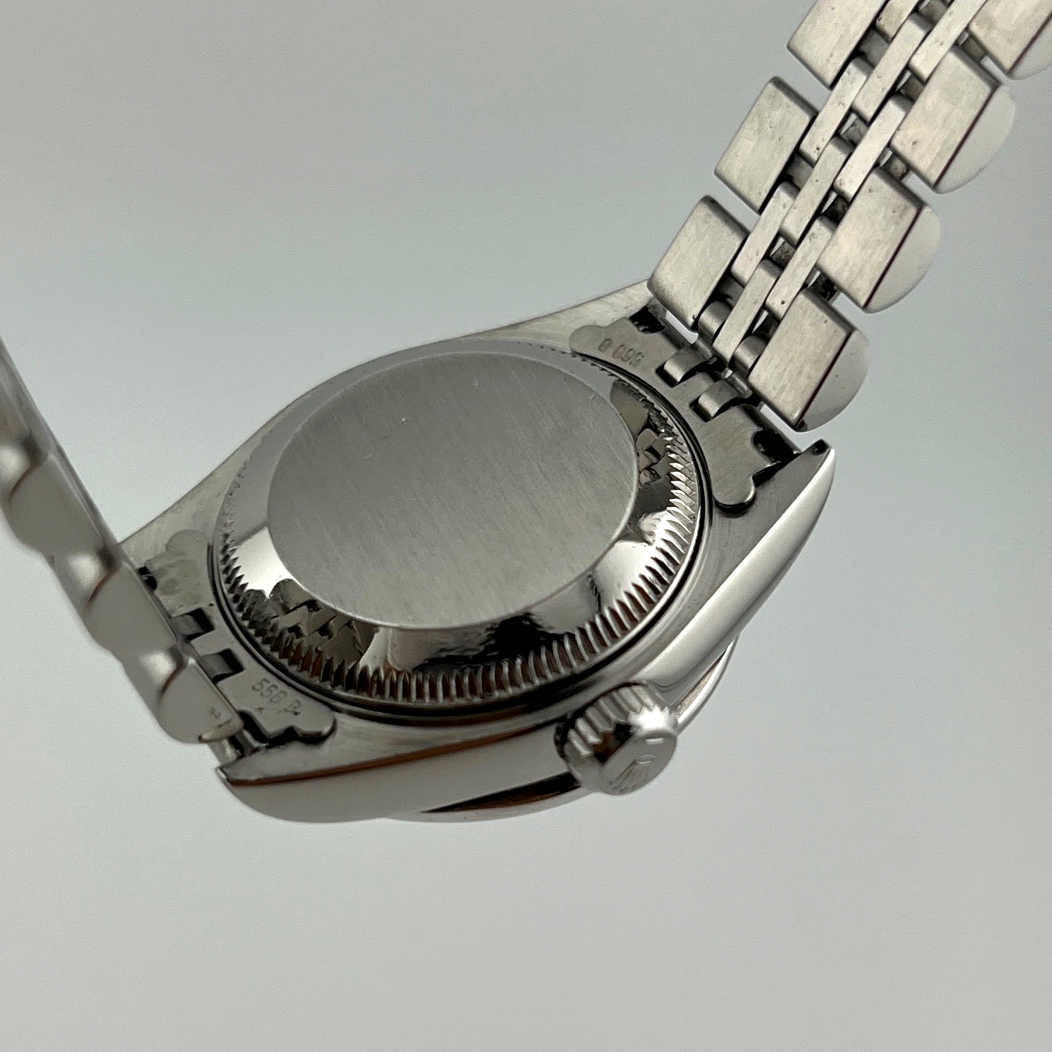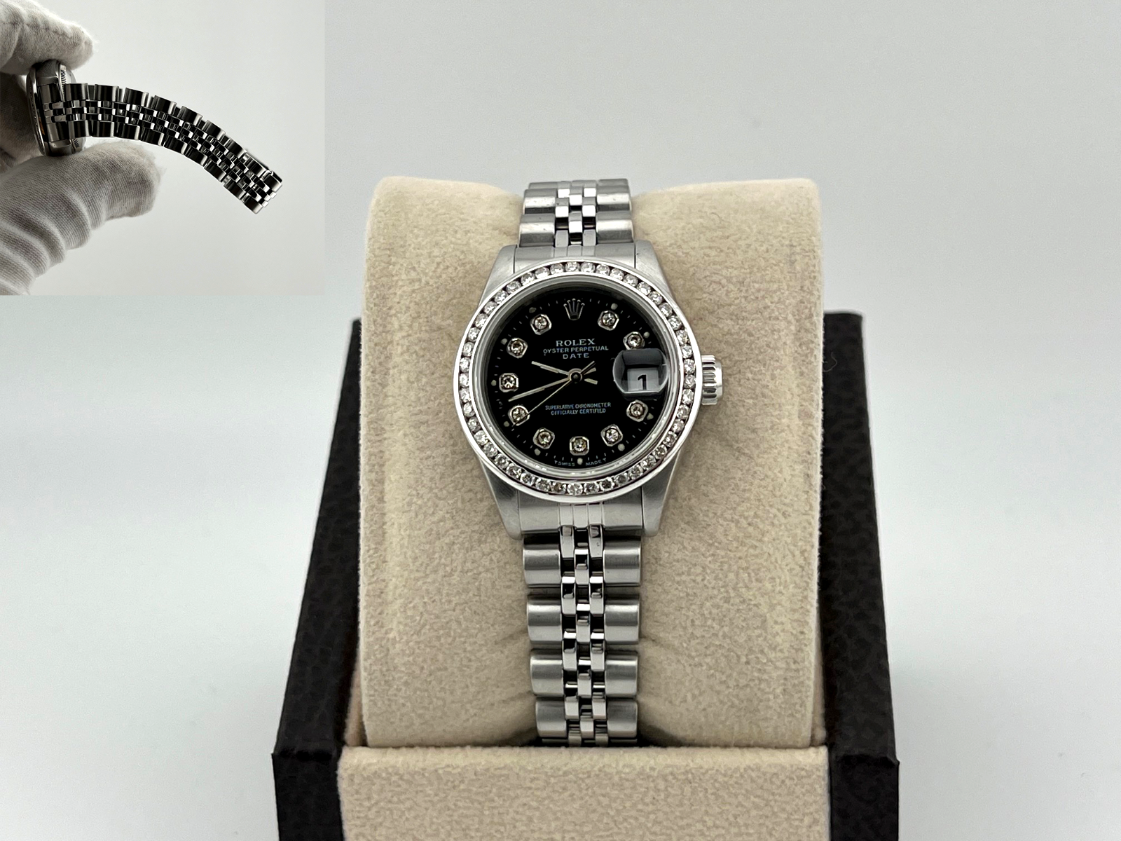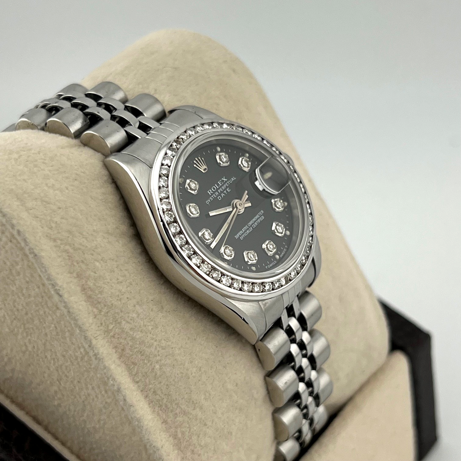 Rolex Ladies Date 69240 26mm Black Diamond Dial Diamond Bezel Stainless Steel