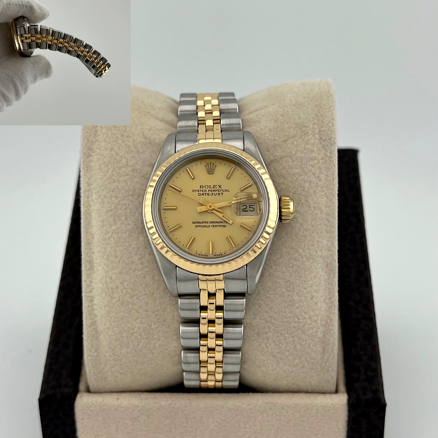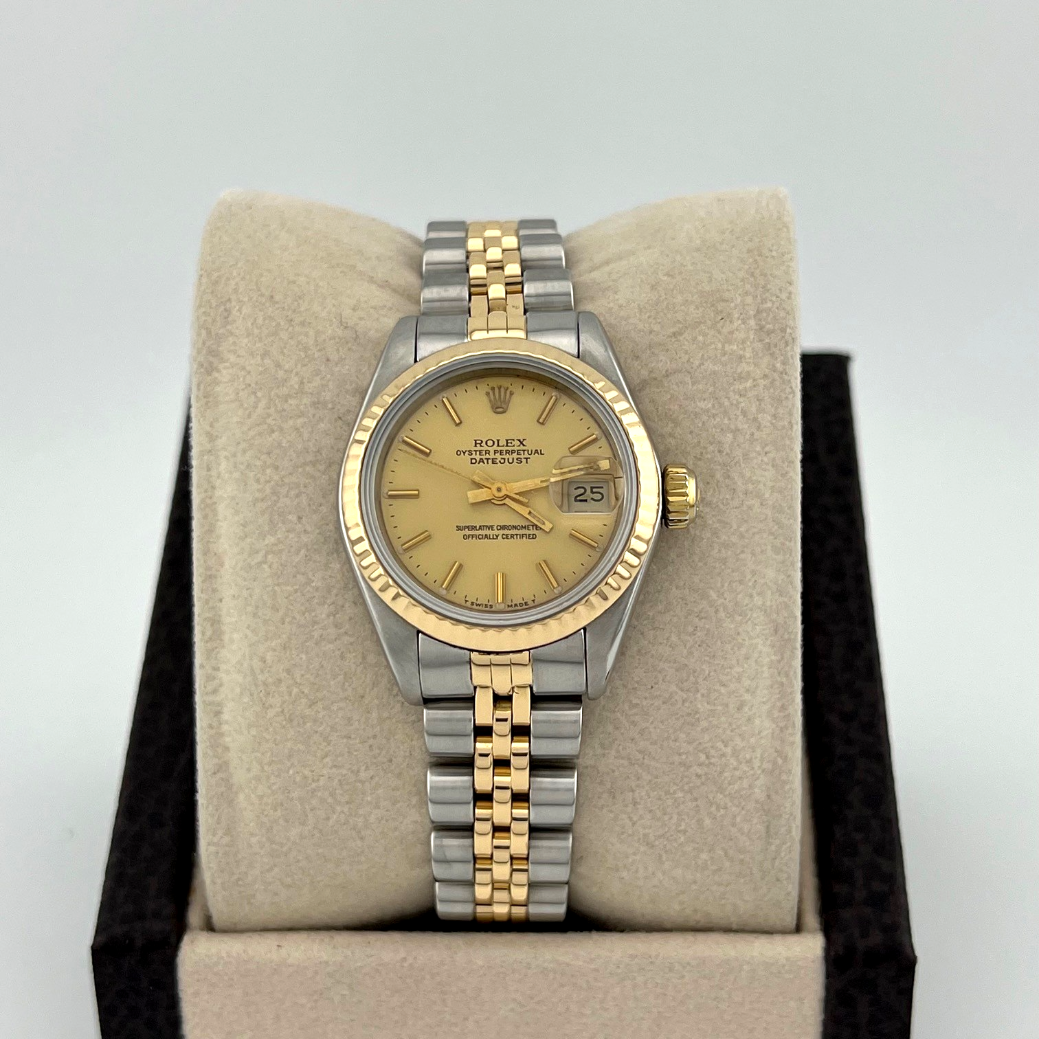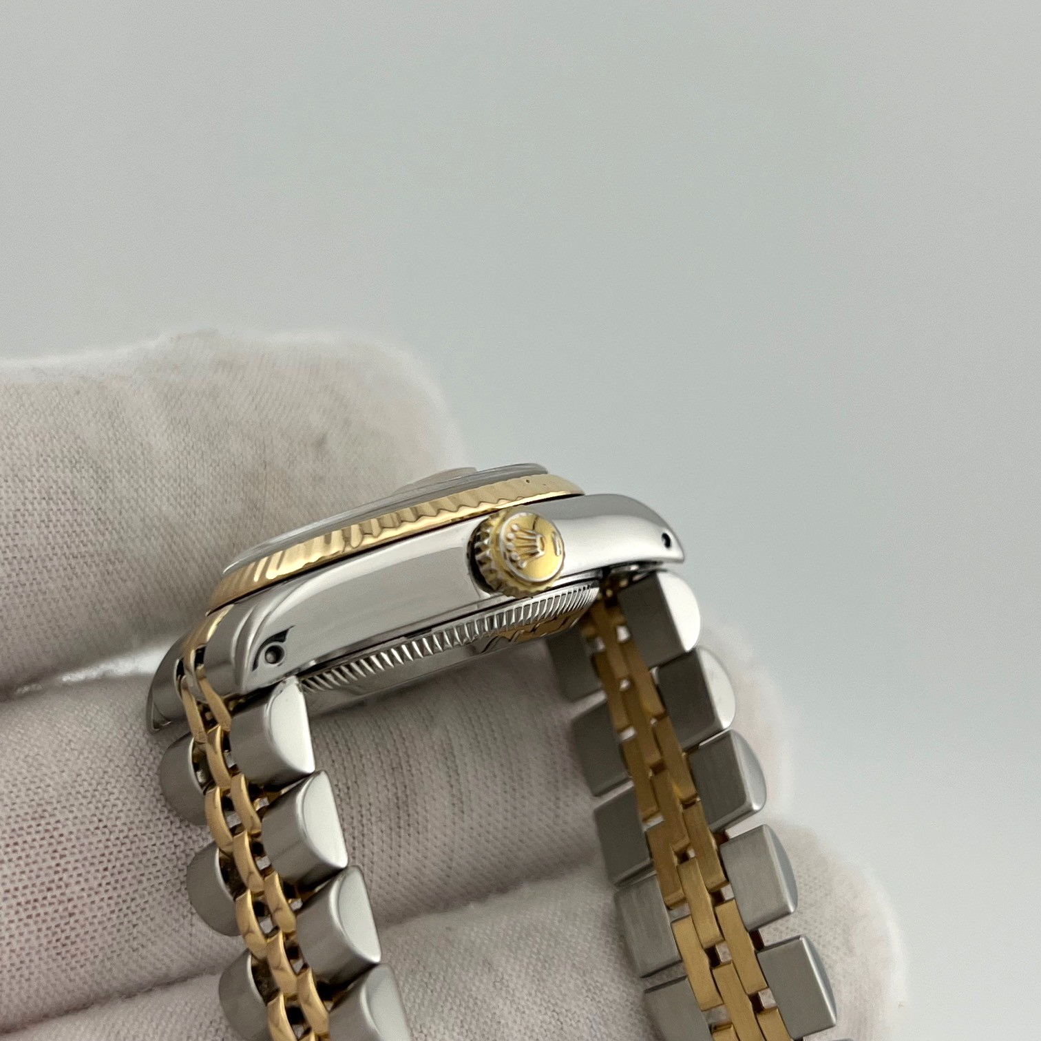 Rolex Ladies Datejust 69173 26mm Champagne Dial Jubilee 18k Gold Steel Box Paper Rolex Sale! from 579500 /per This item is a recurring or deferred purchase. By continuing, I agree to the cancellation policy and authorize you to charge my payment method at the prices, frequency and dates listed on this page until my order is fulfilled or I cancel, if permitted. +1 (619) 232-1273 This item is currently on backorder but you can still purchase it now and we'll ship as soon as more become available. Style Number: 69173Serial: R44****Year: 1988 Model: Rolex Ladies Datejust Case Material: Stainless Steel Band: 18k Yellow Gold & Stainless Steel Jubilee Bezel: 18k Yellow Gold Fluted Dial: Champagne Dial Crystal: Sapphire Case Size: 26mm Includes: - Rolex Box & Paper- Certified Appraisal - 1 Year WarrantySKU 23143 / 16465TOC100225