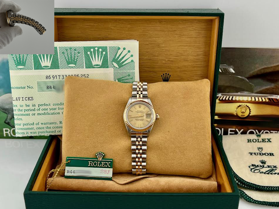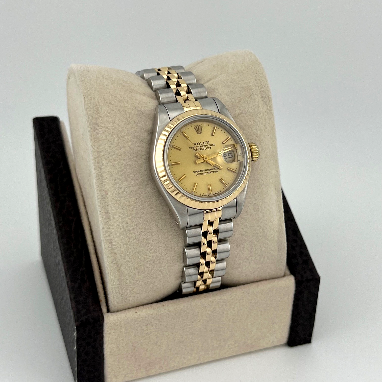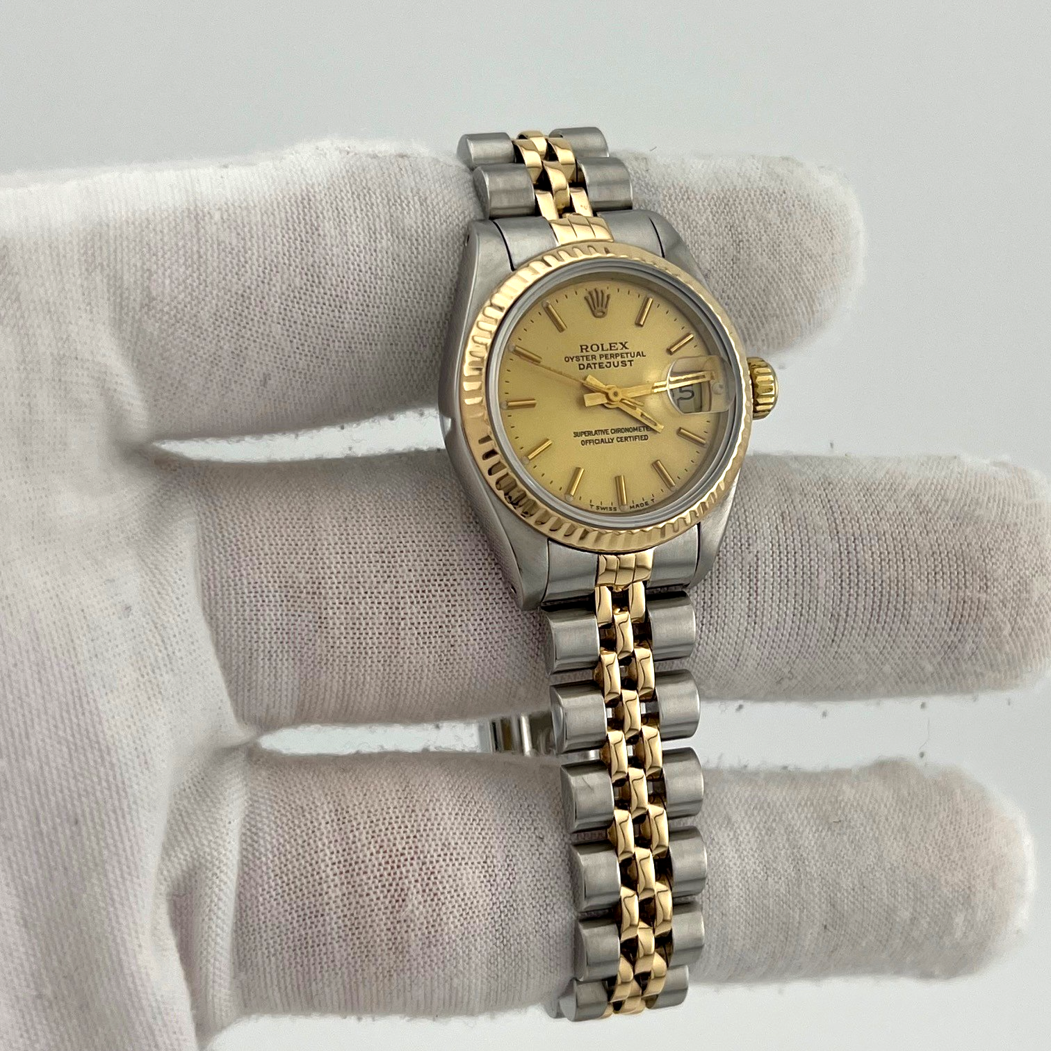 Rolex Ladies Datejust 69173 26mm Champagne Dial Jubilee 18k Gold Steel Box Paper Rolex Sale! from 579500 /per This item is a recurring or deferred purchase. By continuing, I agree to the cancellation policy and authorize you to charge my payment method at the prices, frequency and dates listed on this page until my order is fulfilled or I cancel, if permitted. +1 (619) 232-1273 This item is currently on backorder but you can still purchase it now and we'll ship as soon as more become available. Style Number: 69173Serial: R44****Year: 1988 Model: Rolex Ladies Datejust Case Material: Stainless Steel Band: 18k Yellow Gold & Stainless Steel Jubilee Bezel: 18k Yellow Gold Fluted Dial: Champagne Dial Crystal: Sapphire Case Size: 26mm Includes: - Rolex Box & Paper- Certified Appraisal - 1 Year WarrantySKU 23143 / 16465TOC100225