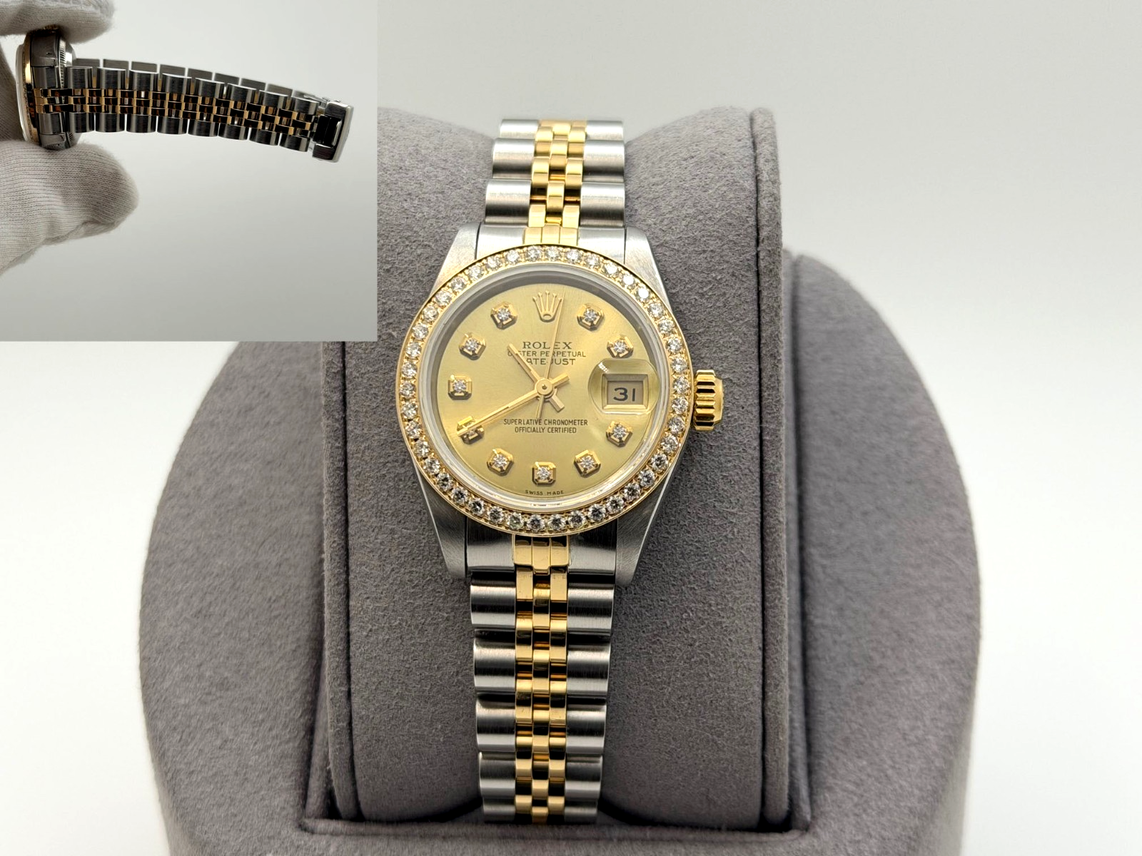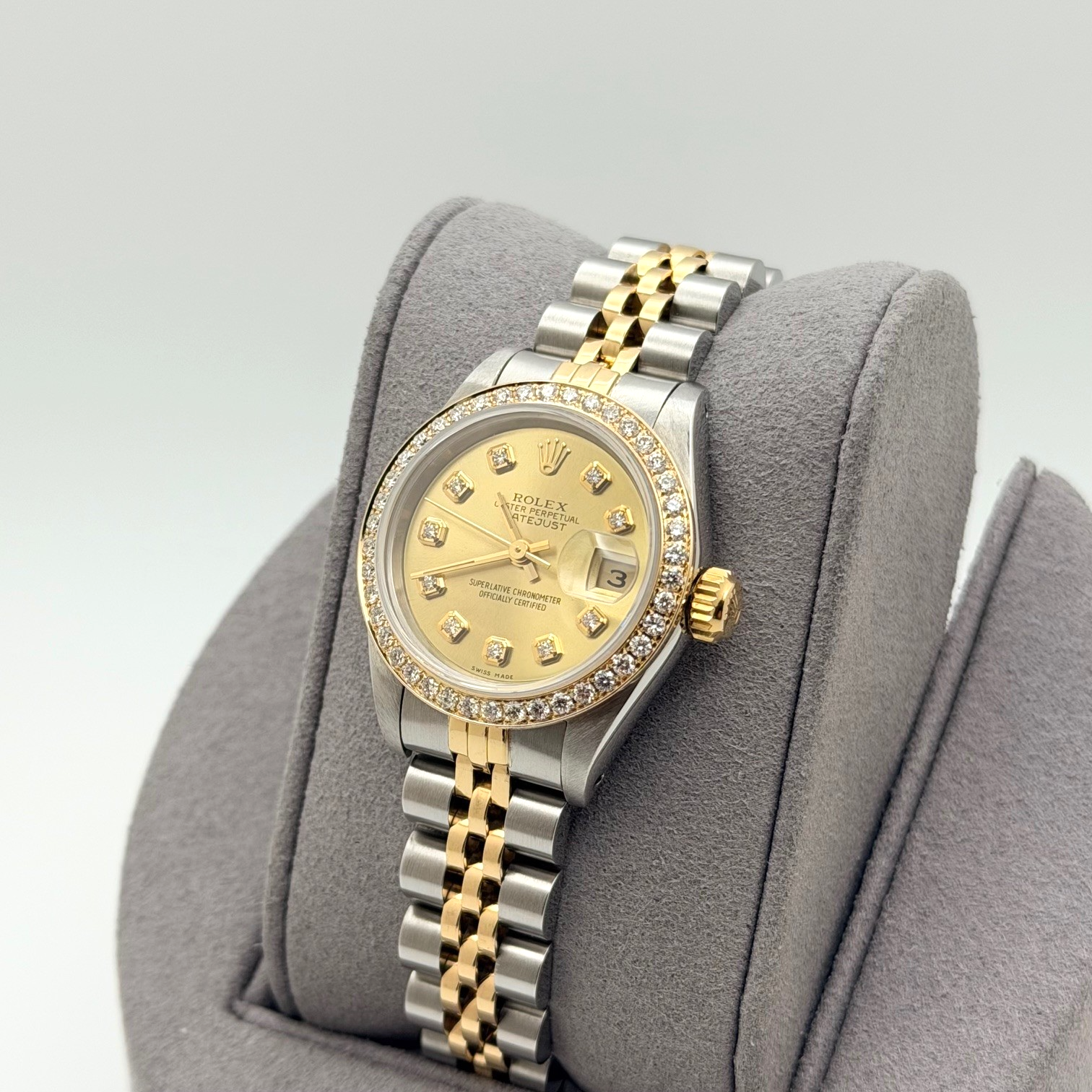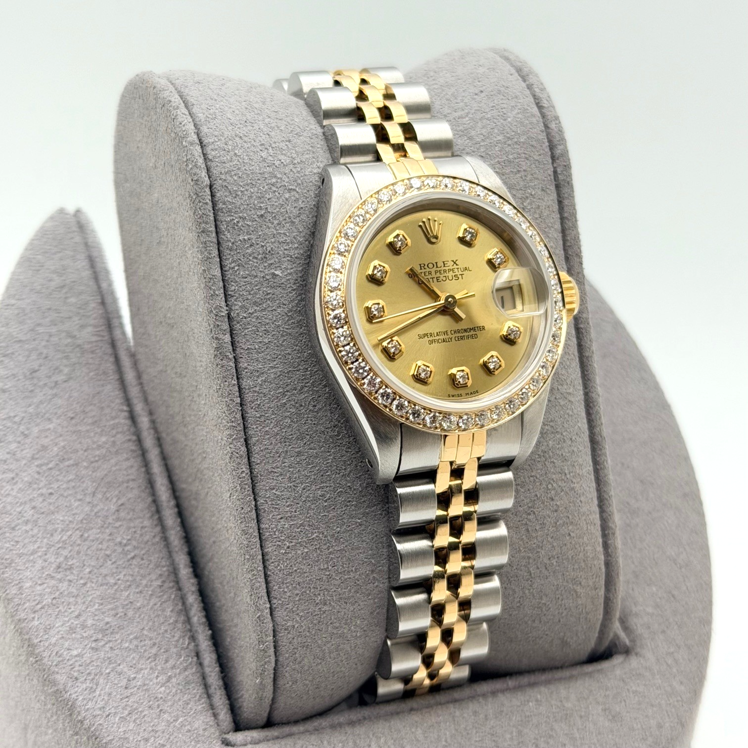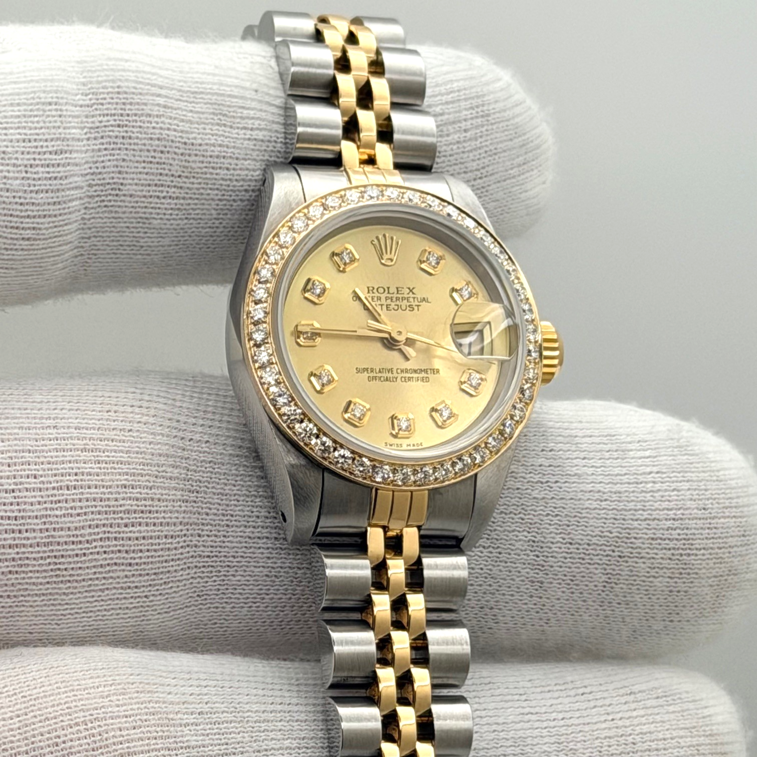 Rolex Ladies Datejust 69173 Champagne Diamond Dial Diamond Bezel 18k Gold Steel Rolex Sale! from 599500 /per This item is a recurring or deferred purchase. By continuing, I agree to the cancellation policy and authorize you to charge my payment method at the prices, frequency and dates listed on this page until my order is fulfilled or I cancel, if permitted. +1 (619) 232-1273 This item is currently on backorder but you can still purchase it now and we'll ship as soon as more become available. Style Number: 69173Serial: C12****Year: 1992 Model: Rolex Ladies Datejust Case Material: Stainless Steel Band: 18k Yellow Gold & Stainless Steel Jubilee Bezel: Custom Diamond Bezel Dial: Custom Champagne Diamond Dial Crystal: Sapphire Case Size: 26mm Includes: - Elegant Watch Box- Certified Appraisal - 1 Year WarrantySKU 22812 / 19480TSTADEN071025