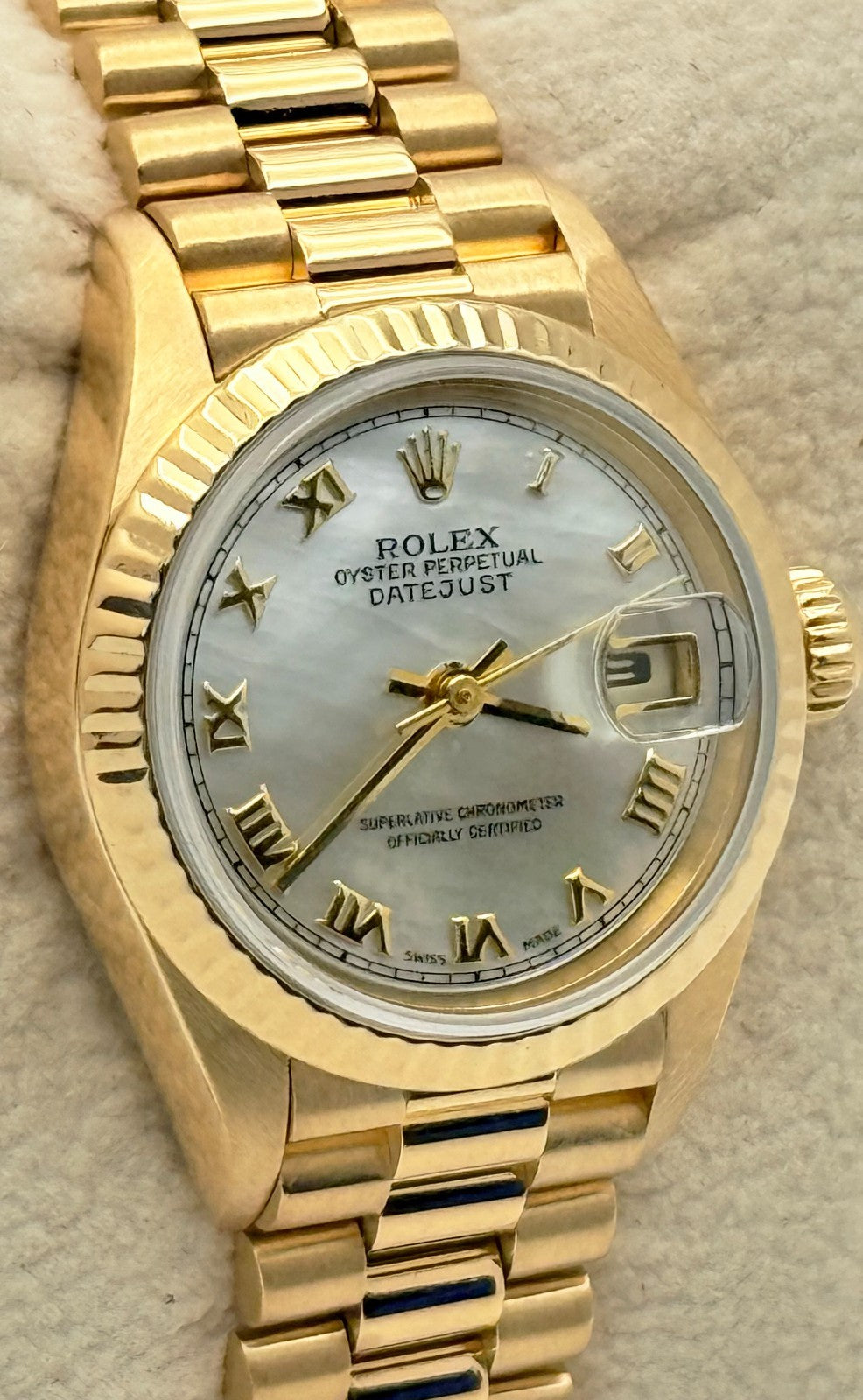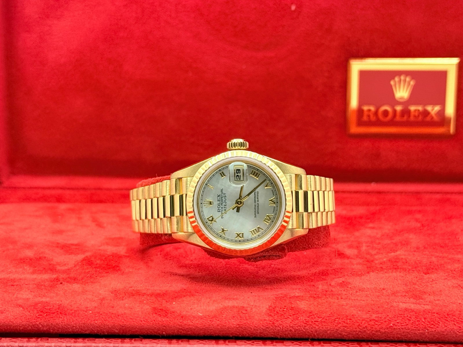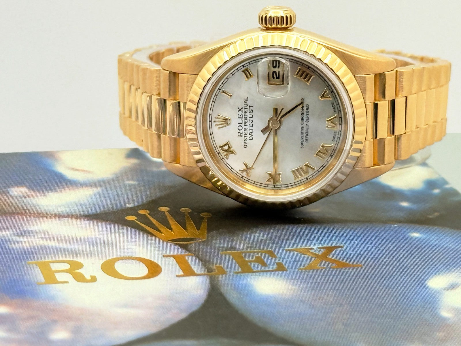 Rolex Ladies Datejust President 69178 Factory Mother of Pearl MOP Dial 18K Gold Rolex Sale! from 1599500 /per This item is a recurring or deferred purchase. By continuing, I agree to the cancellation policy and authorize you to charge my payment method at the prices, frequency and dates listed on this page until my order is fulfilled or I cancel, if permitted. +1 (619) 232-1273 This item is currently on backorder but you can still purchase it now and we'll ship as soon as more become available. Style Number: 69178Serial: U86****Year: 1999 Model: Rolex Ladies President Case Material: 18K Yellow Gold Band: 18K Yellow Gold President Bezel: 18K Yellow Gold Fluted Dial: Factory White Mother of Pearl Roman Numeral Dial Crystal: Sapphire Crystal Case Size: 26mm Includes: - Rolex Box & Paper- Certified Appraisal - 1 Year WarrantySKU 22526 / 121174TGC052225SF