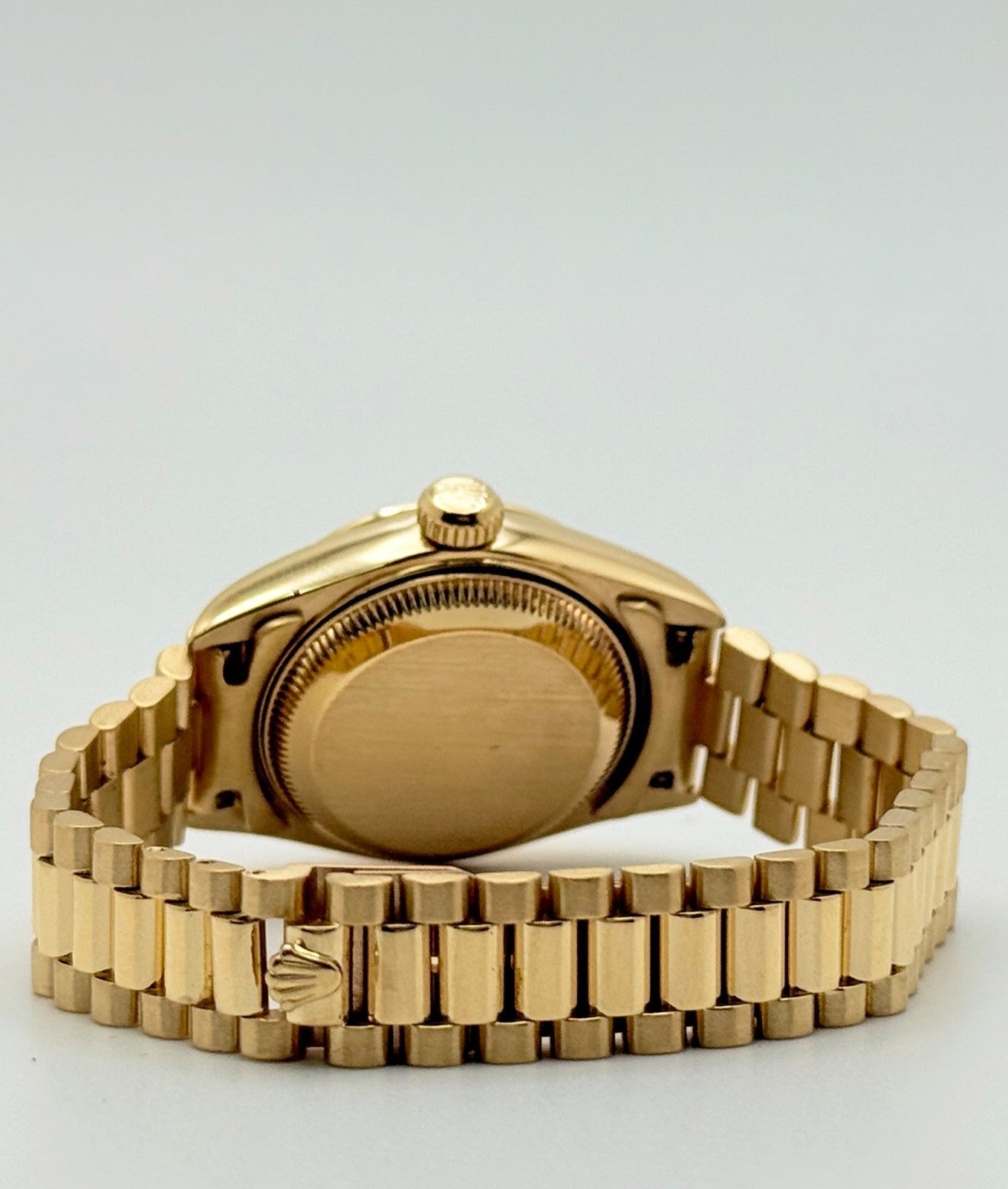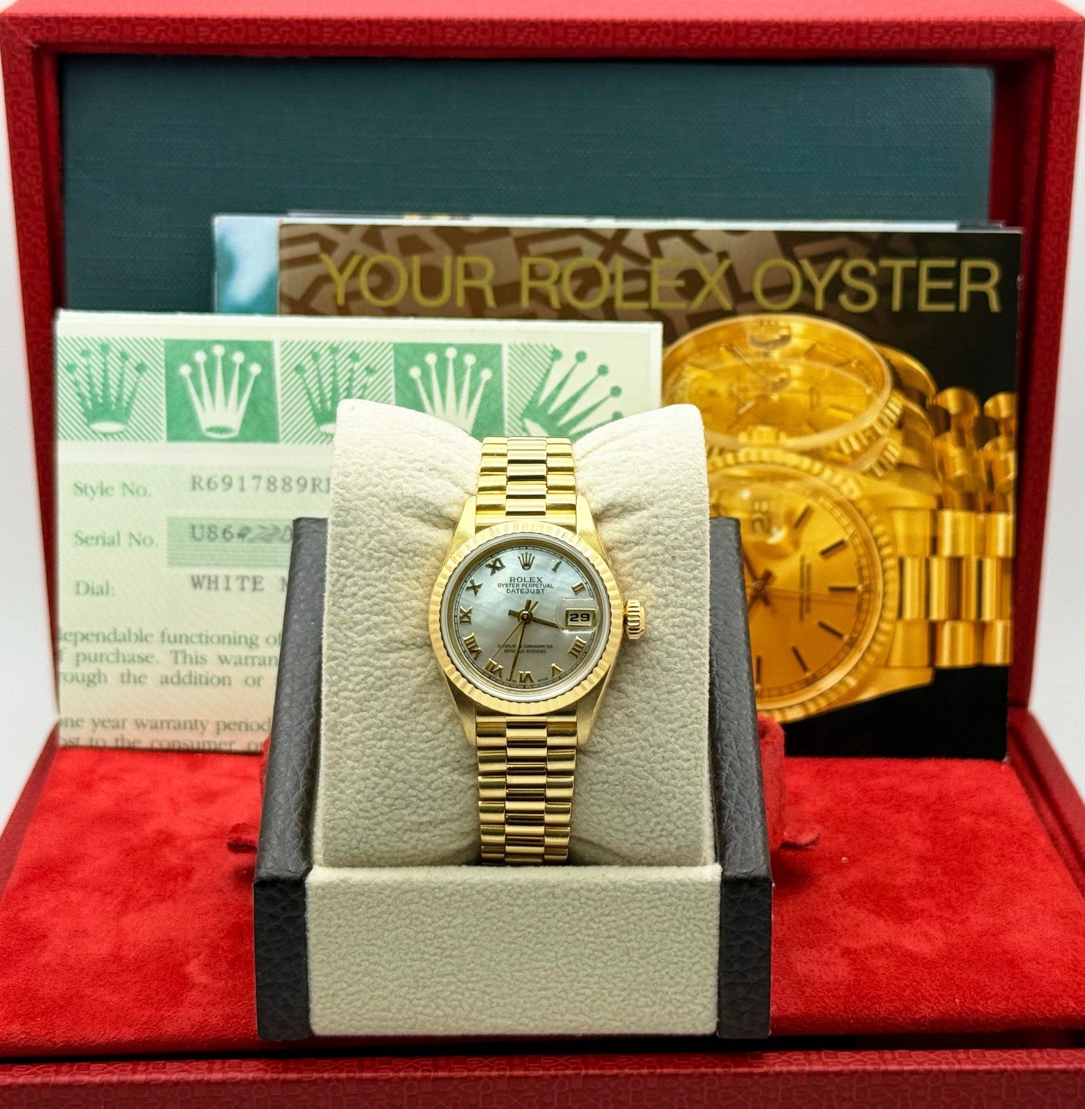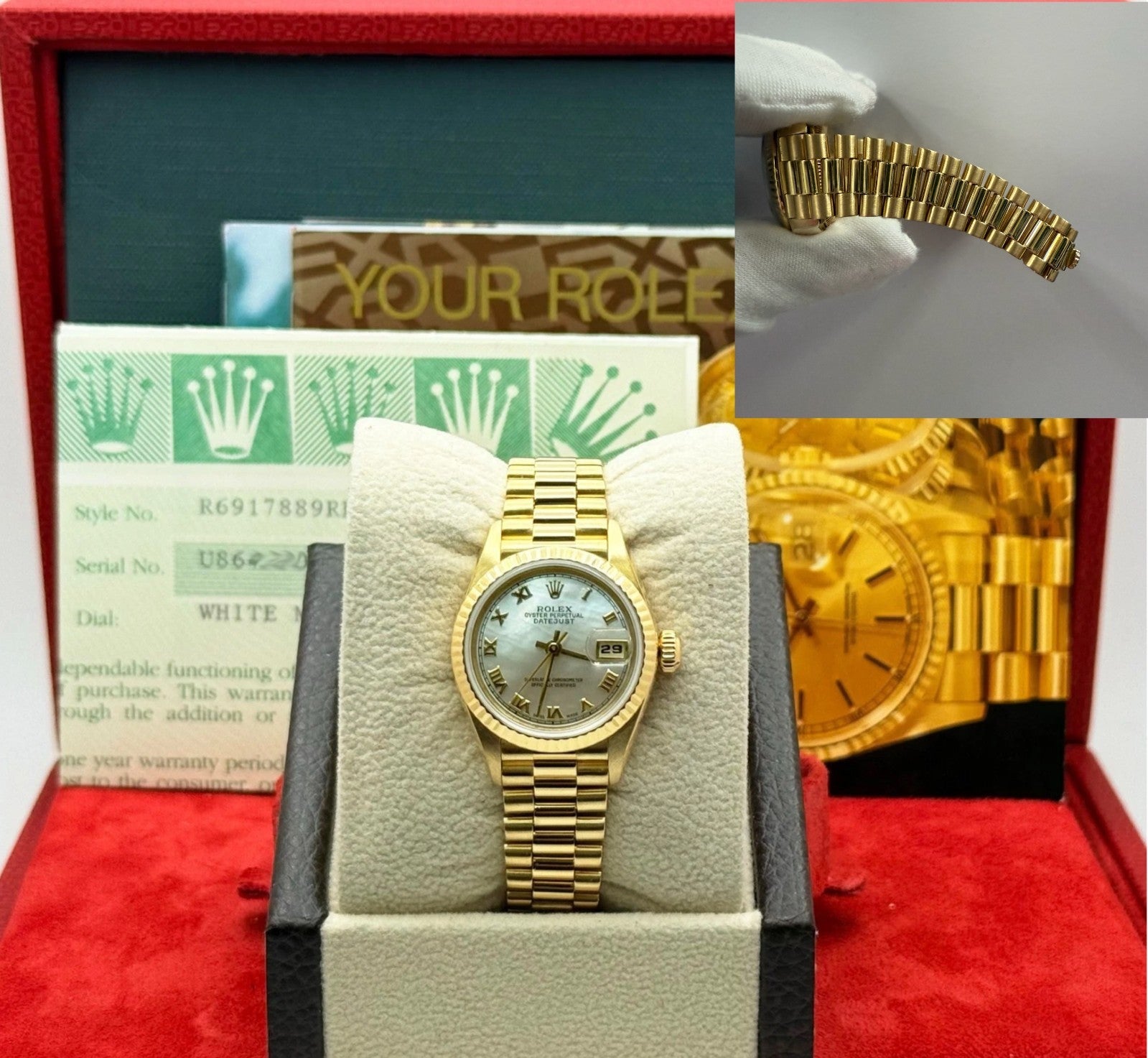 Rolex Ladies Datejust President 69178 Factory Mother of Pearl MOP Dial 18K Gold Rolex Sale! from 1599500 /per This item is a recurring or deferred purchase. By continuing, I agree to the cancellation policy and authorize you to charge my payment method at the prices, frequency and dates listed on this page until my order is fulfilled or I cancel, if permitted. +1 (619) 232-1273 This item is currently on backorder but you can still purchase it now and we'll ship as soon as more become available. Style Number: 69178Serial: U86****Year: 1999 Model: Rolex Ladies President Case Material: 18K Yellow Gold Band: 18K Yellow Gold President Bezel: 18K Yellow Gold Fluted Dial: Factory White Mother of Pearl Roman Numeral Dial Crystal: Sapphire Crystal Case Size: 26mm Includes: - Rolex Box & Paper- Certified Appraisal - 1 Year WarrantySKU 22526 / 121174TGC052225SF