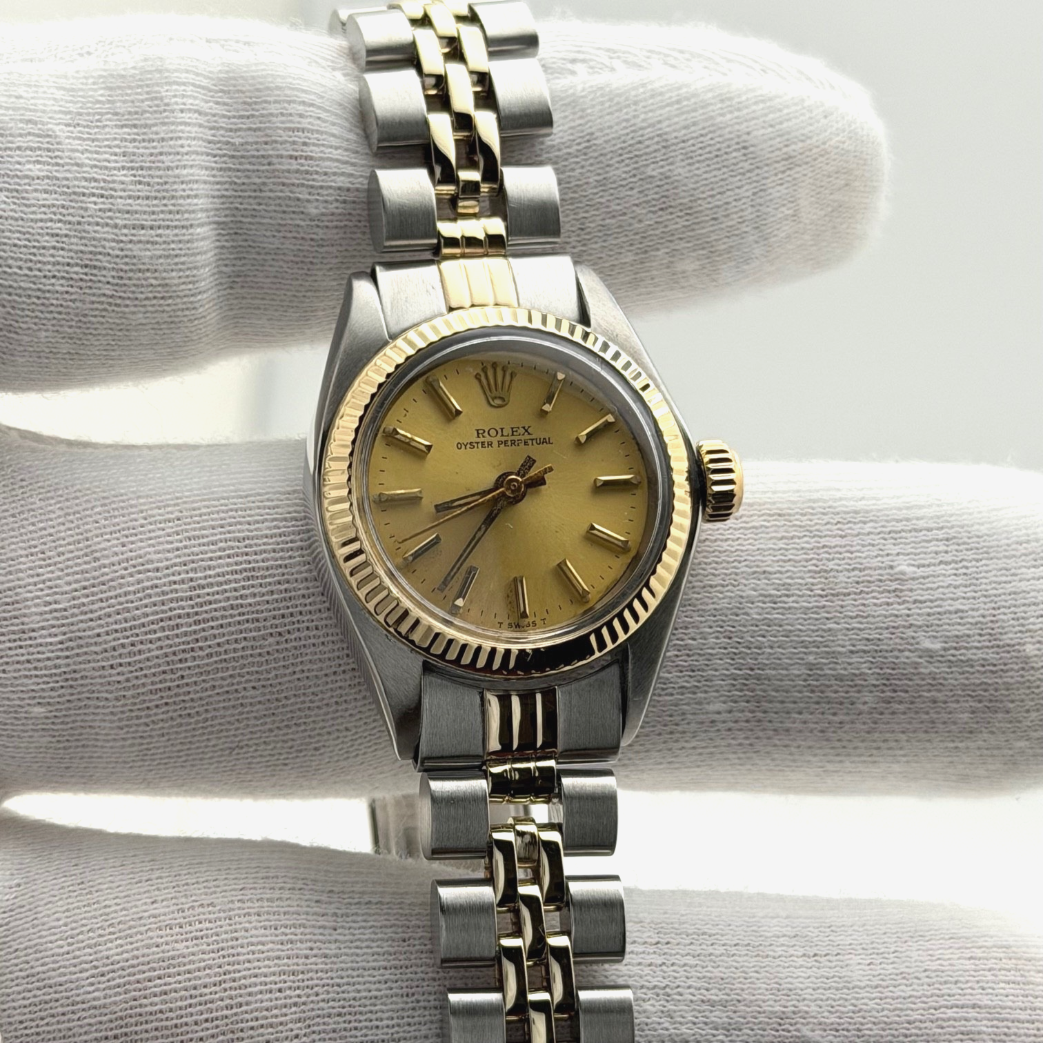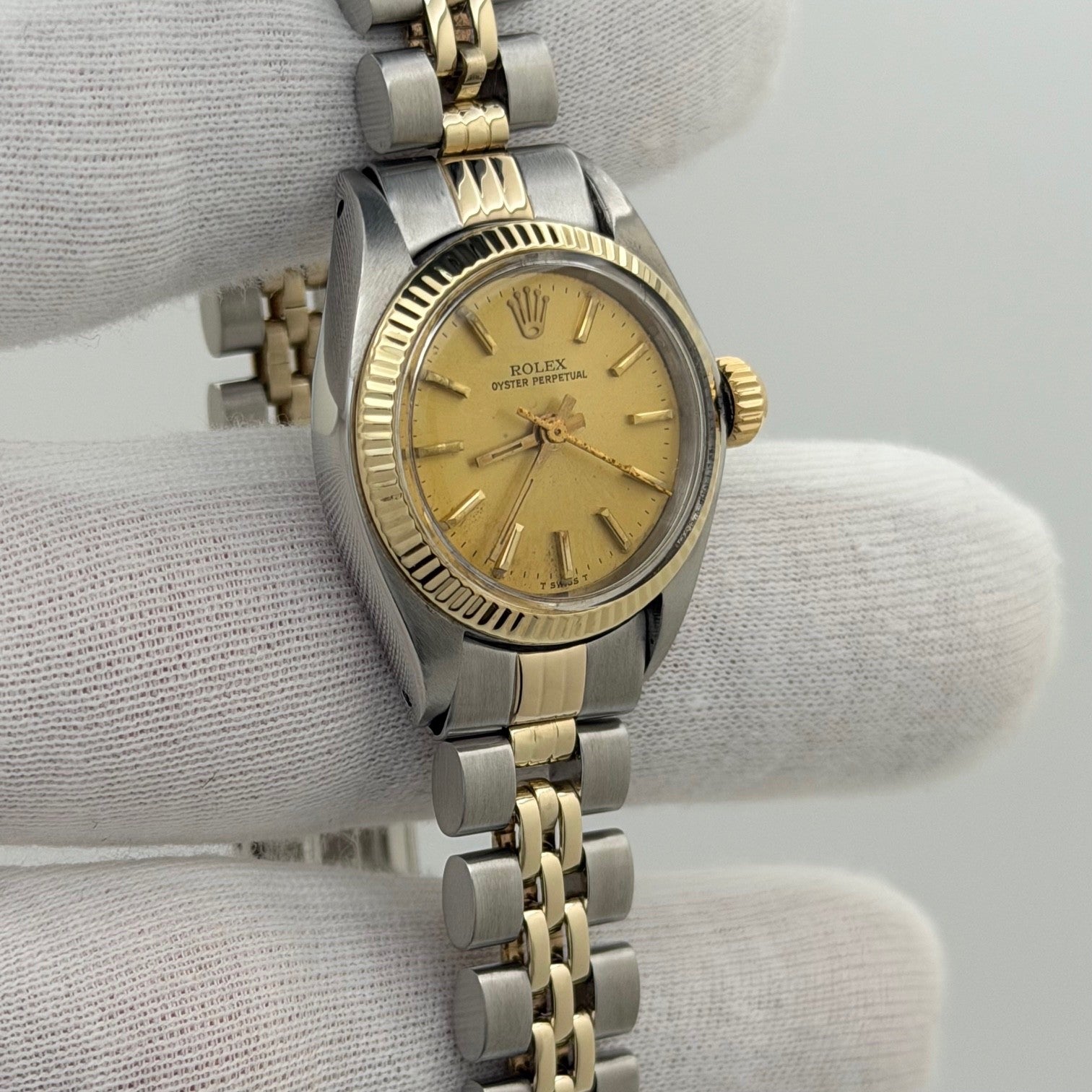 Rolex Ladies Oyster Perpetual 6719 26mm Champagne Dial 14k Gold Steel Jubilee Rolex Sale! from 369500 /per This item is a recurring or deferred purchase. By continuing, I agree to the cancellation policy and authorize you to charge my payment method at the prices, frequency and dates listed on this page until my order is fulfilled or I cancel, if permitted. +1 (619) 232-1273 This item is currently on backorder but you can still purchase it now and we'll ship as soon as more become available. Style Number: 6719Serial: 524****Year: 1978 Model: Rolex Ladies Oyster Perpetual Case Material: Stainless Steel Band: 14k Yellow Gold & Stainless Steel Jubilee Bezel: 14k Yellow Gold Fluted Dial: Champagne Crystal: Acrylic Case Size: 26mm Includes: - Elegant Watch Box- Certified Appraisal - 1 Year WarrantySKU 22677 / 14278TSTADEN061525