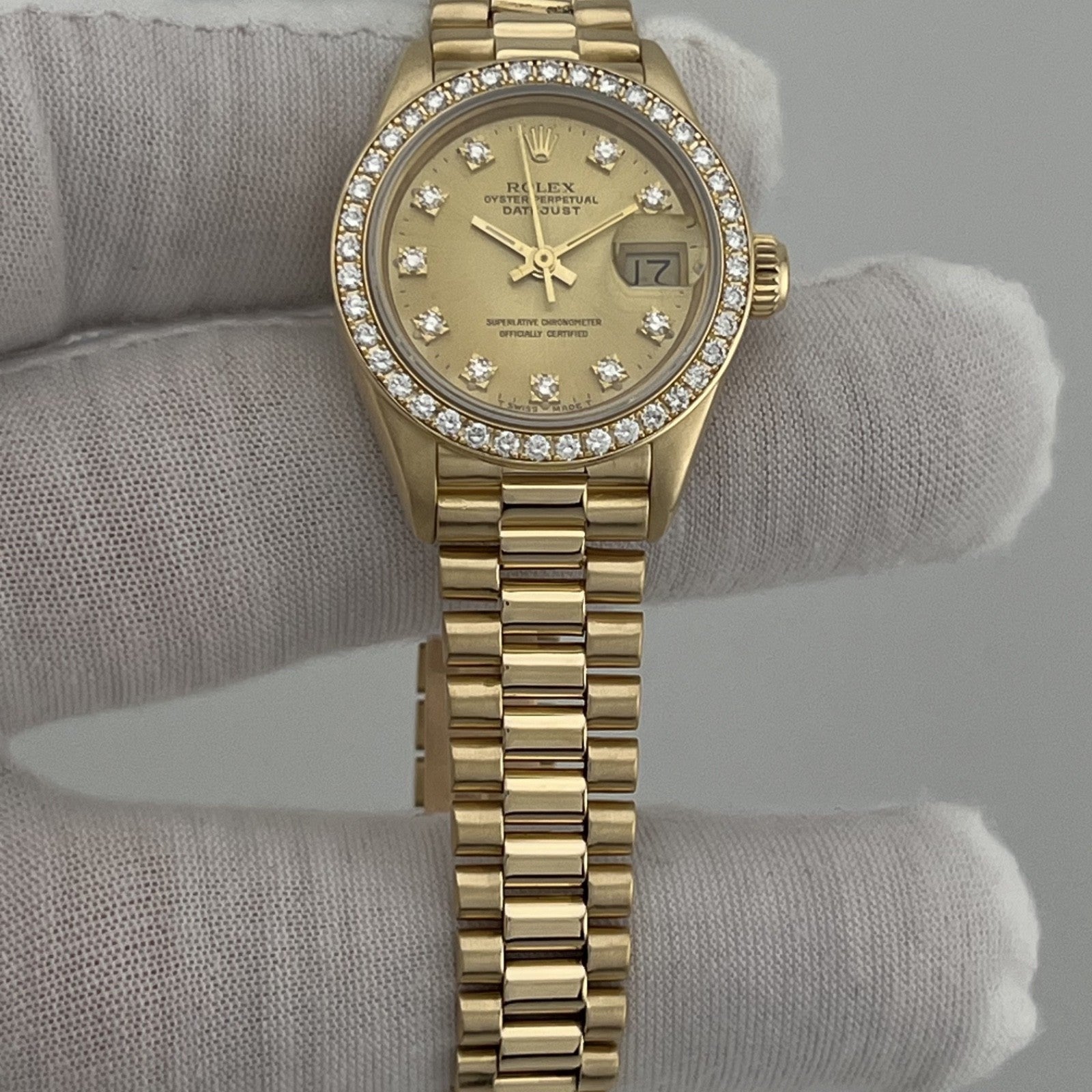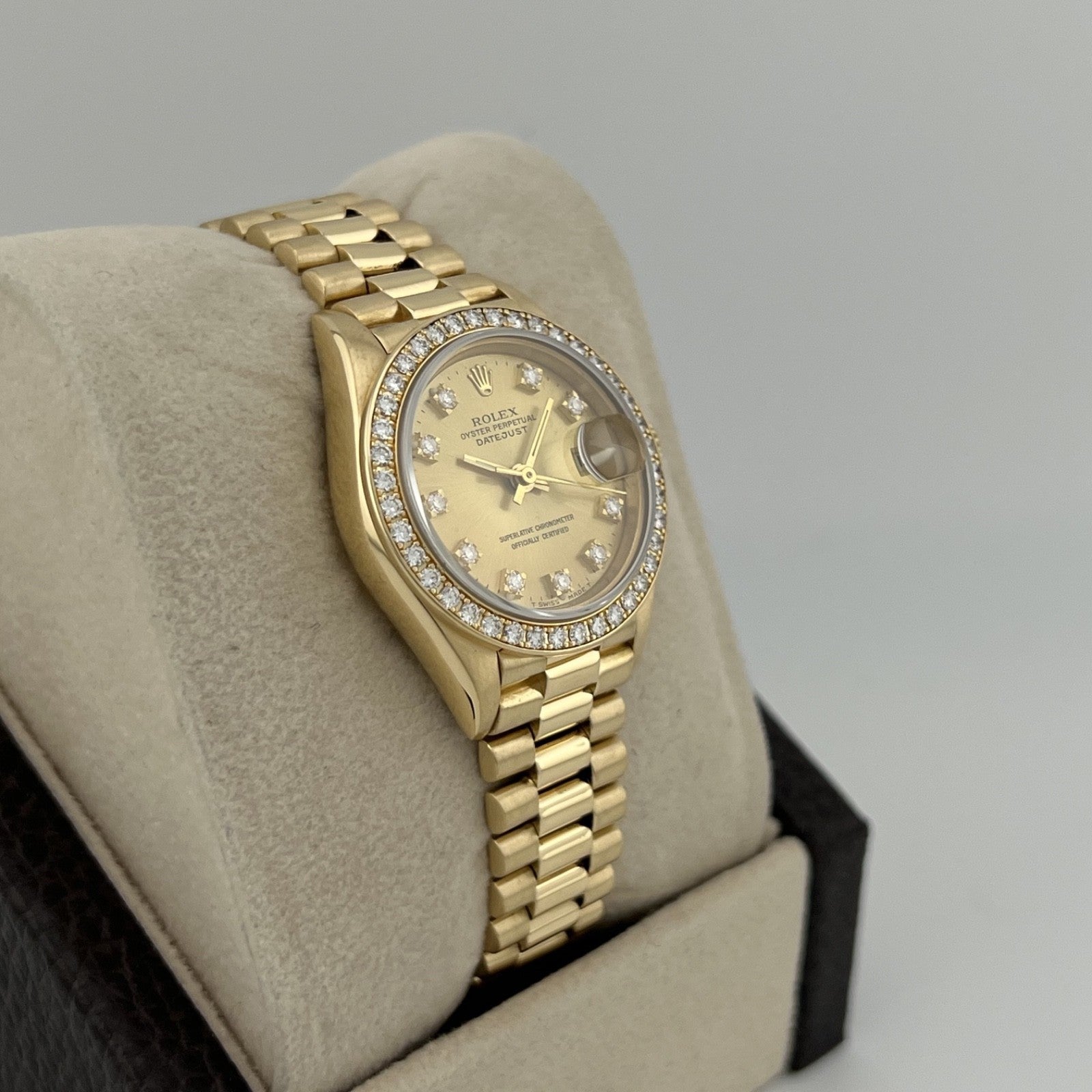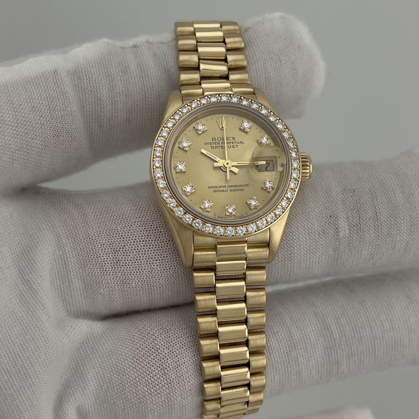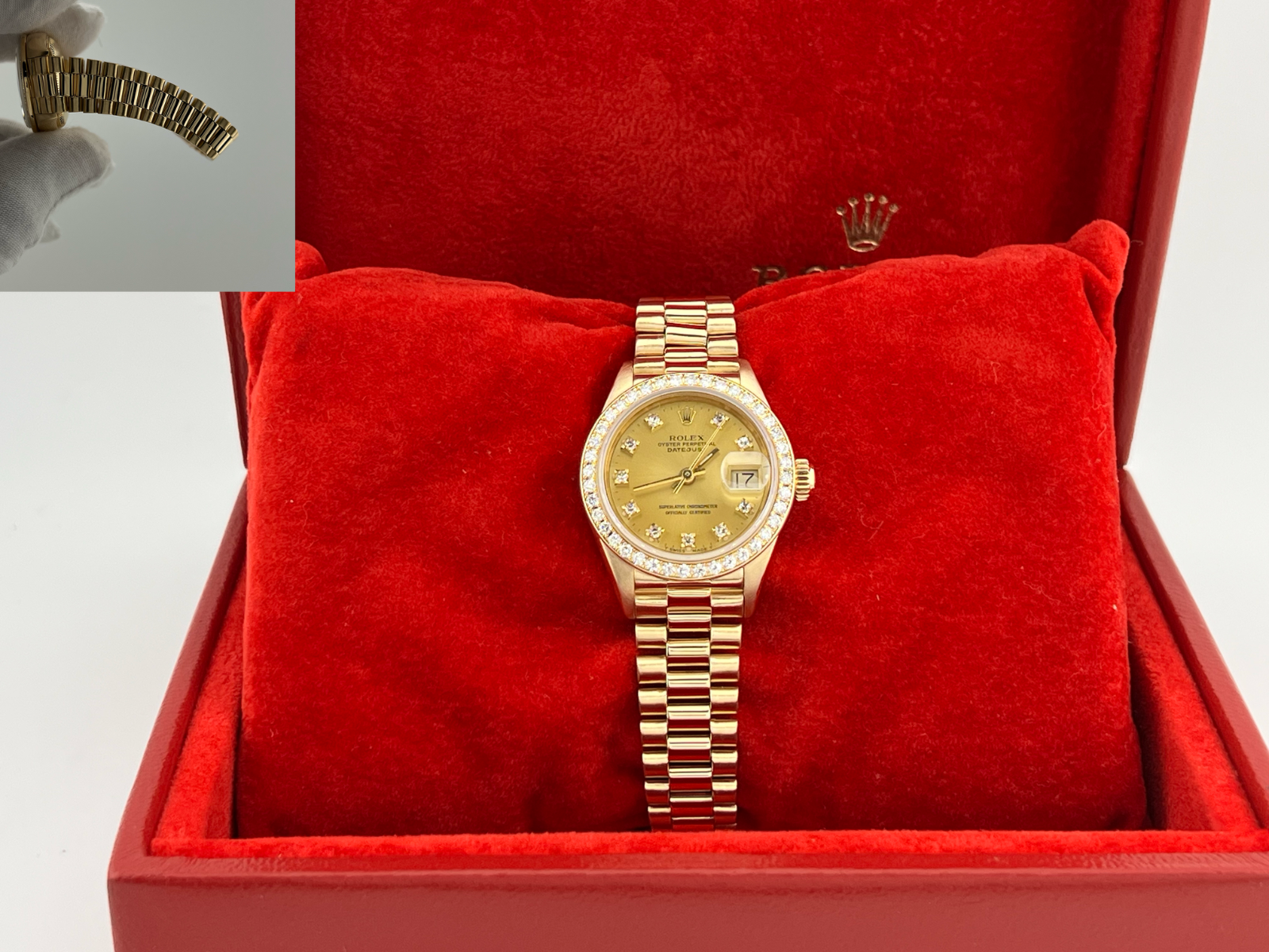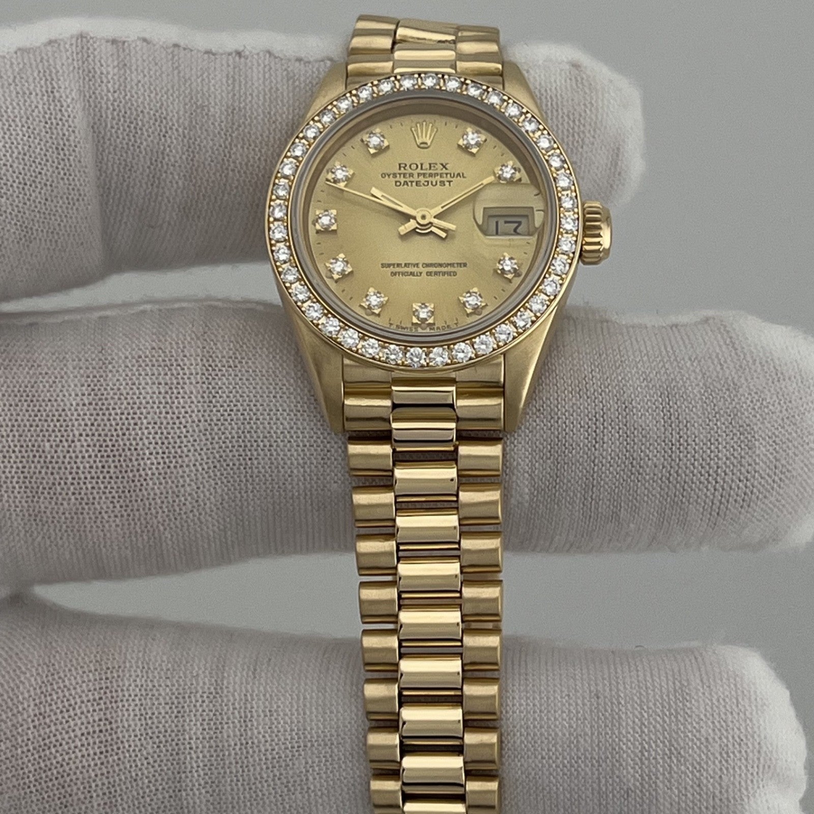 Rolex Ladies President Datejust 69138 Factory Diamond Dial Factory Diamond Bezel Rolex Sale! from 1399500 /per This item is a recurring or deferred purchase. By continuing, I agree to the cancellation policy and authorize you to charge my payment method at the prices, frequency and dates listed on this page until my order is fulfilled or I cancel, if permitted. +1 (619) 232-1273 This item is currently on backorder but you can still purchase it now and we'll ship as soon as more become available. Style Number: 69138Year: 1988 Model: Rolex Ladies President Datejust Case Material: 18k Yellow Gold Band: 18k Yellow Gold President Bracelet Bezel: Custom 18k Yellow Gold Diamond Bezel Dial: Factory Champagne Diamond Dial Crystal: Sapphire Case Size: 26mm Includes: - Rolex Box- Certified Appraisal - 1 Year WarrantySKU 22990 / 120490TBJ051525