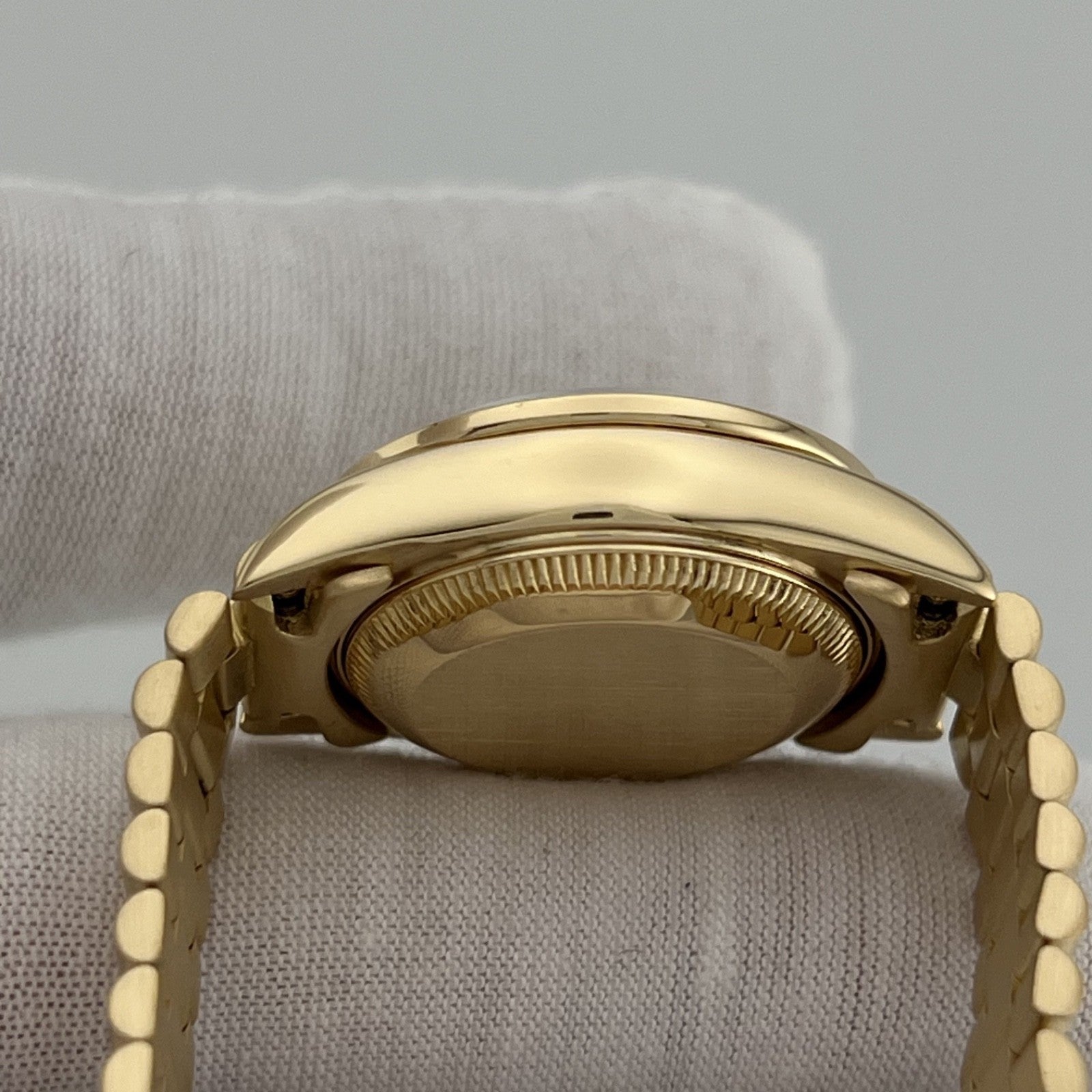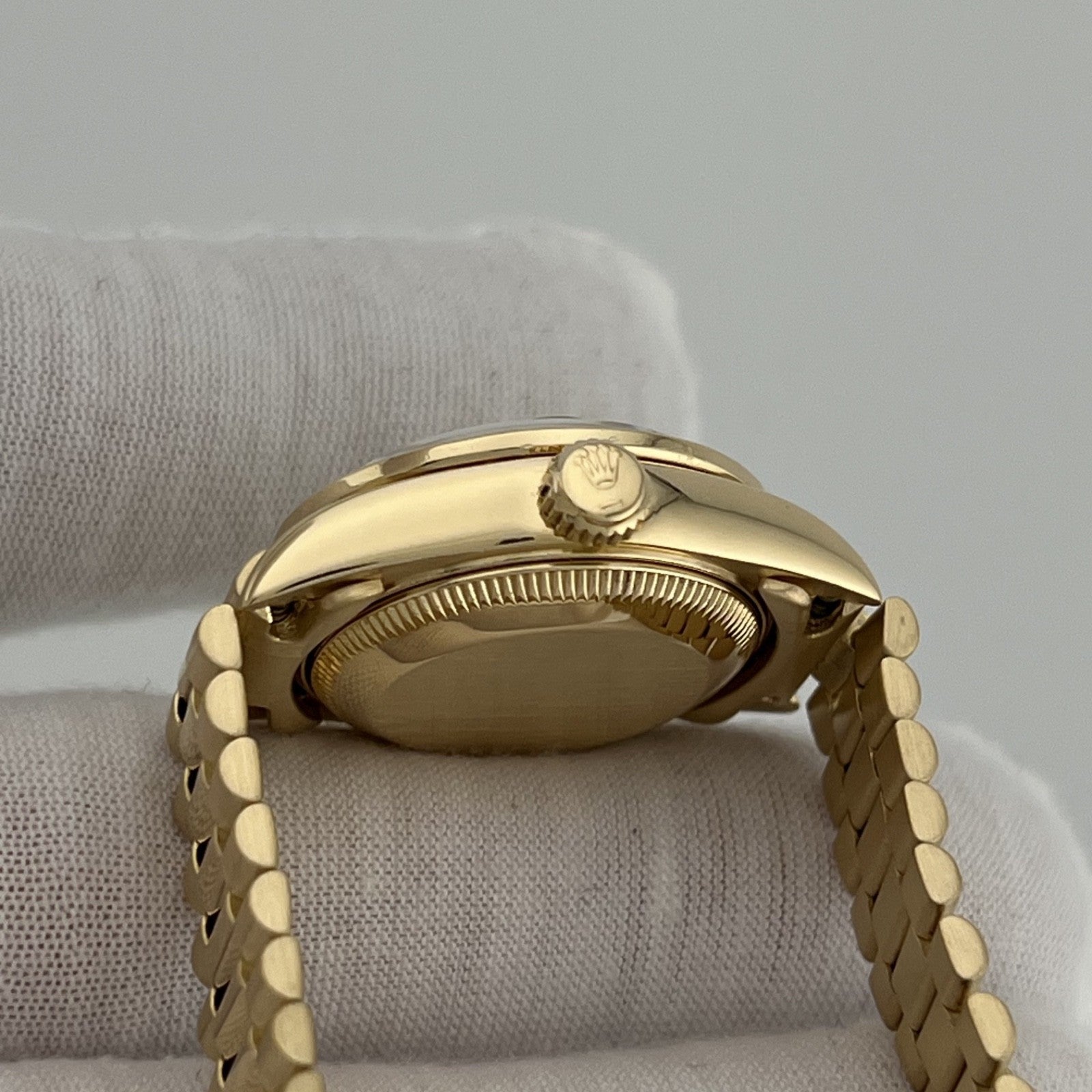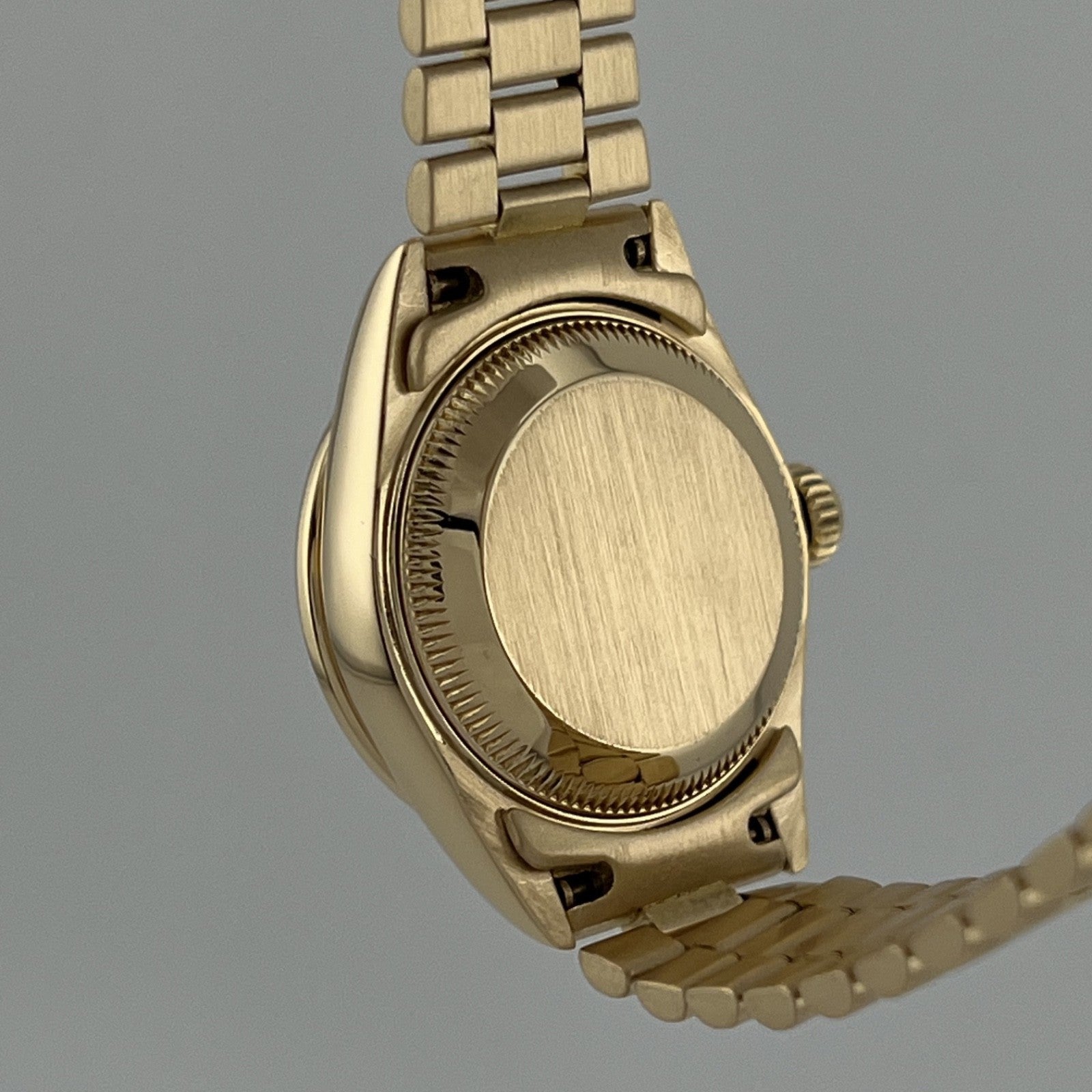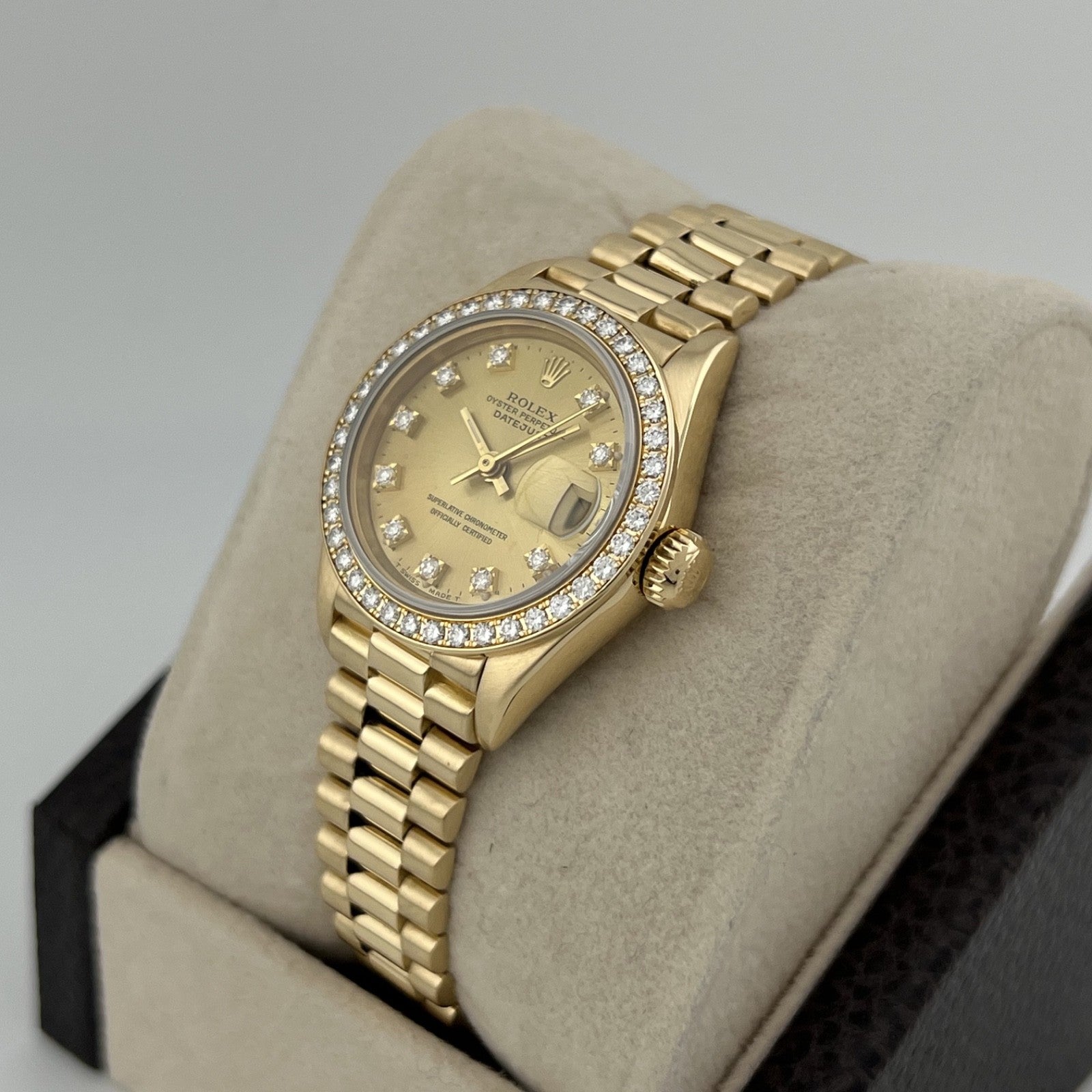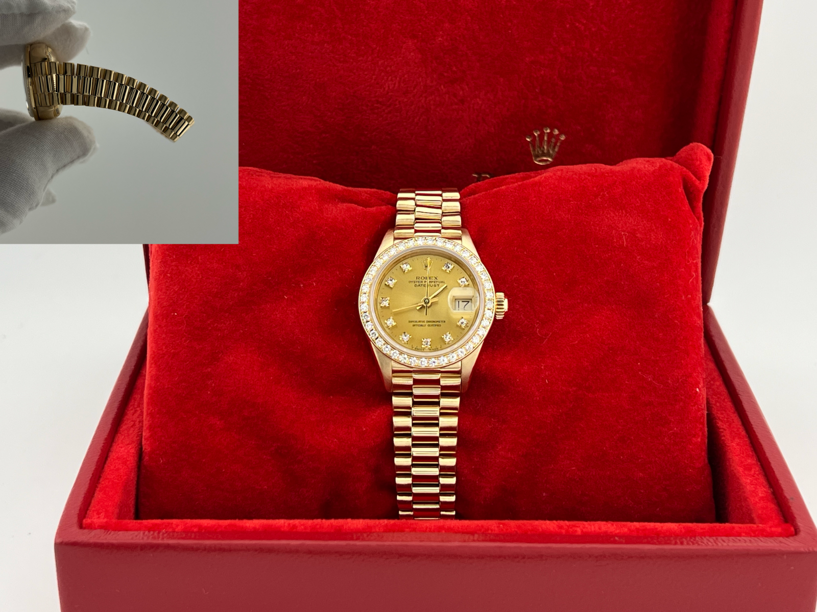Rolex Ladies President Datejust 69138 Factory Diamond Dial Factory Diamond Bezel Rolex Sale! from 1399500 /per This item is a recurring or deferred purchase. By continuing, I agree to the cancellation policy and authorize you to charge my payment method at the prices, frequency and dates listed on this page until my order is fulfilled or I cancel, if permitted. +1 (619) 232-1273 This item is currently on backorder but you can still purchase it now and we'll ship as soon as more become available. Style Number: 69138Year: 1988 Model: Rolex Ladies President Datejust Case Material: 18k Yellow Gold Band: 18k Yellow Gold President Bracelet Bezel: Custom 18k Yellow Gold Diamond Bezel Dial: Factory Champagne Diamond Dial Crystal: Sapphire Case Size: 26mm Includes: - Rolex Box- Certified Appraisal - 1 Year WarrantySKU 22990 / 120490TBJ051525