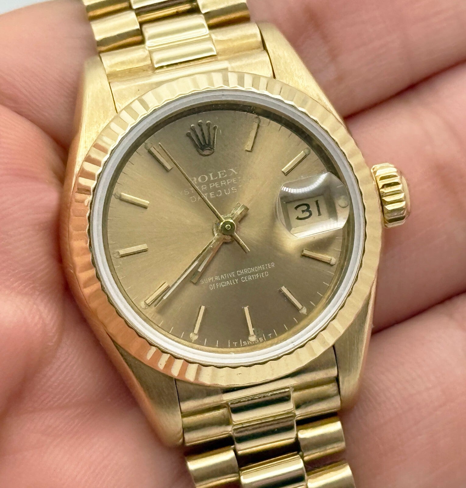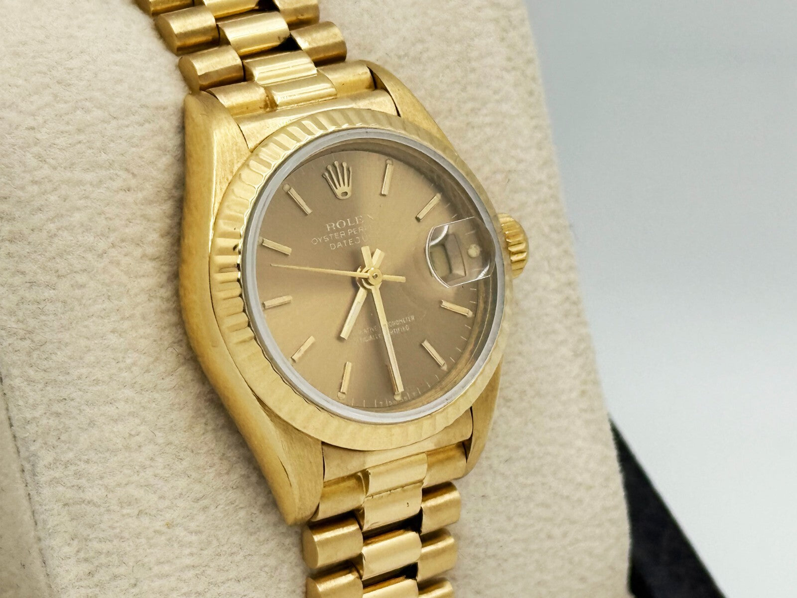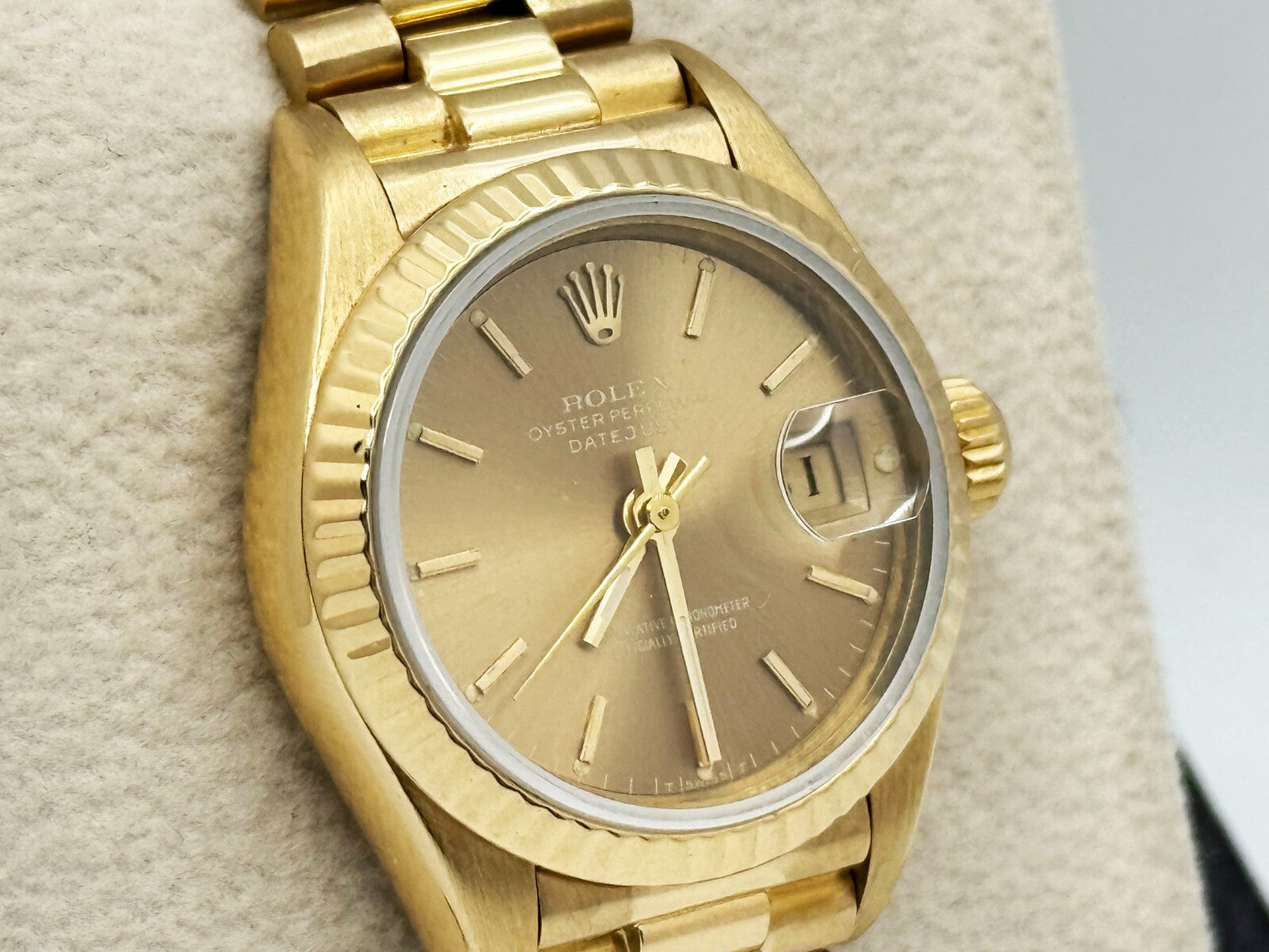 Rolex Ladies President Datejust 69178 Champagne Dial 18K Yellow Gold Rolex Sale! from 979500 /per This item is a recurring or deferred purchase. By continuing, I agree to the cancellation policy and authorize you to charge my payment method at the prices, frequency and dates listed on this page until my order is fulfilled or I cancel, if permitted. +1 (619) 232-1273 This item is currently on backorder but you can still purchase it now and we'll ship as soon as more become available. Style Number: 69178Serial: 8485***Year: 1984 Model: Rolex Ladies President Datejust Case Material: 18K Yellow Gold Band: 18K Yellow Gold Bezel: 18K Yellow Gold Dial: Champagne Dial Face: Sapphire Crystal Case Size: 26mm Includes: -Elegant Watch Box -Certified Appraisal -1 Year WarrantySKU 22389 / 118000T