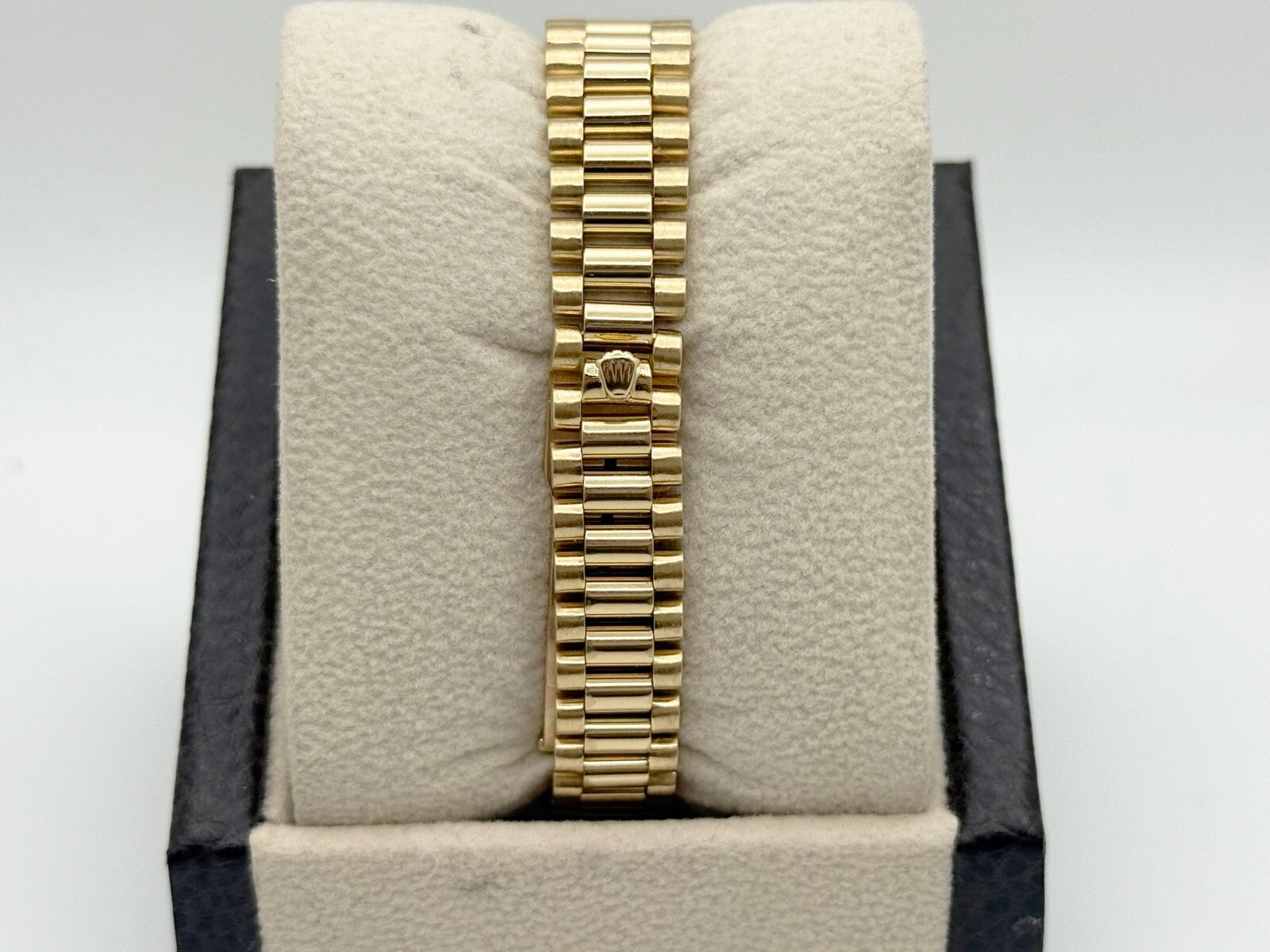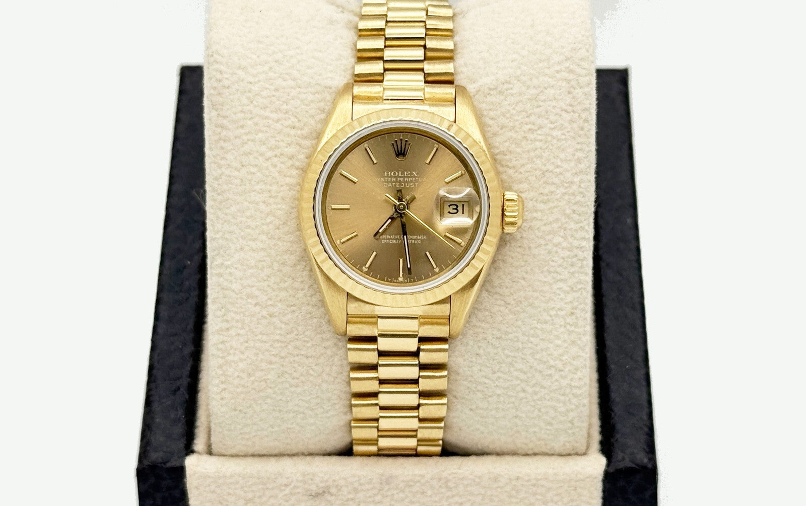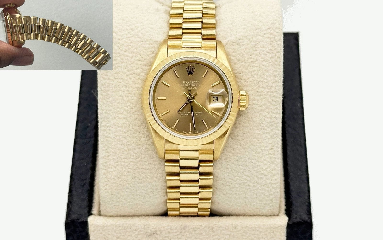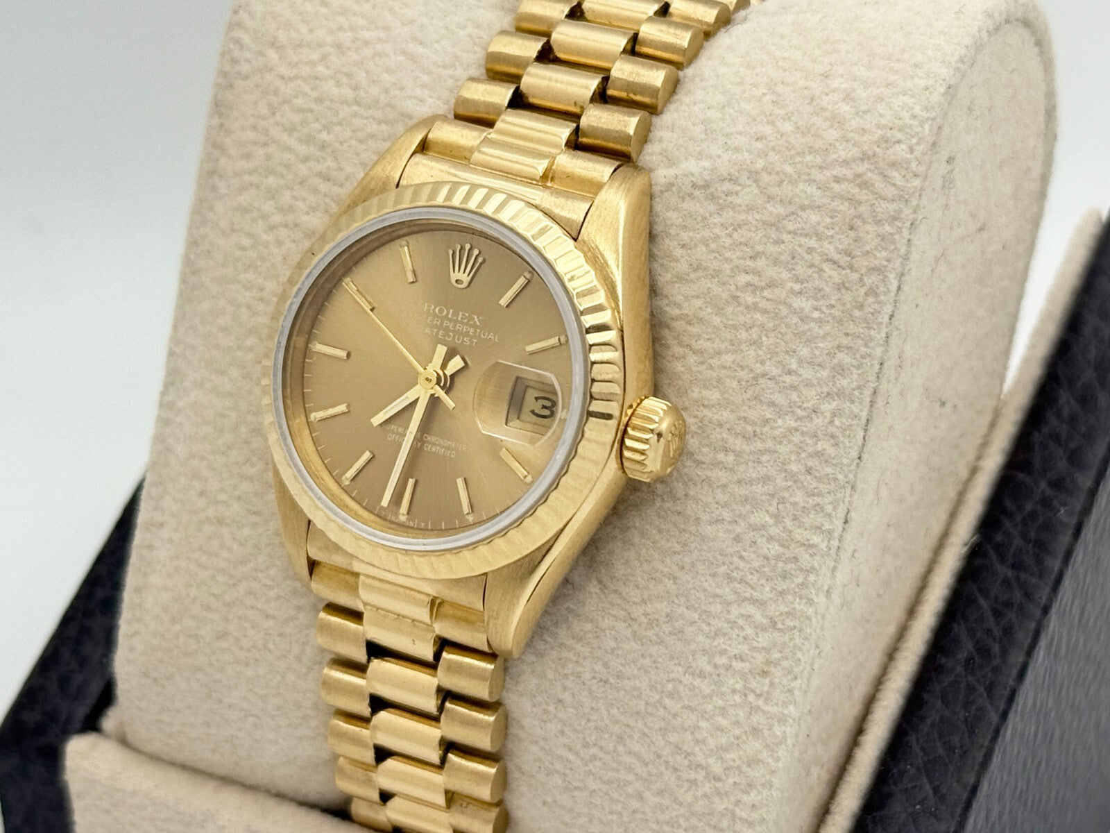 Rolex Ladies President Datejust 69178 Champagne Dial 18K Yellow Gold Rolex Sale! from 979500 /per This item is a recurring or deferred purchase. By continuing, I agree to the cancellation policy and authorize you to charge my payment method at the prices, frequency and dates listed on this page until my order is fulfilled or I cancel, if permitted. +1 (619) 232-1273 This item is currently on backorder but you can still purchase it now and we'll ship as soon as more become available. Style Number: 69178Serial: 8485***Year: 1984 Model: Rolex Ladies President Datejust Case Material: 18K Yellow Gold Band: 18K Yellow Gold Bezel: 18K Yellow Gold Dial: Champagne Dial Face: Sapphire Crystal Case Size: 26mm Includes: -Elegant Watch Box -Certified Appraisal -1 Year WarrantySKU 22389 / 118000T