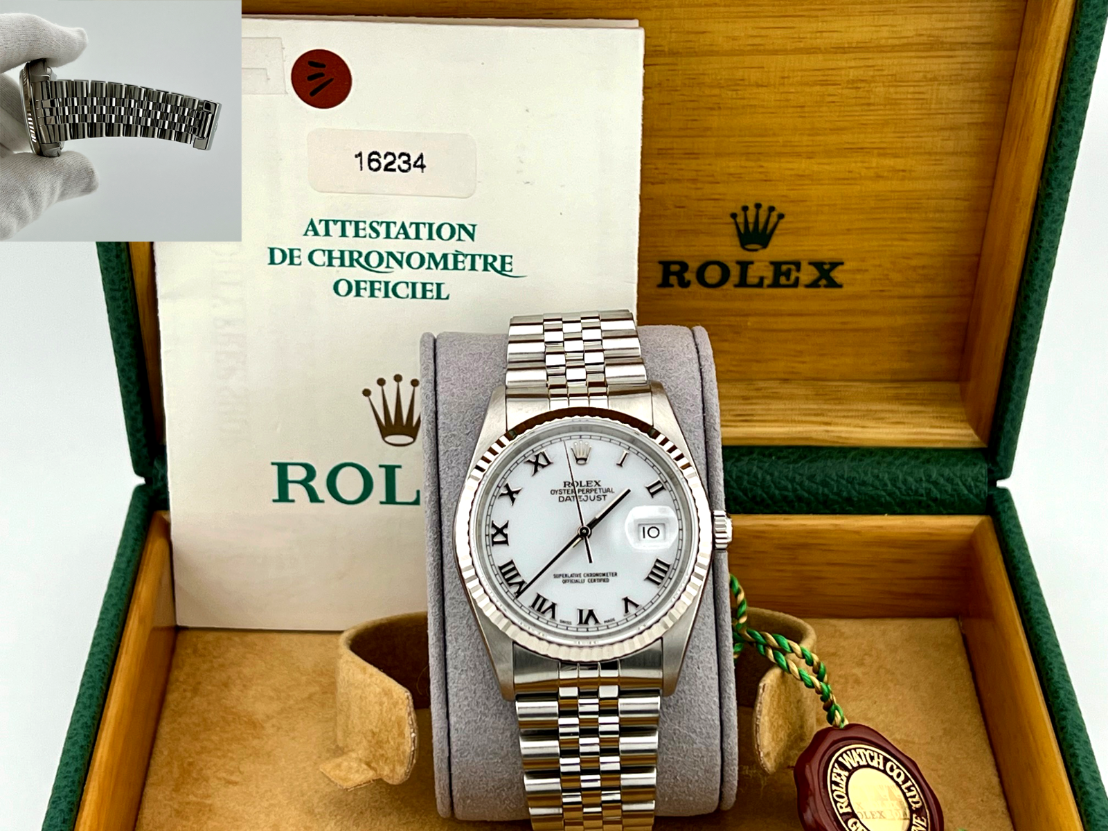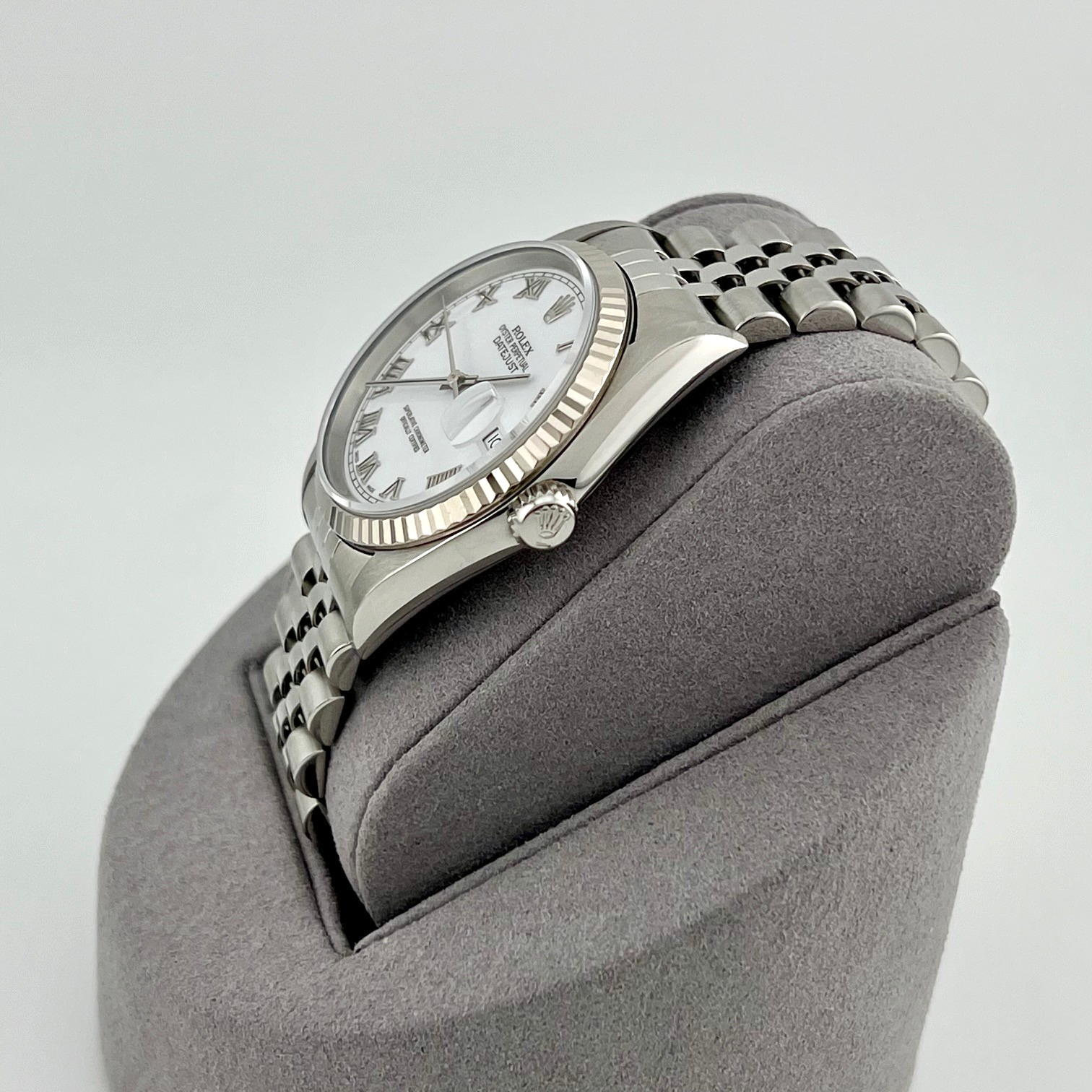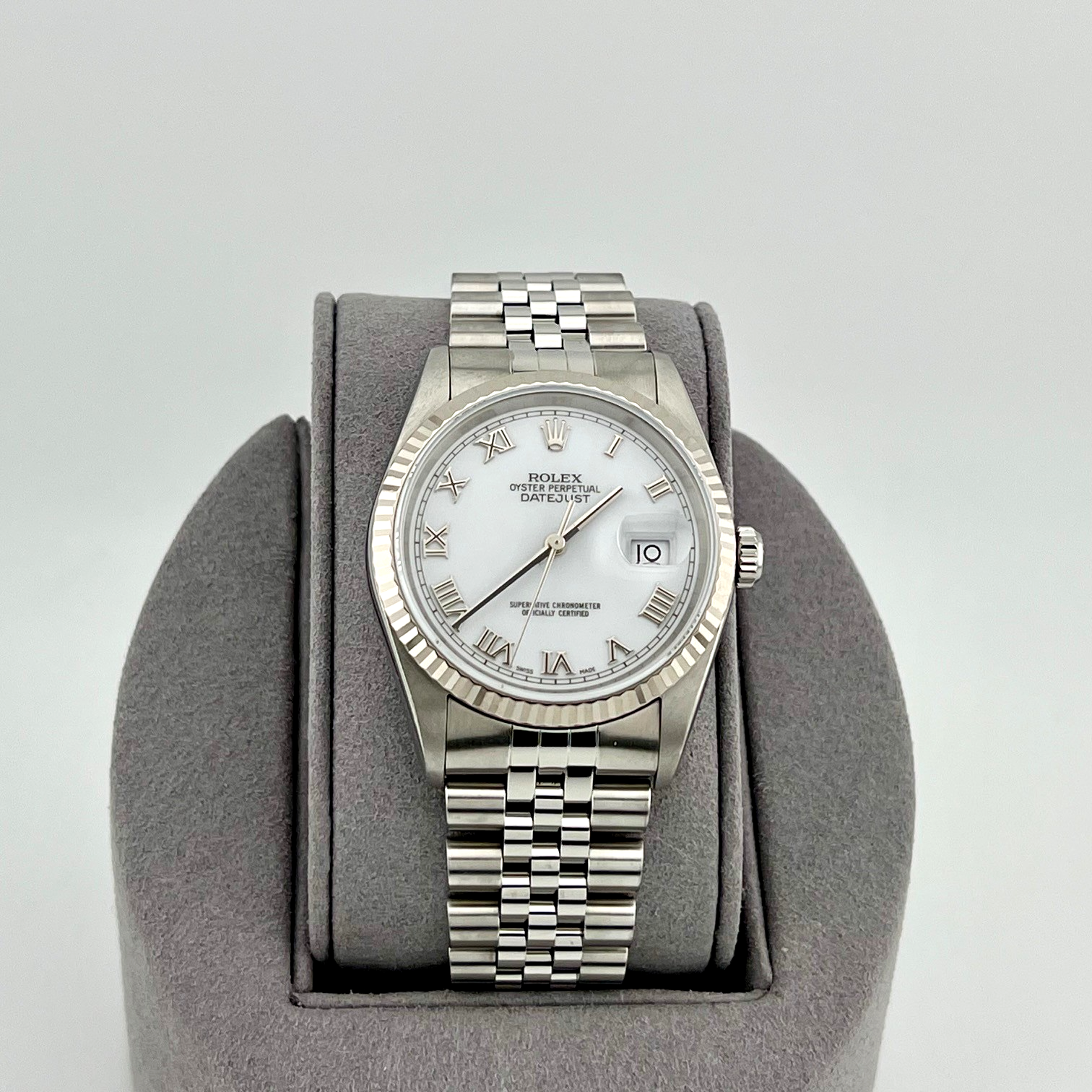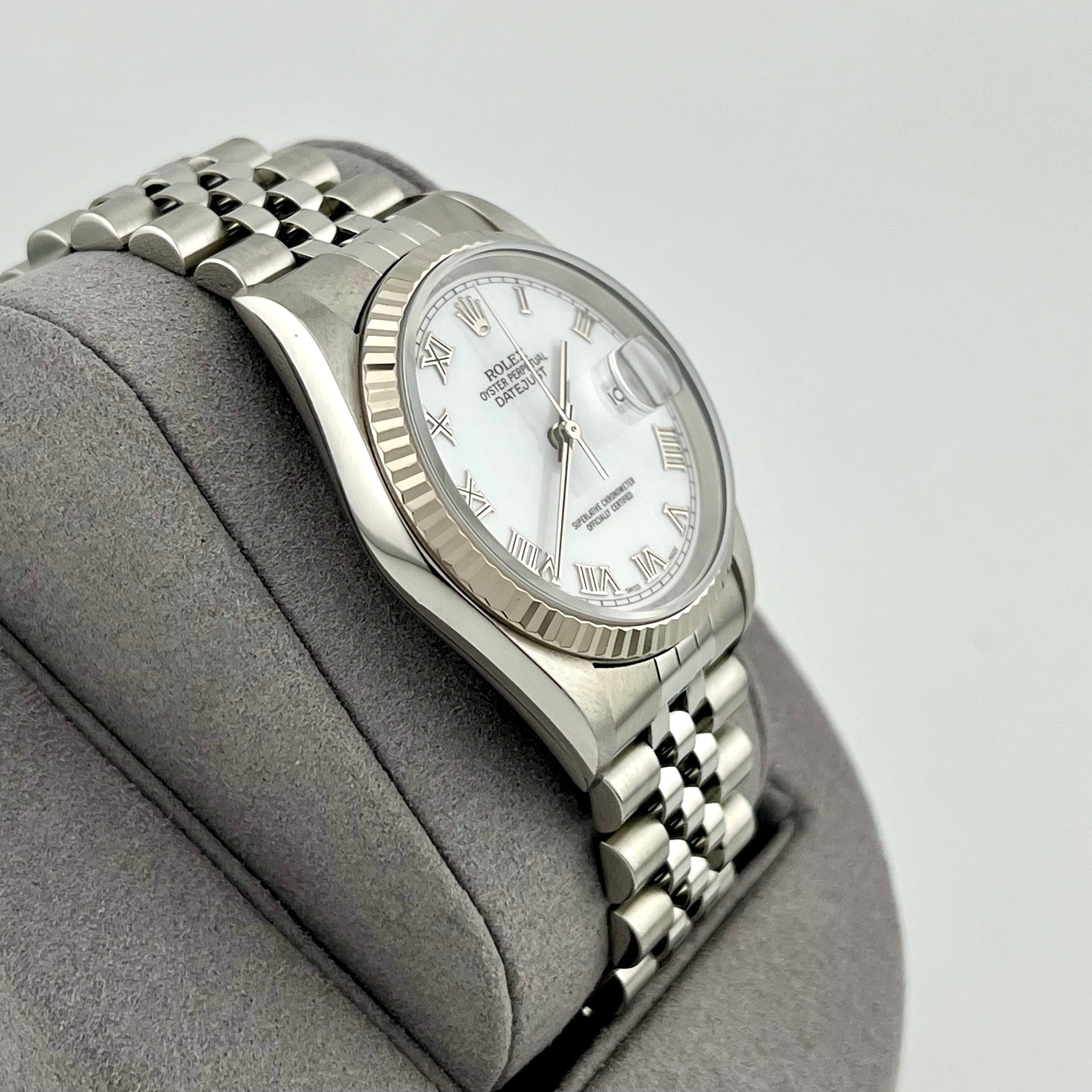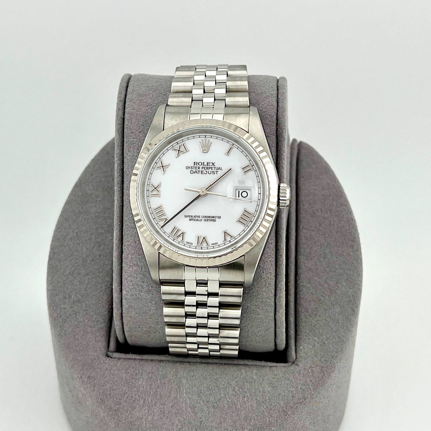 2002 Rolex Datejust 16234 36mm White Roman Dial 18K Gold Steel Box Paper Rolex Sale! from 789500 /per This item is a recurring or deferred purchase. By continuing, I agree to the cancellation policy and authorize you to charge my payment method at the prices, frequency and dates listed on this page until my order is fulfilled or I cancel, if permitted. +1 (619) 232-1273 This item is currently on backorder but you can still purchase it now and we'll ship as soon as more become available. Style Number: 16234Serial: Y30****Year: 2002 Model: Rolex Datejust Case Material: Stainless Steel Band: Stainless Steel Jubilee Bezel: 18k White Gold Fluted Dial: White Roman Numeral Dial Crystal: Sapphire Case Size: 36mm Includes: - Rolex Box & Paper- Certified Appraisal - 1 Year WarrantySKU 23252 / 116437TSTADEN102025