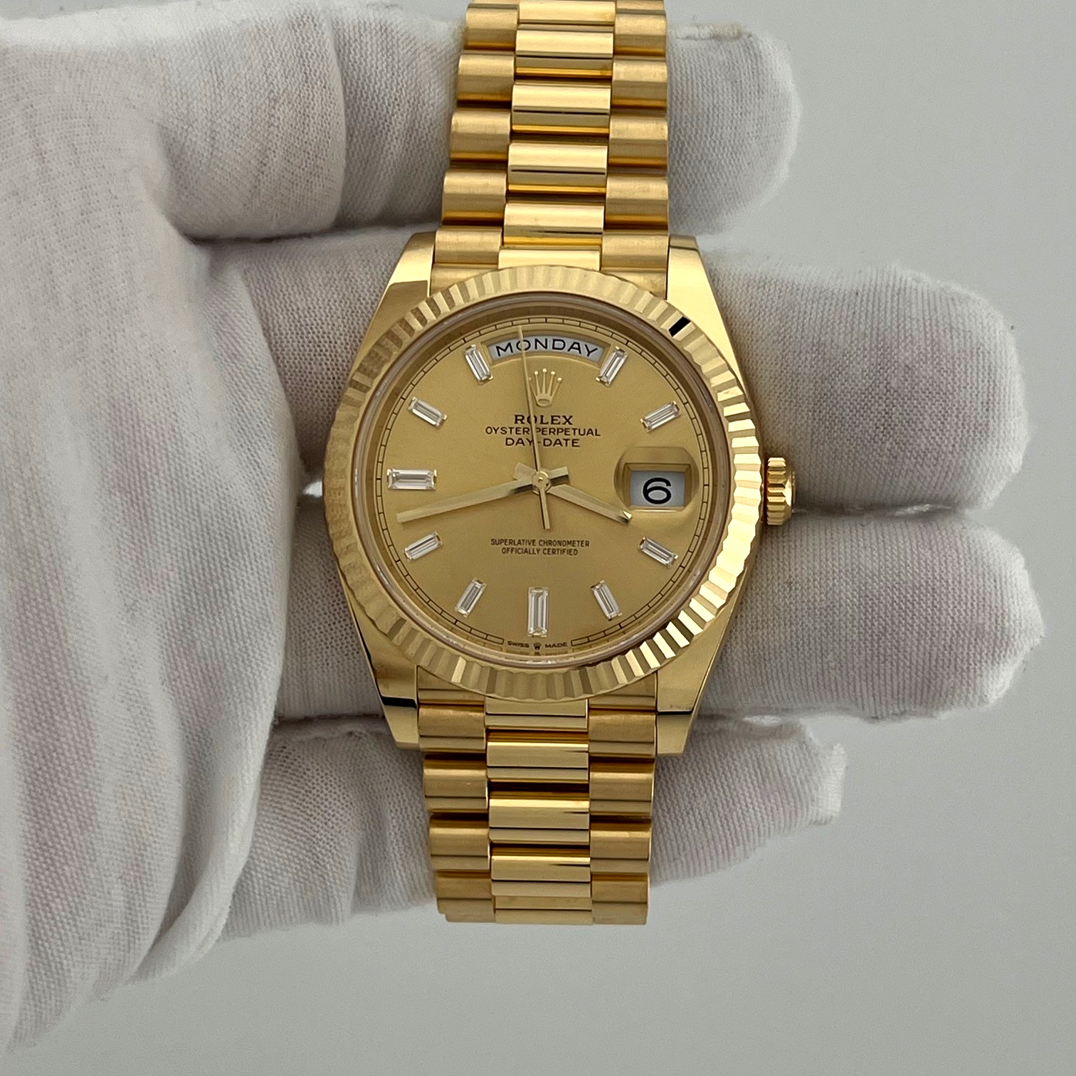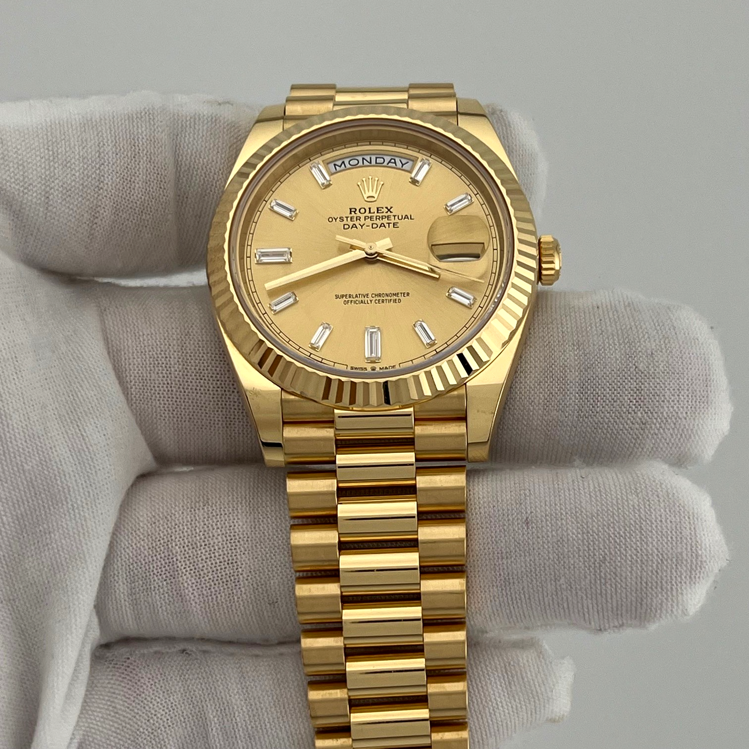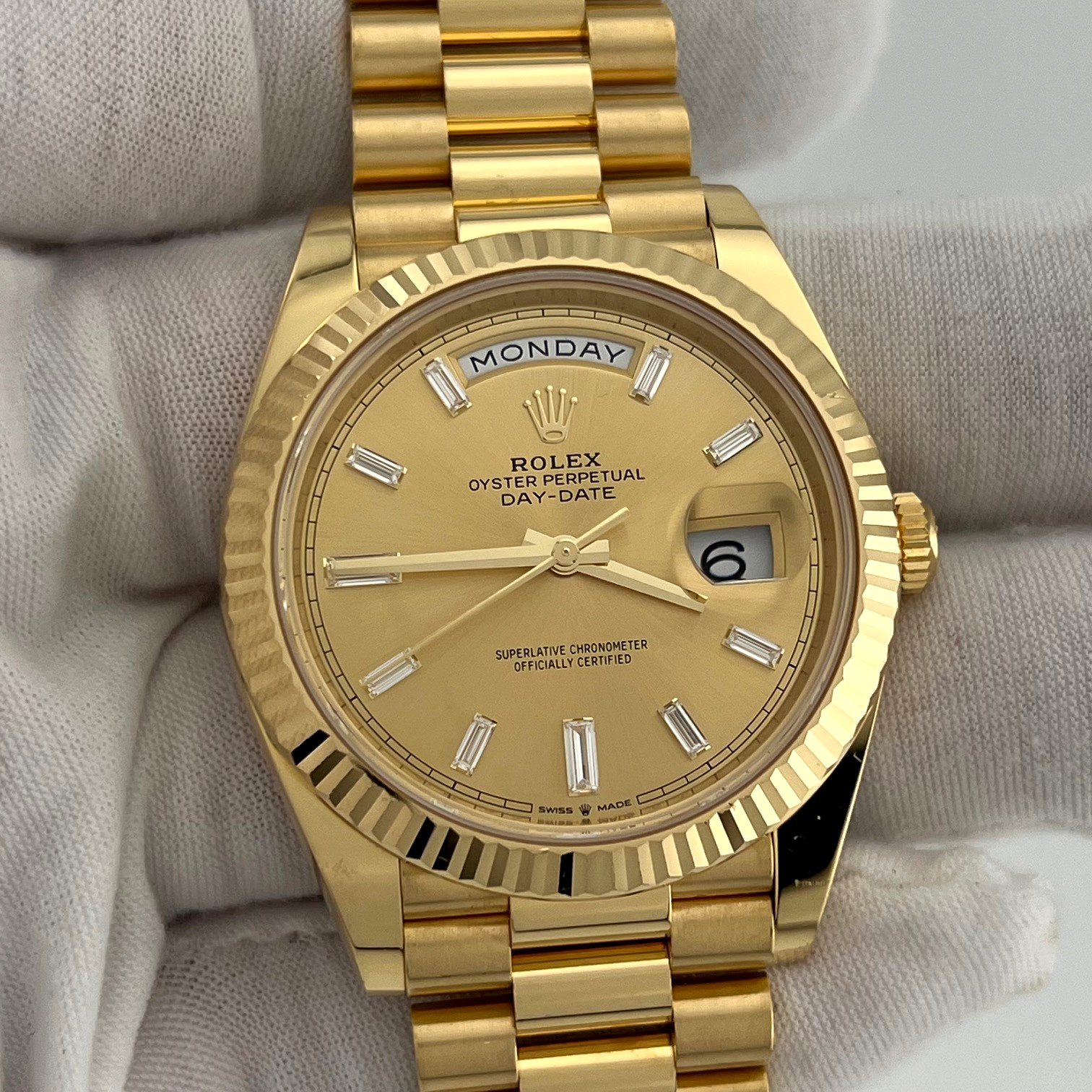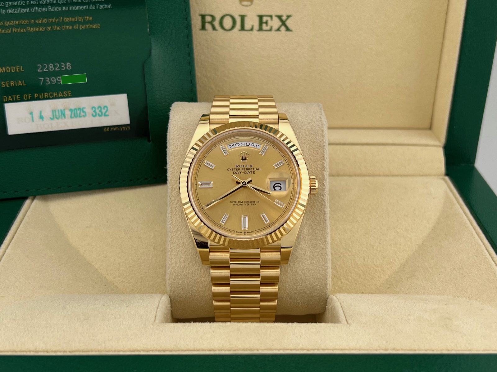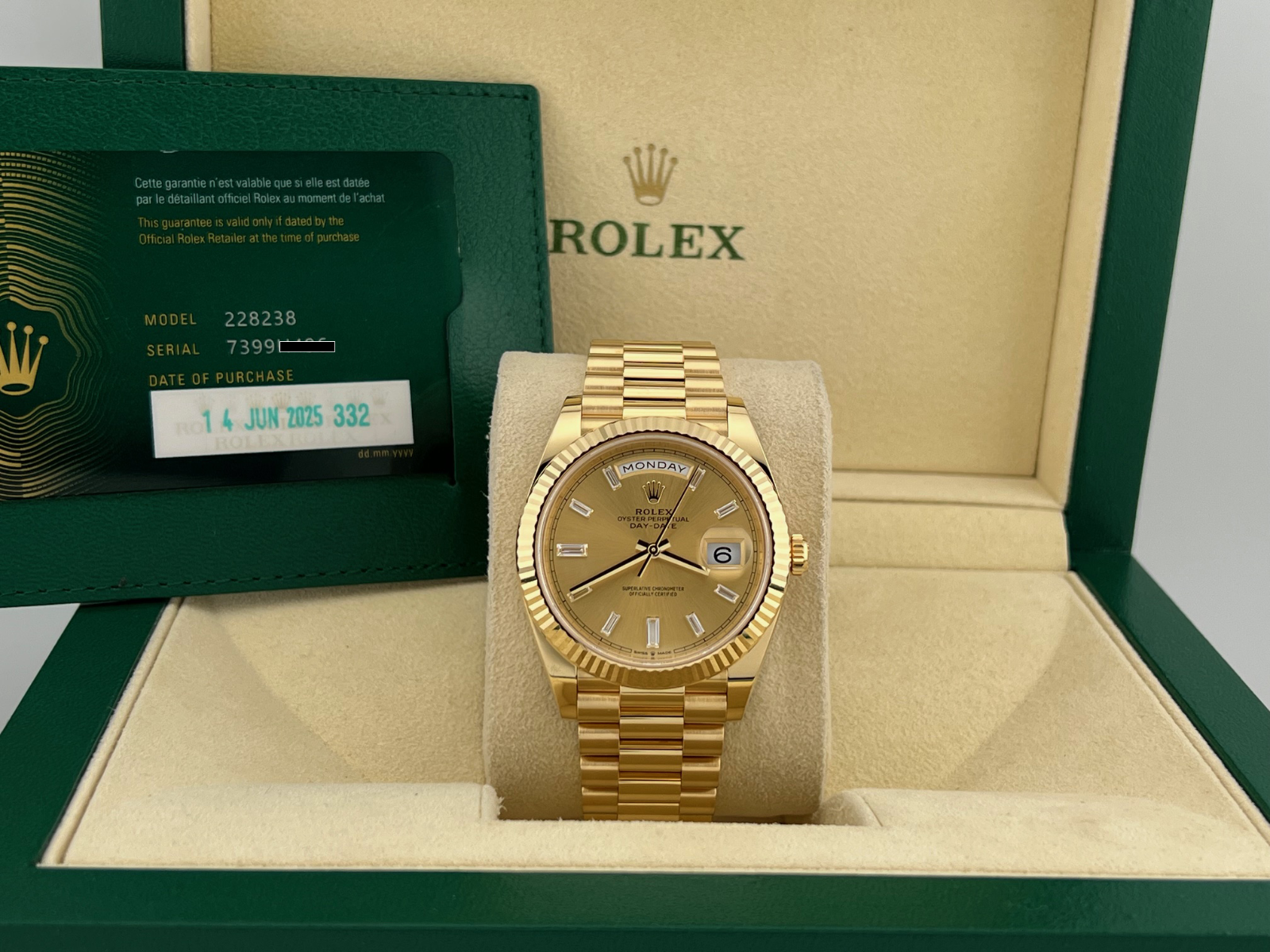 2025 Rolex Day Date President 228238 40mm Factory Baguette Diamond Dial 18k Gold Rolex Sale! from 5899500 /per Contact Us This item is currently on backorder but you can still purchase it now and we'll ship as soon as more become available. Style Number: 228238Serial: 7399****Year: 2025 Model: Rolex Day Date President Case Material: 18k Yellow Gold Band: 18k Yellow Gold President Bezel: 18k Yellow Gold Fluted Dial: Factory Champagne Baguette Diamond DIal Crystal: Sapphire Case Size: 40mm Includes: - 2025 Rolex Box & Paper- Certified Appraisal - 5 Year Factory Warranty from Original Purchase DateSKU 23133 / 1140325TGC100225
