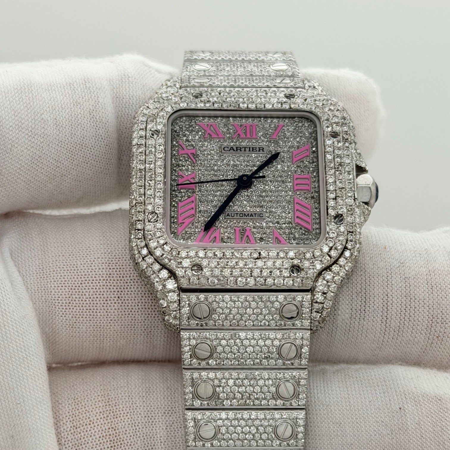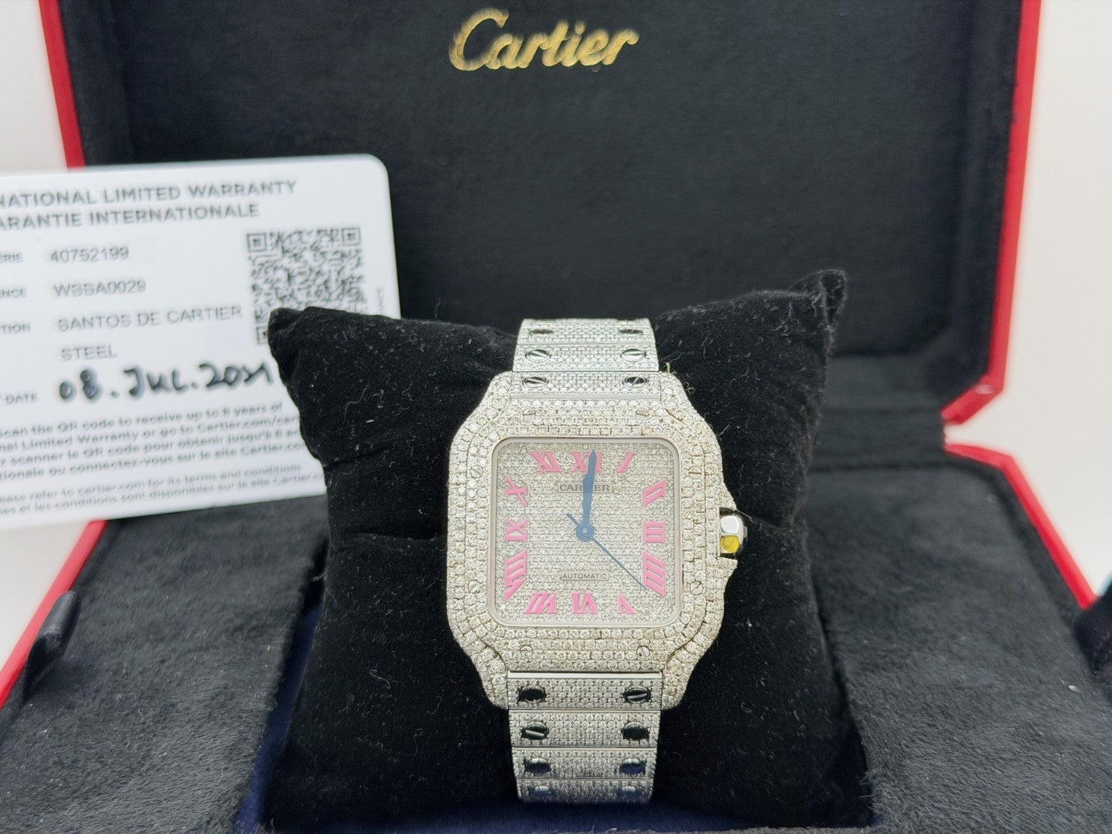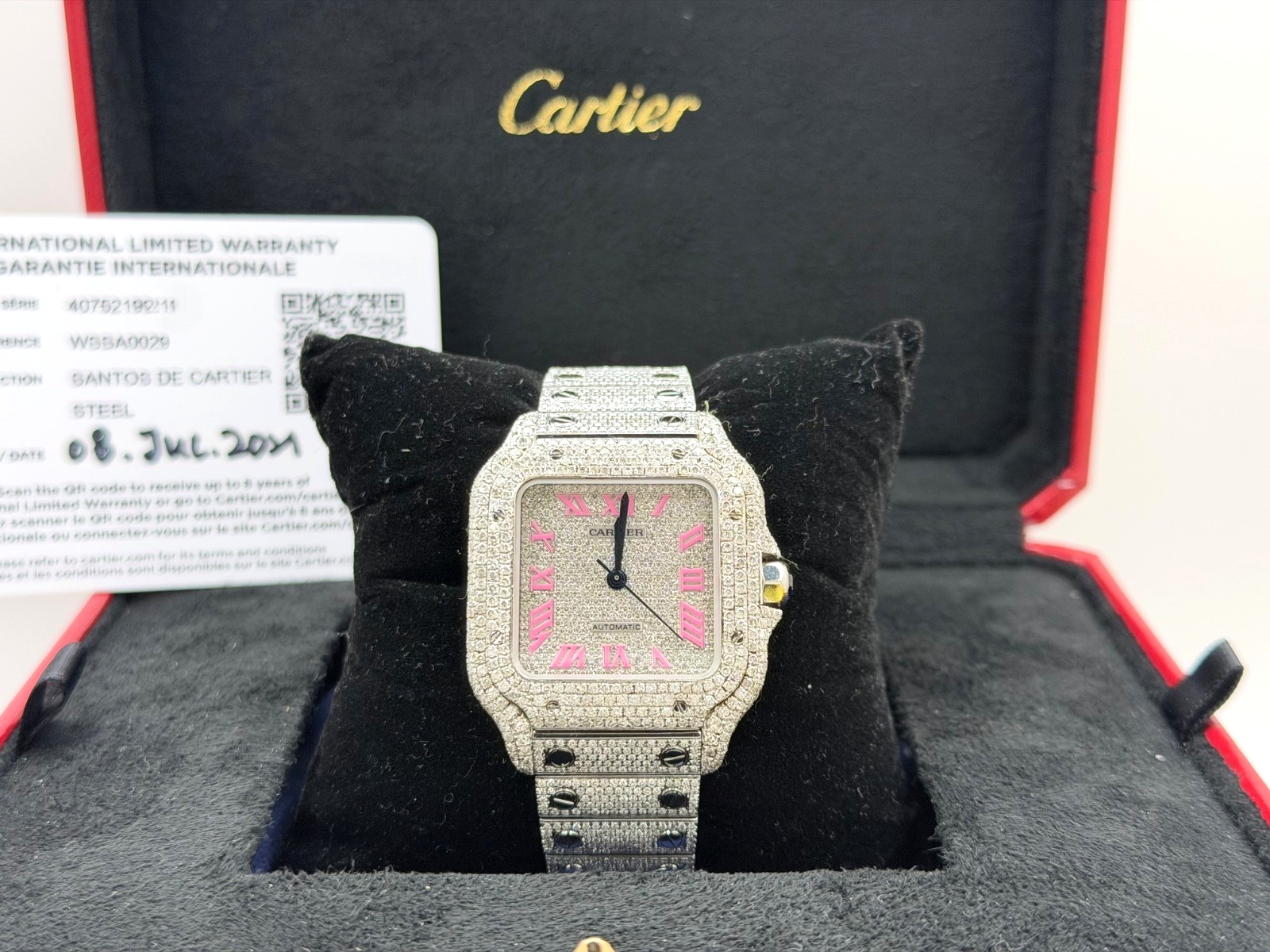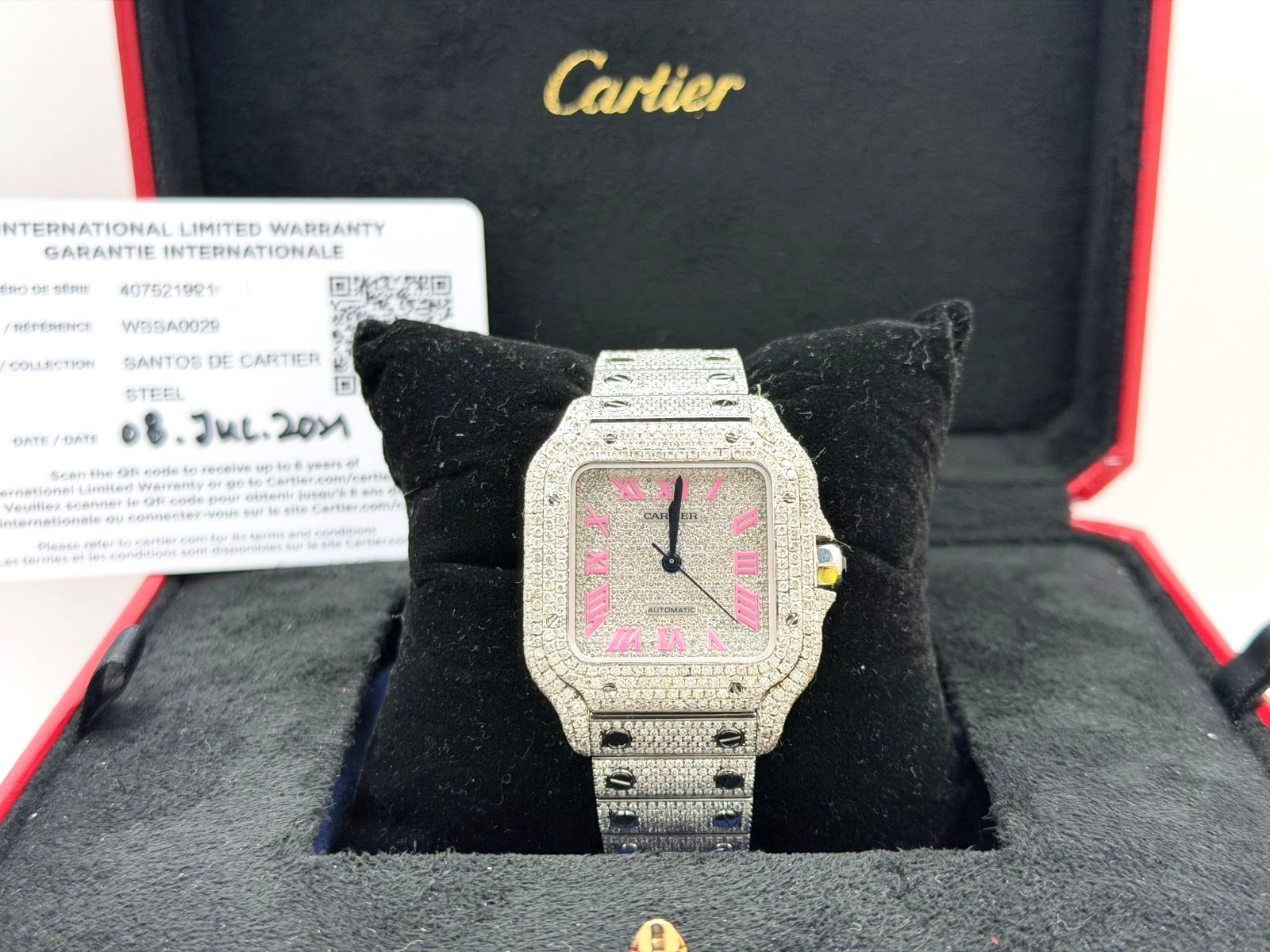 Cartier Santos Medium WSSA0029 35mm Diamond Case Bezel Iced Out Box Paper Cartier Sale! from 1199500 /per This item is a recurring or deferred purchase. By continuing, I agree to the cancellation policy and authorize you to charge my payment method at the prices, frequency and dates listed on this page until my order is fulfilled or I cancel, if permitted. +1 (619) 232-1273 This item is currently on backorder but you can still purchase it now and we'll ship as soon as more become available. Style Number: WSSA0029Serial: 40752119*****Year: 2021 Model: Cartier Santos Medium Iced Out / Bust Down Case Material: Custom Diamond Encrusted Stainless Steel Case Band: Custom Diamond Encrusted Stainless Steel Bracelet Bezel: Custom Diamond Bezel Dial: Custom Pavé Diamond Dial with Pink Roman Numerals Crystal: Sapphire Case Size: 35mm Includes: -Cartier Box & Card-Certified Appraisal -1 Year WarrantySKU 23209 / 115165TGC101325