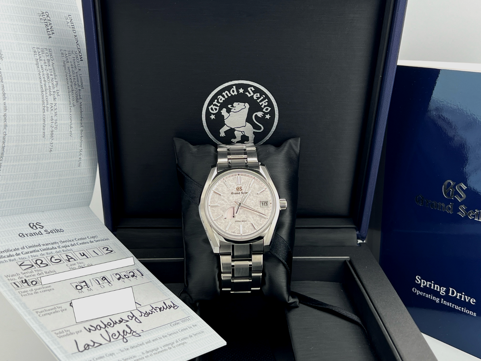 Grand Seiko Heritage Collection Shunbun Pink Spring Drive SBGA413 40mm Box Paper Grand Seiko Sale! from 619500 /per This item is a recurring or deferred purchase. By continuing, I agree to the cancellation policy and authorize you to charge my payment method at the prices, frequency and dates listed on this page until my order is fulfilled or I cancel, if permitted. +1 (619) 232-1273 This item is currently on backorder but you can still purchase it now and we'll ship as soon as more become available. Style Number: SBGA413Serial: 140***Year: 2021 Model: Grand Seiko Heritage Collection - 'Shunbun' Pink Cherry Blossom Case Material: Titanium Band: Titanium Bezel: Titanium Dial: Pink 'Cherry Blossom' Dial Crystal: Sapphire Case Size: 40mm Includes: - Grand Seiko Box & Paper- Certified Appraisal - 1 Year WarrantySKU 23046 / 111430TOC091225
