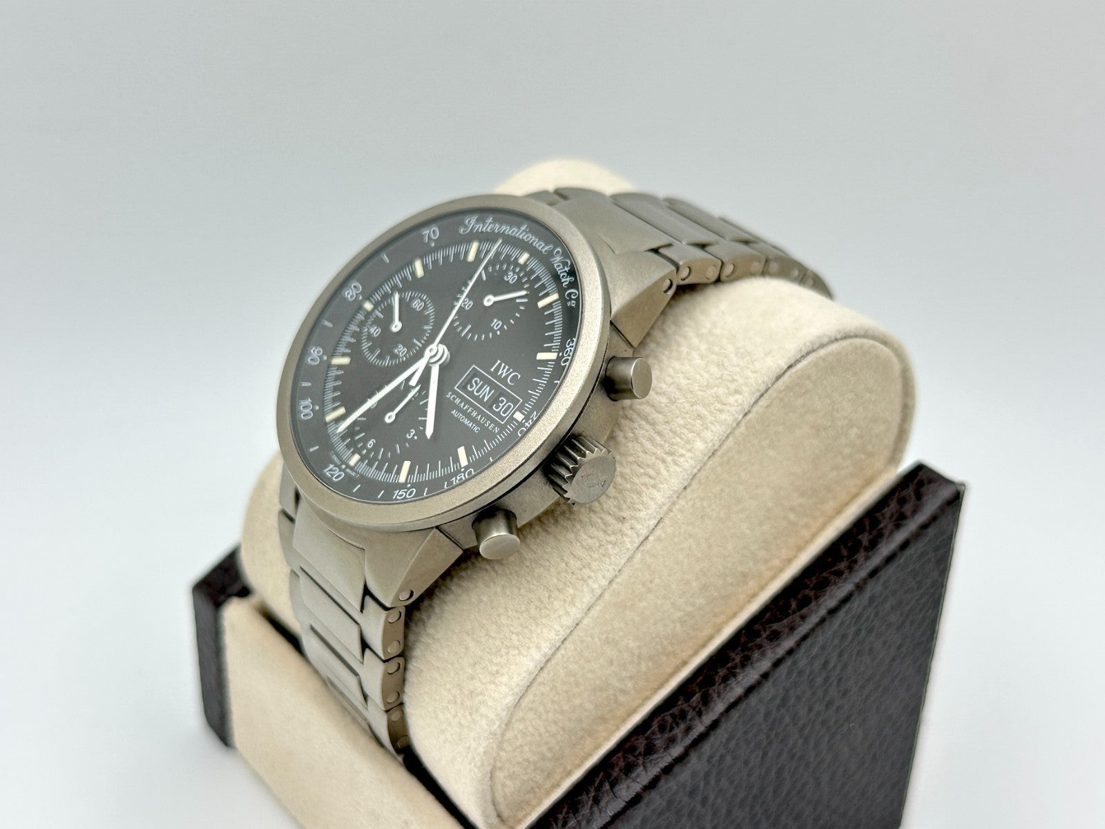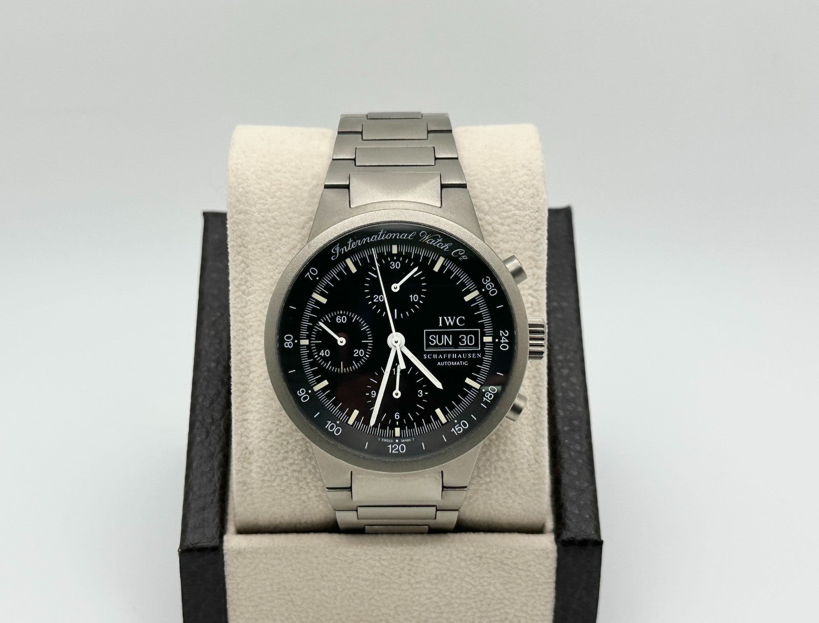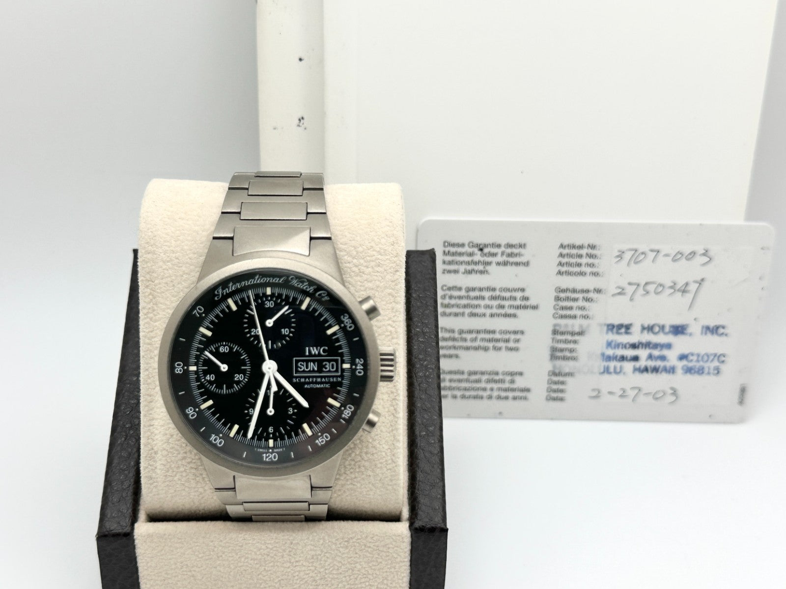 IWC GST Chronograph IW370703 40mm Black Dial Titanium Booklets Paper IWC Sale! from 369500 /per This item is a recurring or deferred purchase. By continuing, I agree to the cancellation policy and authorize you to charge my payment method at the prices, frequency and dates listed on this page until my order is fulfilled or I cancel, if permitted. +1 (619) 232-1273 This item is currently on backorder but you can still purchase it now and we'll ship as soon as more become available. Style Number: IW370703Serial: 2750***Year: 2003 Model: IWC GST Chronograph Case Material: Titanium Band: Titanium Bezel: Titanium Dial: Black Crystal: Sapphire Crystal Case Size: 40mm Includes: -IWC Warranty Card & Booklets-Certified Appraisal -1 Year WarrantySKU 20136 / 15640T042623