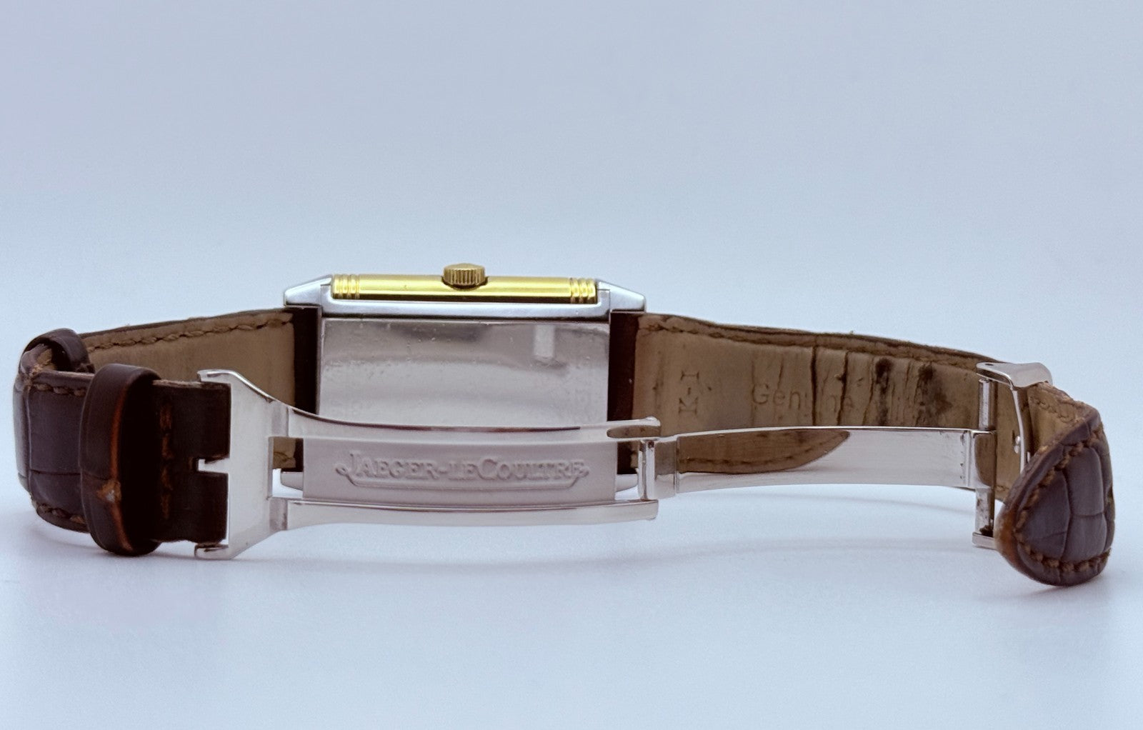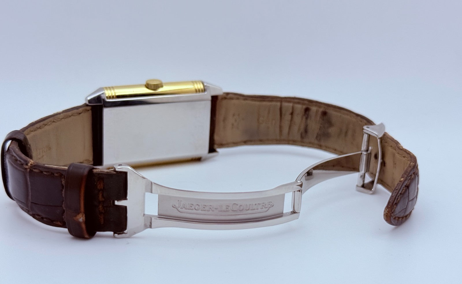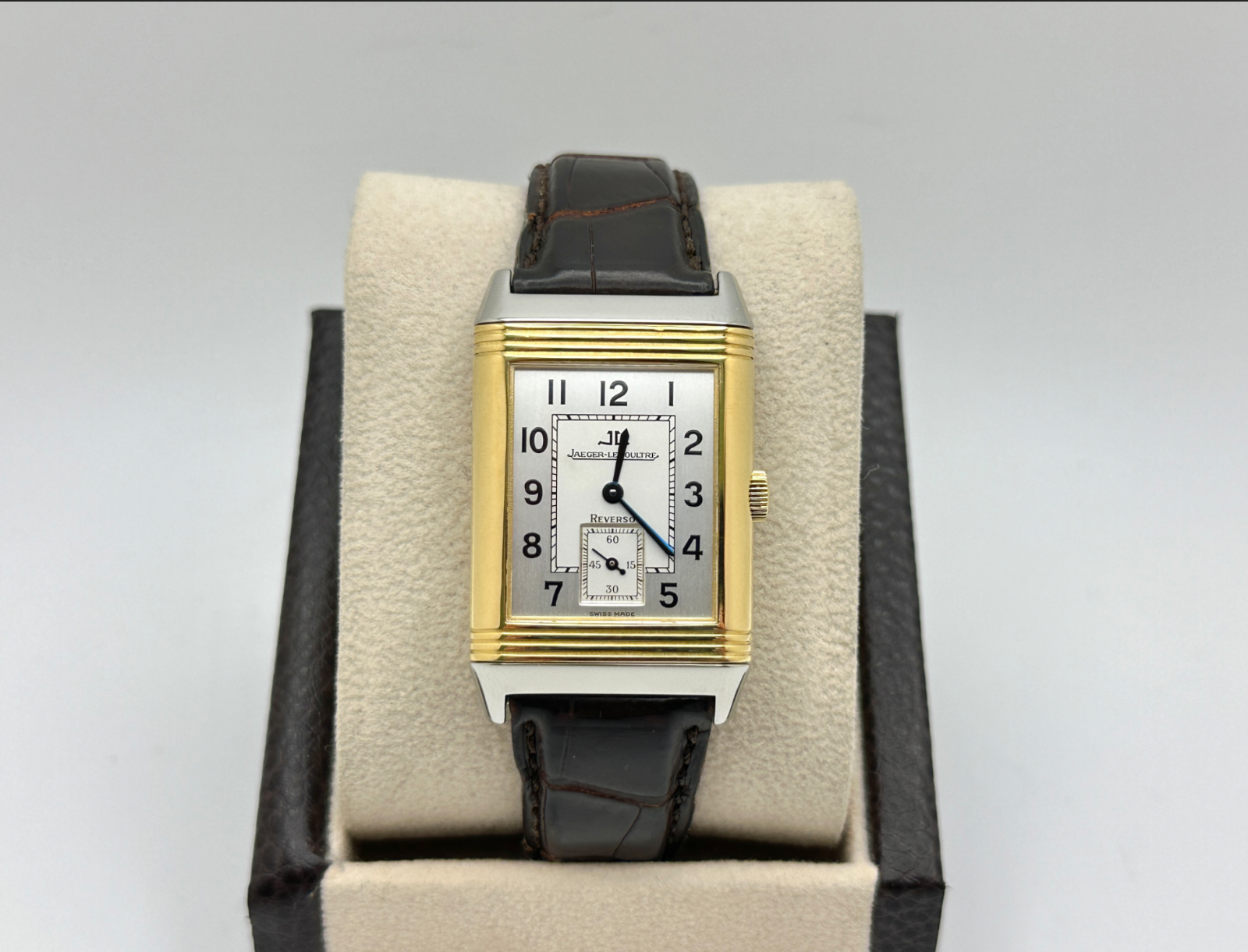 Jaeger LeCoultre Reverso 270.5.62 Grande Taille SIlver Dial 18k Gold Steel Jaeger-LeCoultre Sale! from 699500 /per This item is a recurring or deferred purchase. By continuing, I agree to the cancellation policy and authorize you to charge my payment method at the prices, frequency and dates listed on this page until my order is fulfilled or I cancel, if permitted. +1 (619) 232-1273 This item is currently on backorder but you can still purchase it now and we'll ship as soon as more become available. Style Number: 270.5.62Serial: 197****Model: Jaeger LeCoultre Reverso Grande Taille Case Material: Stainless Steel Band: Brown Leather Bezel: 18K Yellow Gold Dial: Silver Dial Crystal: Sapphire Crystal Case Size: 42.2 x 26mm Includes: - Elegant Watch Box- Certified Appraisal - One Year WarrantySKU 20057 / 17470TLK121622SF