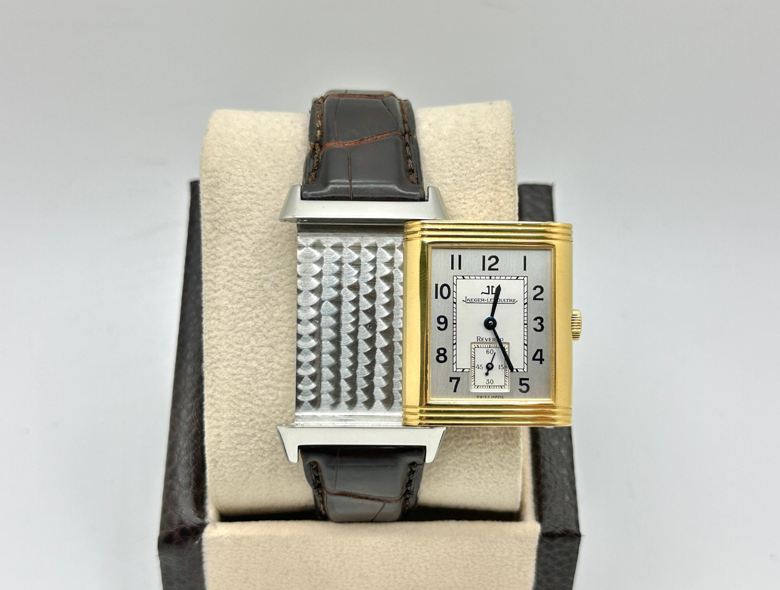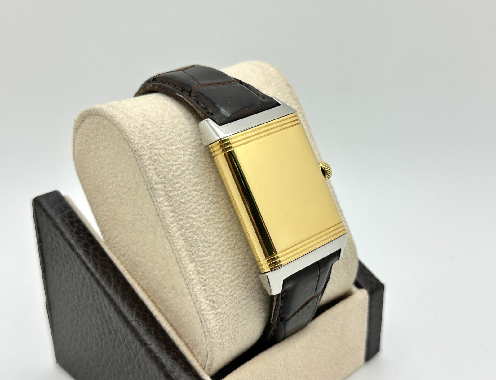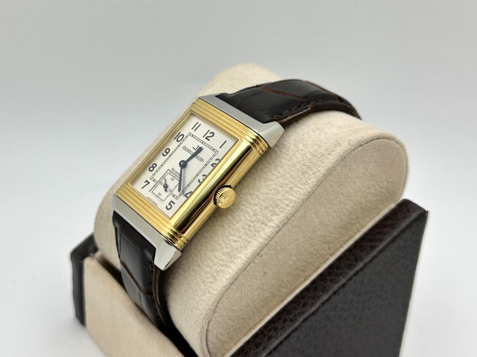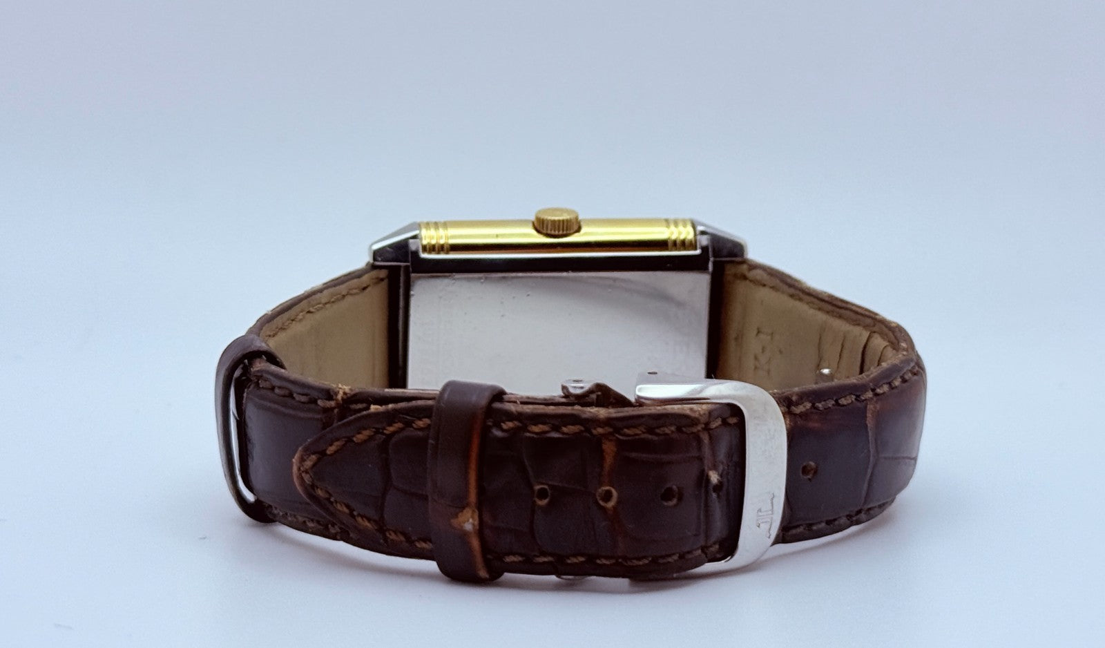 Jaeger LeCoultre Reverso 270.5.62 Grande Taille SIlver Dial 18k Gold Steel Jaeger-LeCoultre Sale! from 699500 /per This item is a recurring or deferred purchase. By continuing, I agree to the cancellation policy and authorize you to charge my payment method at the prices, frequency and dates listed on this page until my order is fulfilled or I cancel, if permitted. +1 (619) 232-1273 This item is currently on backorder but you can still purchase it now and we'll ship as soon as more become available. Style Number: 270.5.62Serial: 197****Model: Jaeger LeCoultre Reverso Grande Taille Case Material: Stainless Steel Band: Brown Leather Bezel: 18K Yellow Gold Dial: Silver Dial Crystal: Sapphire Crystal Case Size: 42.2 x 26mm Includes: - Elegant Watch Box- Certified Appraisal - One Year WarrantySKU 20057 / 17470TLK121622SF