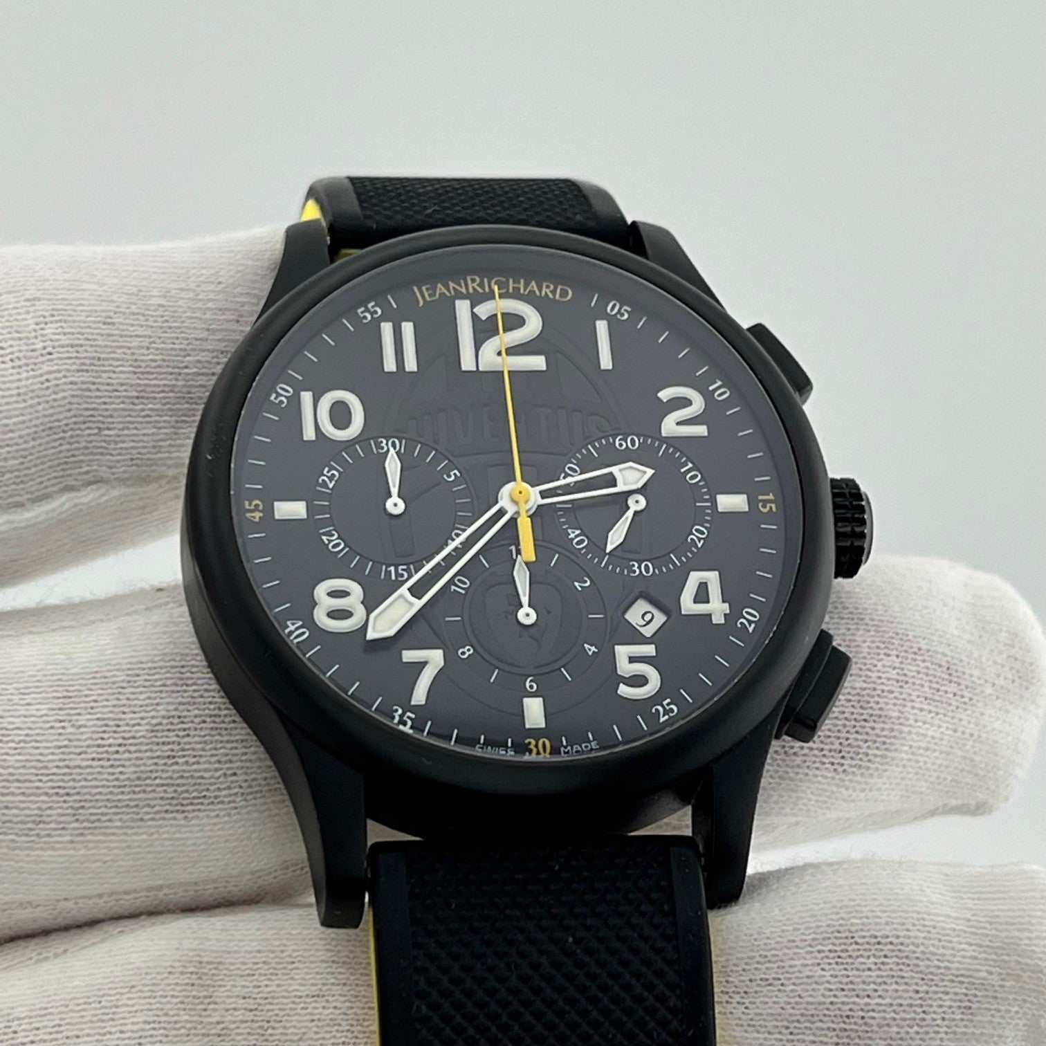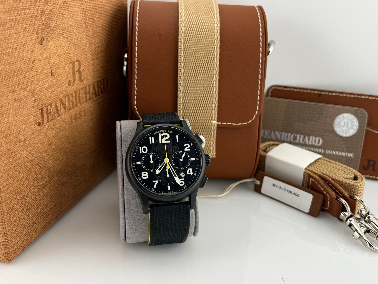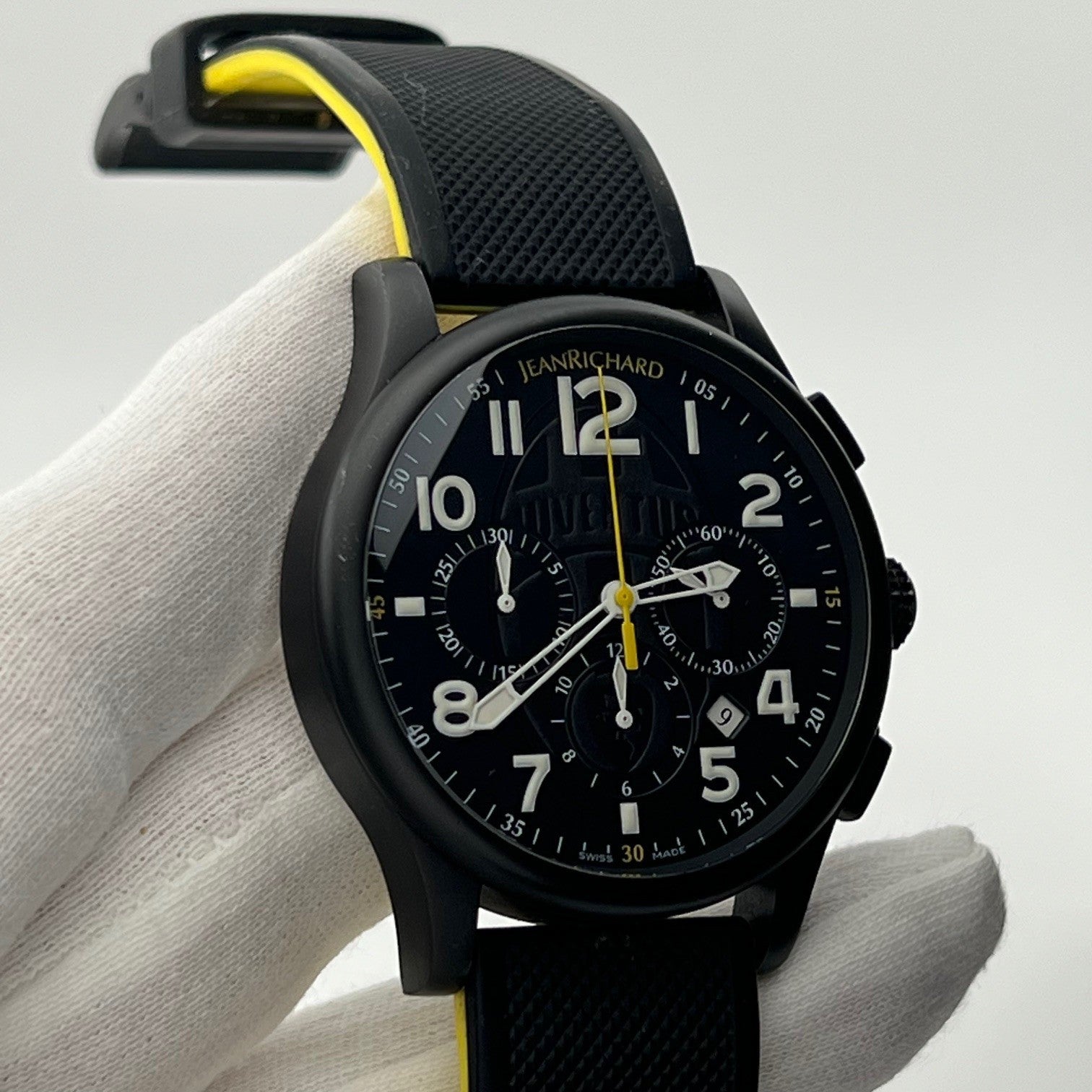 Style Number: 32112 -13 -128 -AC6 Serial: 32112/**** Model: Jean Richard Bressel Classic Chronograph Case Material: PVD Coated Stainless Steel Band: Black Rubber Bezel: Black Dial: Black Crystal: Sapphire Case Size: 43mm Includes: - Jean Richard Box & Card - Certified Appraisal - 1 Year Warranty SKU 23147 / 12001TOC100225
