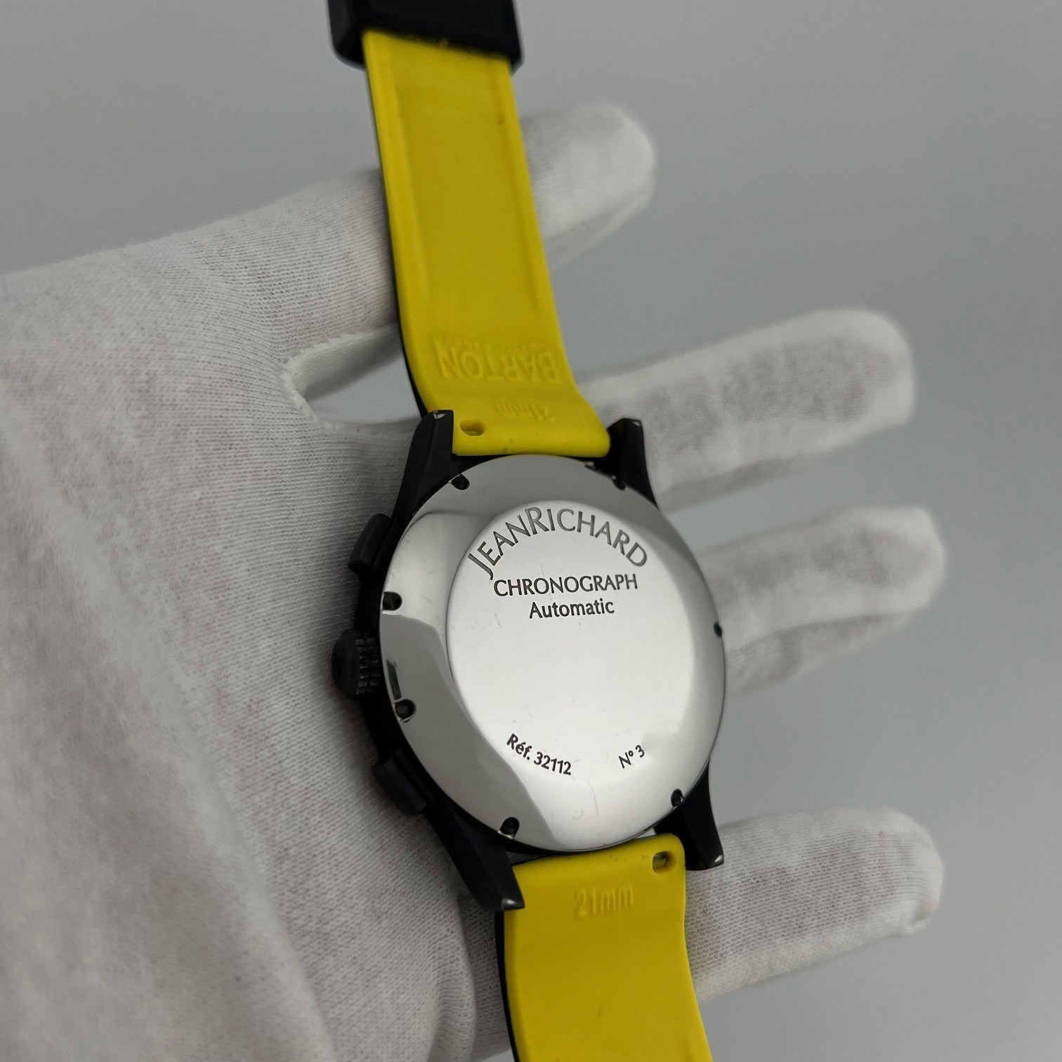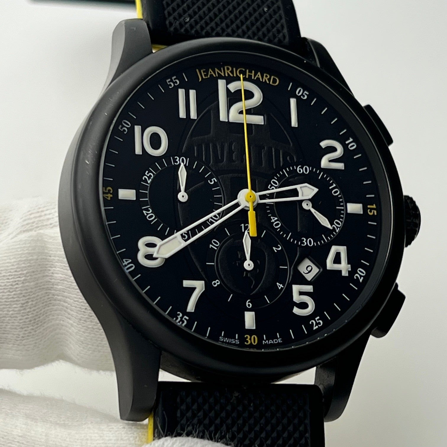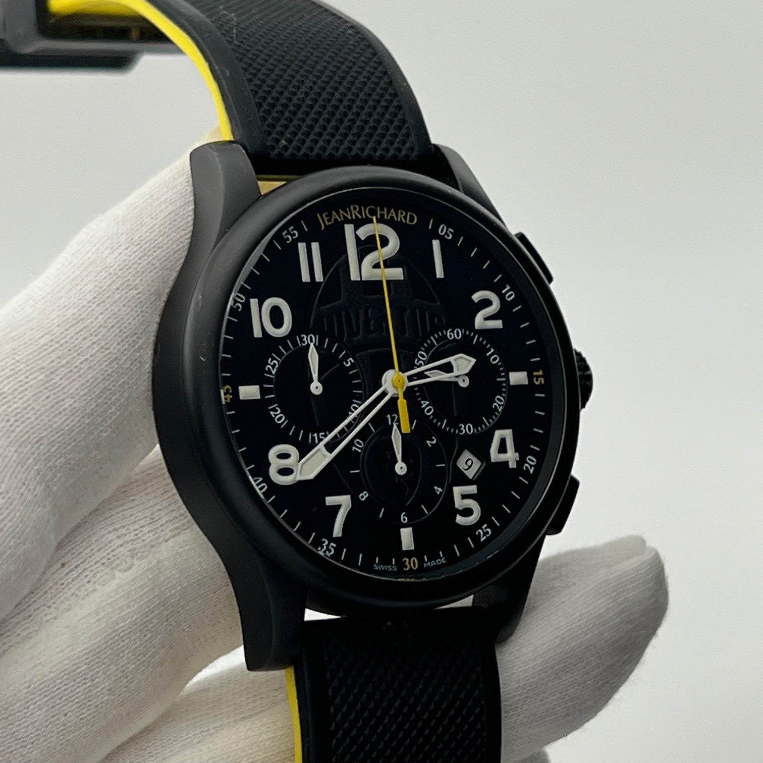 Style Number: 32112 -13 -128 -AC6 Serial: 32112/**** Model: Jean Richard Bressel Classic Chronograph Case Material: PVD Coated Stainless Steel Band: Black Rubber Bezel: Black Dial: Black Crystal: Sapphire Case Size: 43mm Includes: - Jean Richard Box & Card - Certified Appraisal - 1 Year Warranty SKU 23147 / 12001TOC100225