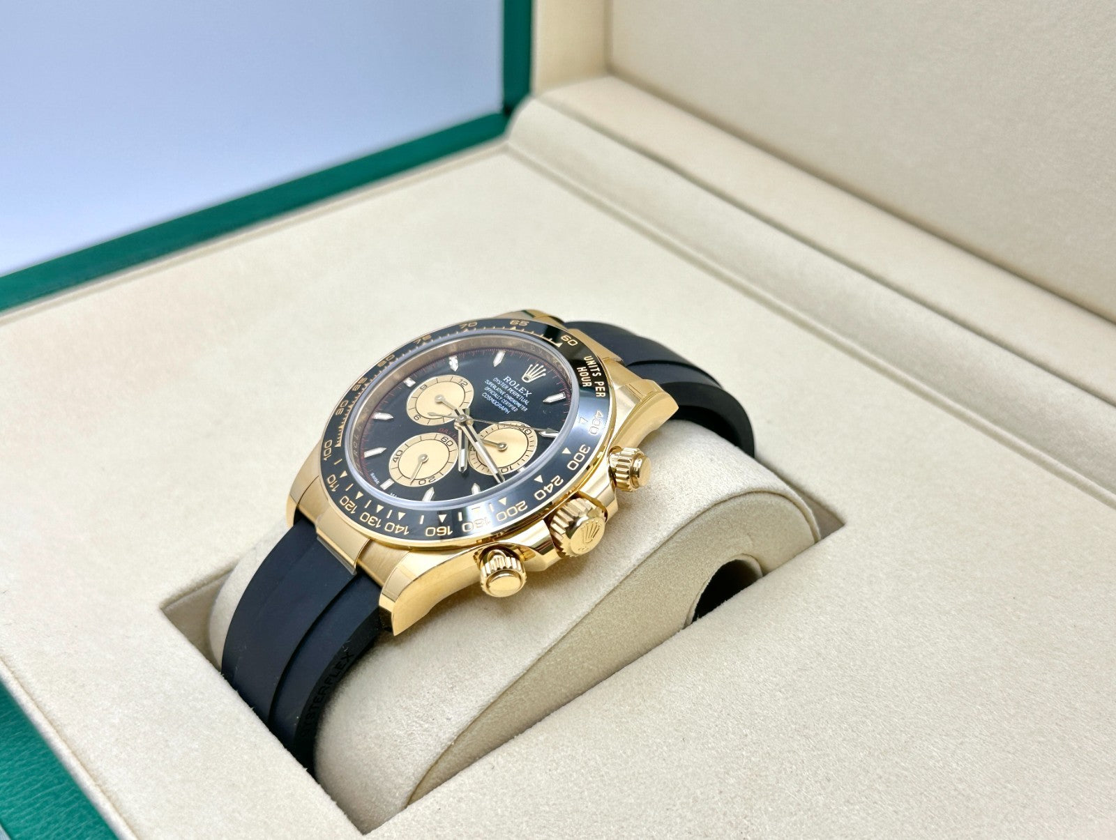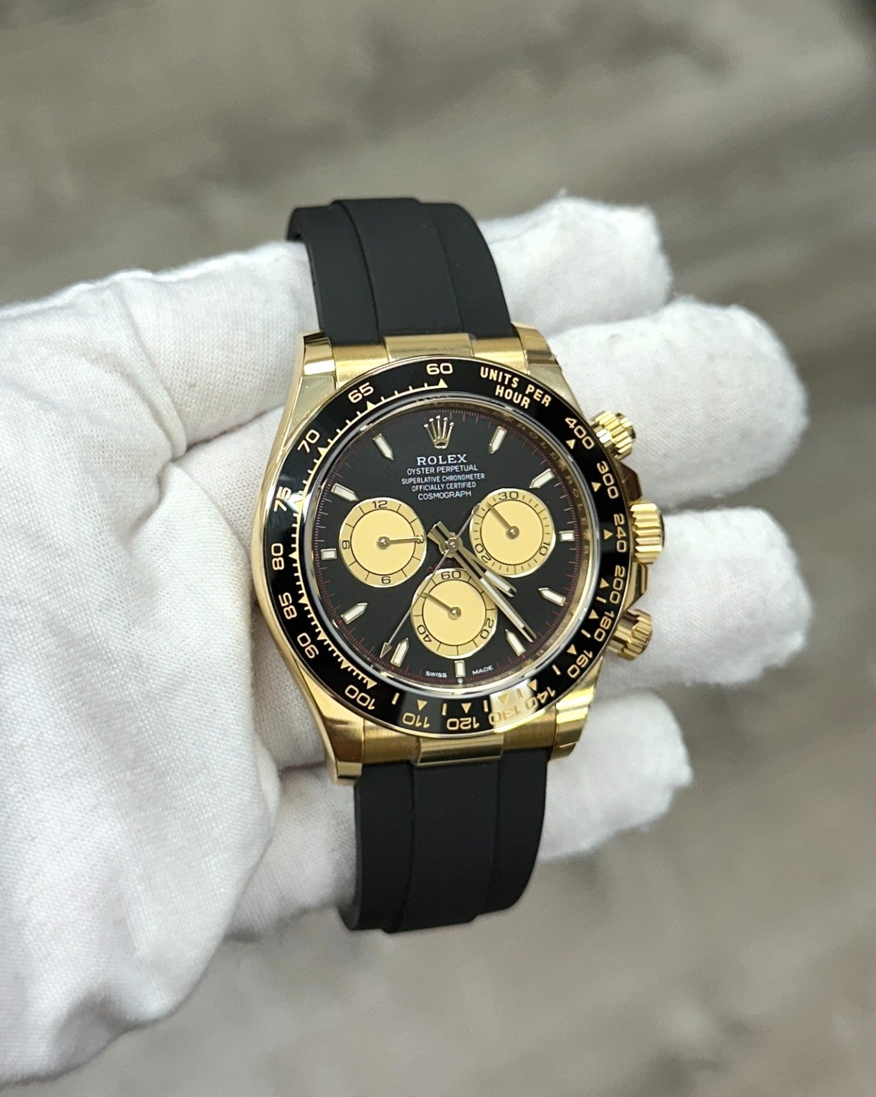 NEW 2025 Rolex Daytona Paul Newman 126518LN 18K Yellow Gold Oysterflex Box Paper Rolex Sale! from 5199500 /per This item is a recurring or deferred purchase. By continuing, I agree to the cancellation policy and authorize you to charge my payment method at the prices, frequency and dates listed on this page until my order is fulfilled or I cancel, if permitted. +1 (619) 232-1273 This item is currently on backorder but you can still purchase it now and we'll ship as soon as more become available. Style Number: 126518LNSerial: VG905***Year: 2025 Model: Rolex Daytona Cosmograph 'Paul Newman' Case Material: 18K Yellow Gold Band: Black Oysterflex Strap Bezel: Black Ceramic Dial: 'Paul Newman' Black Dial Crystal: Sapphire Crystal Case Size: 40mm Includes: - Rolex Box & Paper- Certified Appraisal - Five Year Factory Warranty from Original Purchase DateSKU 23568 / 1125400TGC011426