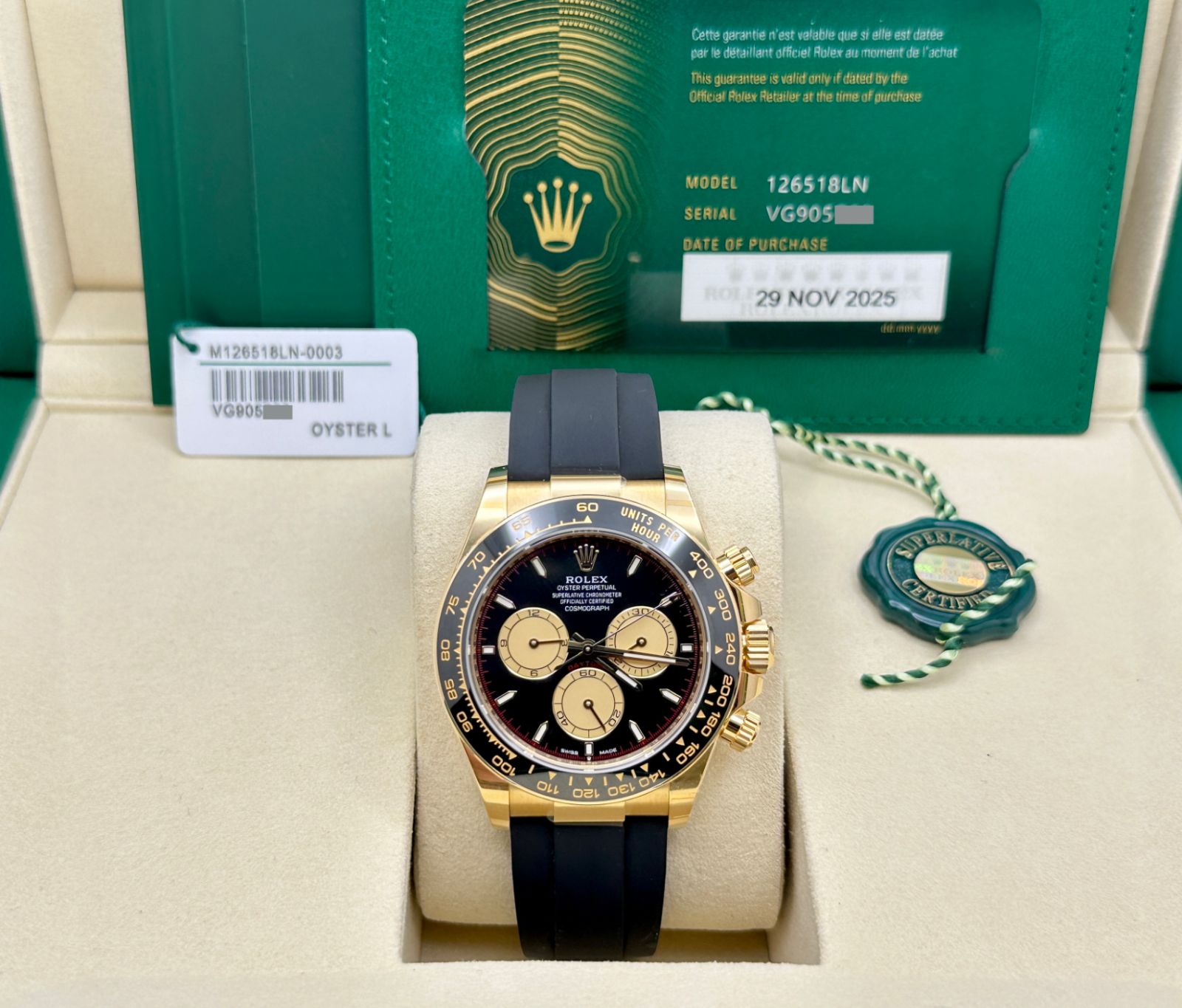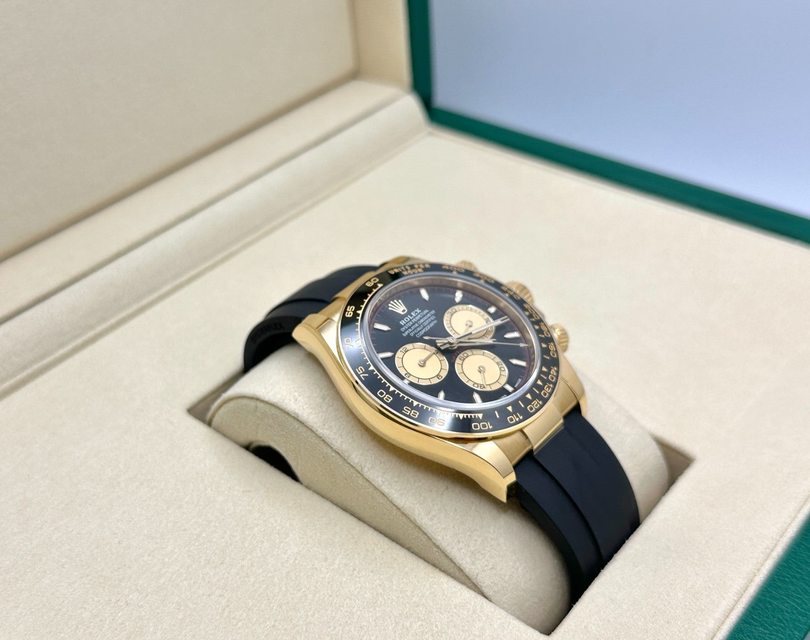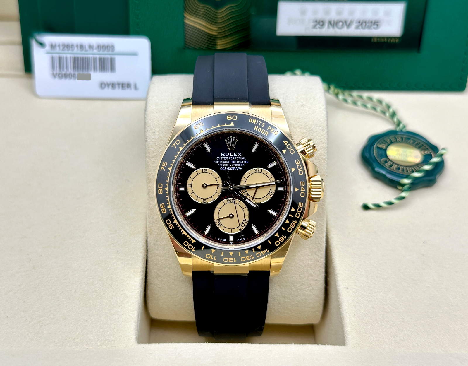 NEW 2025 Rolex Daytona Paul Newman 126518LN 18K Yellow Gold Oysterflex Box Paper Rolex Sale! from 5199500 /per This item is a recurring or deferred purchase. By continuing, I agree to the cancellation policy and authorize you to charge my payment method at the prices, frequency and dates listed on this page until my order is fulfilled or I cancel, if permitted. +1 (619) 232-1273 This item is currently on backorder but you can still purchase it now and we'll ship as soon as more become available. Style Number: 126518LNSerial: VG905***Year: 2025 Model: Rolex Daytona Cosmograph 'Paul Newman' Case Material: 18K Yellow Gold Band: Black Oysterflex Strap Bezel: Black Ceramic Dial: 'Paul Newman' Black Dial Crystal: Sapphire Crystal Case Size: 40mm Includes: - Rolex Box & Paper- Certified Appraisal - Five Year Factory Warranty from Original Purchase DateSKU 23568 / 1125400TGC011426