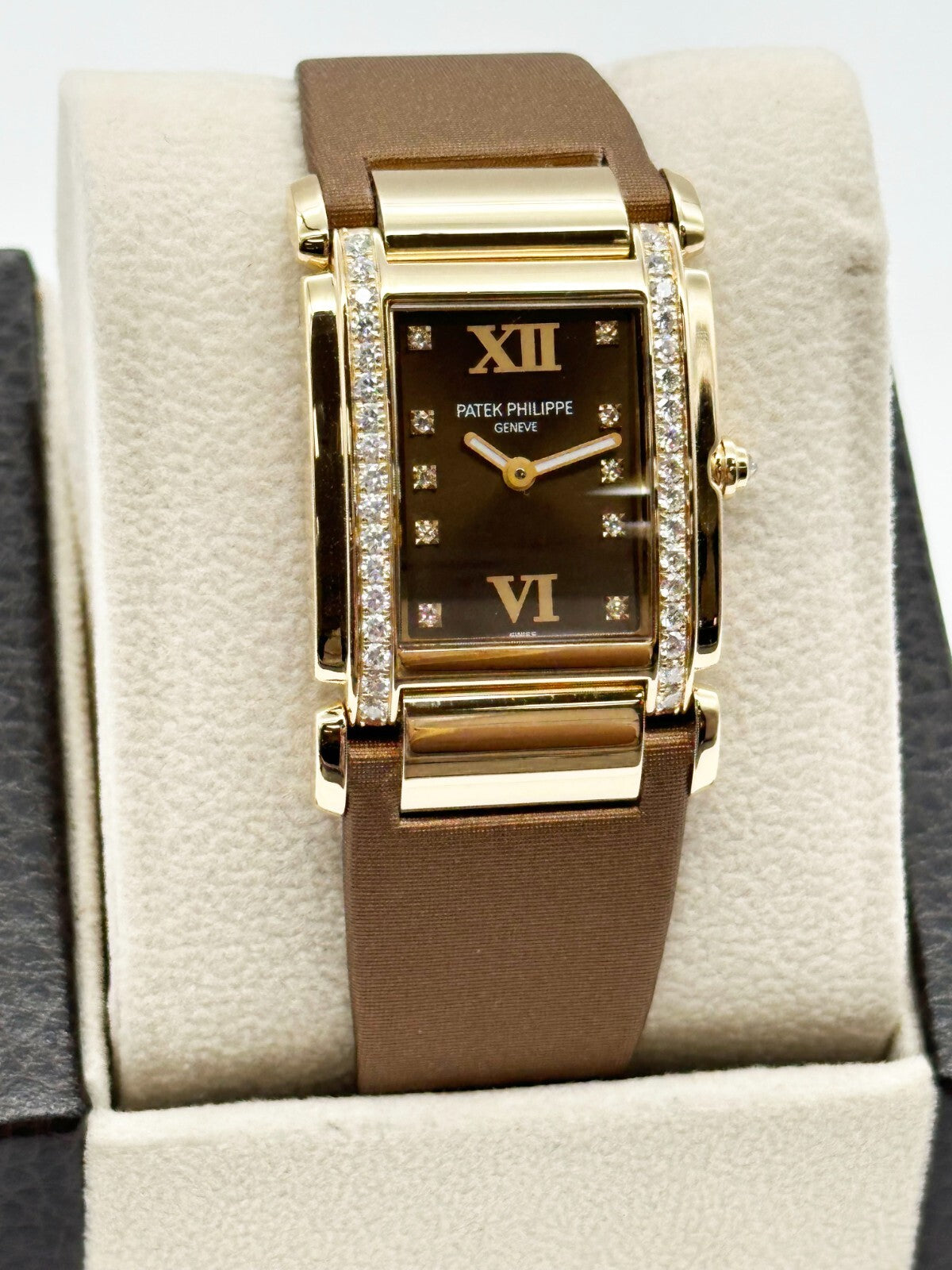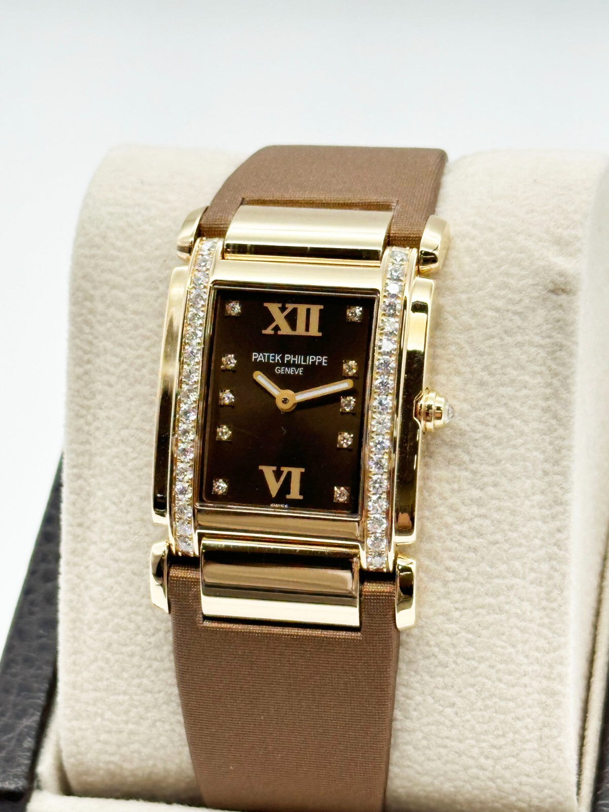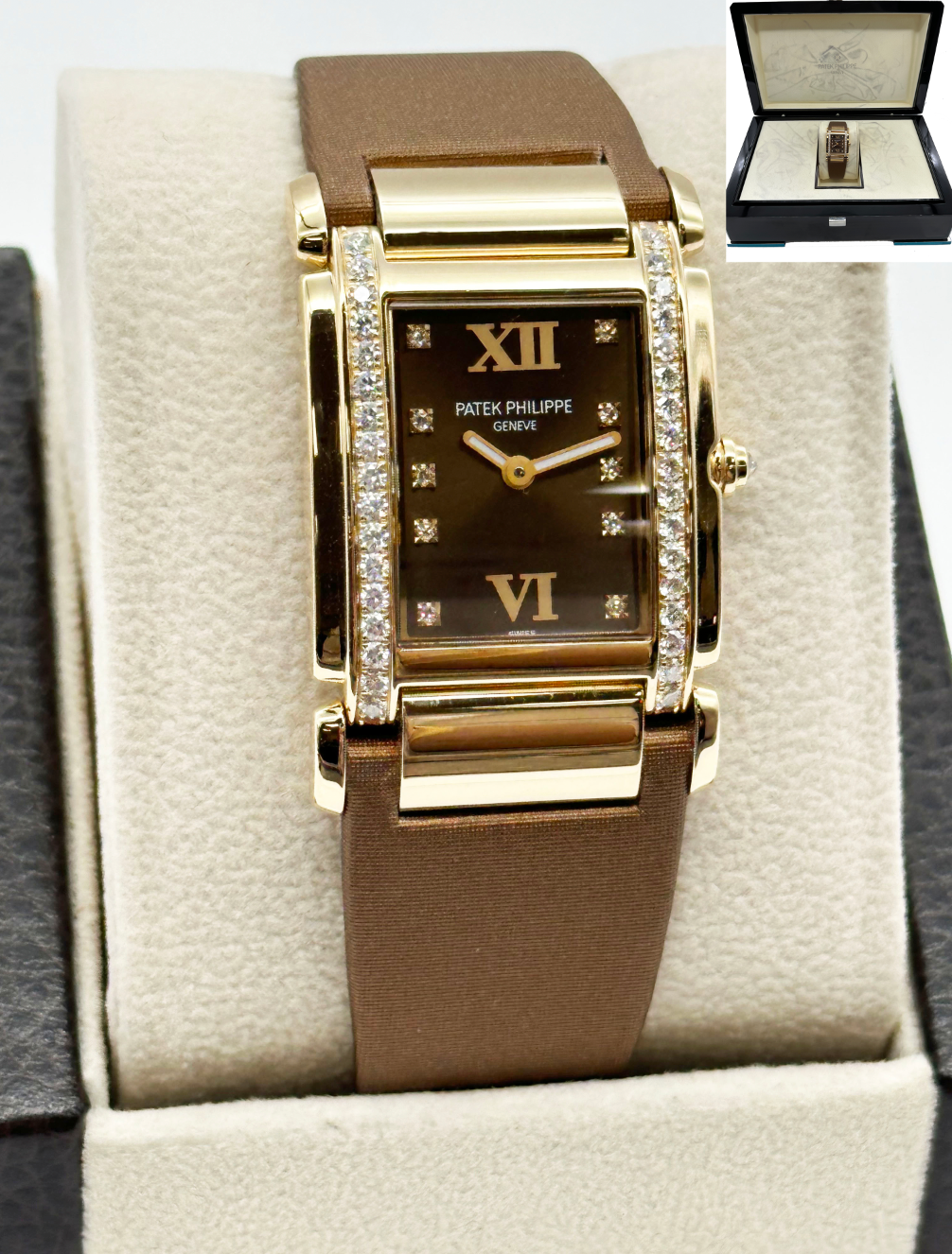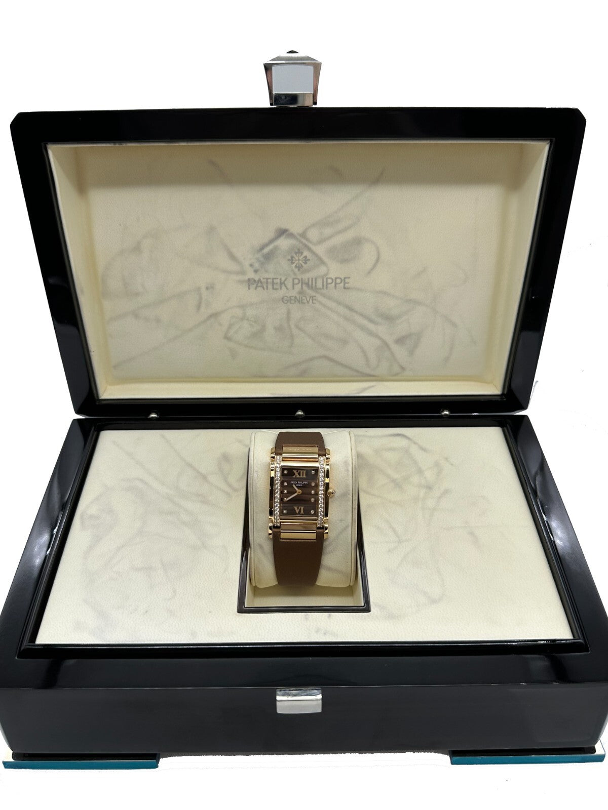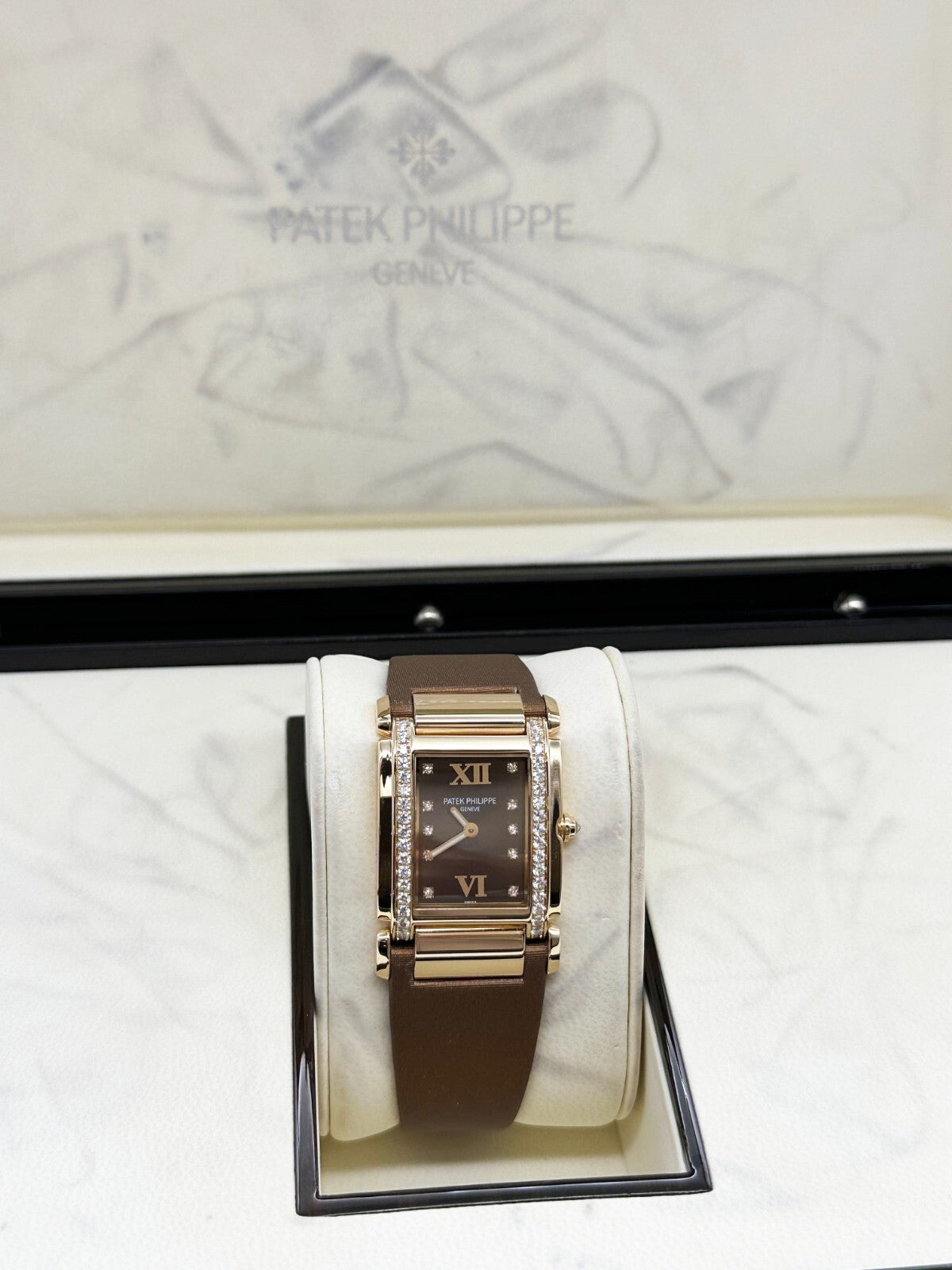 Patek Philippe Twenty 4 4920R-001 Diamond Bezel Chocolate Dial 18K Rose Gold Patek Philippe Sale! from 1199500 /per This item is a recurring or deferred purchase. By continuing, I agree to the cancellation policy and authorize you to charge my payment method at the prices, frequency and dates listed on this page until my order is fulfilled or I cancel, if permitted. +1 (619) 232-1273 This item is currently on backorder but you can still purchase it now and we'll ship as soon as more become available. Style Number: 4920R-001 Model: Patek Philippe Twenty 4 Case Material: 18K Rose Gold Band: Satin Bezel: 18K Rose Gold & Diamond Bezel Dial: Chocolate Dial with Diamond Hour Markers Face: Sapphire Crystal Case Size: 25mm x 30mm Includes: -Patek Philippe Box-Certified Appraisal -1 Year WarrantySKU 21683 / 125545TBJ091324