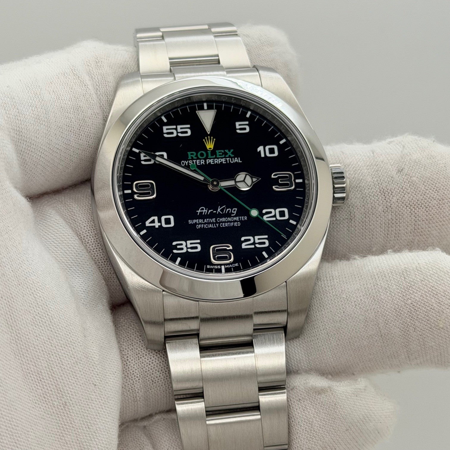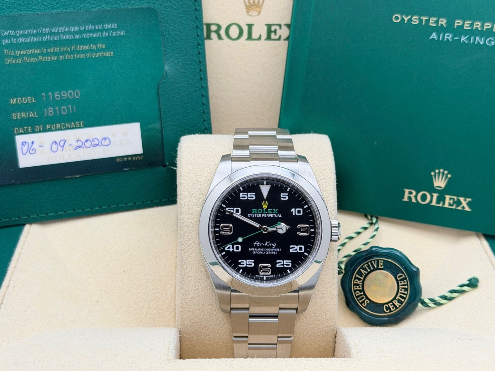Rolex Air King 116900 40mm Black Dial Stainless Steel Box Papers Rolex Sale! from 829500 /per This item is a recurring or deferred purchase. By continuing, I agree to the cancellation policy and authorize you to charge my payment method at the prices, frequency and dates listed on this page until my order is fulfilled or I cancel, if permitted. +1 (619) 232-1273 This item is currently on backorder but you can still purchase it now and we'll ship as soon as more become available. Style Number: 116900Serial: J810****Year: 2020 Model: Rolex Air King Case Material: Stainless Steel Band: Stainless Steel Bezel: Stainless Steel Dial: Black Crystal: Sapphire Case Size: 40mm Includes: - Rolex Box & Papers- Certified Appraisal - 1 Year WarrantySKU 23580 / 120655TLC011425