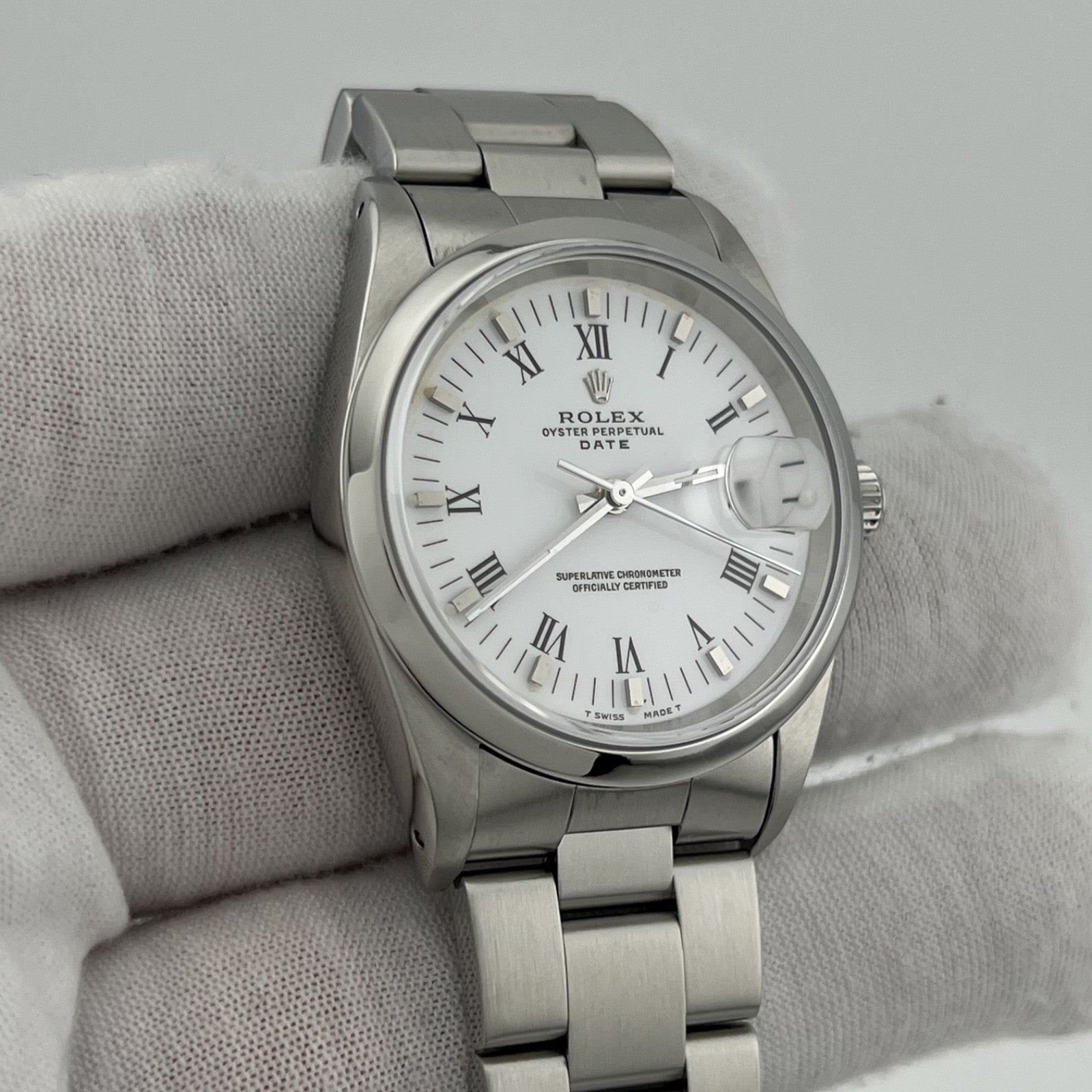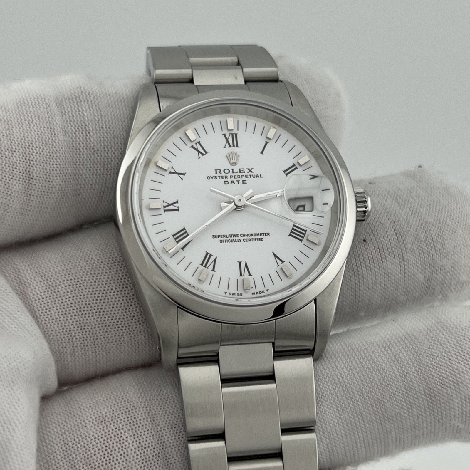 Rolex Date 15200 34mm White Roman Dial Stainless Steel Box Papers Rolex Sale! from 559500 /per This item is a recurring or deferred purchase. By continuing, I agree to the cancellation policy and authorize you to charge my payment method at the prices, frequency and dates listed on this page until my order is fulfilled or I cancel, if permitted. +1 (619) 232-1273 This item is currently on backorder but you can still purchase it now and we'll ship as soon as more become available. Style Number: 15200Serial: E28****Year: 1990 Model: Rolex Date Case Material: 34mm Band: Stainless Steel Bezel: Stainless Steel Dial: White Roman Crystal: Sapphire Case Size: 34mm Includes: - Rolex Box & Papers- Certified Appraisal - 1 Year WarrantySKU 22965 / 19990TJD082725
