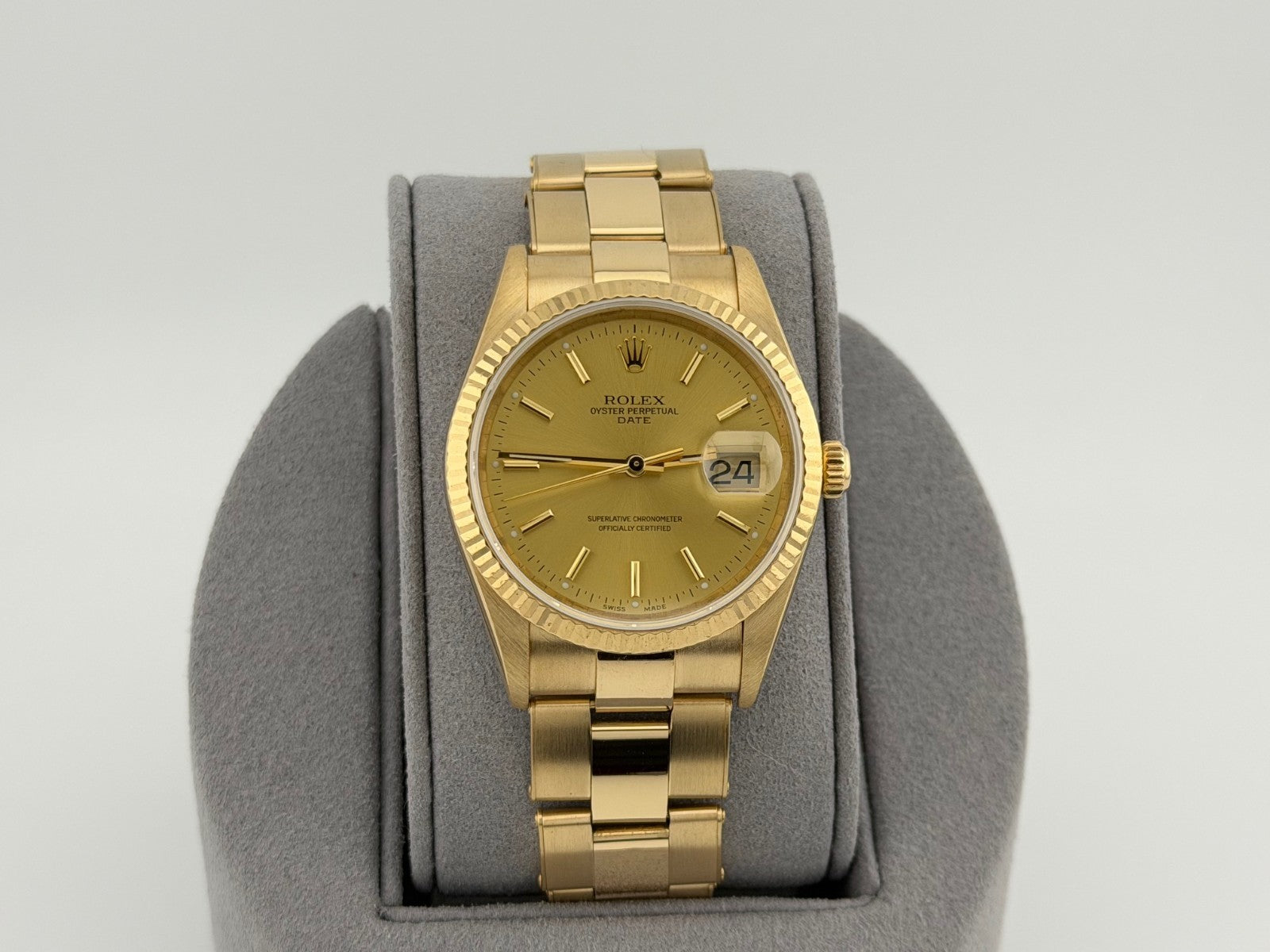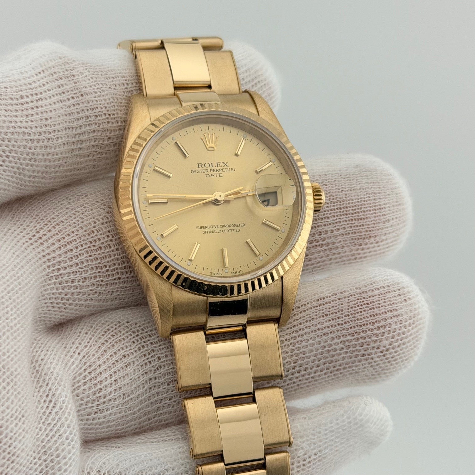 Rolex Date 15238 34mm Champagne Dial 18k Yellow Gold Oyster Box Paper 2002