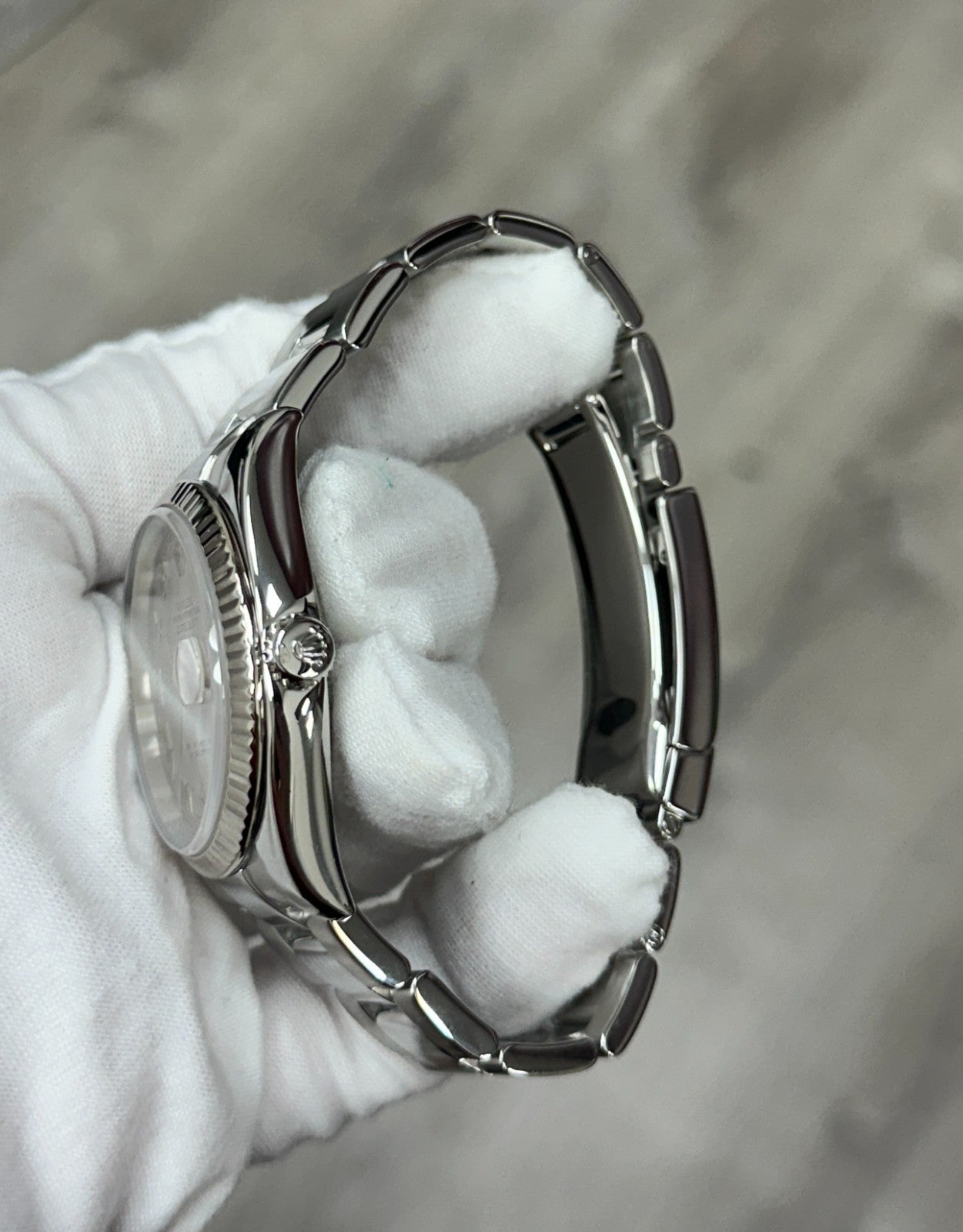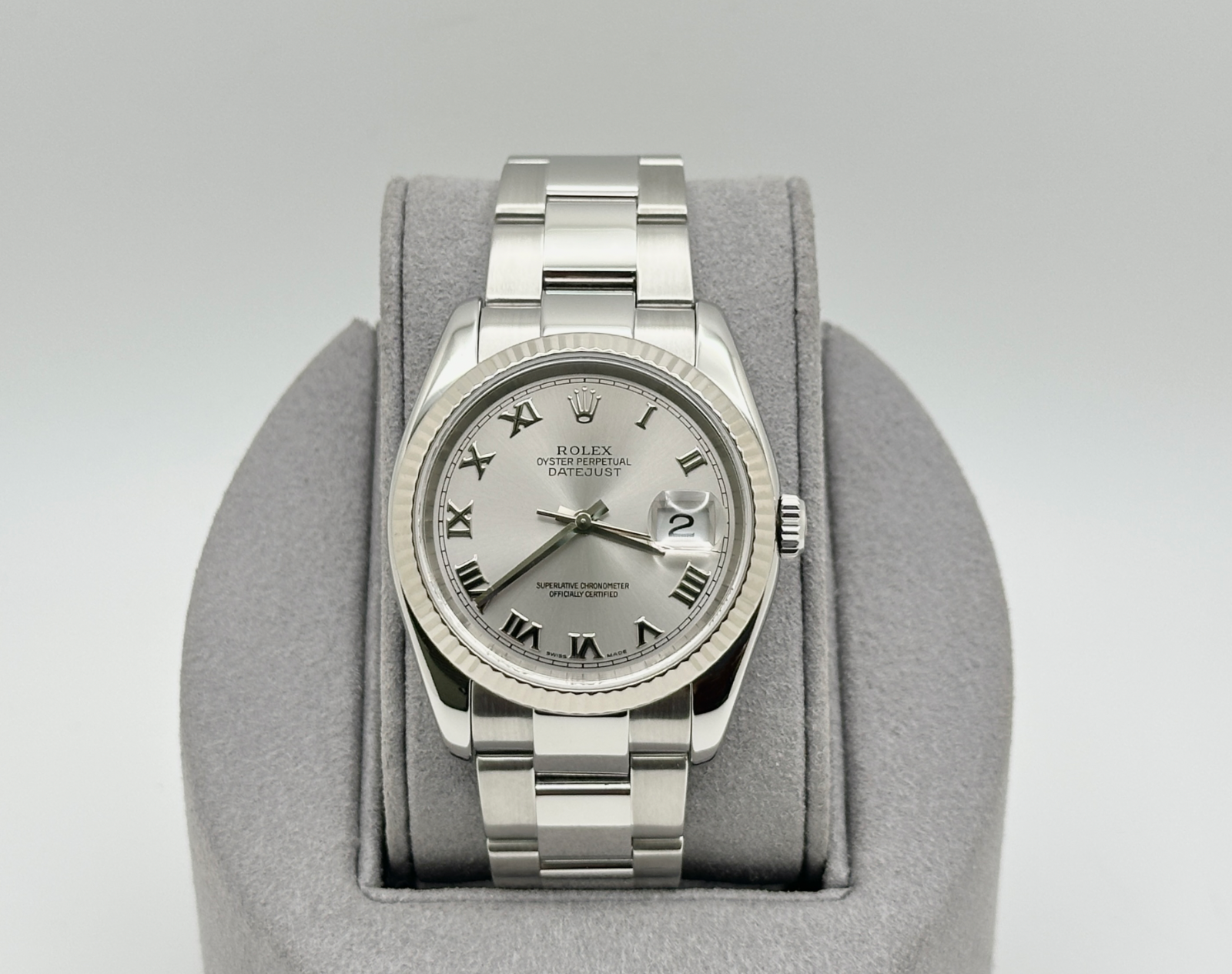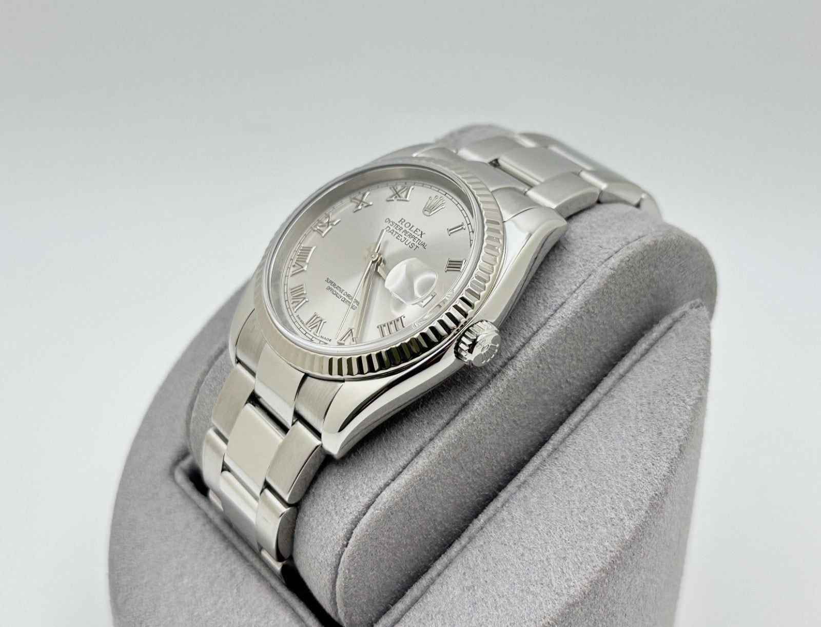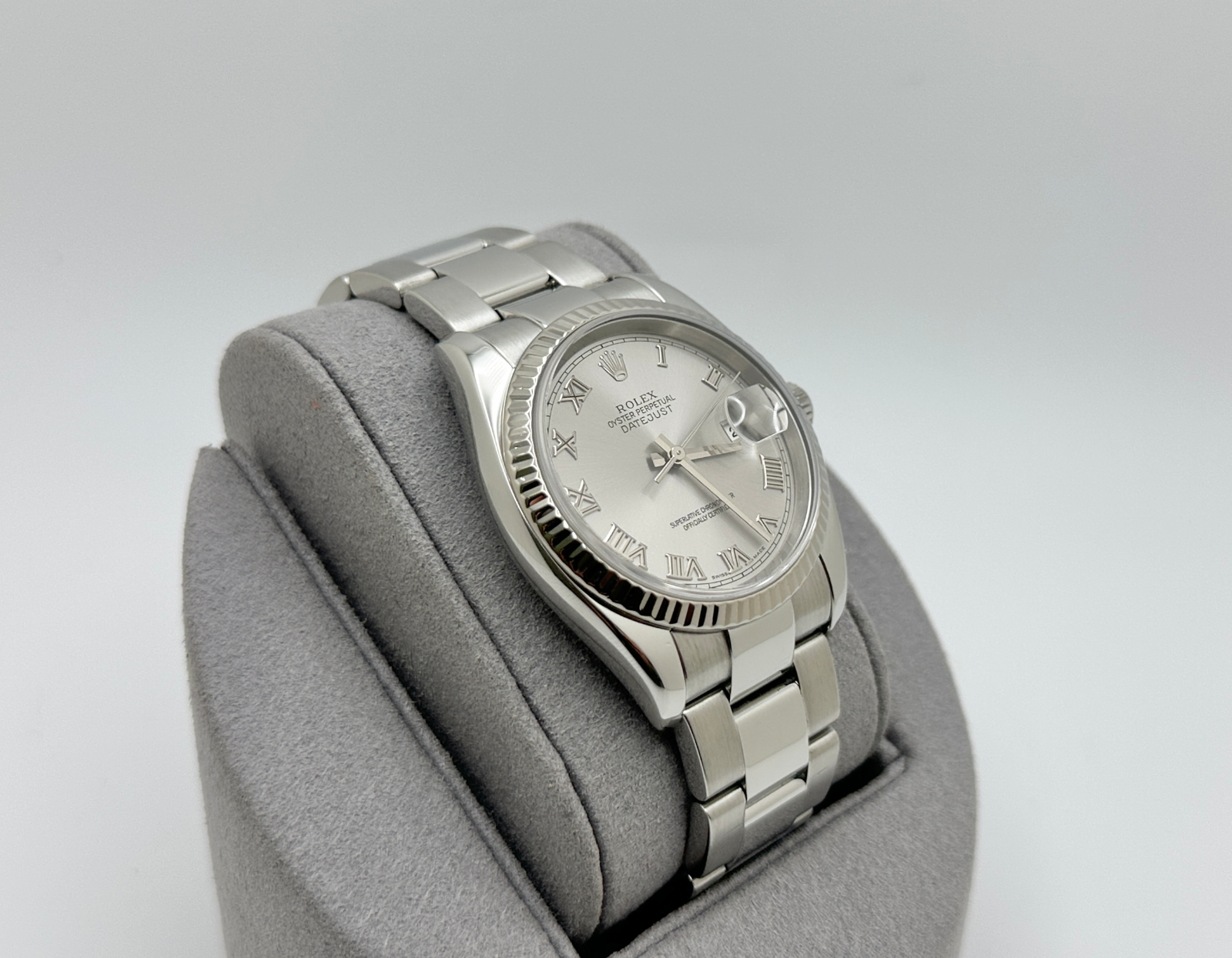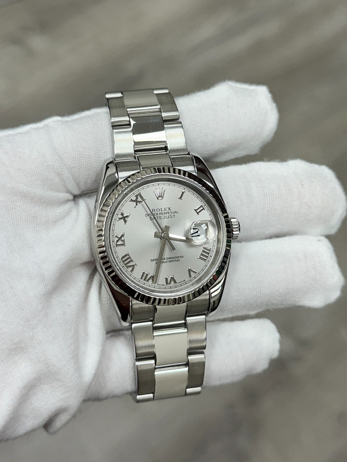 Rolex Datejust 116234 36mm Silver Roman Dial 18k Gold Bezel Stainless Steel Rolex Sale! from 789500 /per This item is a recurring or deferred purchase. By continuing, I agree to the cancellation policy and authorize you to charge my payment method at the prices, frequency and dates listed on this page until my order is fulfilled or I cancel, if permitted. +1 (619) 232-1273 This item is currently on backorder but you can still purchase it now and we'll ship as soon as more become available. Style Number: 116234Serial: D583***Year: 2005 Model: Rolex Datejust Case Material: Stainless Steel Band: Stainless Steel Bezel: 18K White Gold Fluted Dial: Silver Roman Crystal: Sapphire Crystal Case Size: 36mm Includes: - Elegant Watch Box- Certified Appraisal - One Year WarrantySKU 23302 / 118861TBJ103025