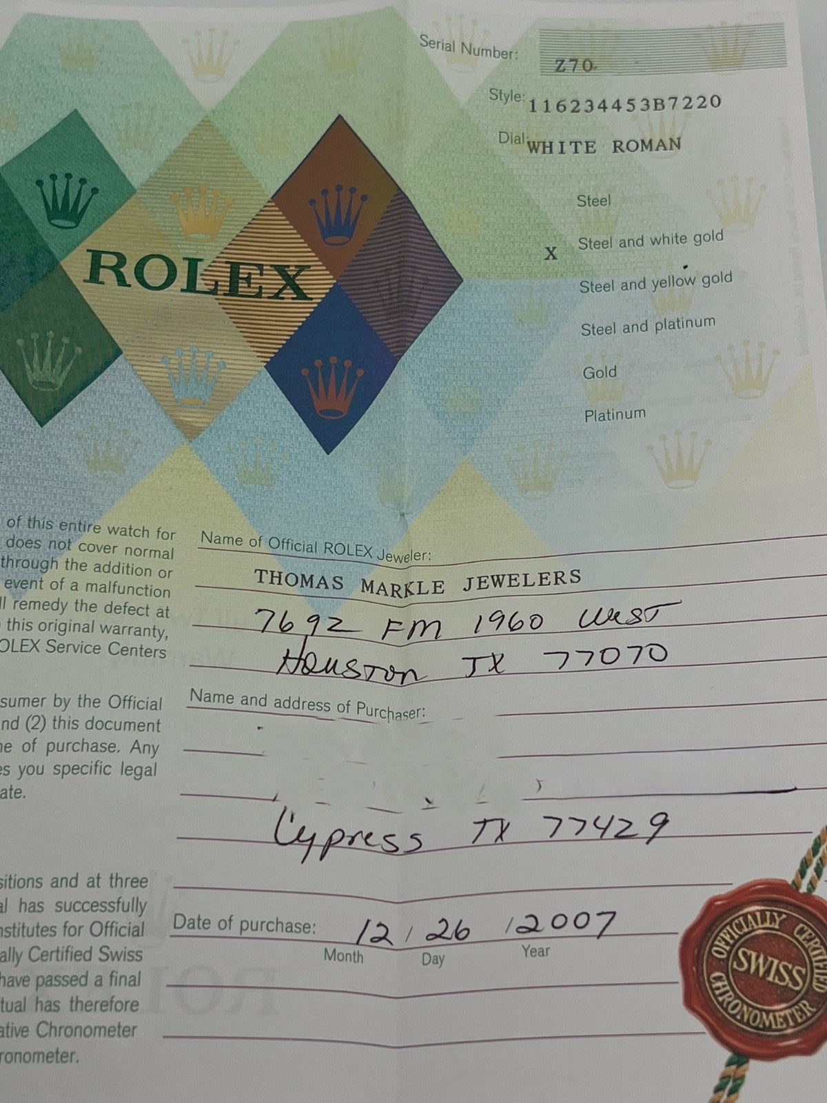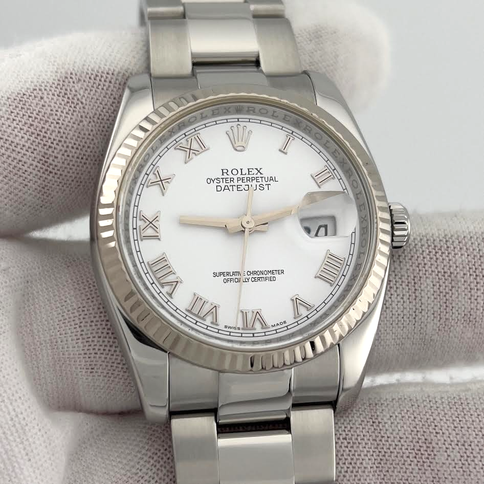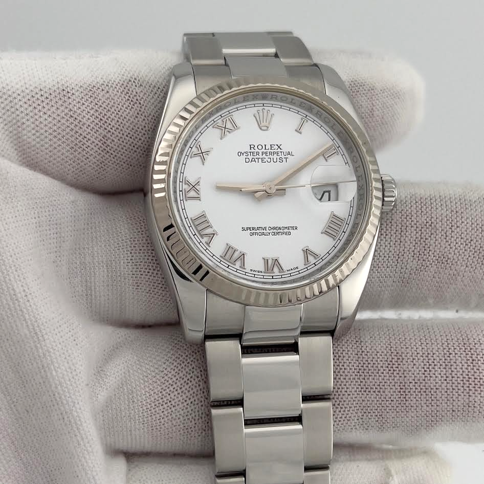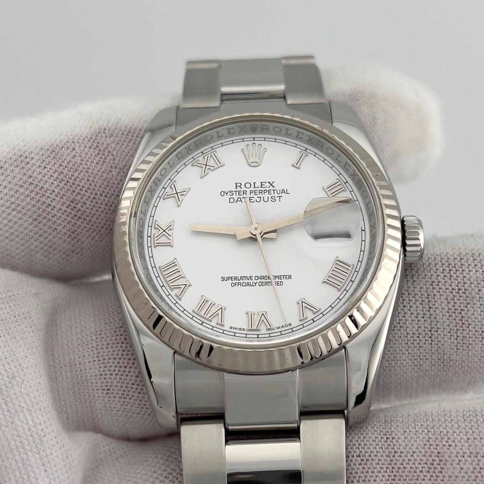 Rolex Datejust 116234 36mm White Roman Dial 18k Gold Stainless Steel Box Paper Rolex Sale! from 859500 /per This item is a recurring or deferred purchase. By continuing, I agree to the cancellation policy and authorize you to charge my payment method at the prices, frequency and dates listed on this page until my order is fulfilled or I cancel, if permitted. +1 (619) 232-1273 This item is currently on backorder but you can still purchase it now and we'll ship as soon as more become available. Style Number: 116234Serial: Z70****Year: 2007 Model: Rolex Datejust Case Material: Stainless Steel Band: Stainless Steel Bezel: 18k White Gold Fluted Dial: White Roman Numeral Dial Crystal: Sapphire Case Size: 36mm Includes: - Rolex Box & Paper- Certified Appraisal - 1 Year WarrantySKU 22266 / 114790TBJ032425