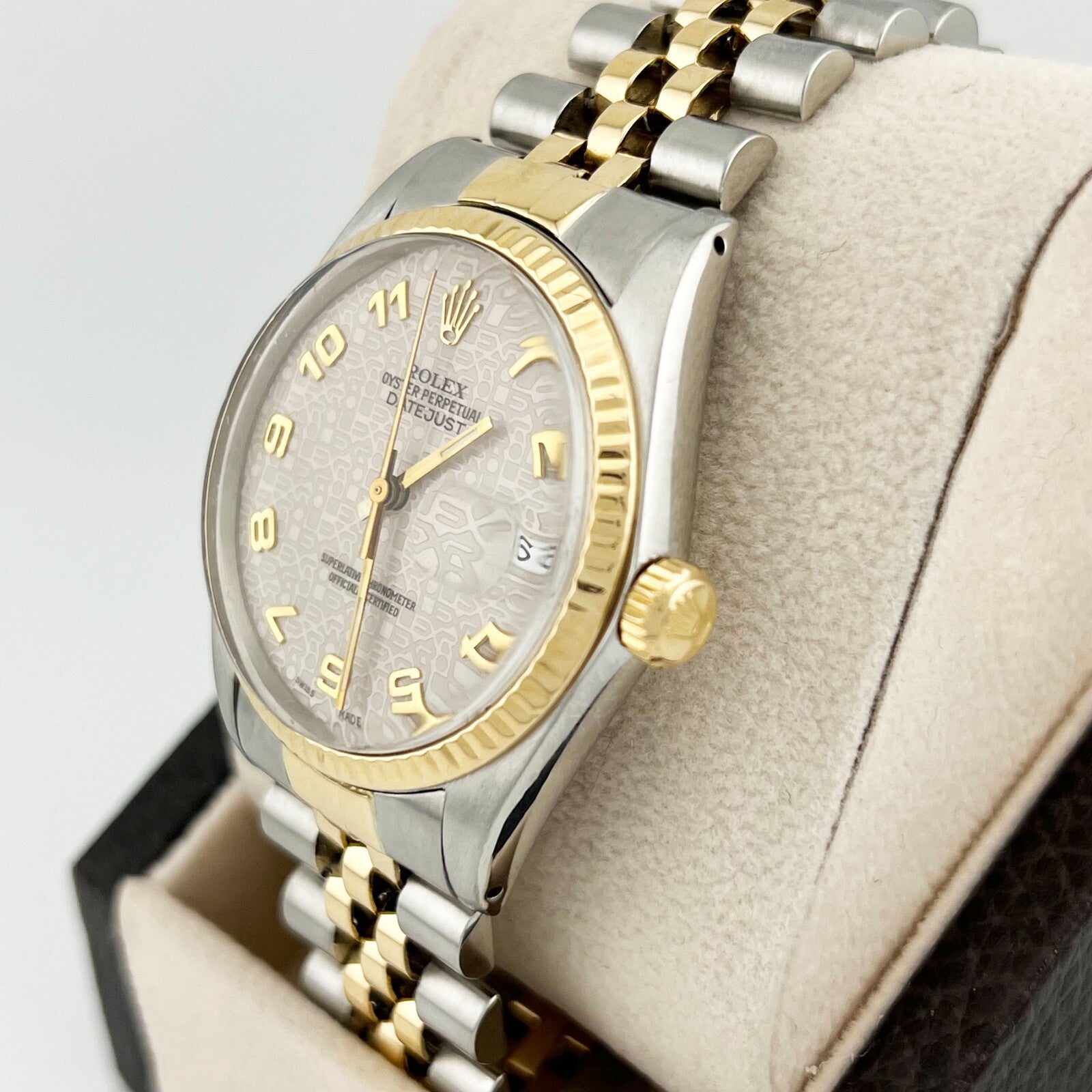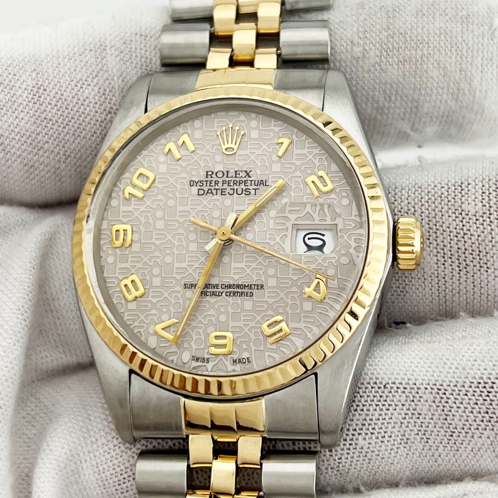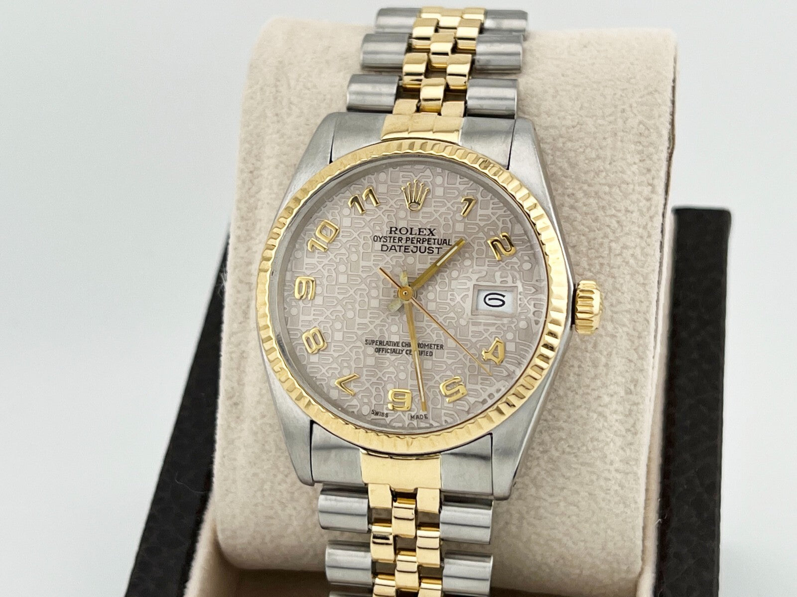 Rolex Datejust 16013 36mm Jubilee Arabic Dial 18K Yellow Gold Stainless Steel Rolex Sale! from 549500 /per This item is a recurring or deferred purchase. By continuing, I agree to the cancellation policy and authorize you to charge my payment method at the prices, frequency and dates listed on this page until my order is fulfilled or I cancel, if permitted. +1 (619) 232-1273 This item is currently on backorder but you can still purchase it now and we'll ship as soon as more become available. Style Number: 16013Serial: 8446***Year: 1984 Model: Rolex Datejust Case Material: Stainless Steel Band: 18K Yellow Gold & Stainless Steel Bezel: 18K Yellow Gold Fluted Bezel Dial: Jubilee Arabic Numeral Dial Face: Acrylic Case Size: 36mm Includes: -Elegant Watch Box-Certified Appraisal -1 Year WarrantySKU 21615 / 19330TOFC