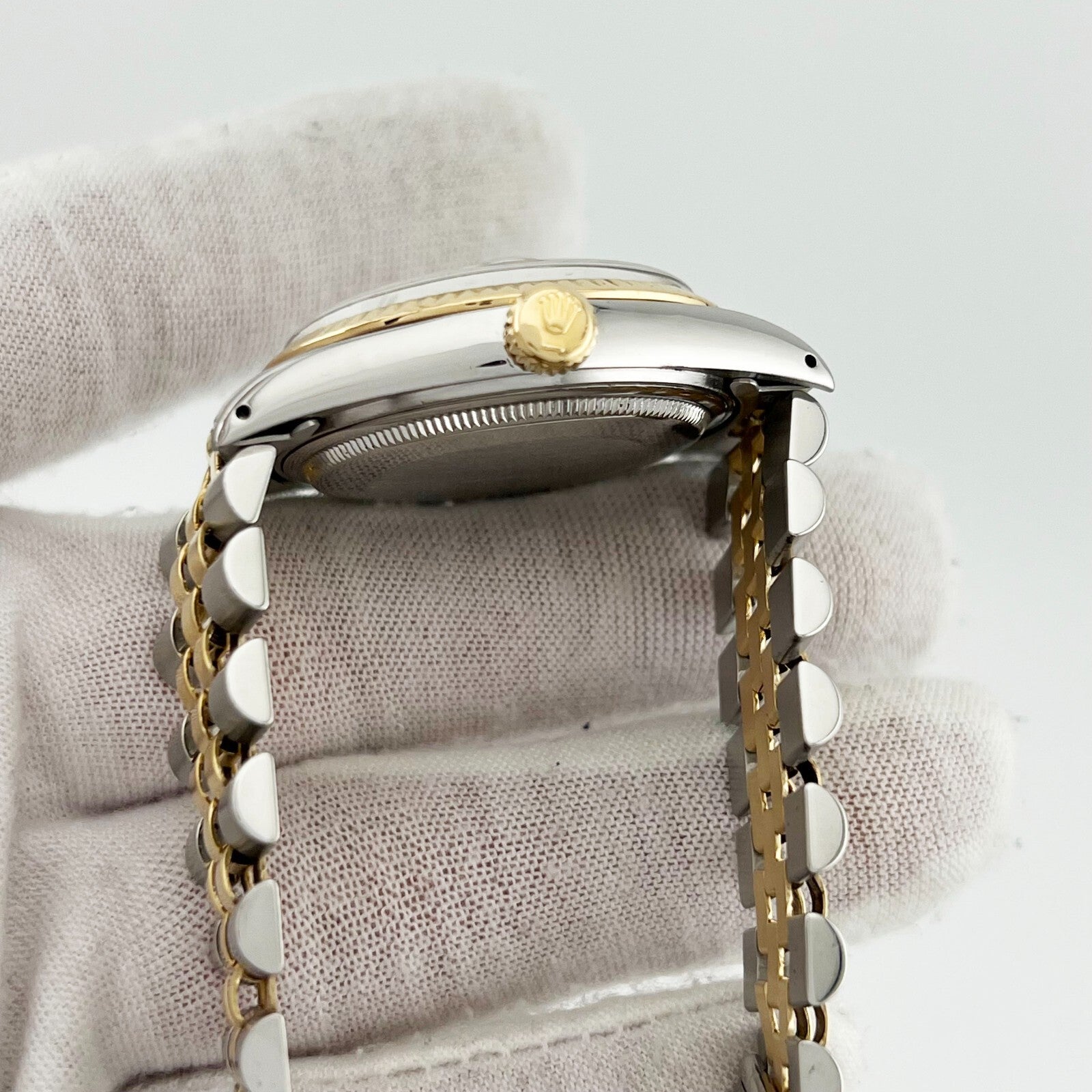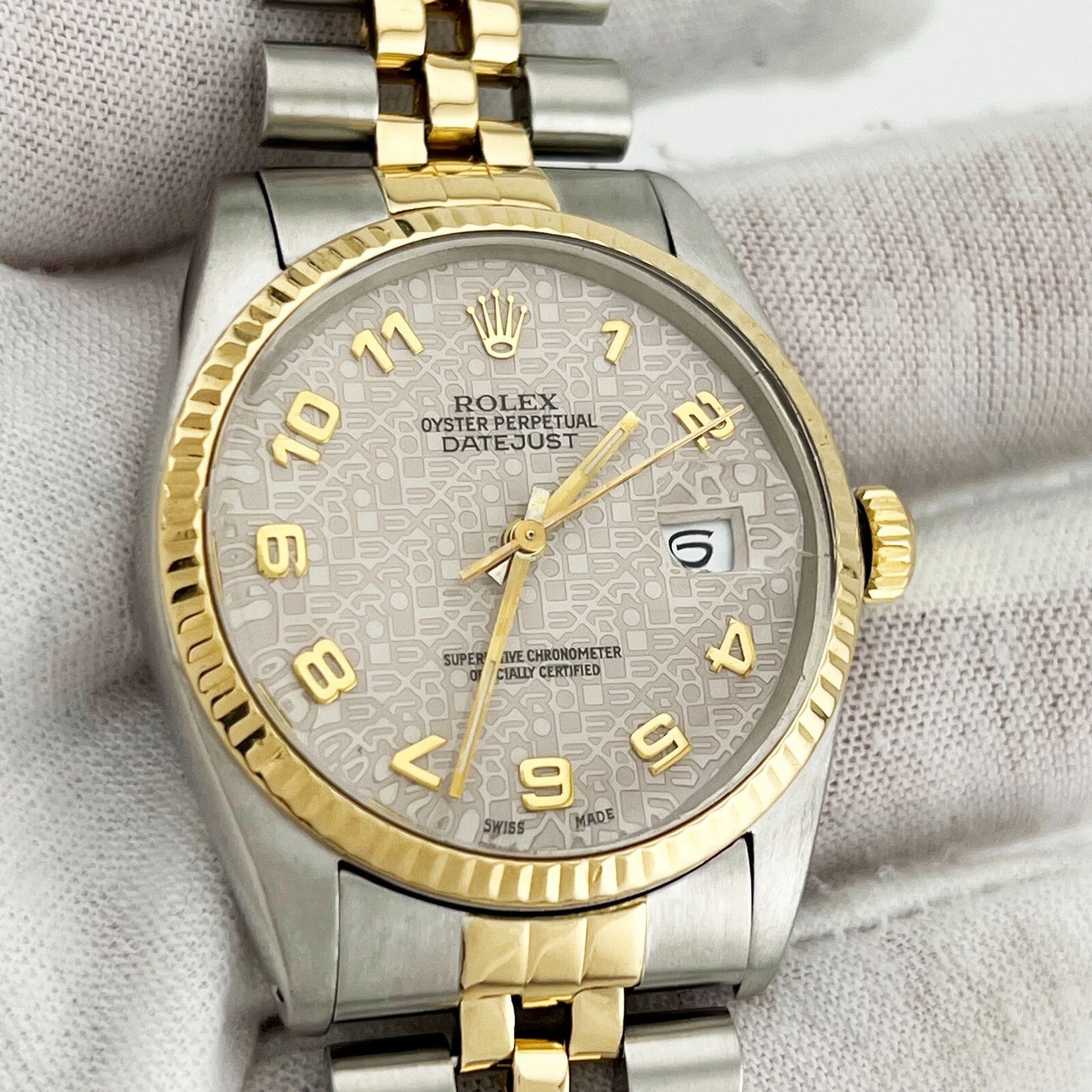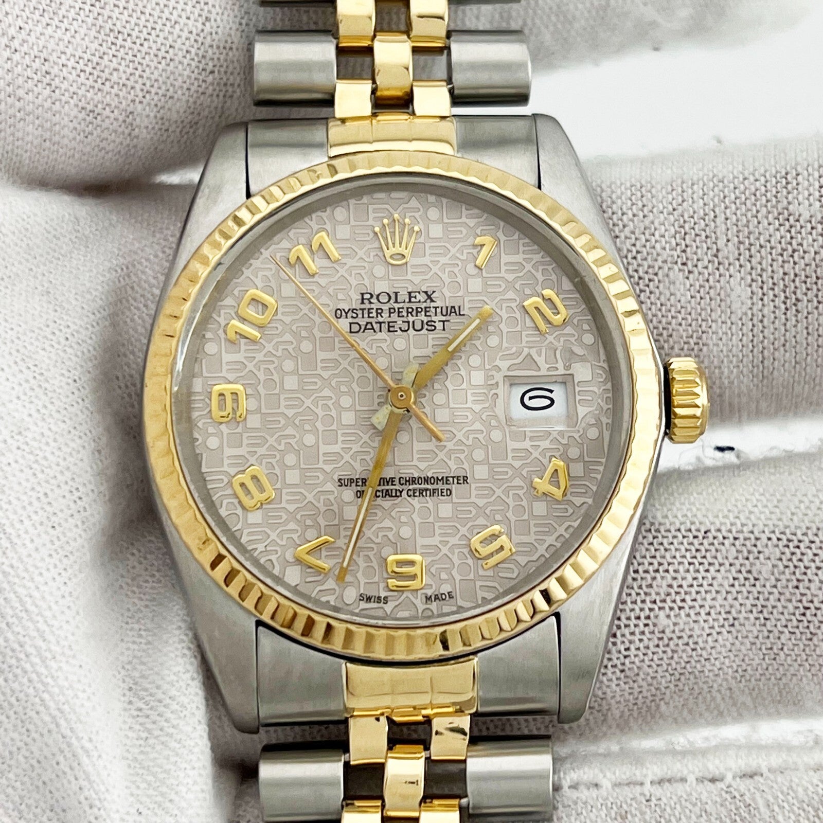 Rolex Datejust 16013 36mm Jubilee Arabic Dial 18K Yellow Gold Stainless Steel Rolex Sale! from 549500 /per This item is a recurring or deferred purchase. By continuing, I agree to the cancellation policy and authorize you to charge my payment method at the prices, frequency and dates listed on this page until my order is fulfilled or I cancel, if permitted. +1 (619) 232-1273 This item is currently on backorder but you can still purchase it now and we'll ship as soon as more become available. Style Number: 16013Serial: 8446***Year: 1984 Model: Rolex Datejust Case Material: Stainless Steel Band: 18K Yellow Gold & Stainless Steel Bezel: 18K Yellow Gold Fluted Bezel Dial: Jubilee Arabic Numeral Dial Face: Acrylic Case Size: 36mm Includes: -Elegant Watch Box-Certified Appraisal -1 Year WarrantySKU 21615 / 19330TOFC