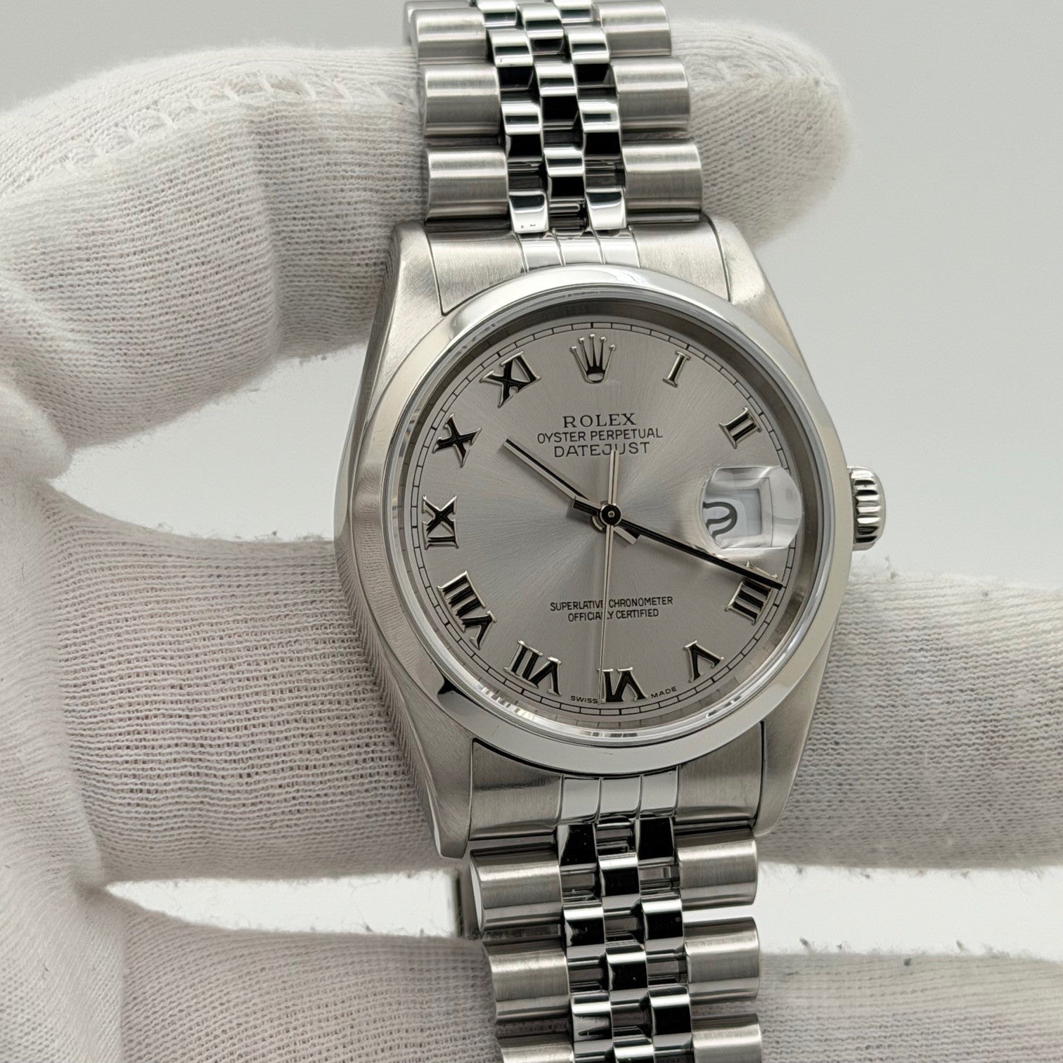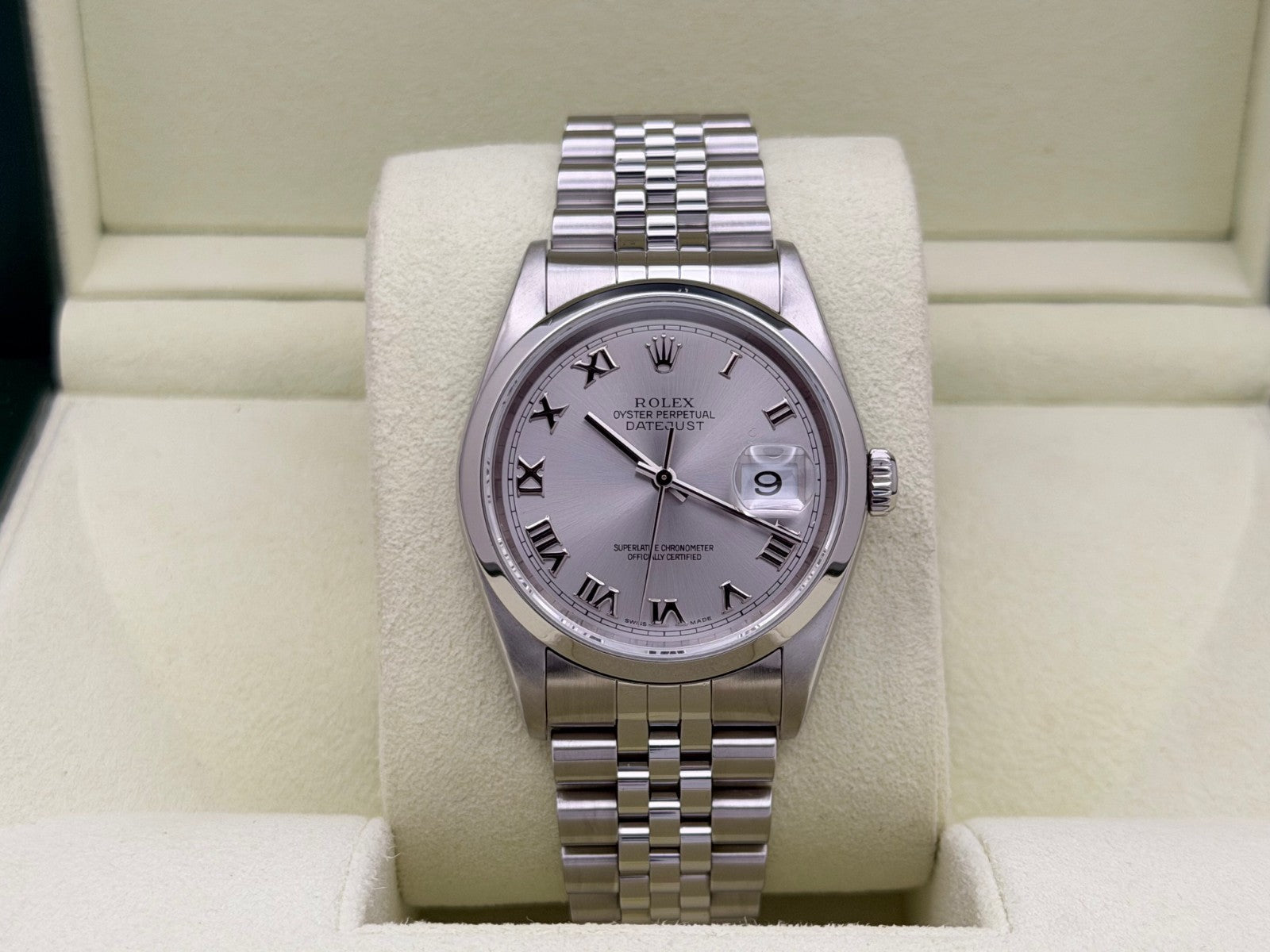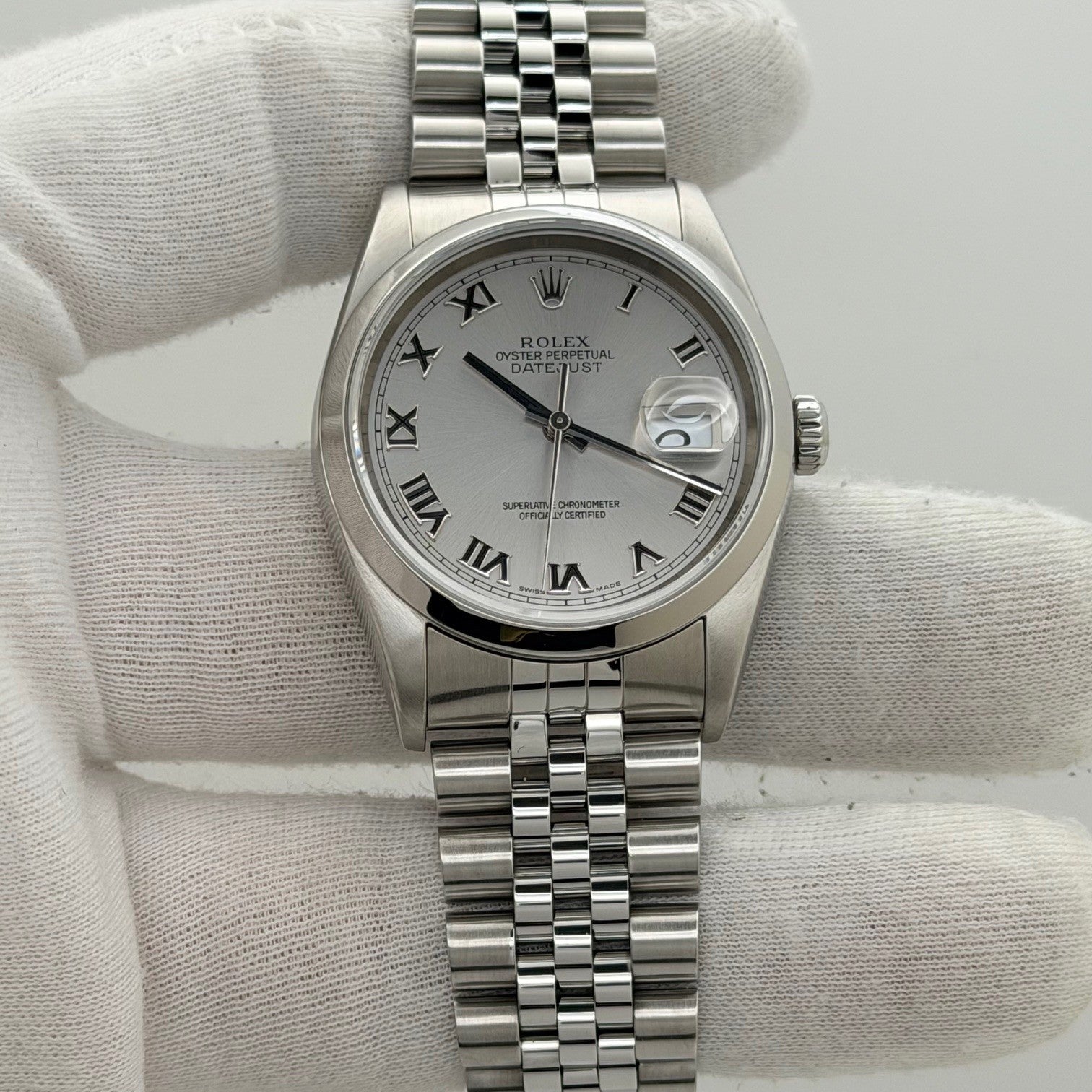 Rolex Datejust 16200 36mm Silver Roman Dial Stainless Steel Jubilee Rolex Sale! from 639500 /per This item is a recurring or deferred purchase. By continuing, I agree to the cancellation policy and authorize you to charge my payment method at the prices, frequency and dates listed on this page until my order is fulfilled or I cancel, if permitted. +1 (619) 232-1273 This item is currently on backorder but you can still purchase it now and we'll ship as soon as more become available. Style Number: 16200Serial: F81****Year: 2004 Model: Rolex Datejust Case Material: Stainless Steel Band: Stainless Steel Jubilee Bezel: Stainless Steel Dial: Silver Roman Numeral Dial Crystal: Sapphire Case Size: 36mm Includes: - Rolex Box - Certified Appraisal - 1 Year WarrantySKU 23446 / 19789TGC120325