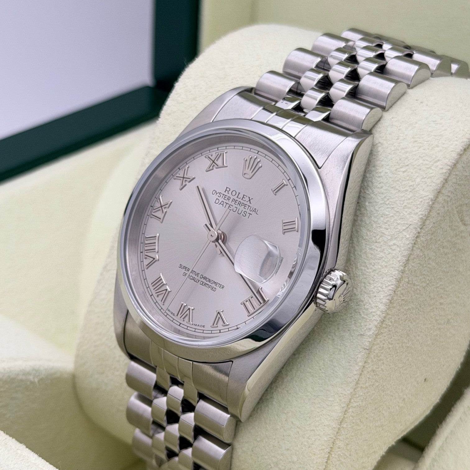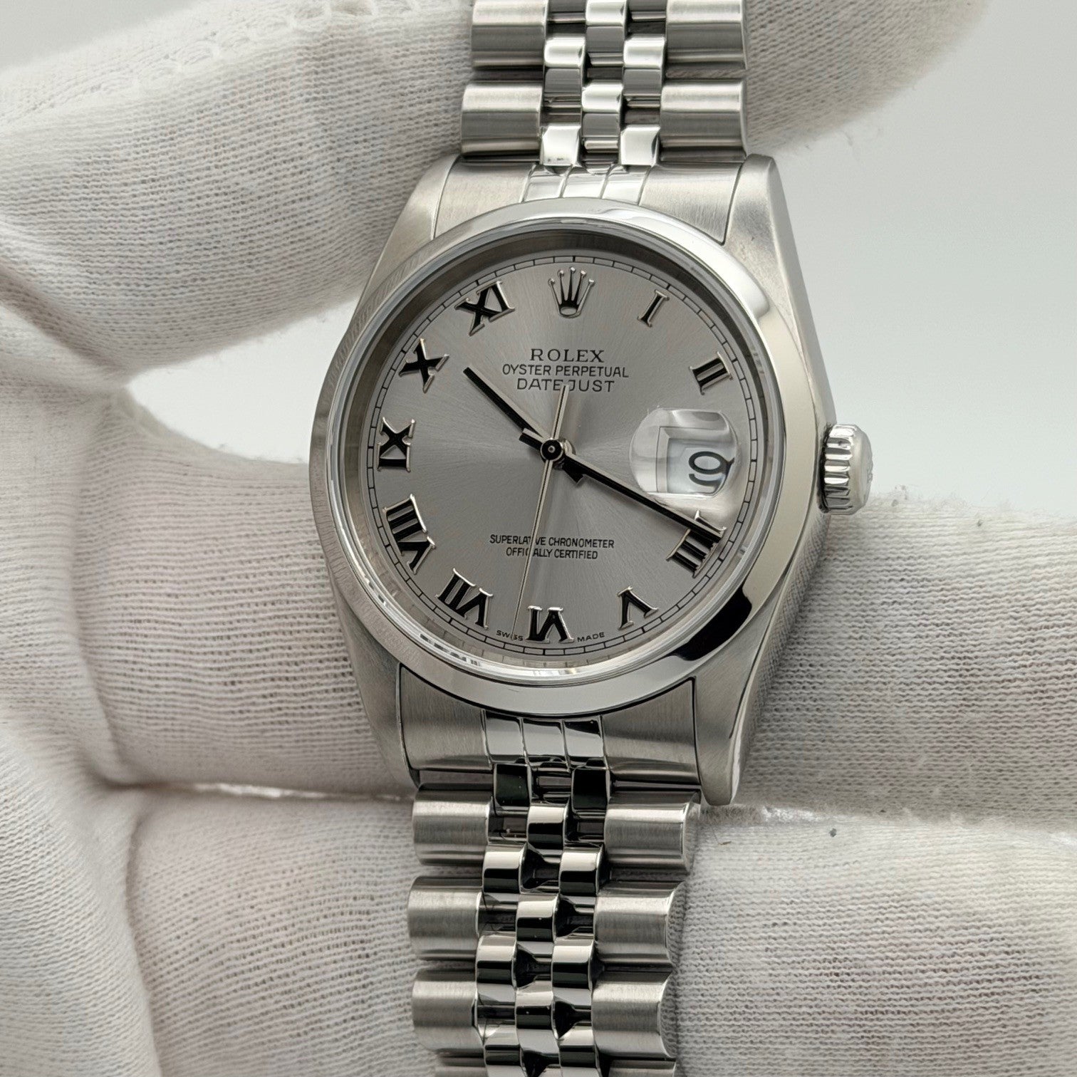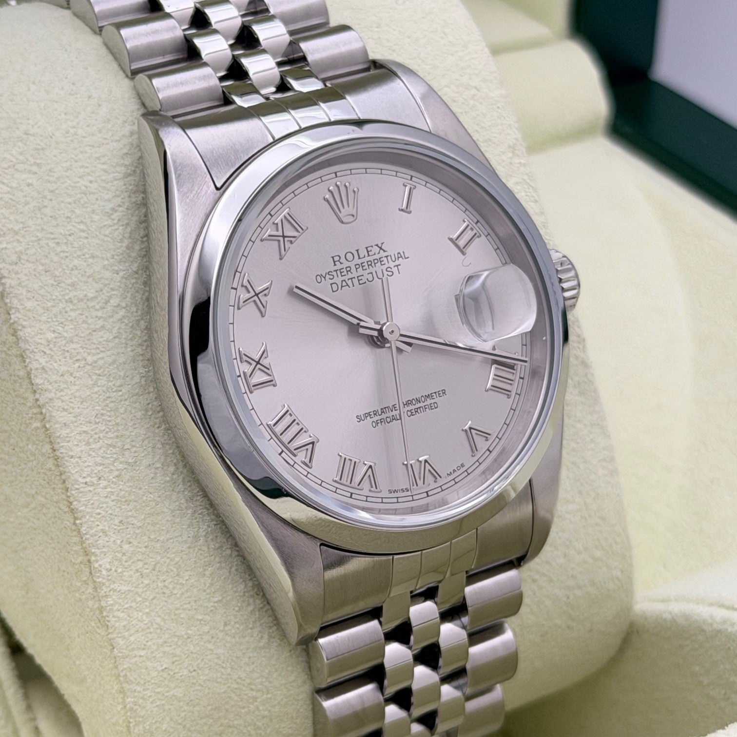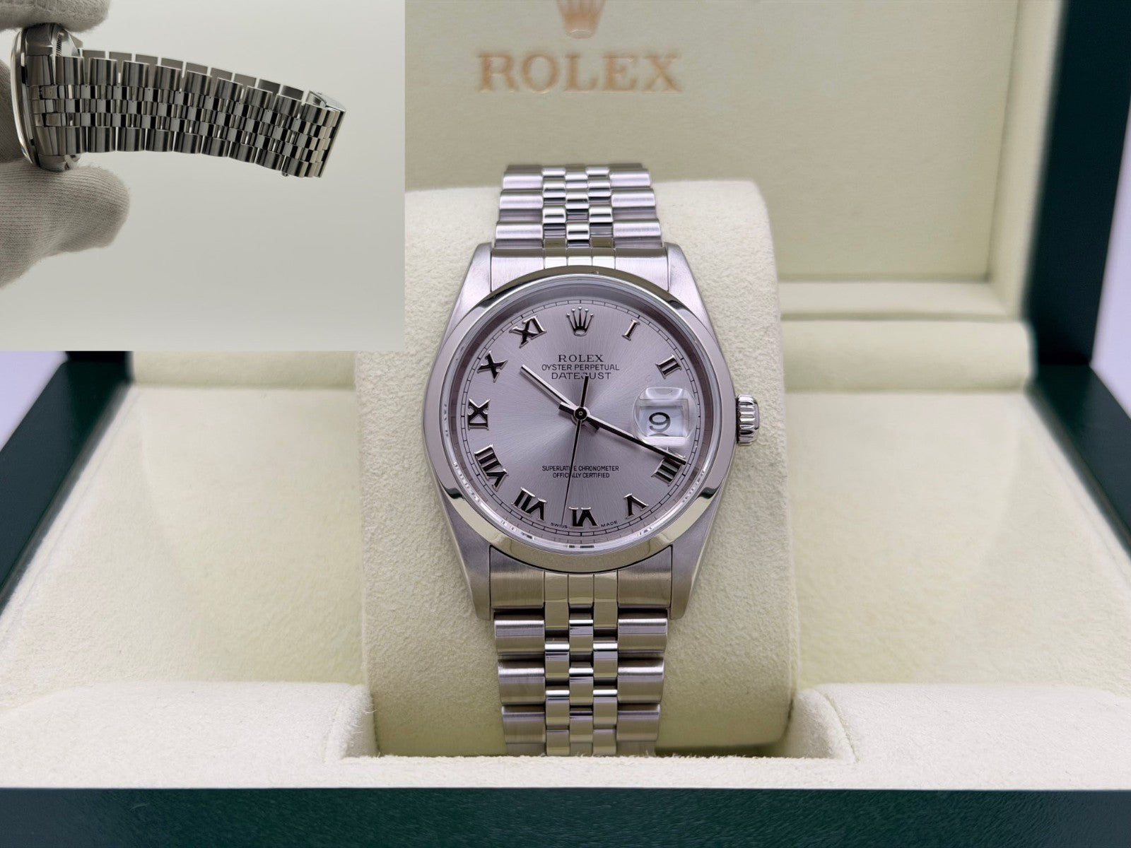 Rolex Datejust 16200 36mm Silver Roman Dial Stainless Steel Jubilee Rolex Sale! from 639500 /per This item is a recurring or deferred purchase. By continuing, I agree to the cancellation policy and authorize you to charge my payment method at the prices, frequency and dates listed on this page until my order is fulfilled or I cancel, if permitted. +1 (619) 232-1273 This item is currently on backorder but you can still purchase it now and we'll ship as soon as more become available. Style Number: 16200Serial: F81****Year: 2004 Model: Rolex Datejust Case Material: Stainless Steel Band: Stainless Steel Jubilee Bezel: Stainless Steel Dial: Silver Roman Numeral Dial Crystal: Sapphire Case Size: 36mm Includes: - Rolex Box - Certified Appraisal - 1 Year WarrantySKU 23446 / 19789TGC120325