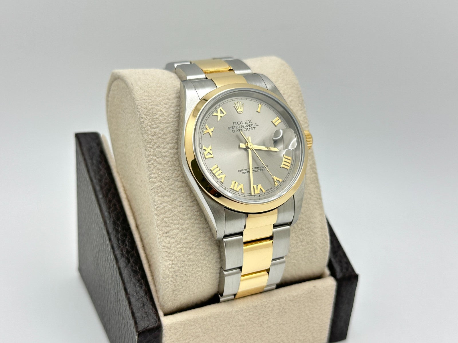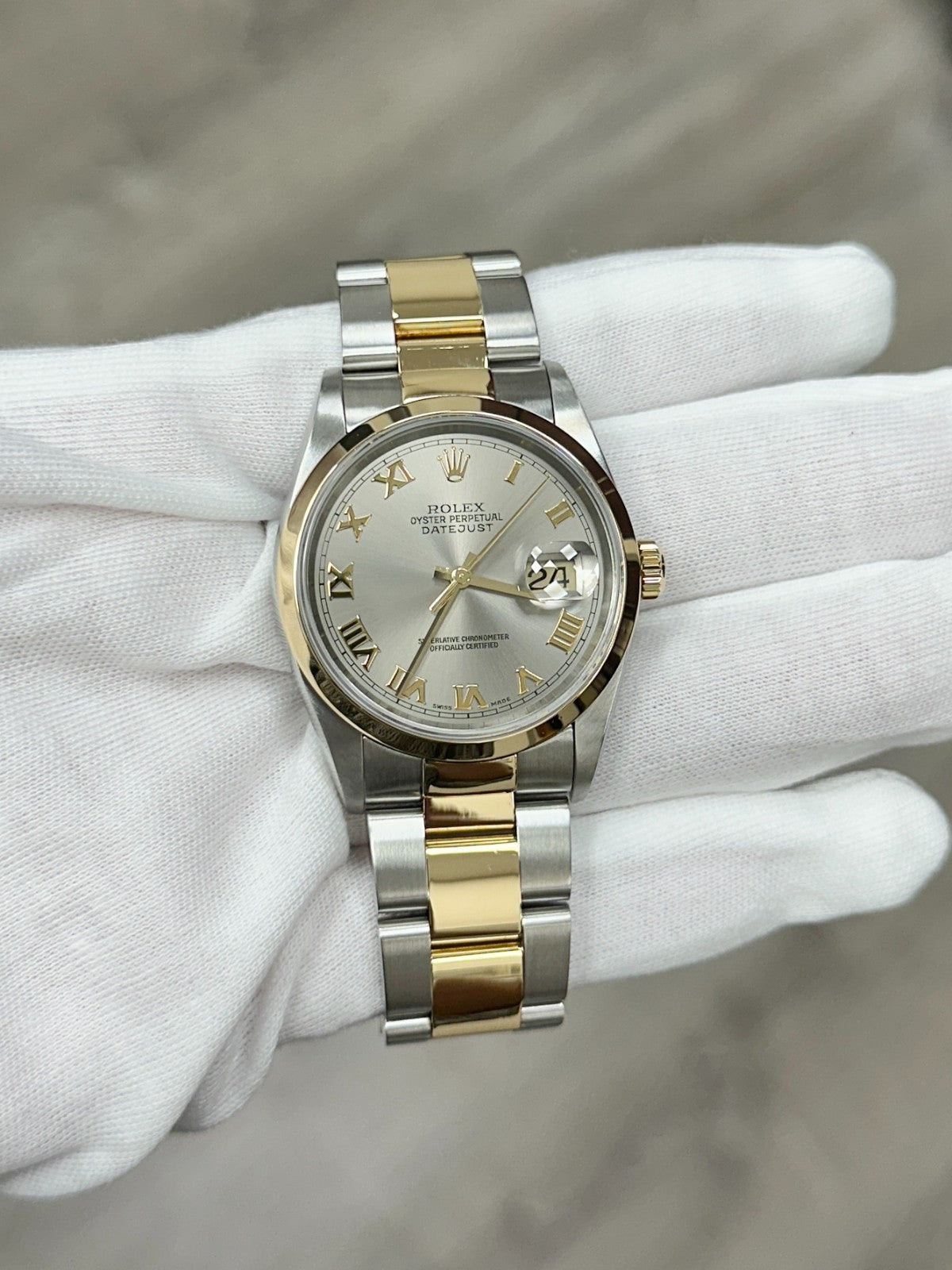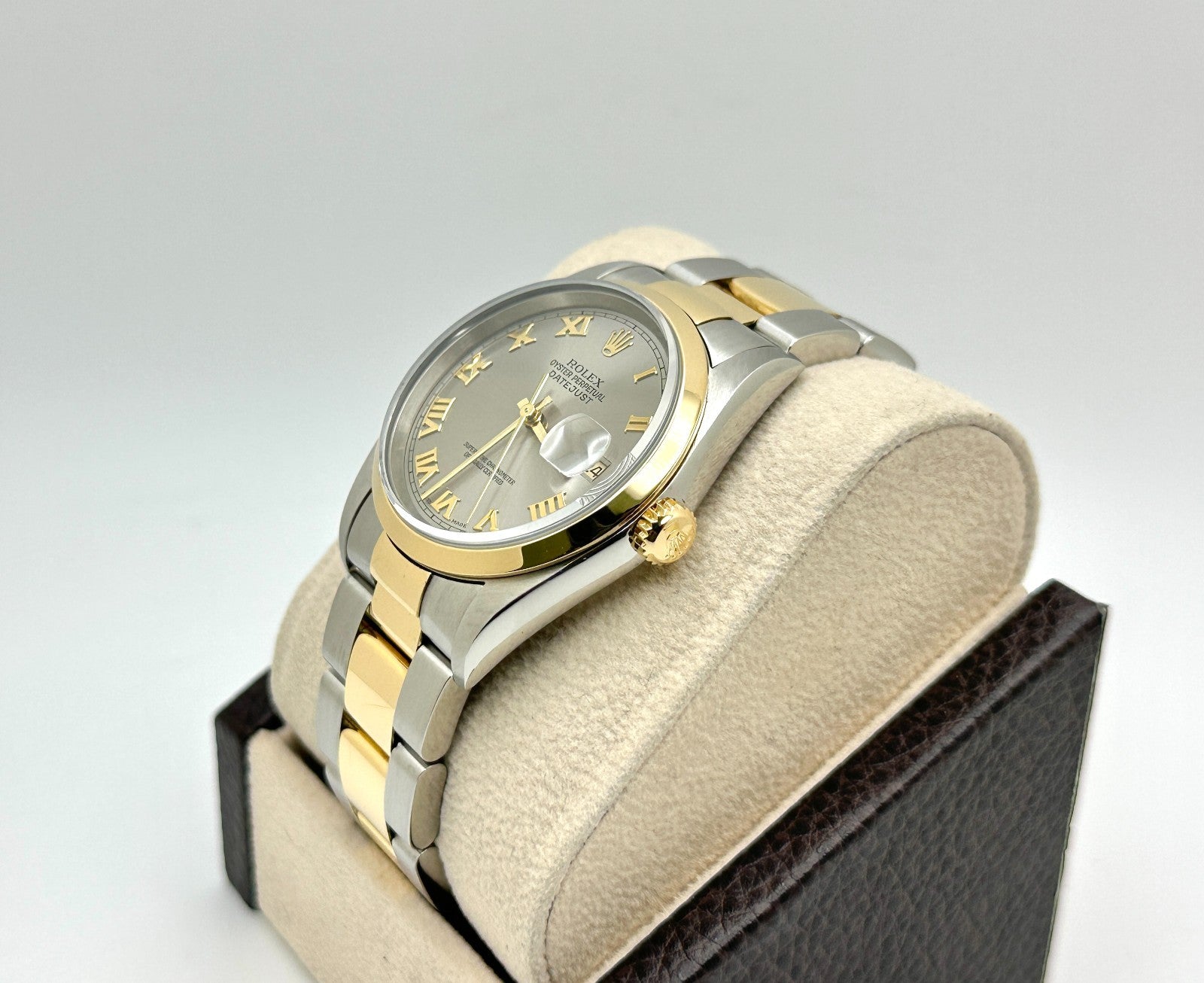 Rolex Datejust 16203 36mm Slate Roman Dial Stainless Steel 18K Yellow Gold 2004 Rolex Sale! from 839500 /per This item is a recurring or deferred purchase. By continuing, I agree to the cancellation policy and authorize you to charge my payment method at the prices, frequency and dates listed on this page until my order is fulfilled or I cancel, if permitted. +1 (619) 232-1273 This item is currently on backorder but you can still purchase it now and we'll ship as soon as more become available. Style Number: 16203Serial: Y920***Year: 2004 Model: Rolex Datejust Case Material: Stainless SteelBand: 18K Yellow Gold & Stainless Steel Bezel: 18K Yellow Gold Dial: Steel Slate Gray Roman Dial Crystal: Sapphire Crystal Case Size: 36mm Includes: - Rolex Box & Paper- Certified Appraisal - One Year WarrantySKU 23509 / 114940TGC122225