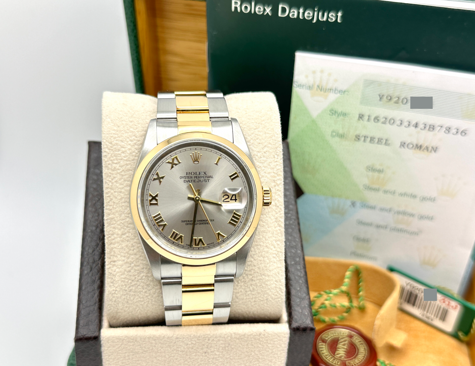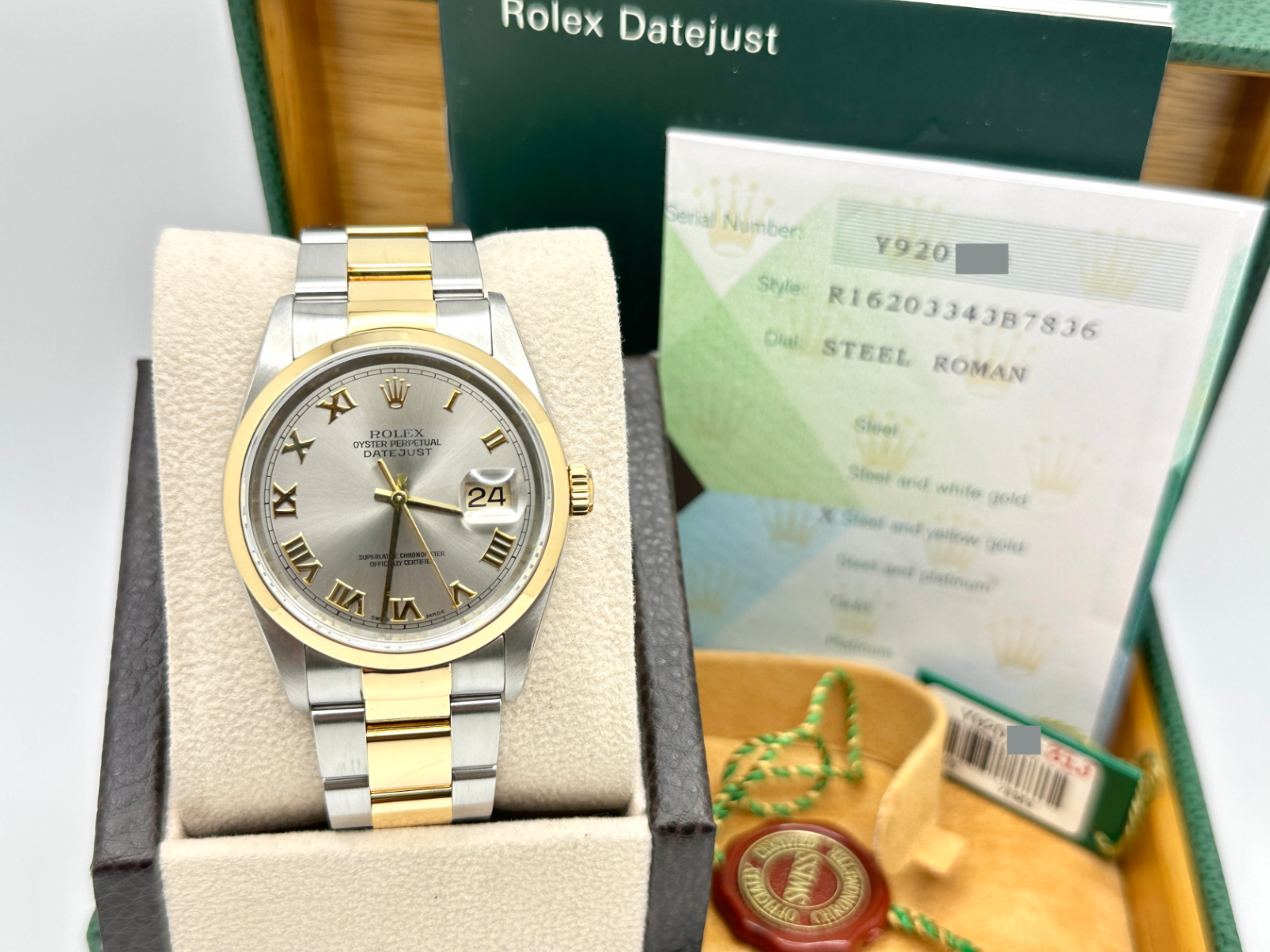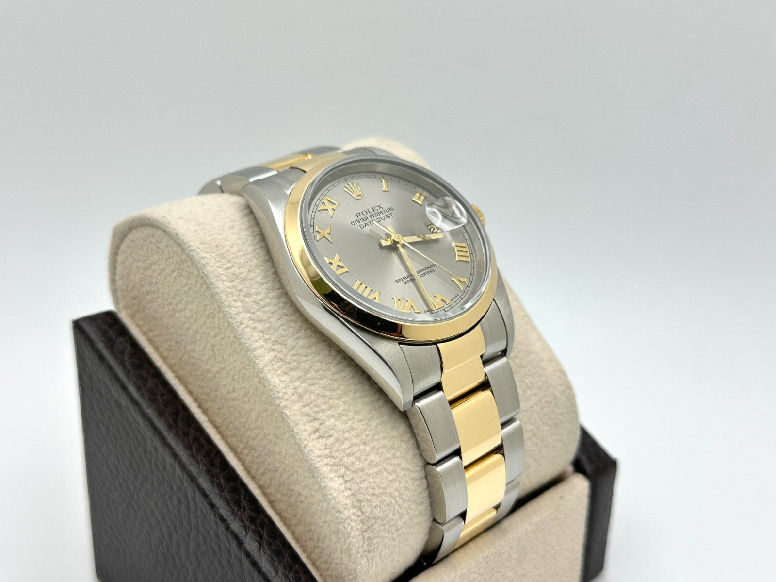 Rolex Datejust 16203 36mm Slate Roman Dial Stainless Steel 18K Yellow Gold 2004 Rolex Sale! from 839500 /per This item is a recurring or deferred purchase. By continuing, I agree to the cancellation policy and authorize you to charge my payment method at the prices, frequency and dates listed on this page until my order is fulfilled or I cancel, if permitted. +1 (619) 232-1273 This item is currently on backorder but you can still purchase it now and we'll ship as soon as more become available. Style Number: 16203Serial: Y920***Year: 2004 Model: Rolex Datejust Case Material: Stainless SteelBand: 18K Yellow Gold & Stainless Steel Bezel: 18K Yellow Gold Dial: Steel Slate Gray Roman Dial Crystal: Sapphire Crystal Case Size: 36mm Includes: - Rolex Box & Paper- Certified Appraisal - One Year WarrantySKU 23509 / 114940TGC122225