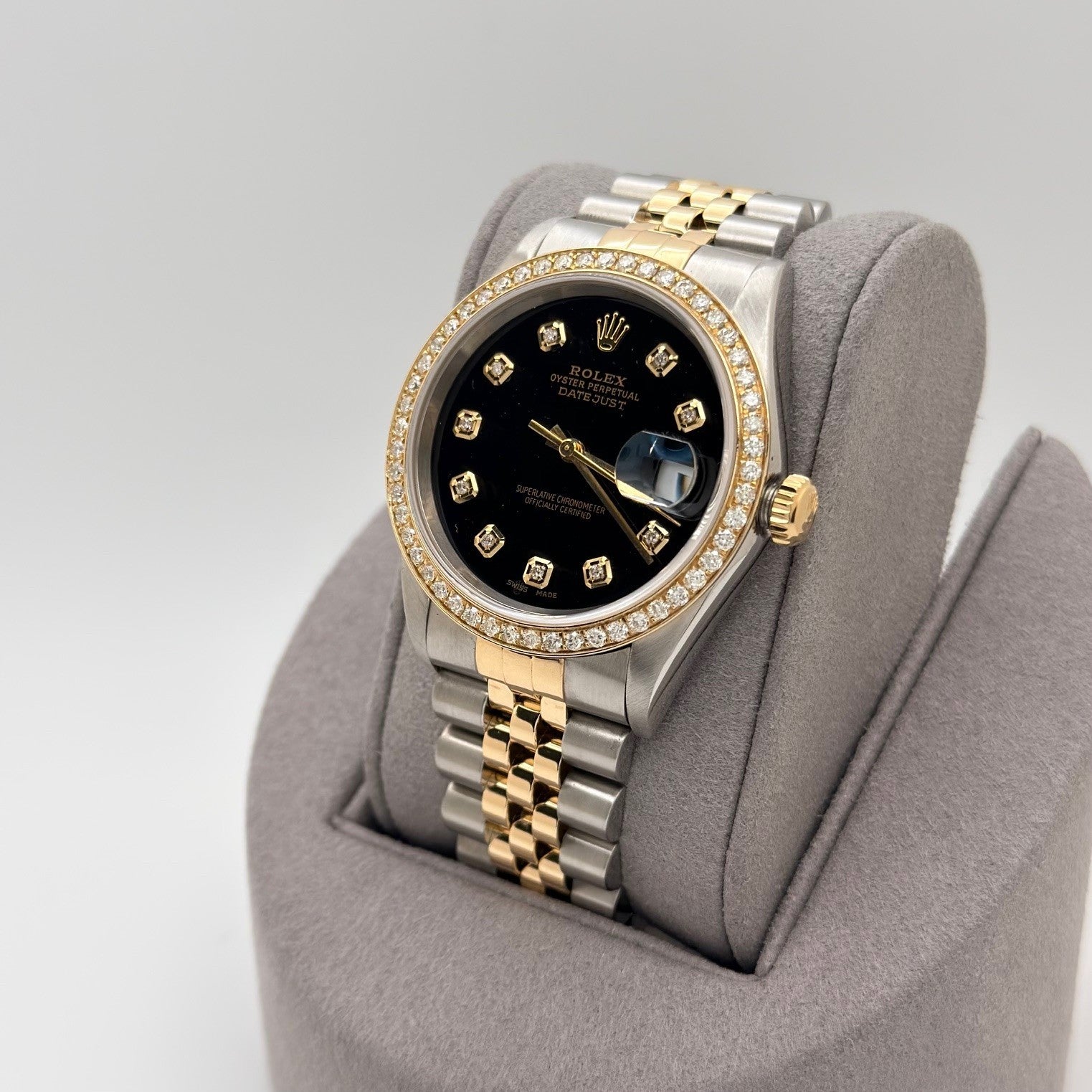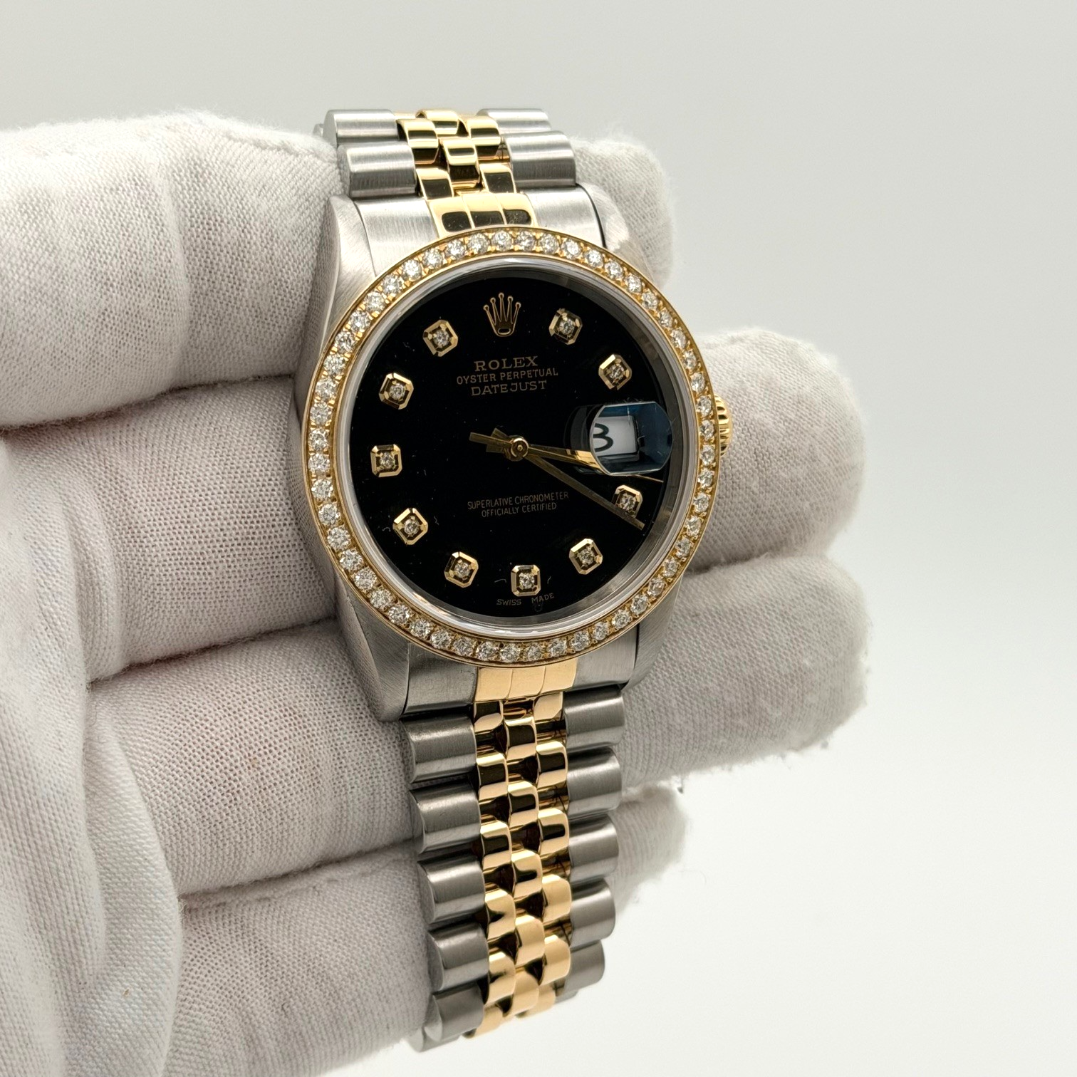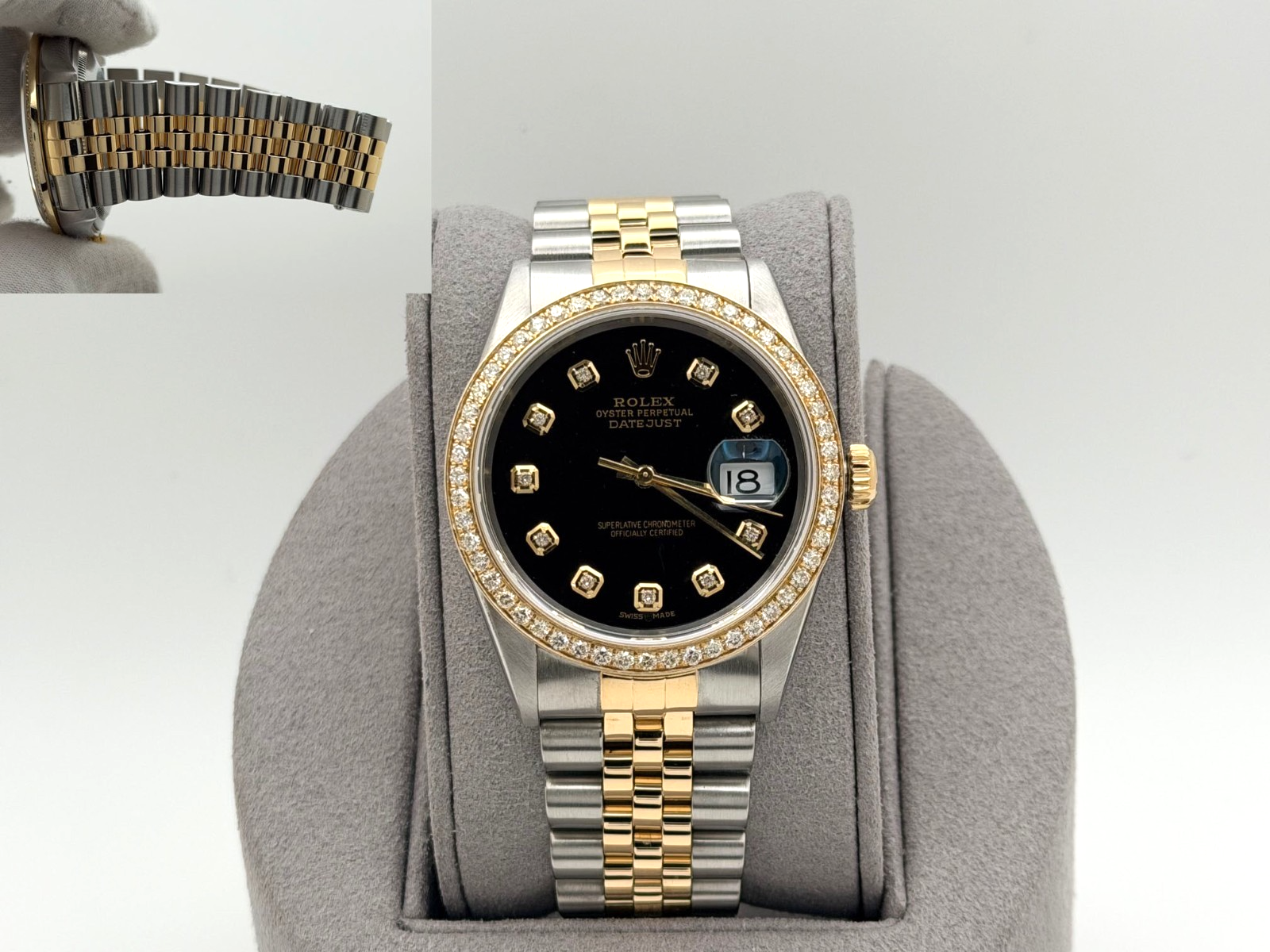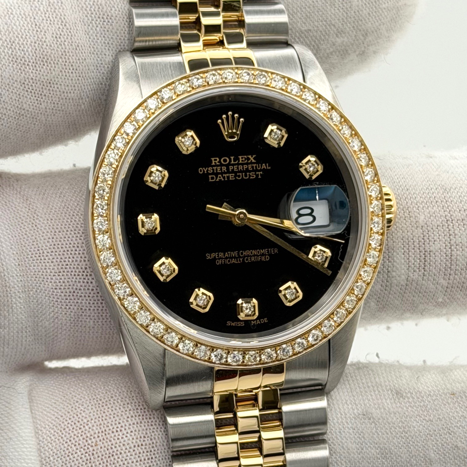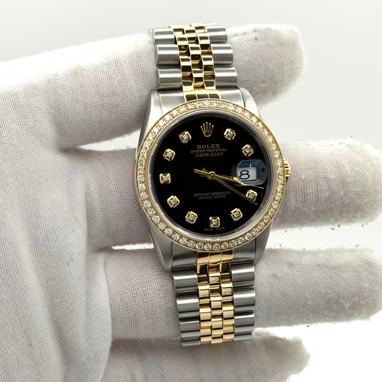 Rolex Datejust 16233 36mm Black Diamond Dial Diamond Bezel 18k Gold Steel Rolex Sale! from 749500 /per This item is a recurring or deferred purchase. By continuing, I agree to the cancellation policy and authorize you to charge my payment method at the prices, frequency and dates listed on this page until my order is fulfilled or I cancel, if permitted. +1 (619) 232-1273 This item is currently on backorder but you can still purchase it now and we'll ship as soon as more become available. Style Number: 16233Serial: Y56****Year: 2002 Model: Rolex Datejust Case Material: Stainless Steel Band: 18k Yellow Gold & Stainless Steel Jubilee Bezel: Custom Diamond Bezel Dial: Custom Diamond Dial Crystal: Sapphire Case Size: 36mm Includes: - Elegant Watch Box- Certified Appraisal - One Year WarrantySKU 23060 / 115090TJD091525