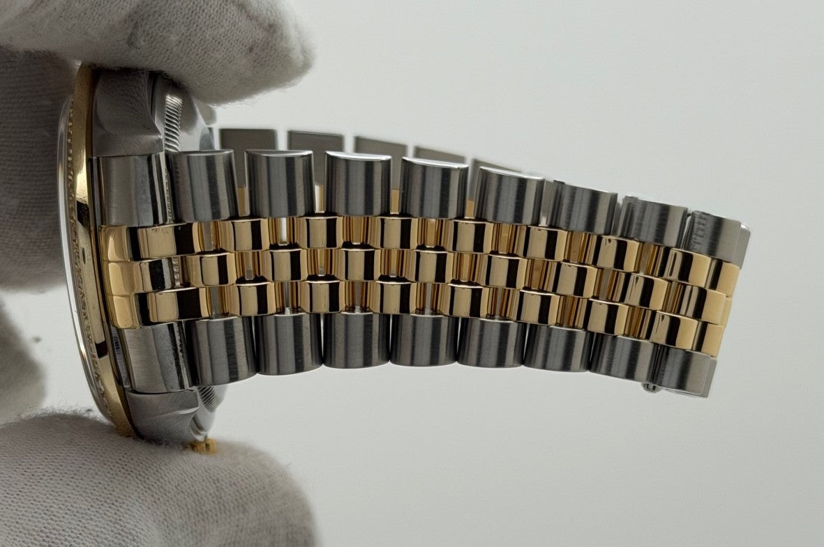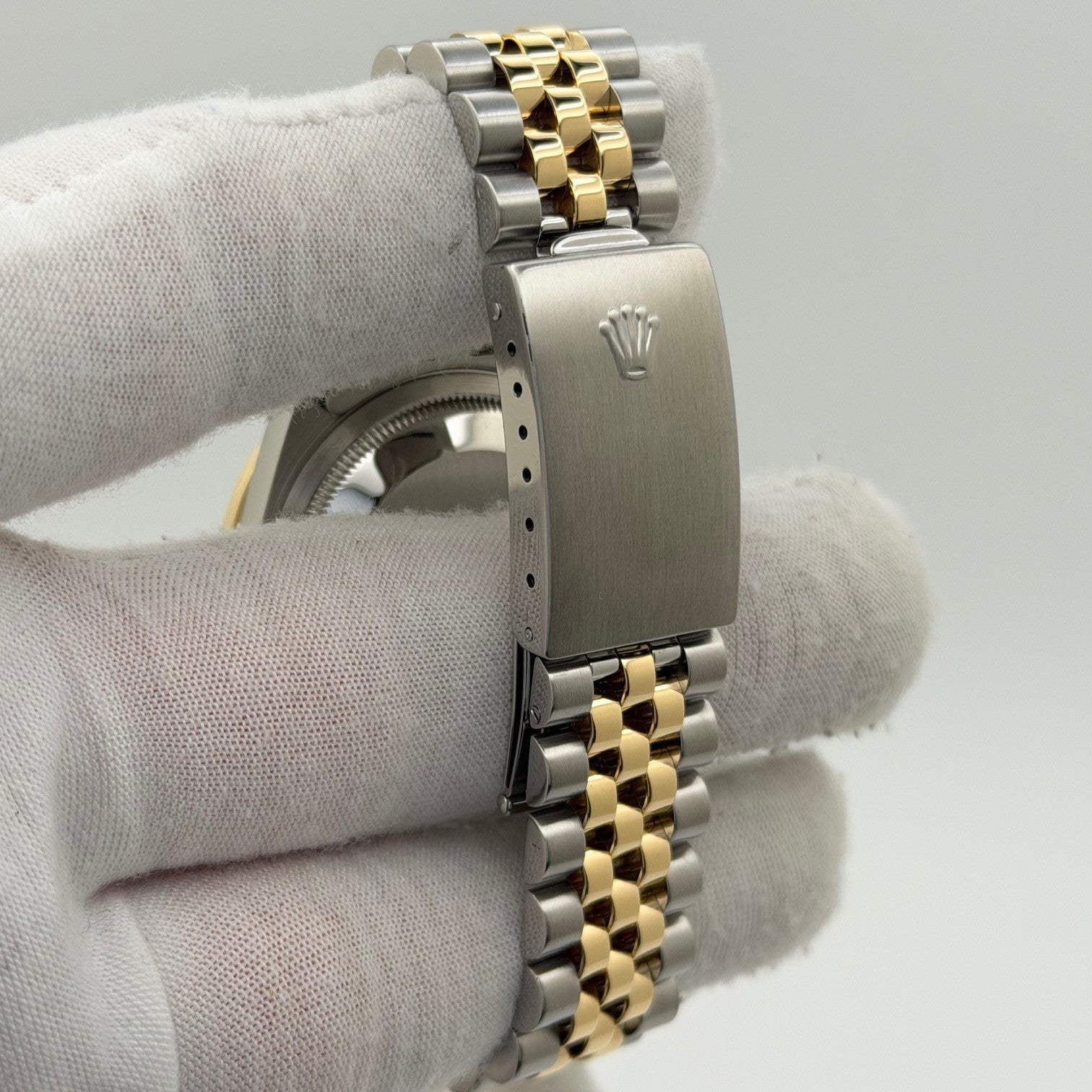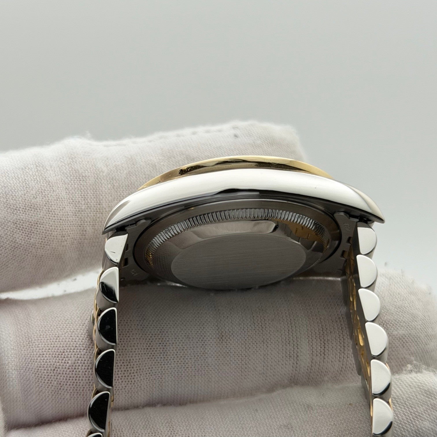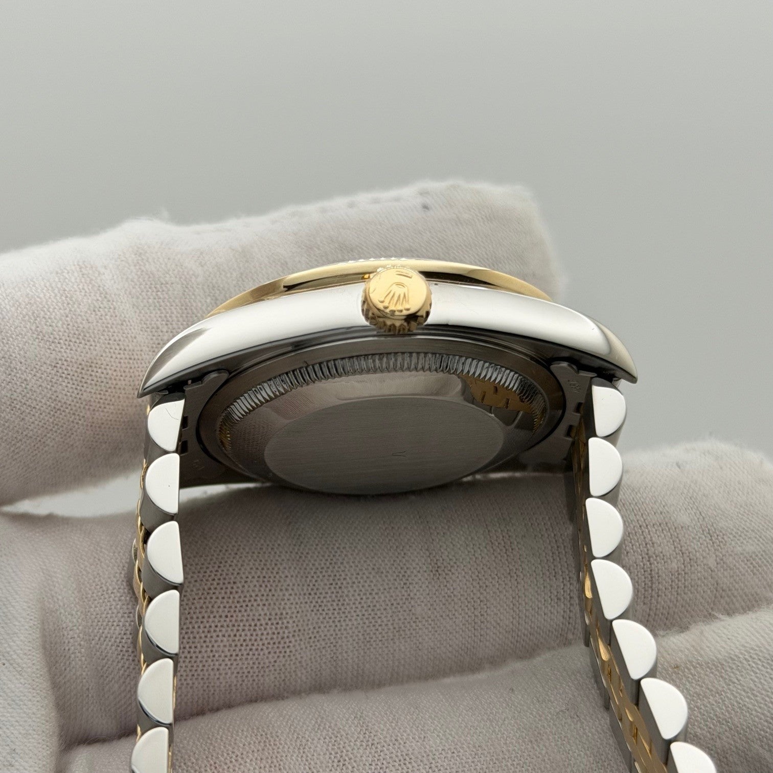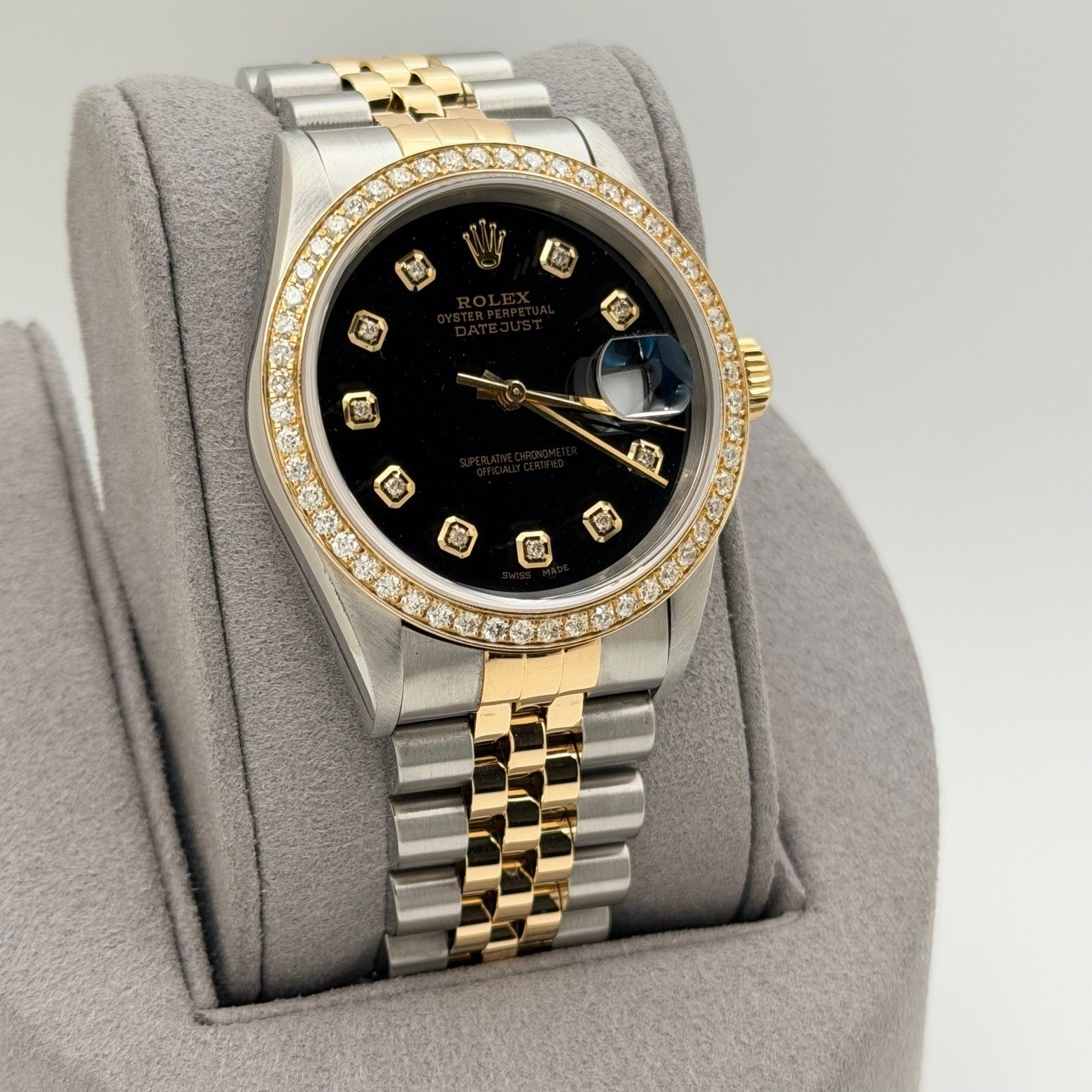 Rolex Datejust 16233 36mm Black Diamond Dial Diamond Bezel 18k Gold Steel Rolex Sale! from 749500 /per This item is a recurring or deferred purchase. By continuing, I agree to the cancellation policy and authorize you to charge my payment method at the prices, frequency and dates listed on this page until my order is fulfilled or I cancel, if permitted. +1 (619) 232-1273 This item is currently on backorder but you can still purchase it now and we'll ship as soon as more become available. Style Number: 16233Serial: Y56****Year: 2002 Model: Rolex Datejust Case Material: Stainless Steel Band: 18k Yellow Gold & Stainless Steel Jubilee Bezel: Custom Diamond Bezel Dial: Custom Diamond Dial Crystal: Sapphire Case Size: 36mm Includes: - Elegant Watch Box- Certified Appraisal - One Year WarrantySKU 23060 / 115090TJD091525