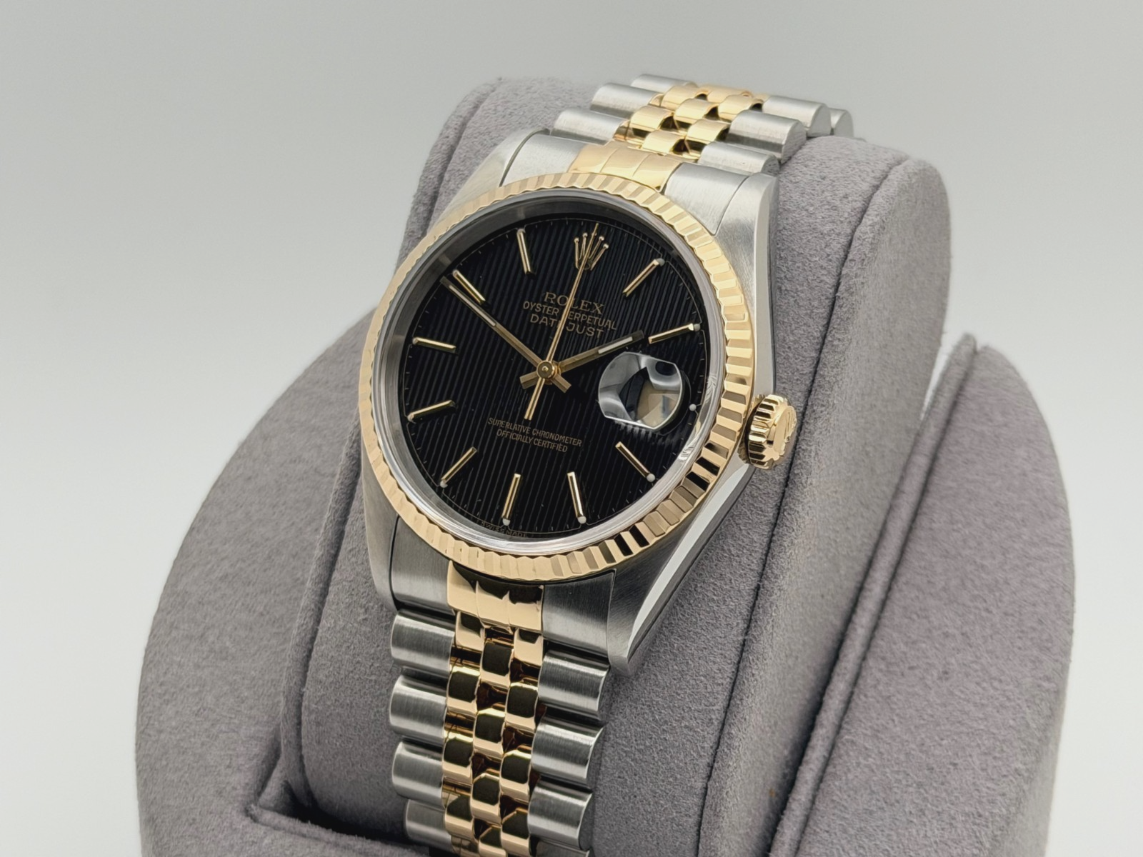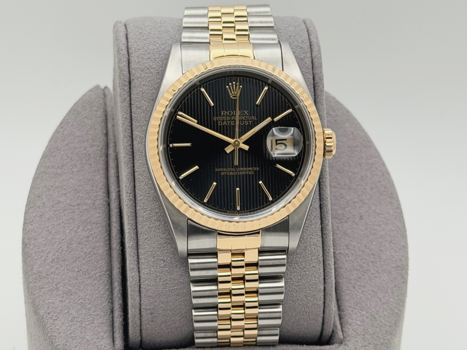 Rolex Datejust 16233 36mm Black Tapestry Dial 18k Yellow Gold Stainless Steel