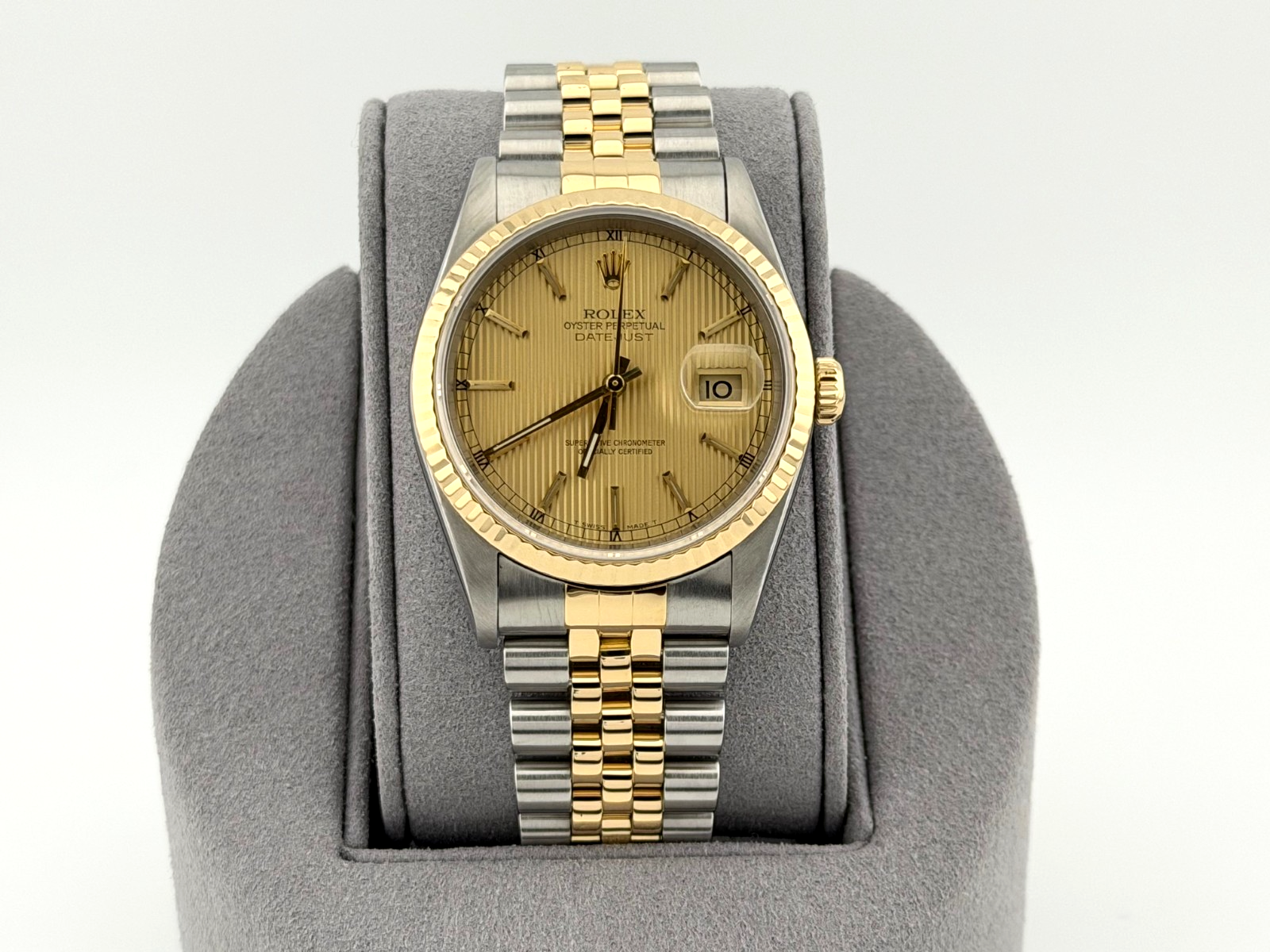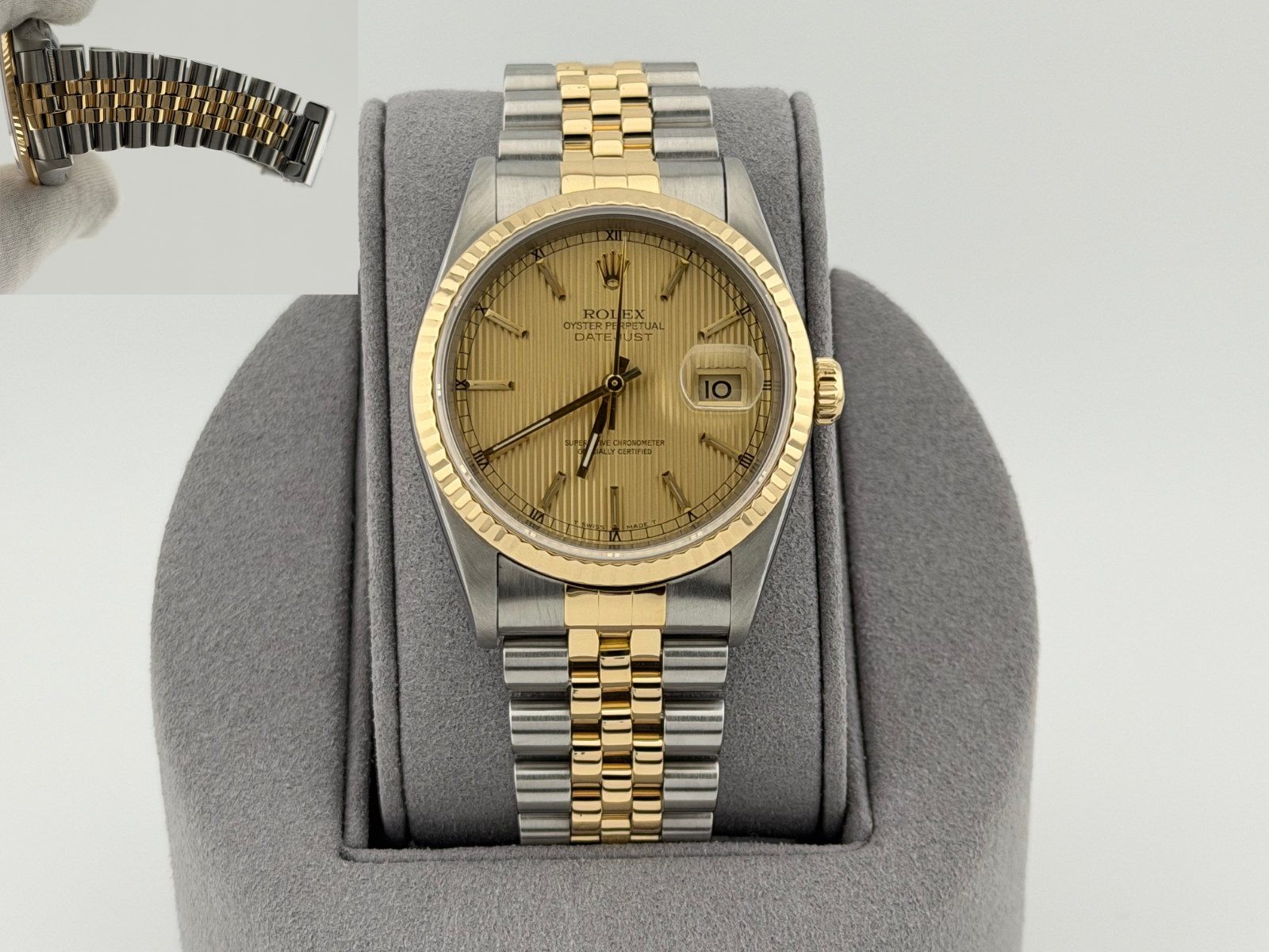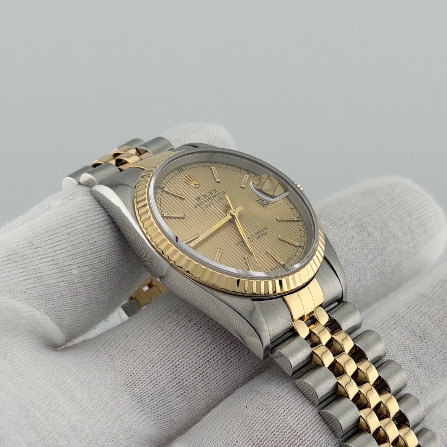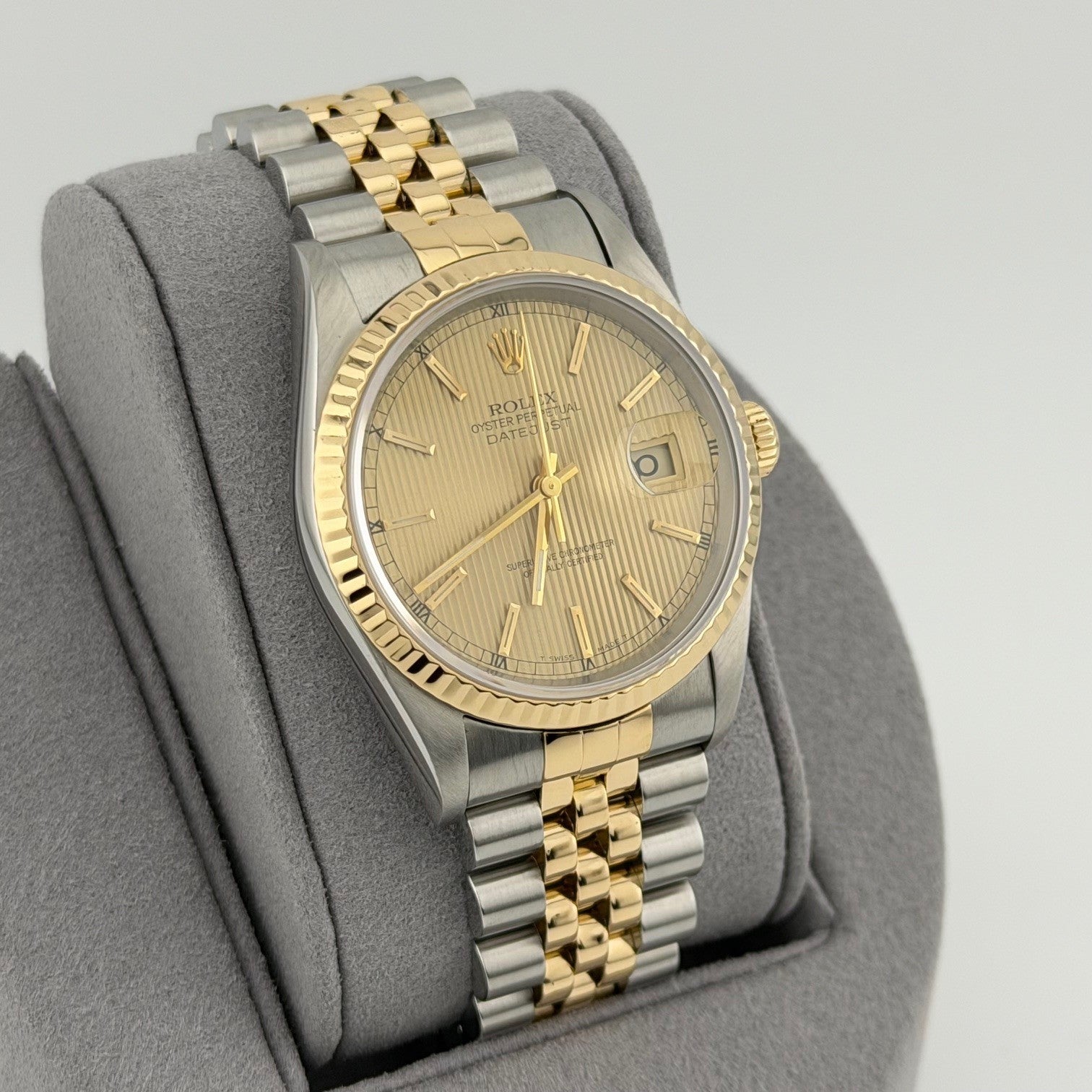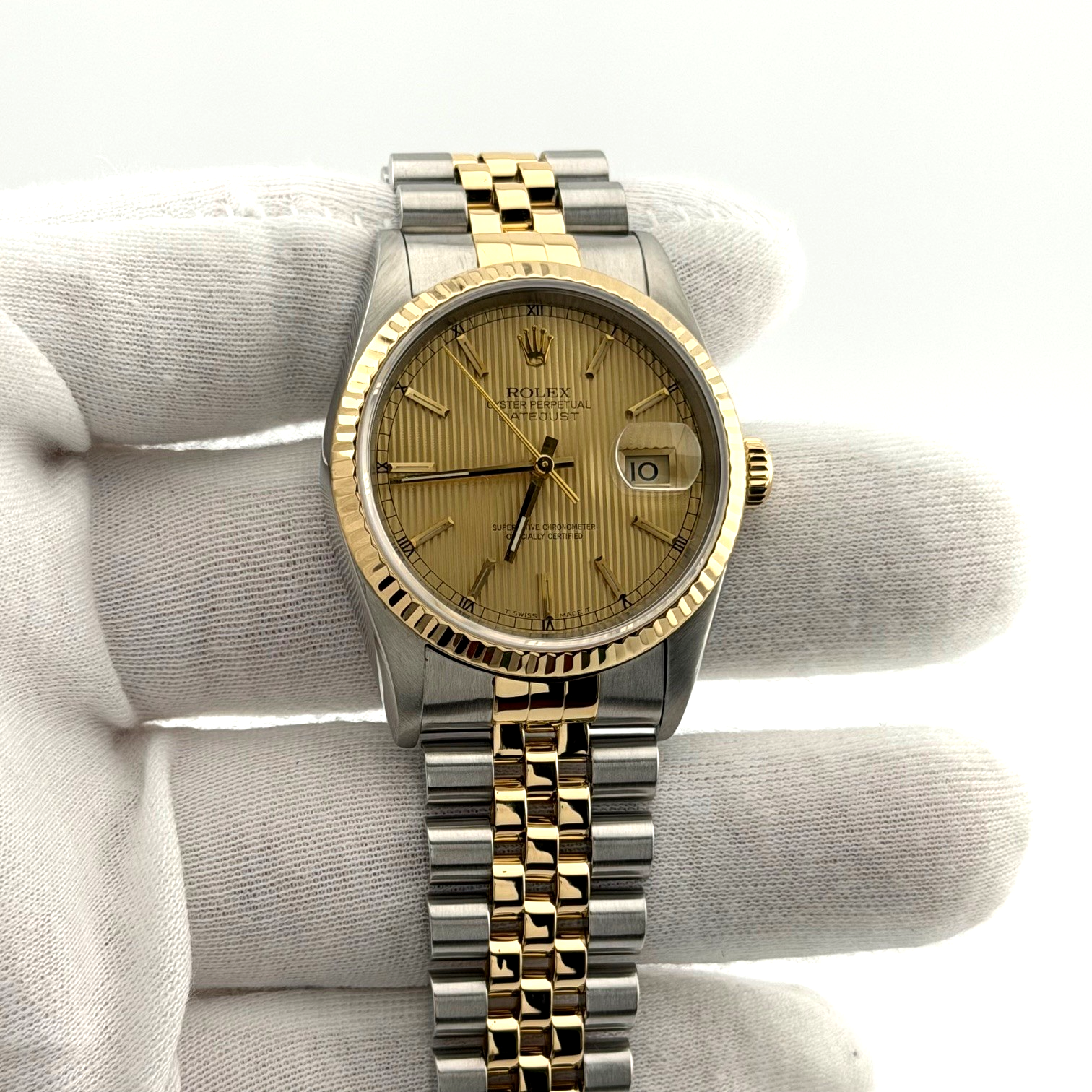 Rolex Datejust 16233 36mm Champagne Tapestry Dial 18k Yellow Gold Steel Jubilee Rolex Sale! from 659500 /per This item is a recurring or deferred purchase. By continuing, I agree to the cancellation policy and authorize you to charge my payment method at the prices, frequency and dates listed on this page until my order is fulfilled or I cancel, if permitted. +1 (619) 232-1273 This item is currently on backorder but you can still purchase it now and we'll ship as soon as more become available. Style Number: 16233Serial: T31****Year: 1996 Model: Rolex Datejust Case Material: Stainless Steel Band: 18k Yellow Gold & Stainless Steel JubileeBezel: 18k Yellow Gold Fluted Dial: Champagne Tapestry Dial Crystal: Sapphire Case Size: 36mm Includes: - Elegant Watch Box- Certified Appraisal - 1 Year WarrantySKU 23174 / 111505TOC100225
