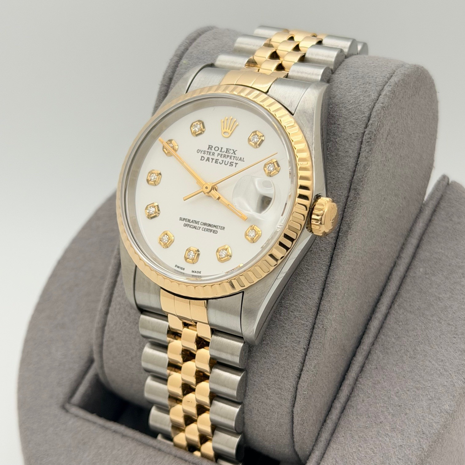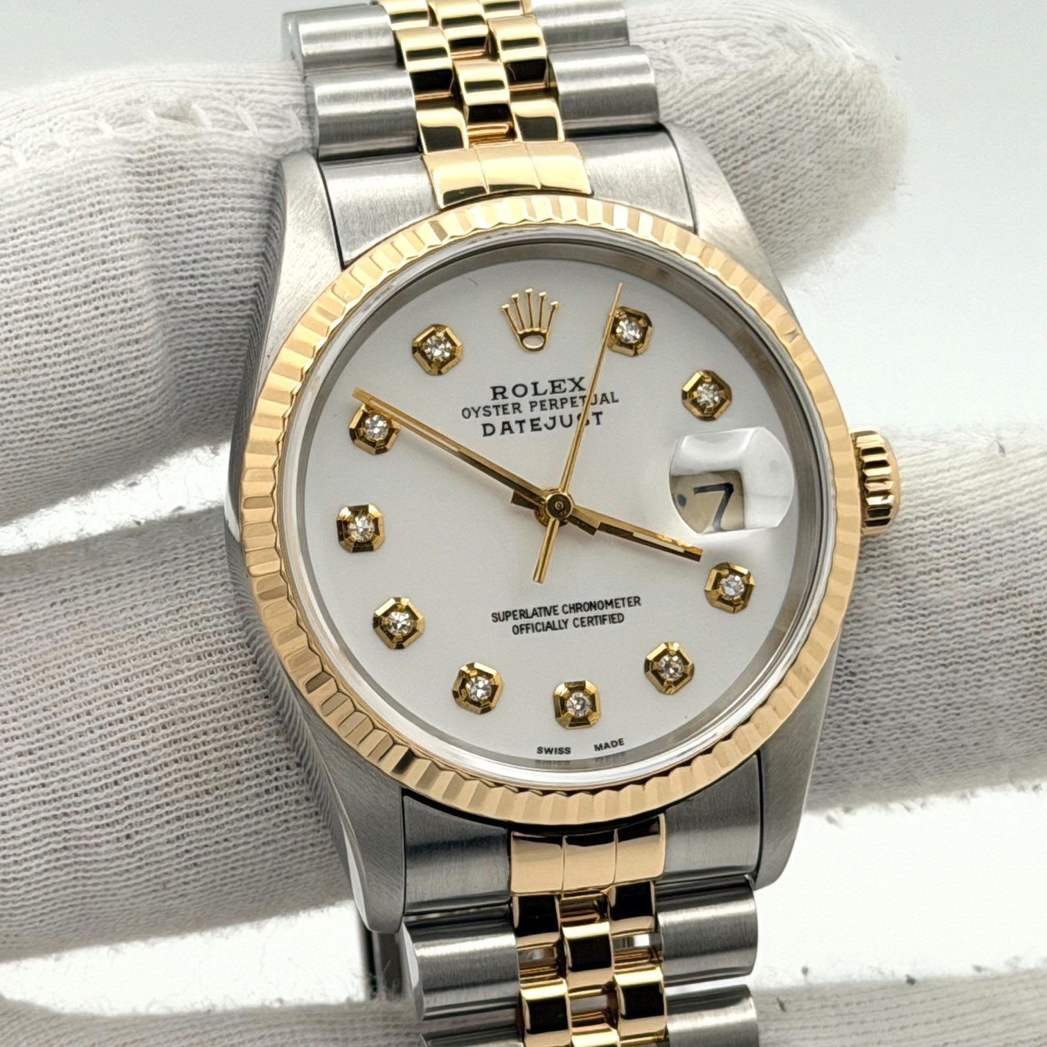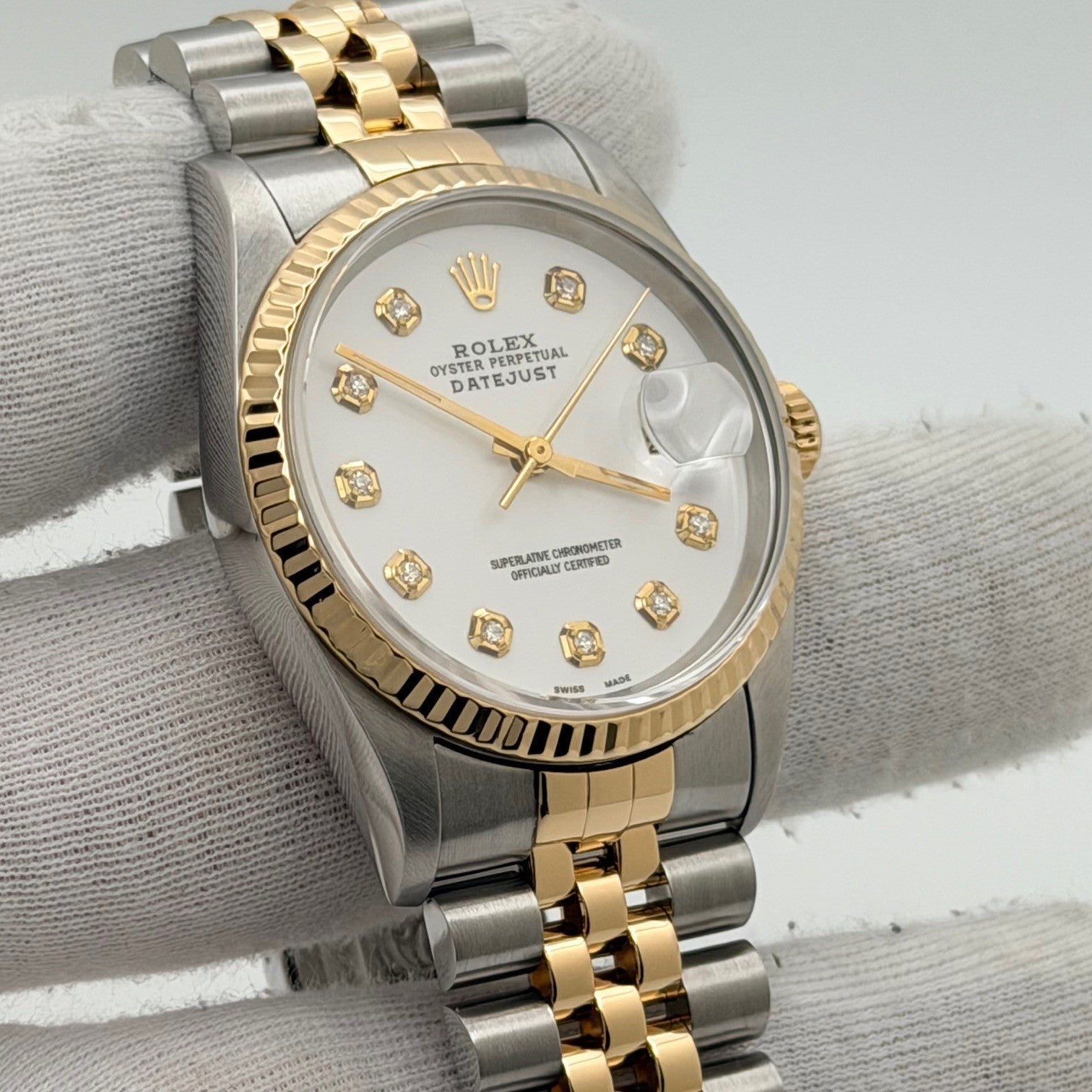 Rolex Datejust 16233 36mm White Diamond Dial 18k Yellow Gold Stainless Steel Rolex Sale! from 719500 /per This item is a recurring or deferred purchase. By continuing, I agree to the cancellation policy and authorize you to charge my payment method at the prices, frequency and dates listed on this page until my order is fulfilled or I cancel, if permitted. +1 (619) 232-1273 This item is currently on backorder but you can still purchase it now and we'll ship as soon as more become available. Style Number: 16233Serial: S89****Year: 1994 Model: Rolex Datejust Case Material: Stainless Steel Band: 18k Yellow Gold & Stainless Steel Jubilee Bezel: 18k Yellow Gold Fluted Dial: Custom White Diamond Dial Crystal: Sapphire Case Size: 36mm Includes: - Elegant Watch Box- Certified Appraisal - 1 Year WarrantySKU 23399 / 114193TOC120225