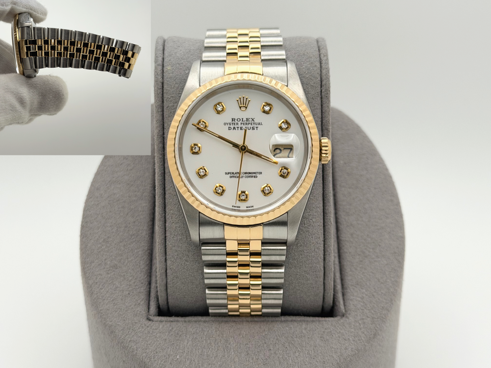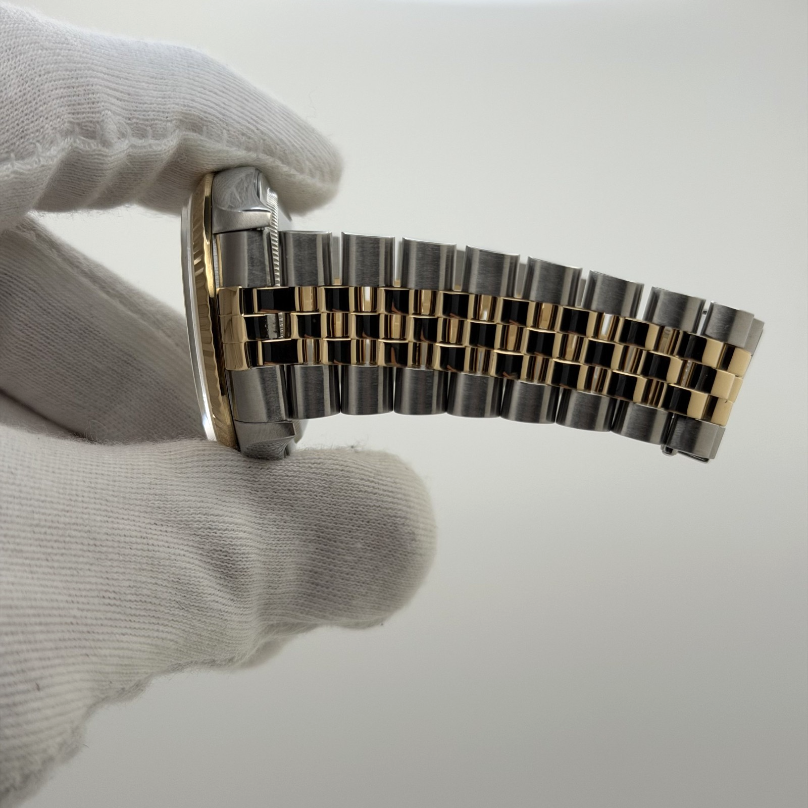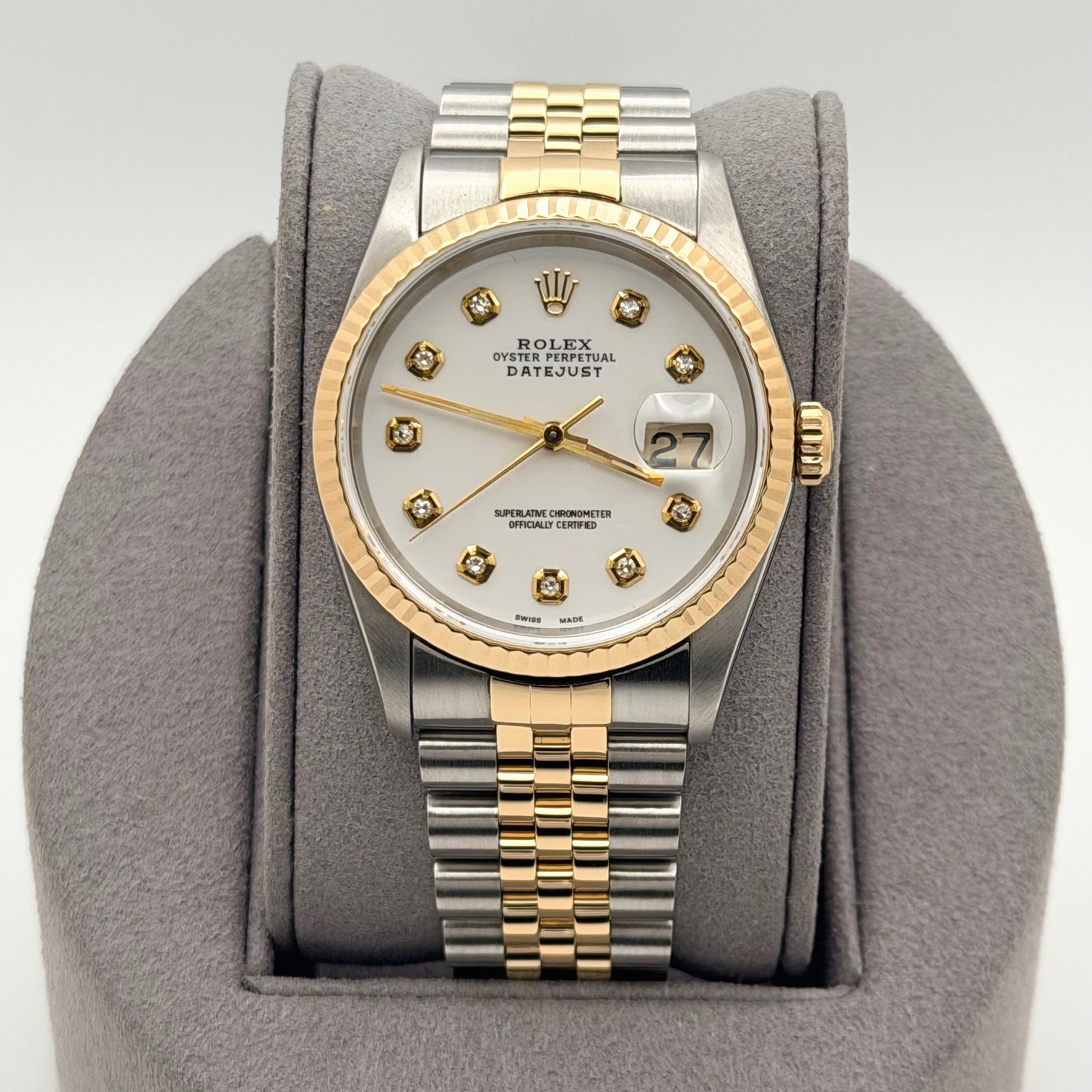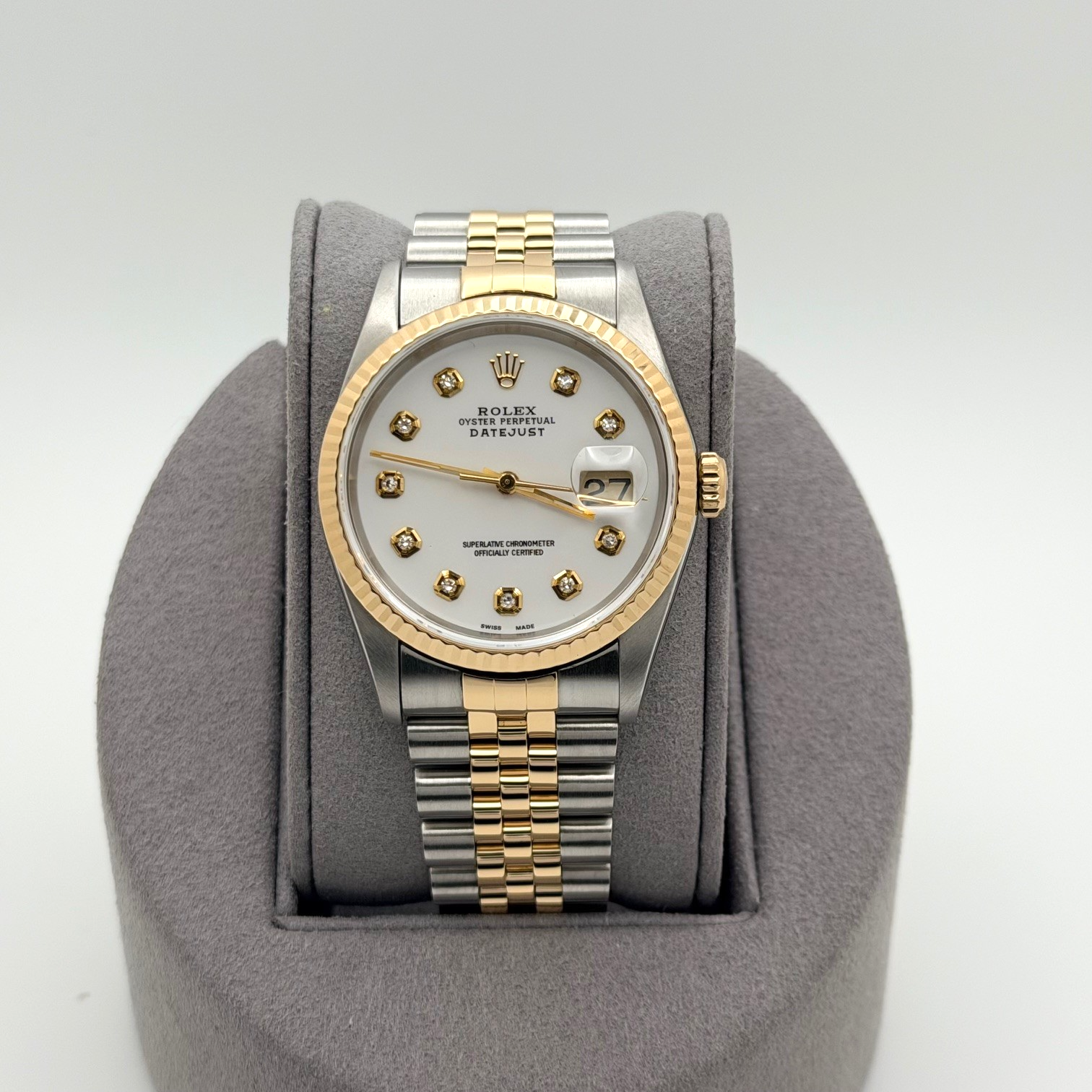 Rolex Datejust 16233 36mm White Diamond Dial 18k Yellow Gold Stainless Steel Rolex Sale! from 719500 /per This item is a recurring or deferred purchase. By continuing, I agree to the cancellation policy and authorize you to charge my payment method at the prices, frequency and dates listed on this page until my order is fulfilled or I cancel, if permitted. +1 (619) 232-1273 This item is currently on backorder but you can still purchase it now and we'll ship as soon as more become available. Style Number: 16233Serial: S89****Year: 1994 Model: Rolex Datejust Case Material: Stainless Steel Band: 18k Yellow Gold & Stainless Steel Jubilee Bezel: 18k Yellow Gold Fluted Dial: Custom White Diamond Dial Crystal: Sapphire Case Size: 36mm Includes: - Elegant Watch Box- Certified Appraisal - 1 Year WarrantySKU 23399 / 114193TOC120225